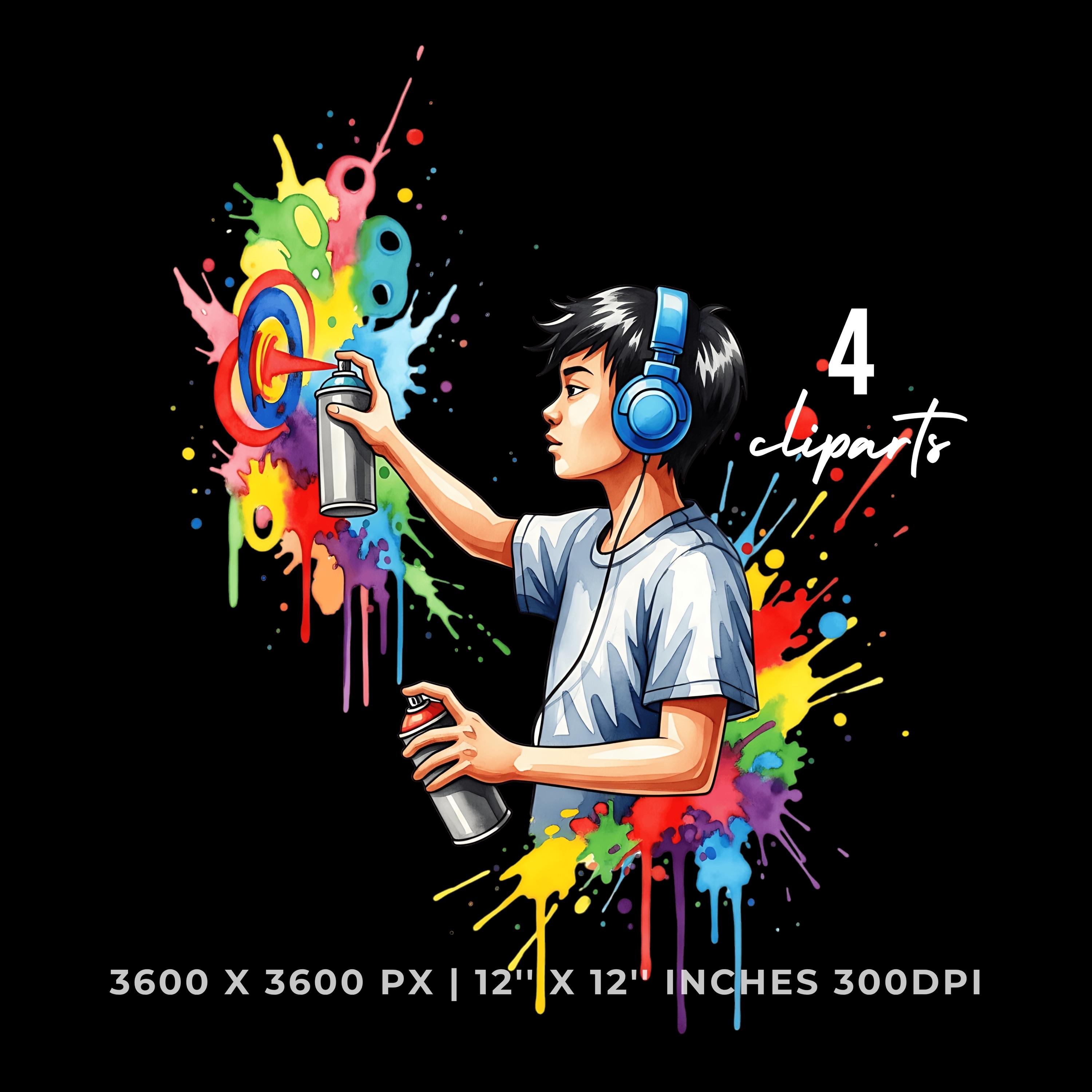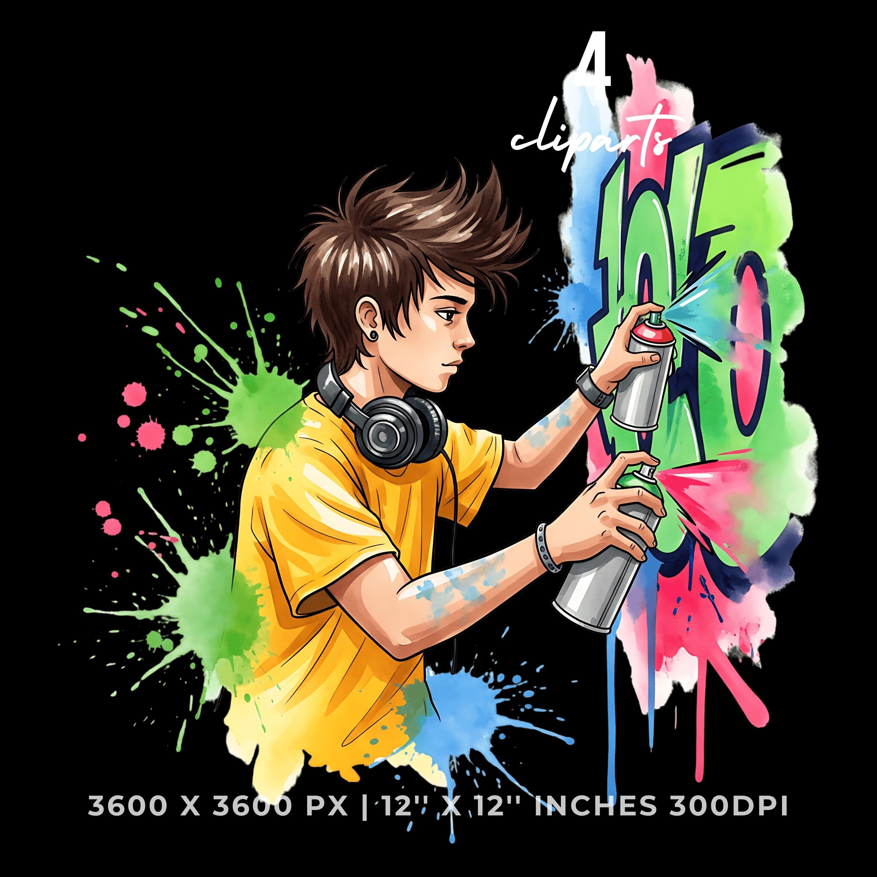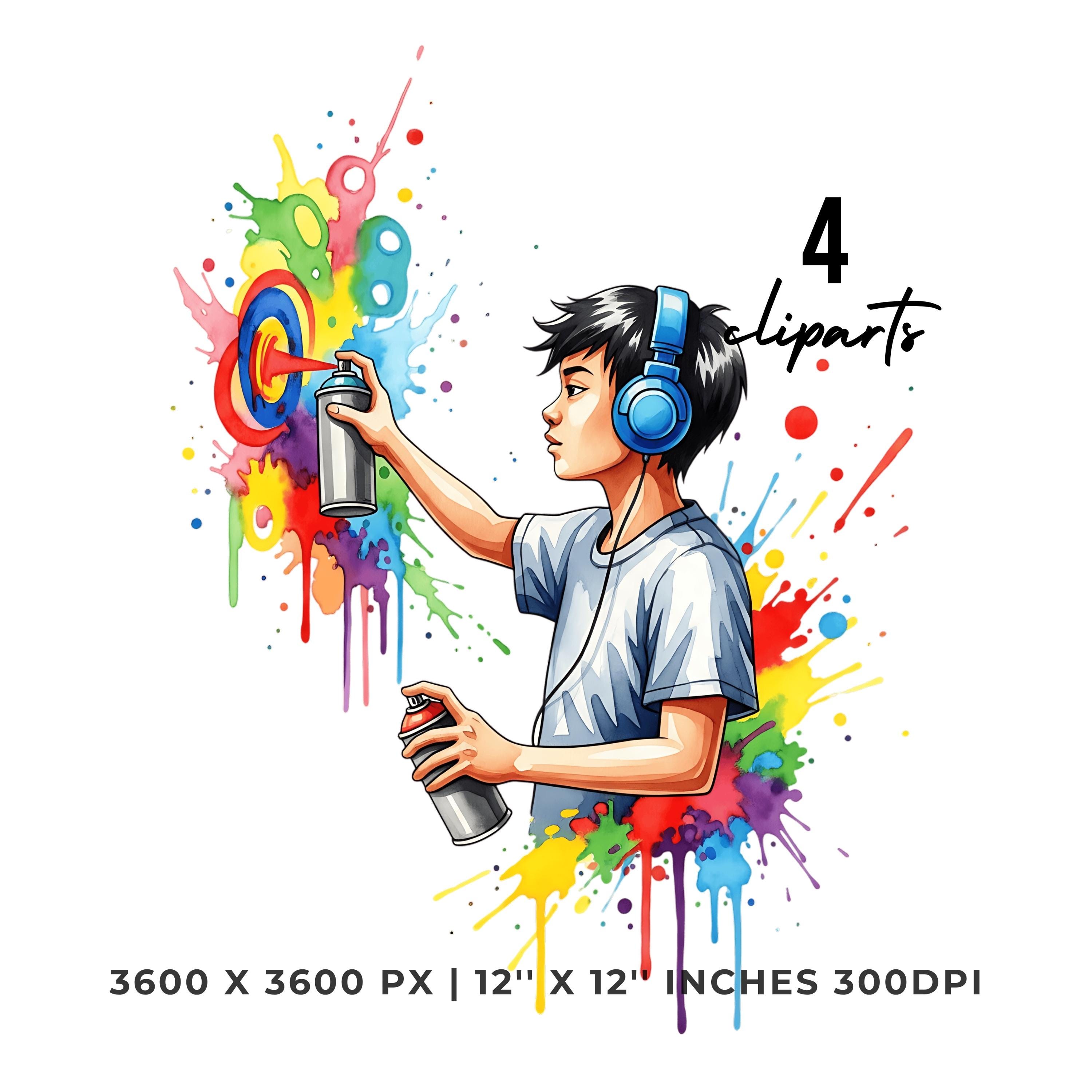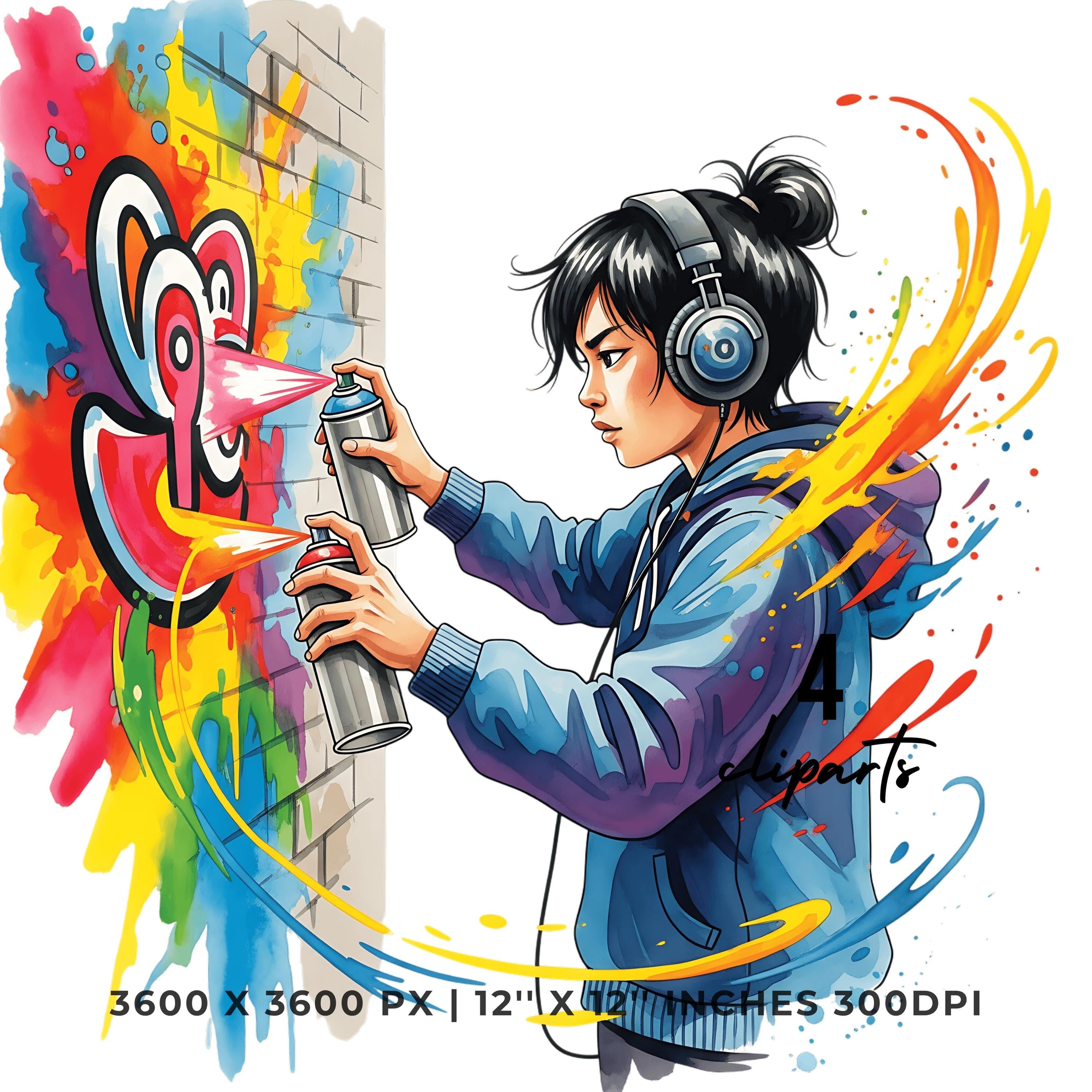 Graffiti PNG Clipart | Watercolor Young Street Artist Painting a colorful mural with spray can | Graffiti art | 4 PNG – 4 JPG Commercial Use is an eye-catching, high-resolution digital asset designed for creators, crafters, teachers, and small business owners looking to elevate their visuals.