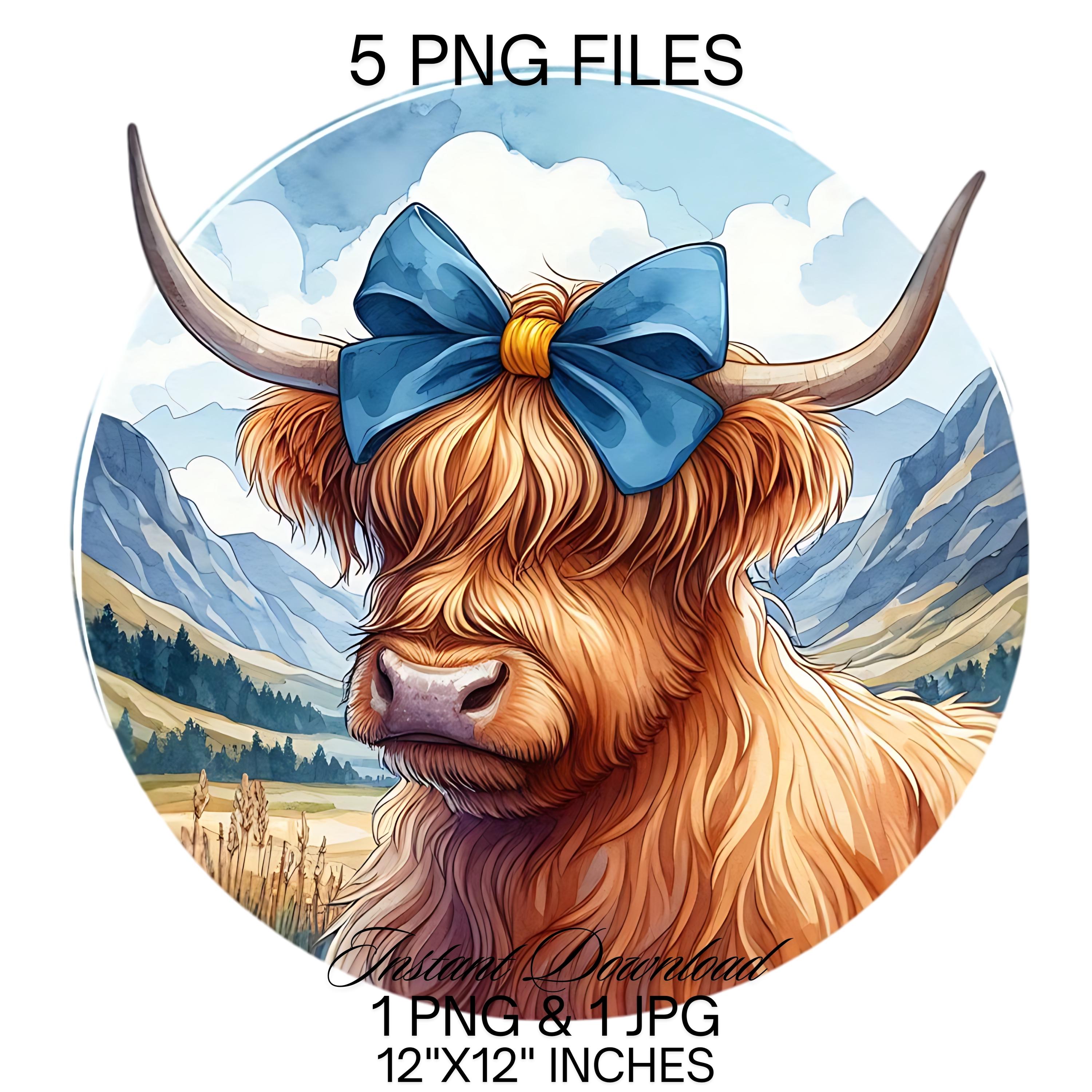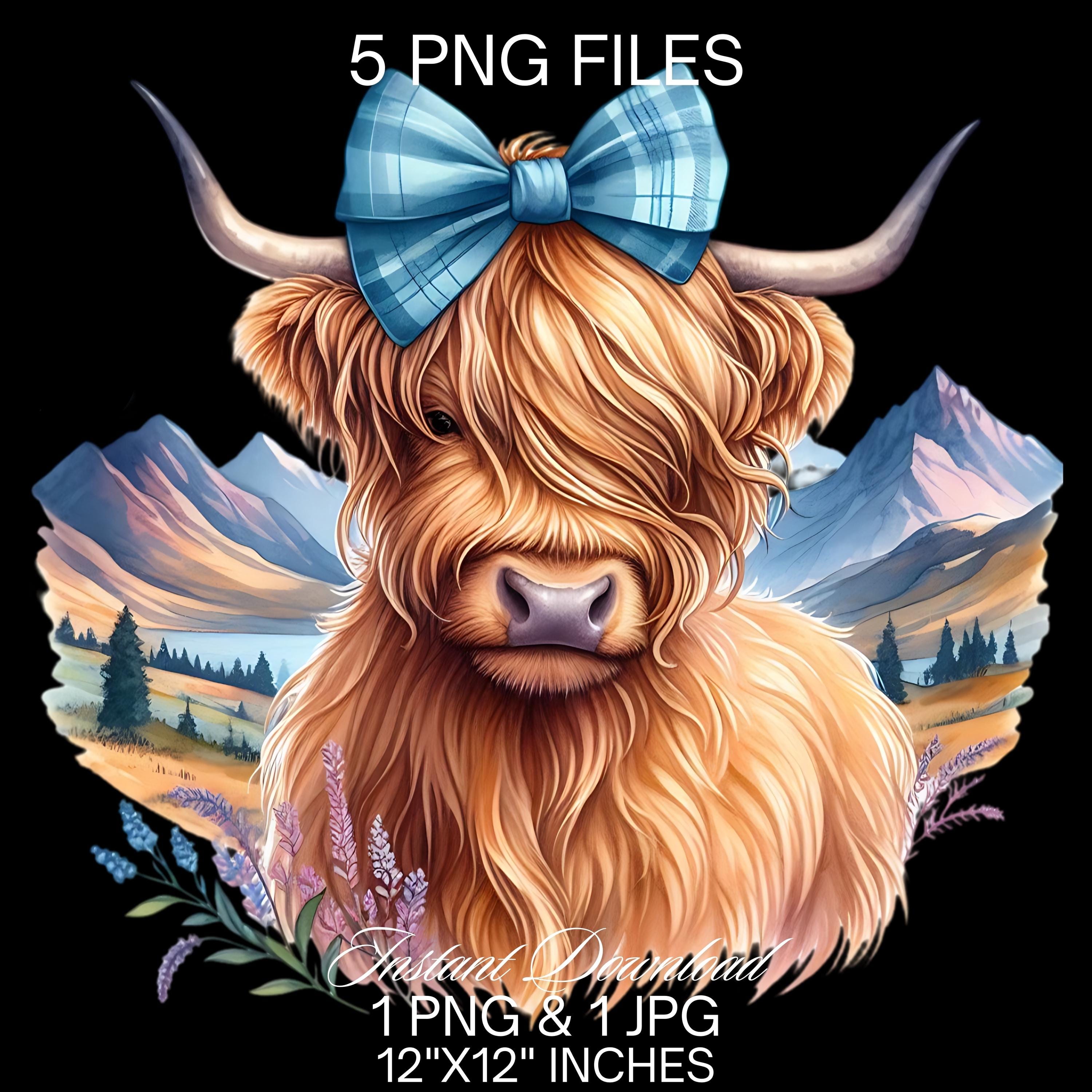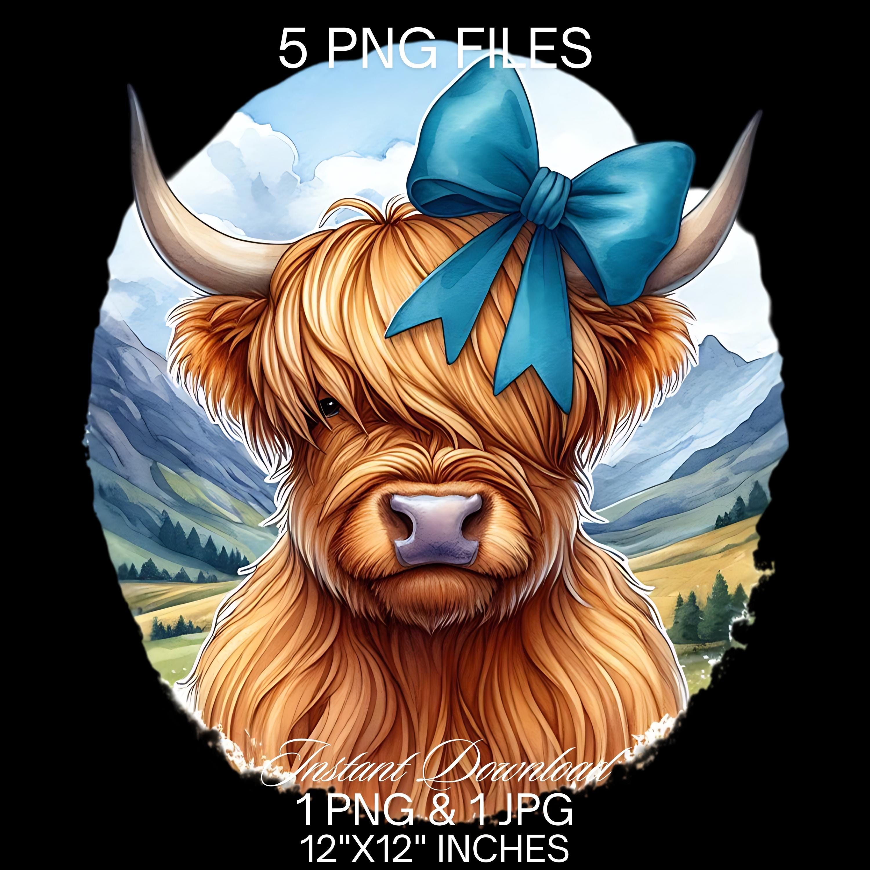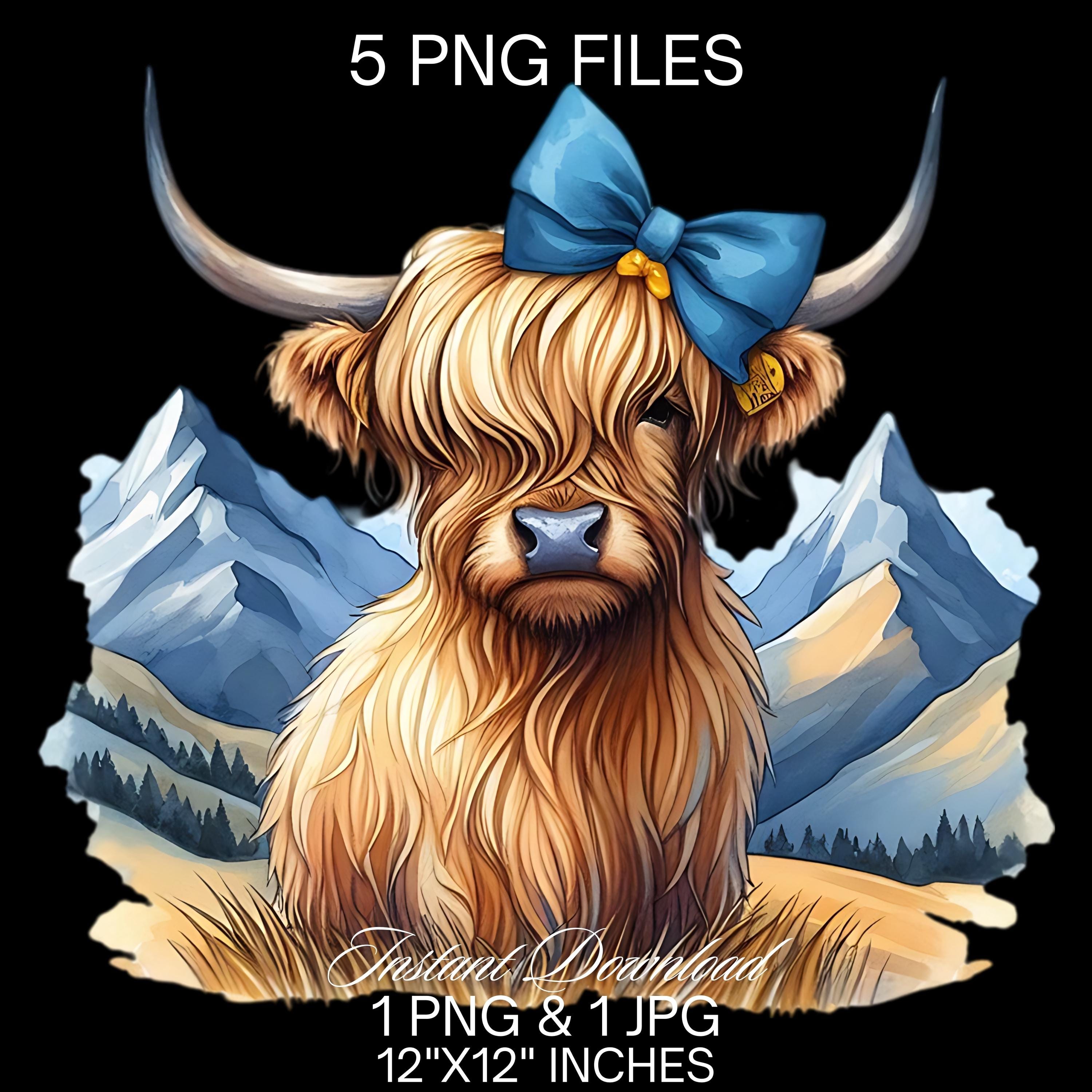 Highland Cow Watercolor Clipart PNG | 5 Mountains Highland Cattle Blue Hair Bow Commercial Use | Scottish Cow Illustration Commercial Use is an eye-catching, high-resolution digital asset designed for creators, crafters, teachers, and small business owners looking to elevate their visuals.