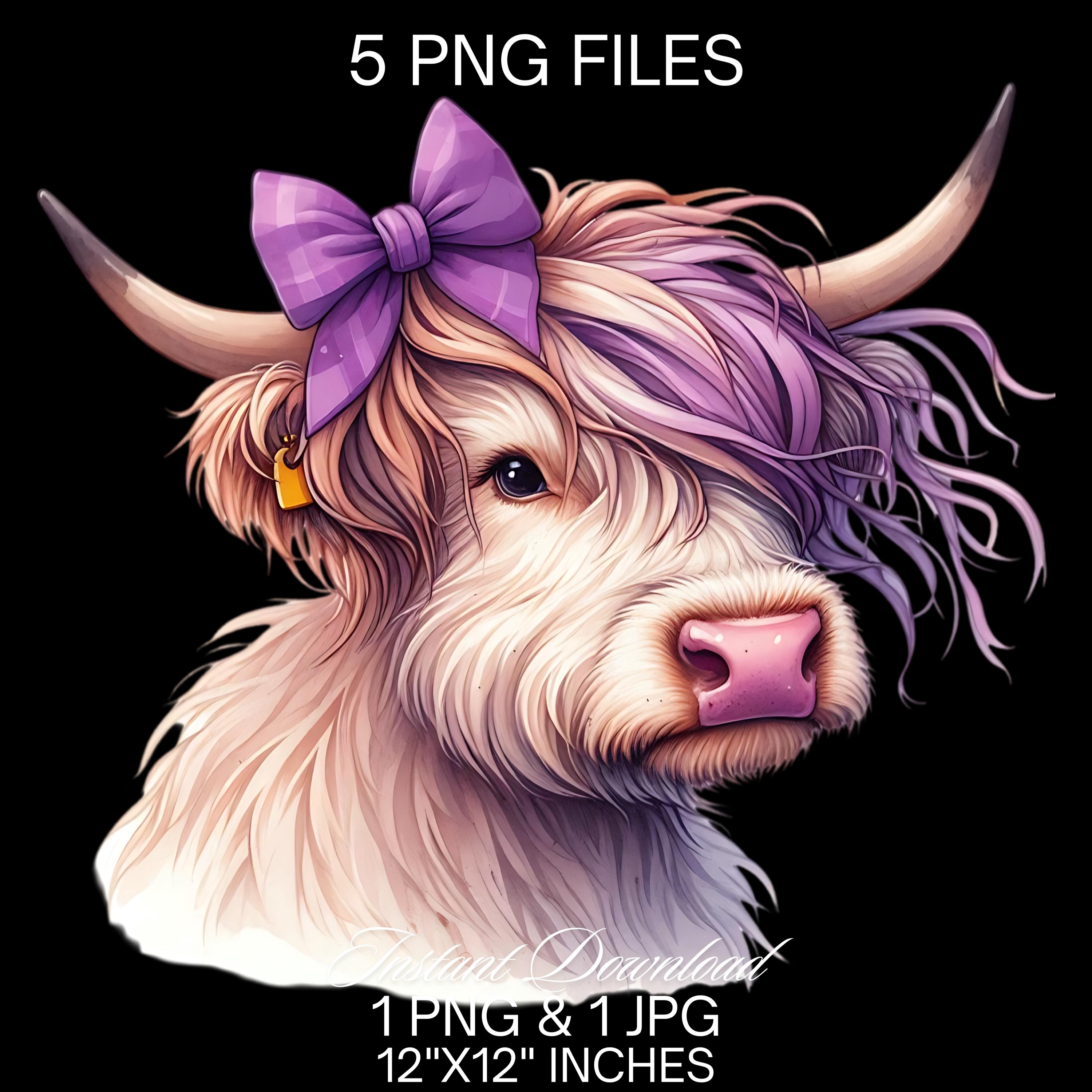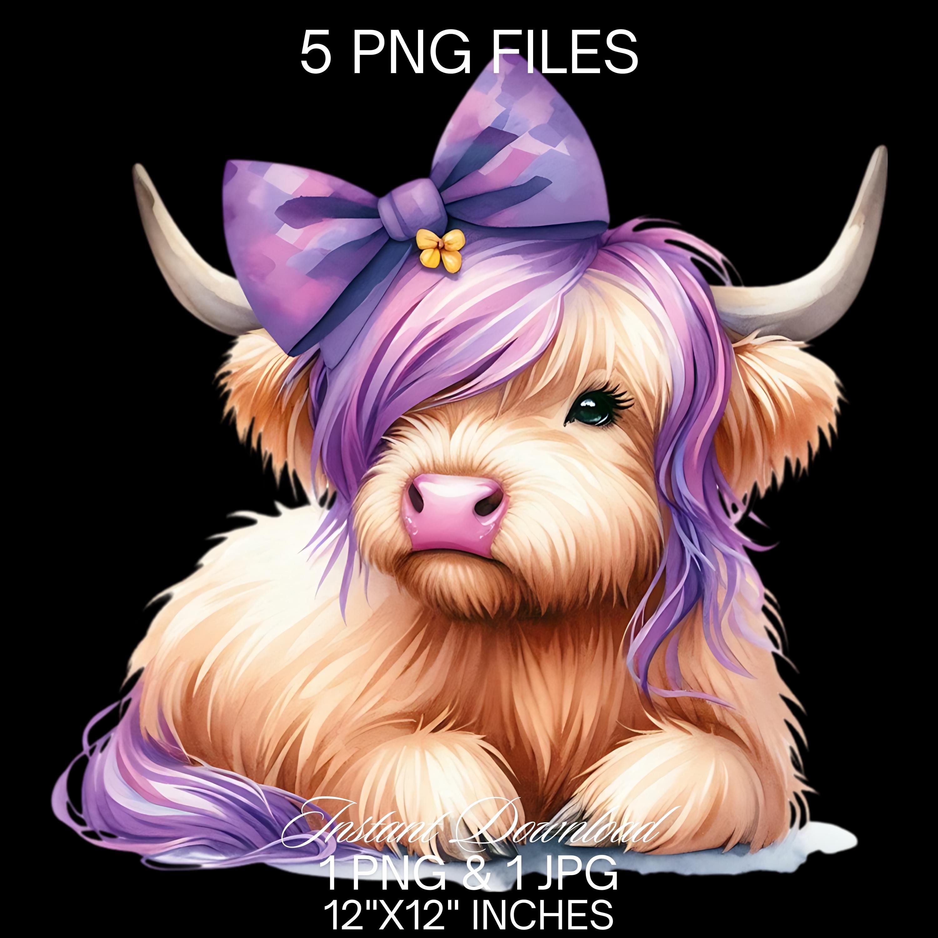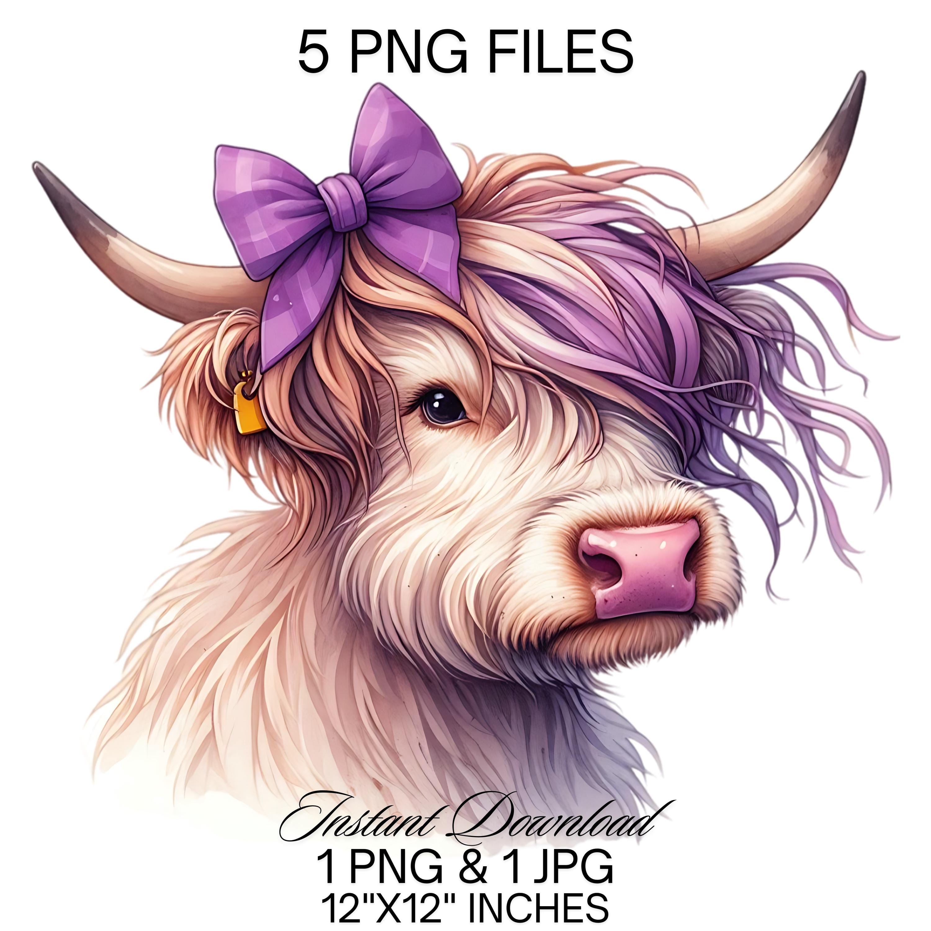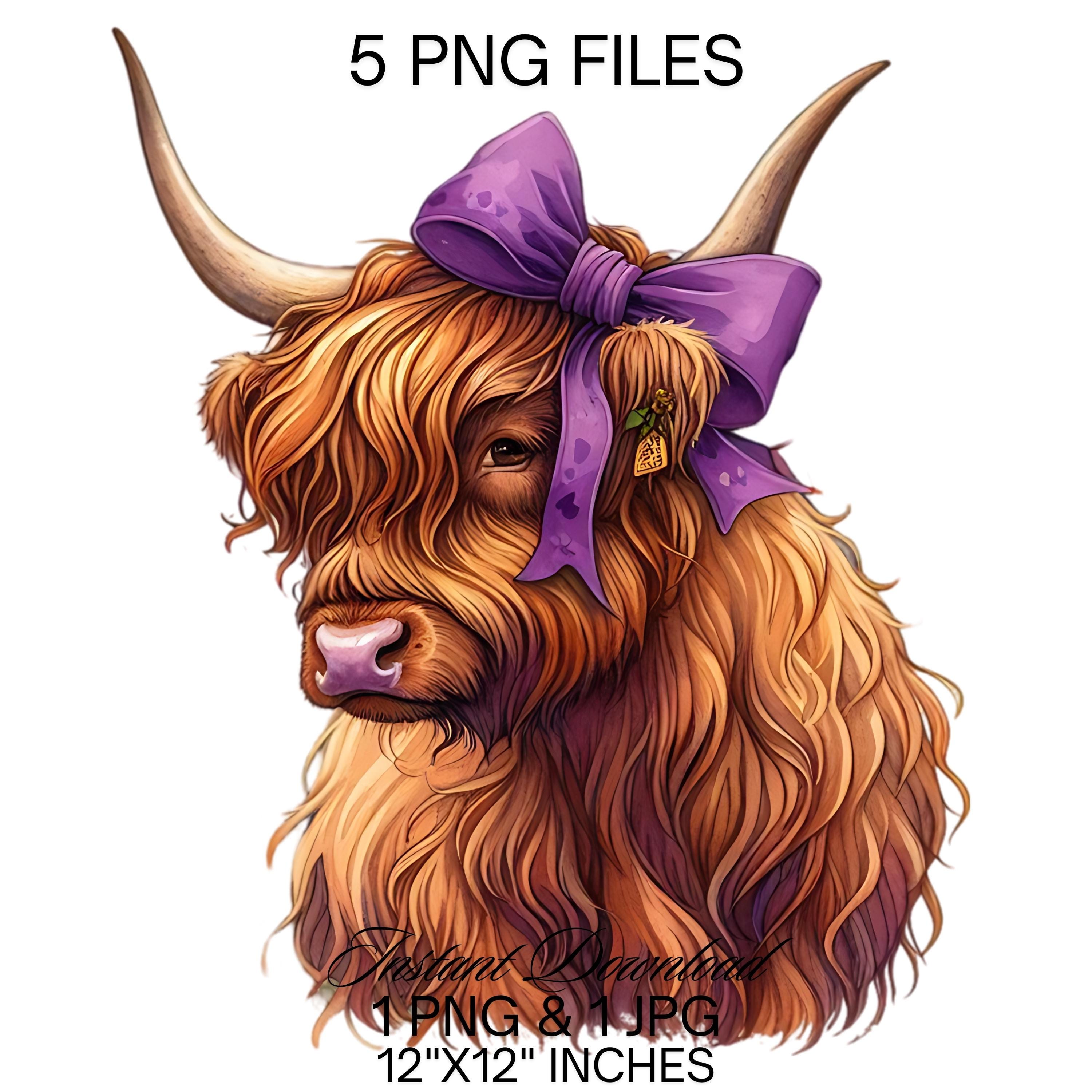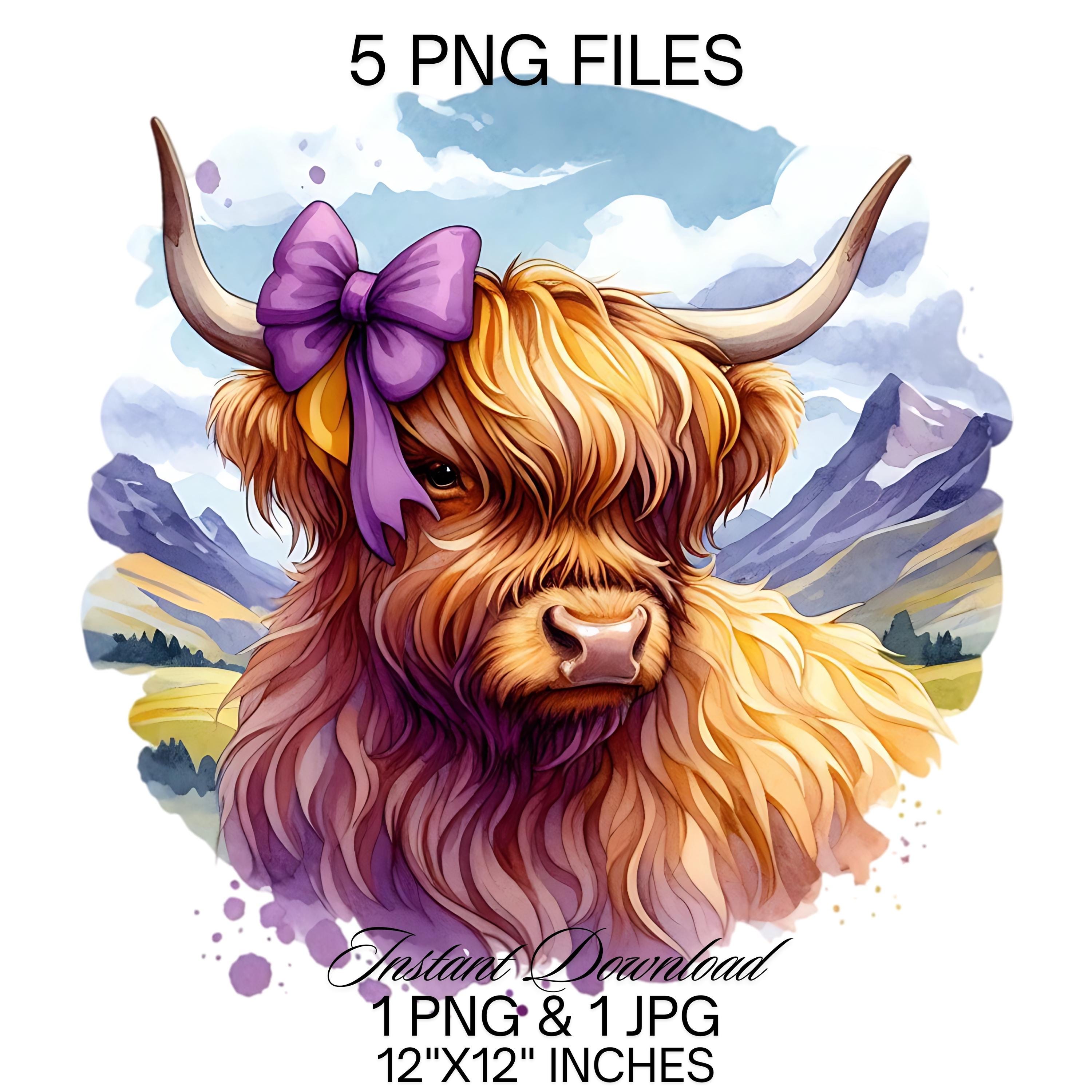 Highland Cow Watercolor Clipart PNG | 5 Mountains Highland Cattle Purple Hair Bow Commercial Use | Scottish Cow Illustration Commercial Use is an eye-catching, high-resolution digital asset designed for creators, crafters, teachers, and small business owners looking to elevate their visuals.