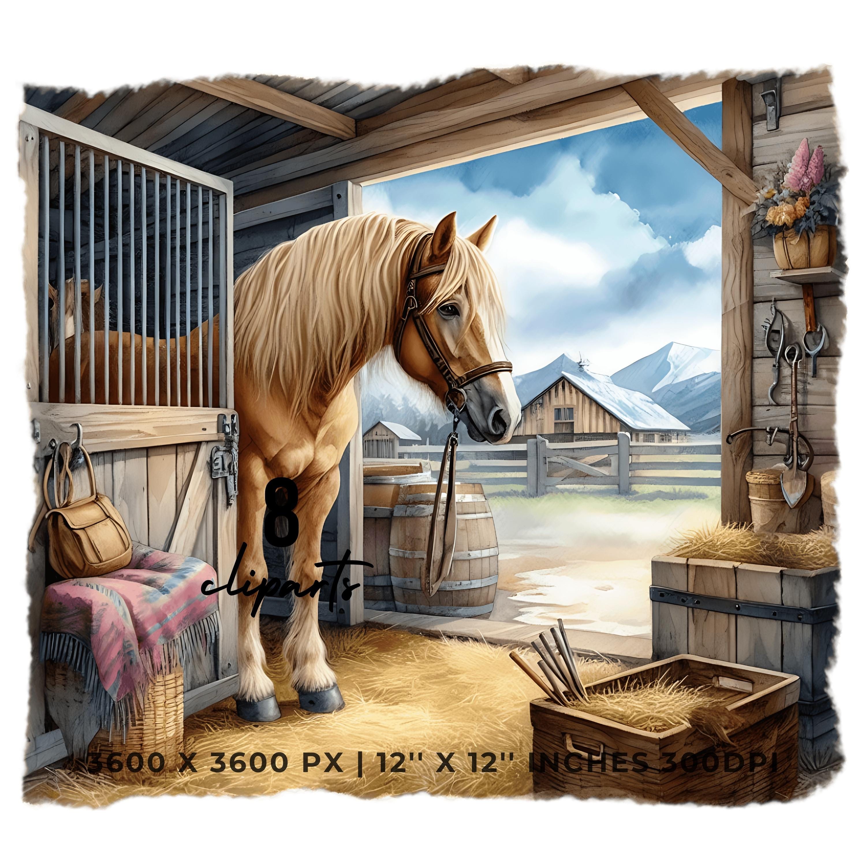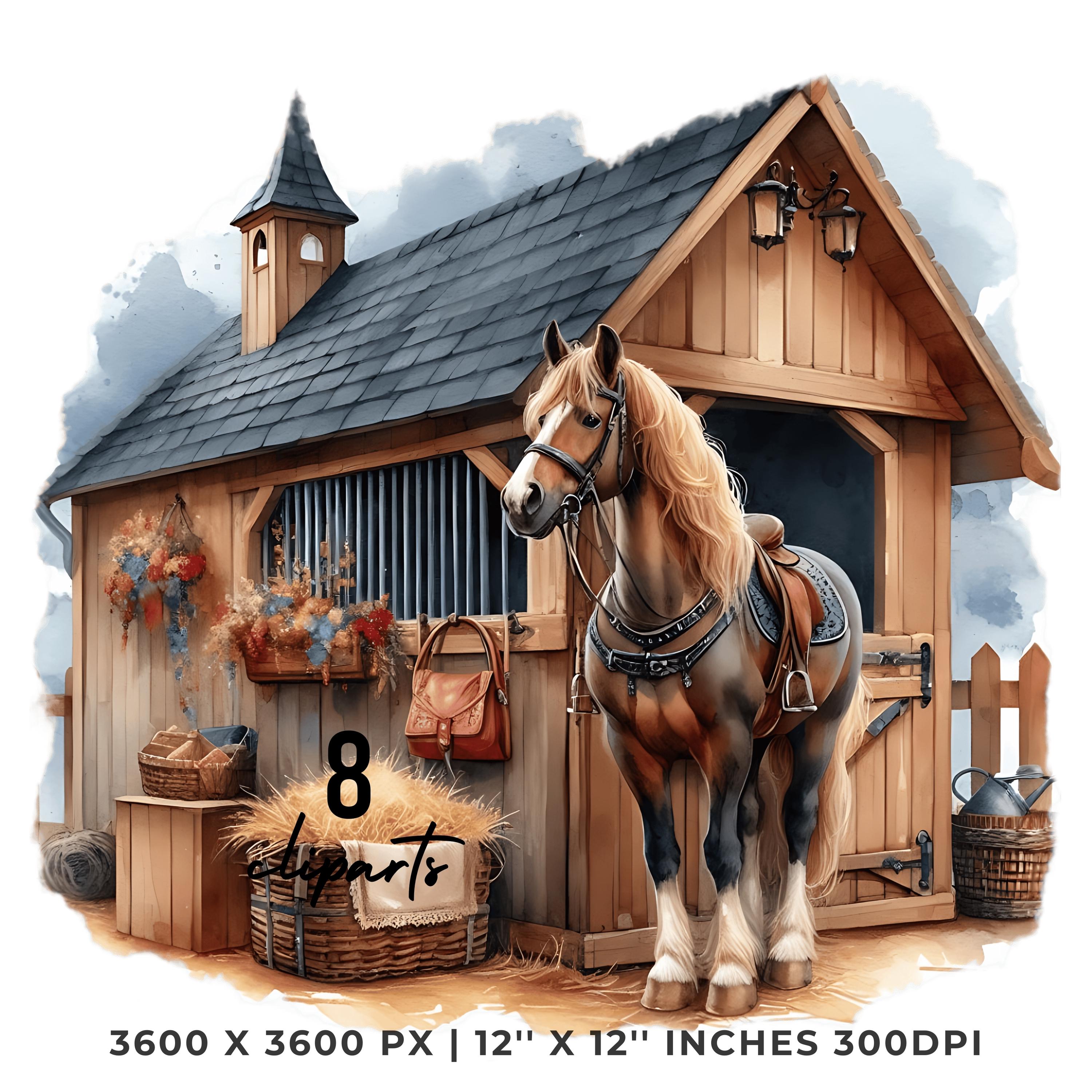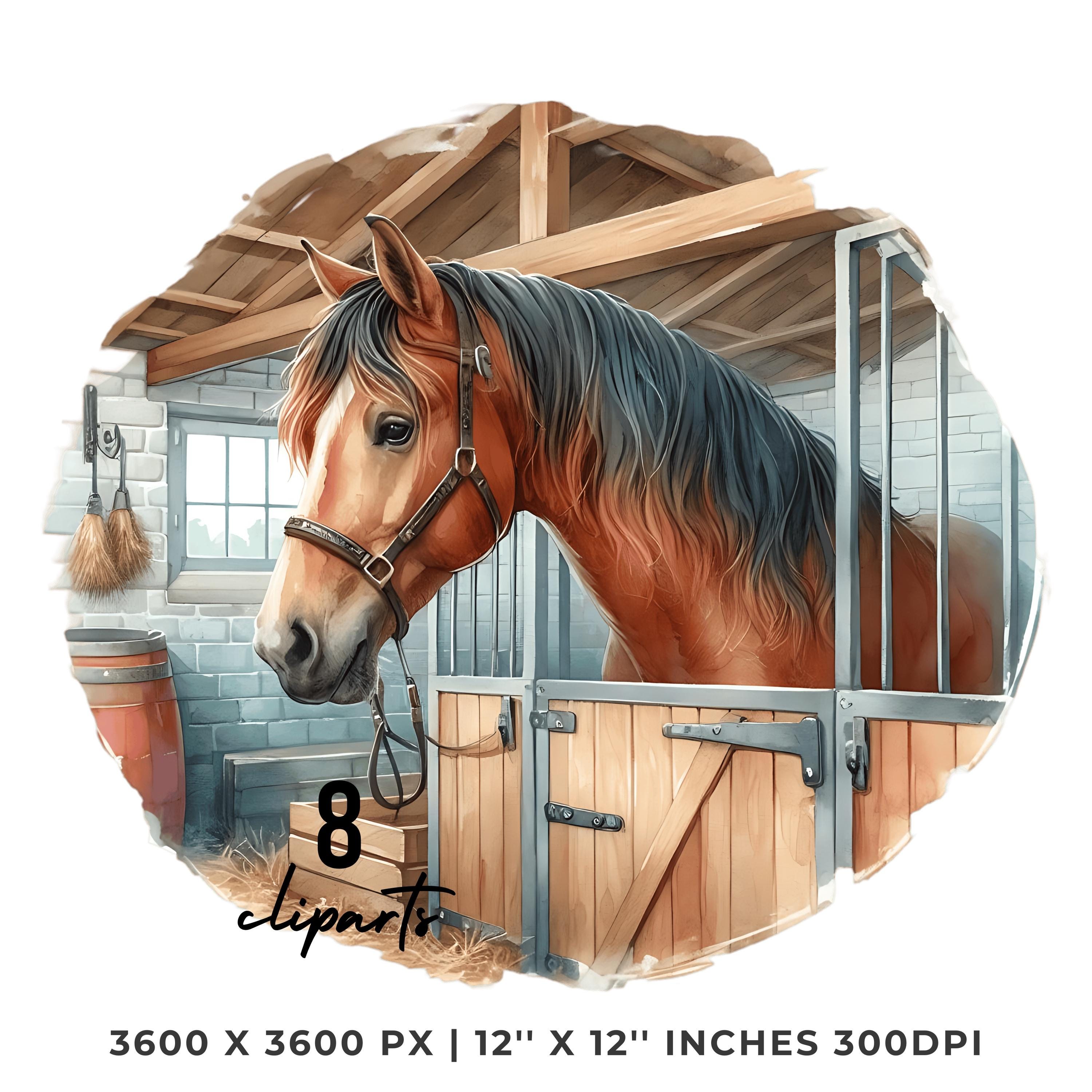 Horse in Stable Clipart PNG | 8 Watercolor Horse Stall Clipart Sublimation | Country Boy Things Illustration Commercial use
