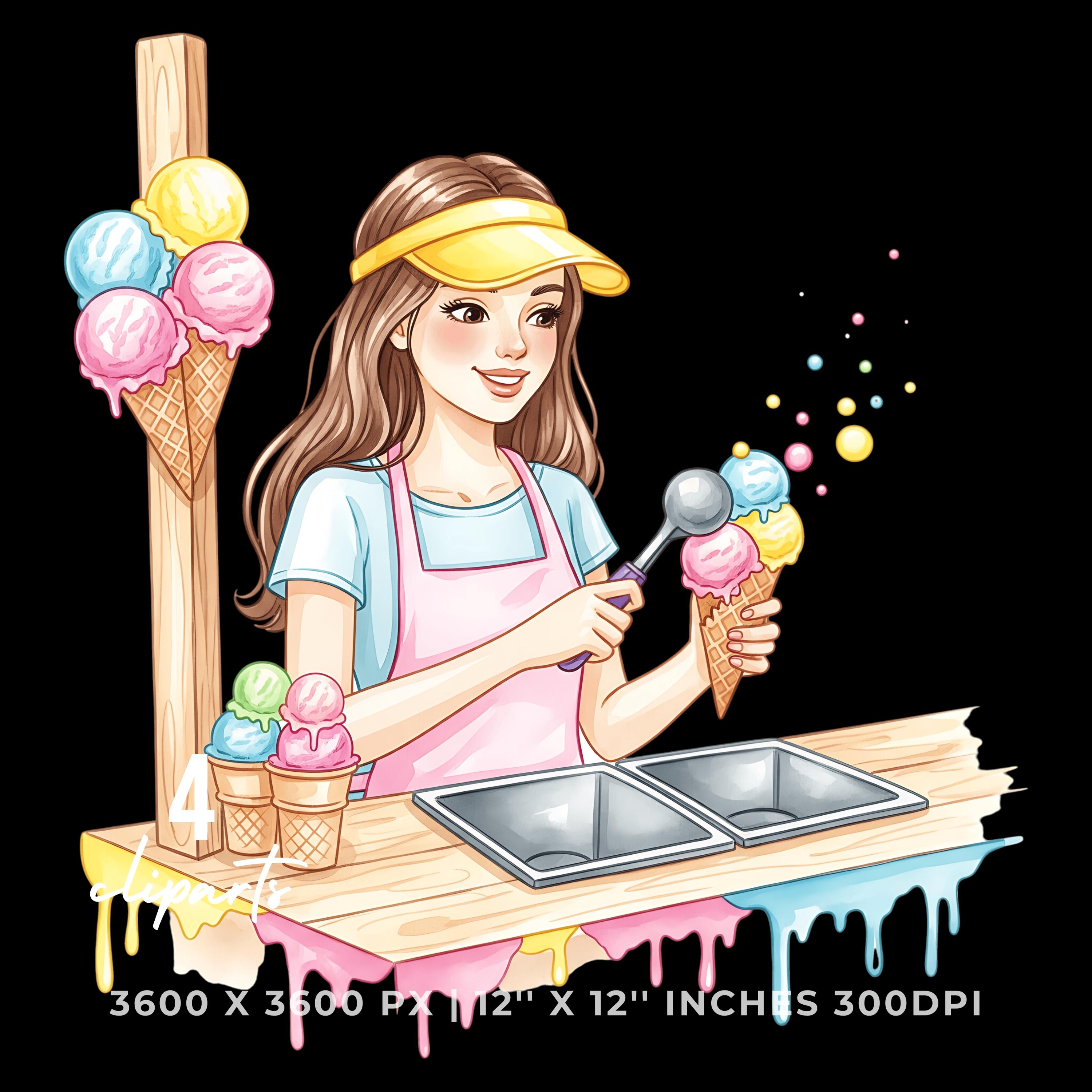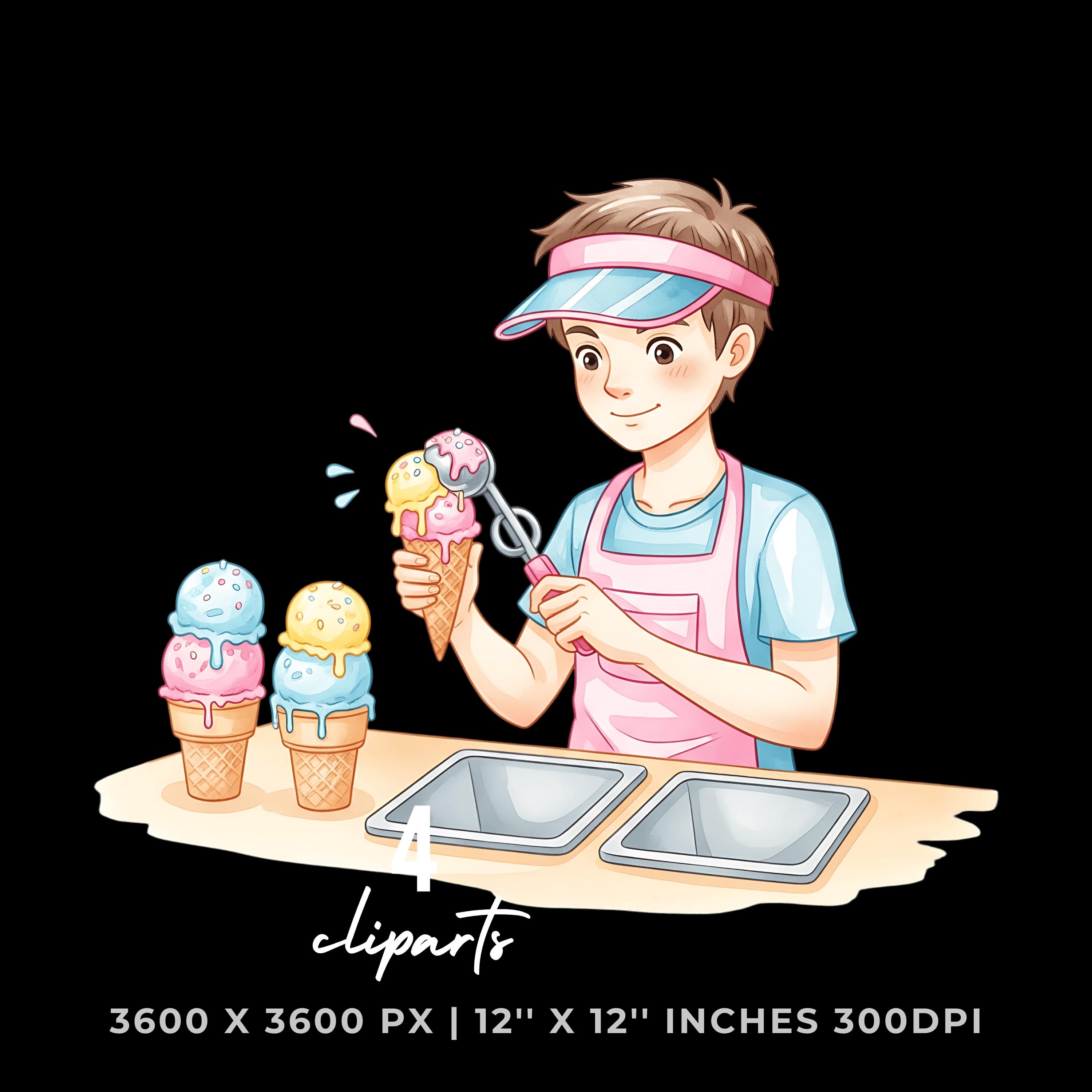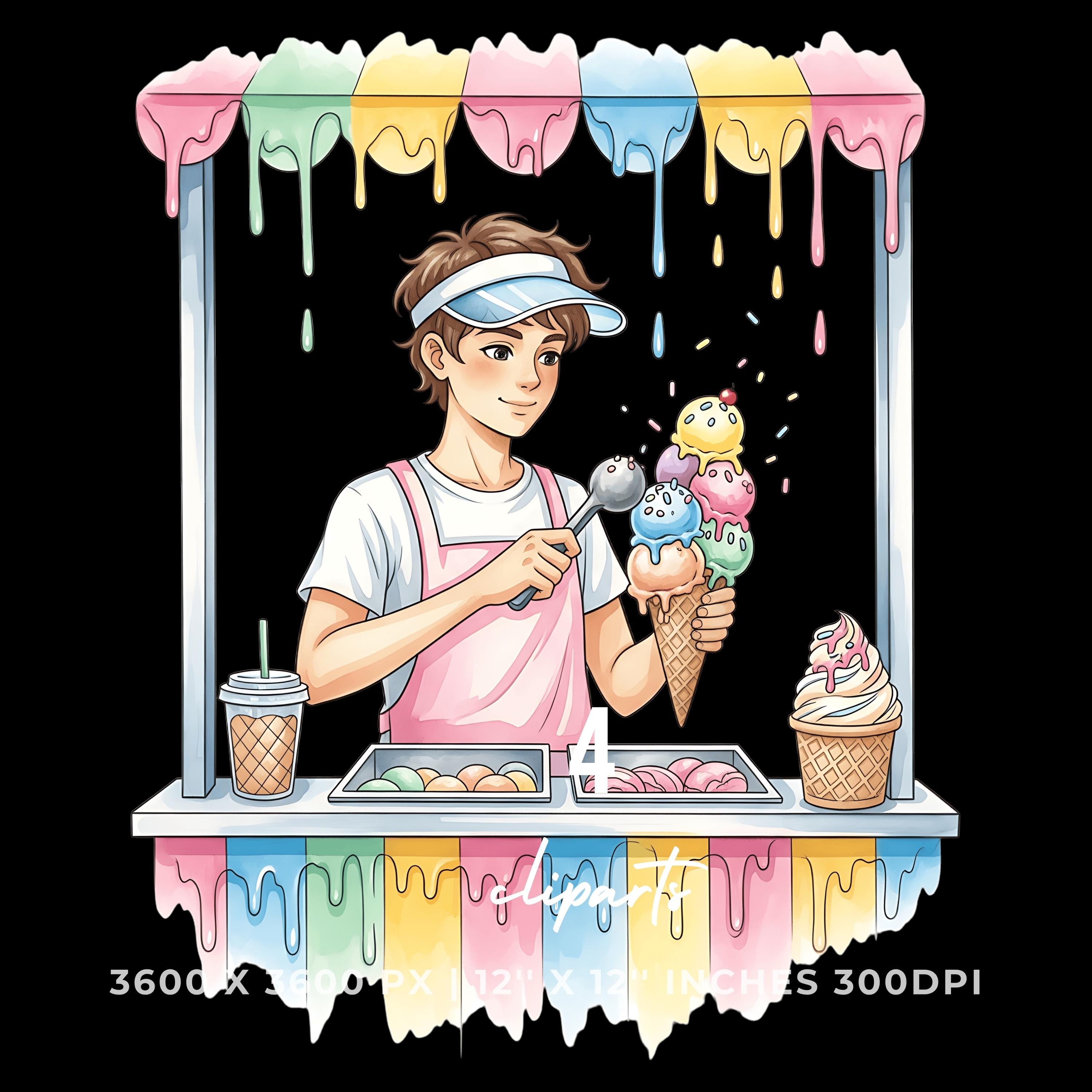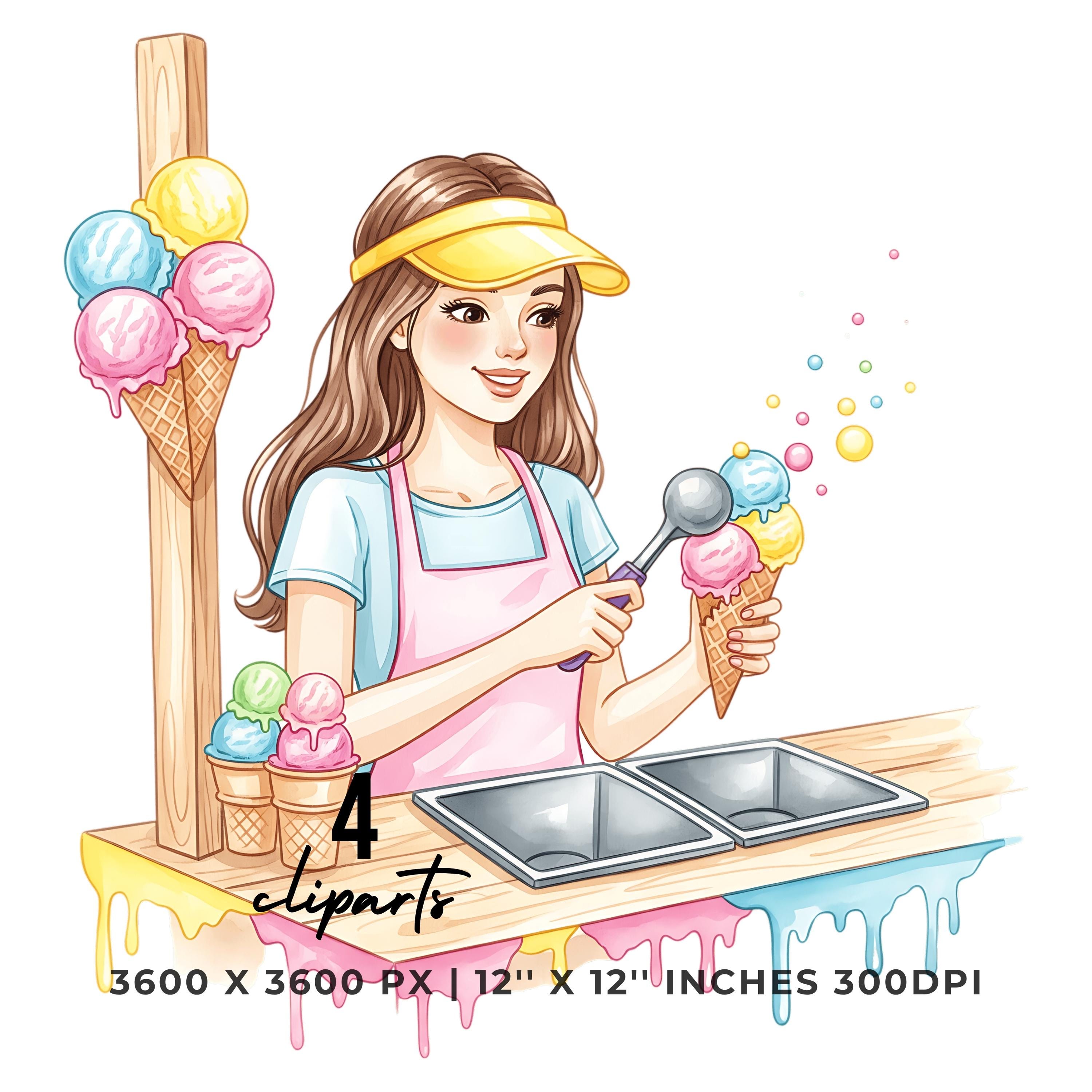 Ice Cream Scoopers PNG Clipart | Watercolor Teenager scooping ice cream into a cone at a beachside stand | Summer job 4 PNG – 4 JPG Graphic Commercial Use
