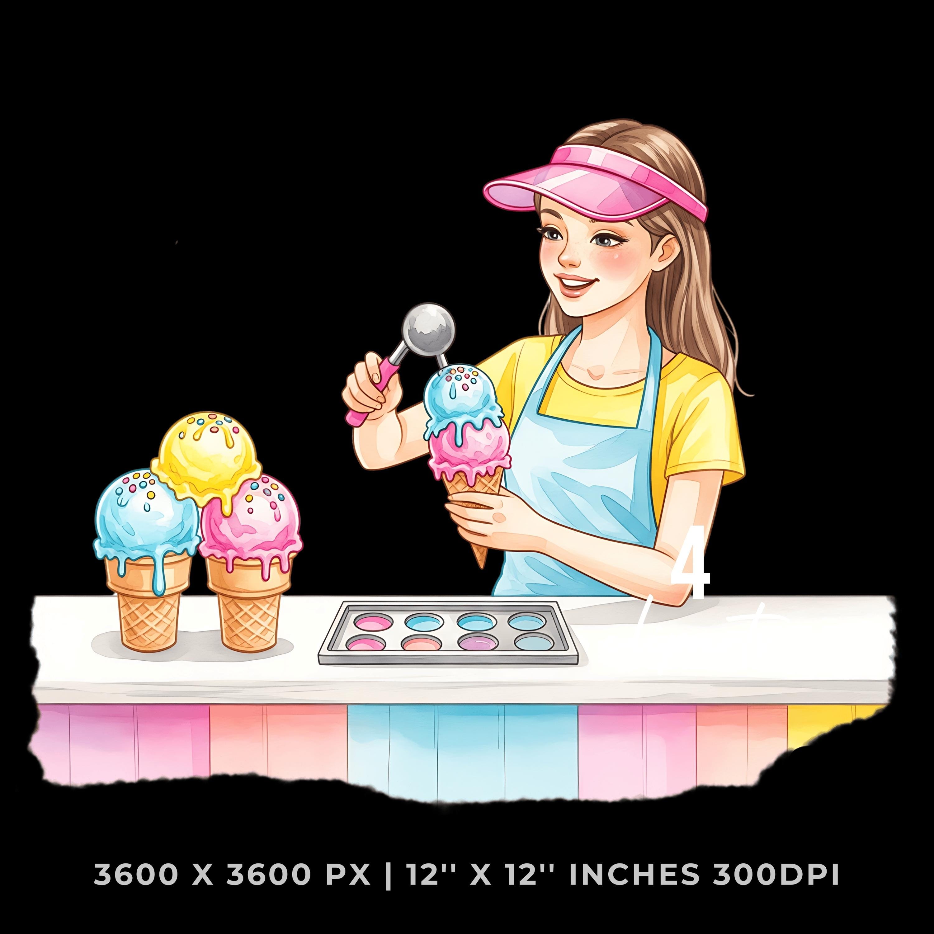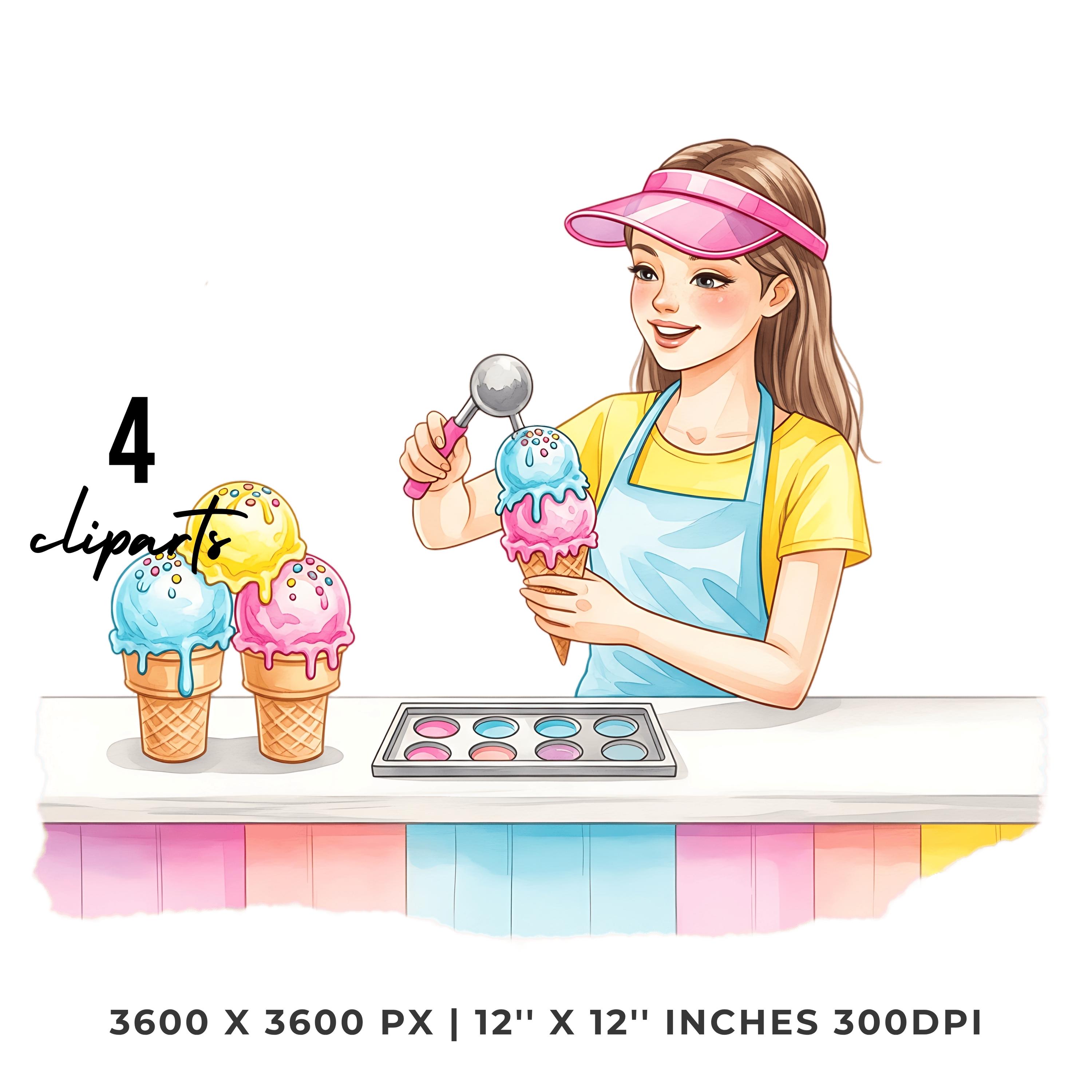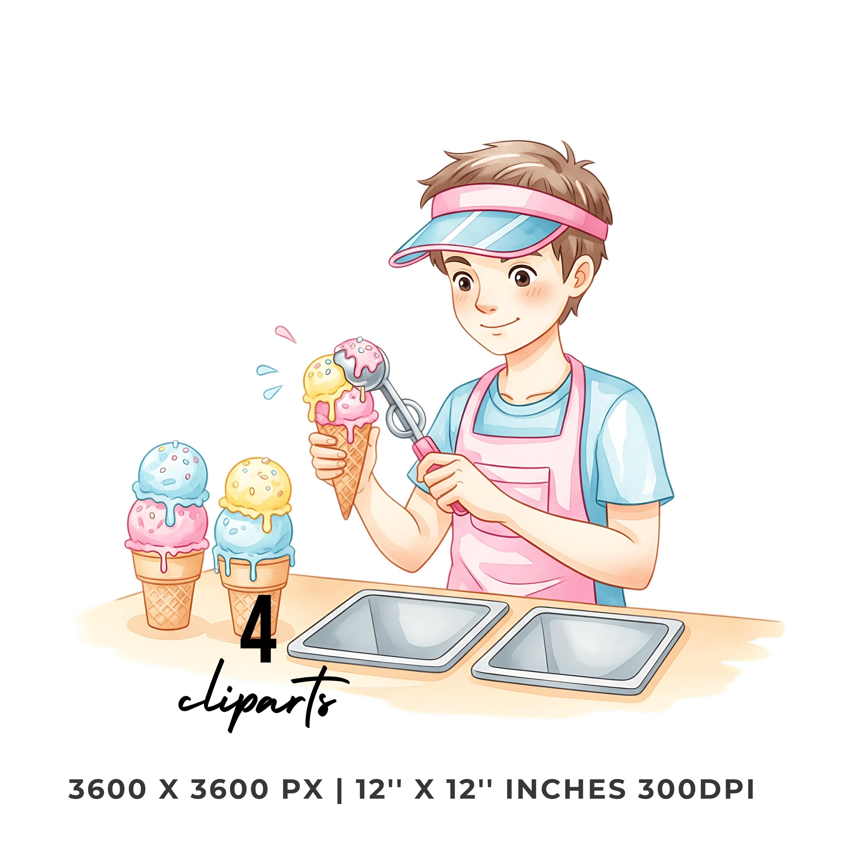 Ice Cream Scooper PNG Clipart | Watercolor Teenager scooping ice cream into cone at beachside stand | Summer job 4 PNG, 4 JPG Commercial Use is an eye-catching, high-resolution digital asset designed for creators, crafters, teachers, and small business owners looking to elevate their visuals.