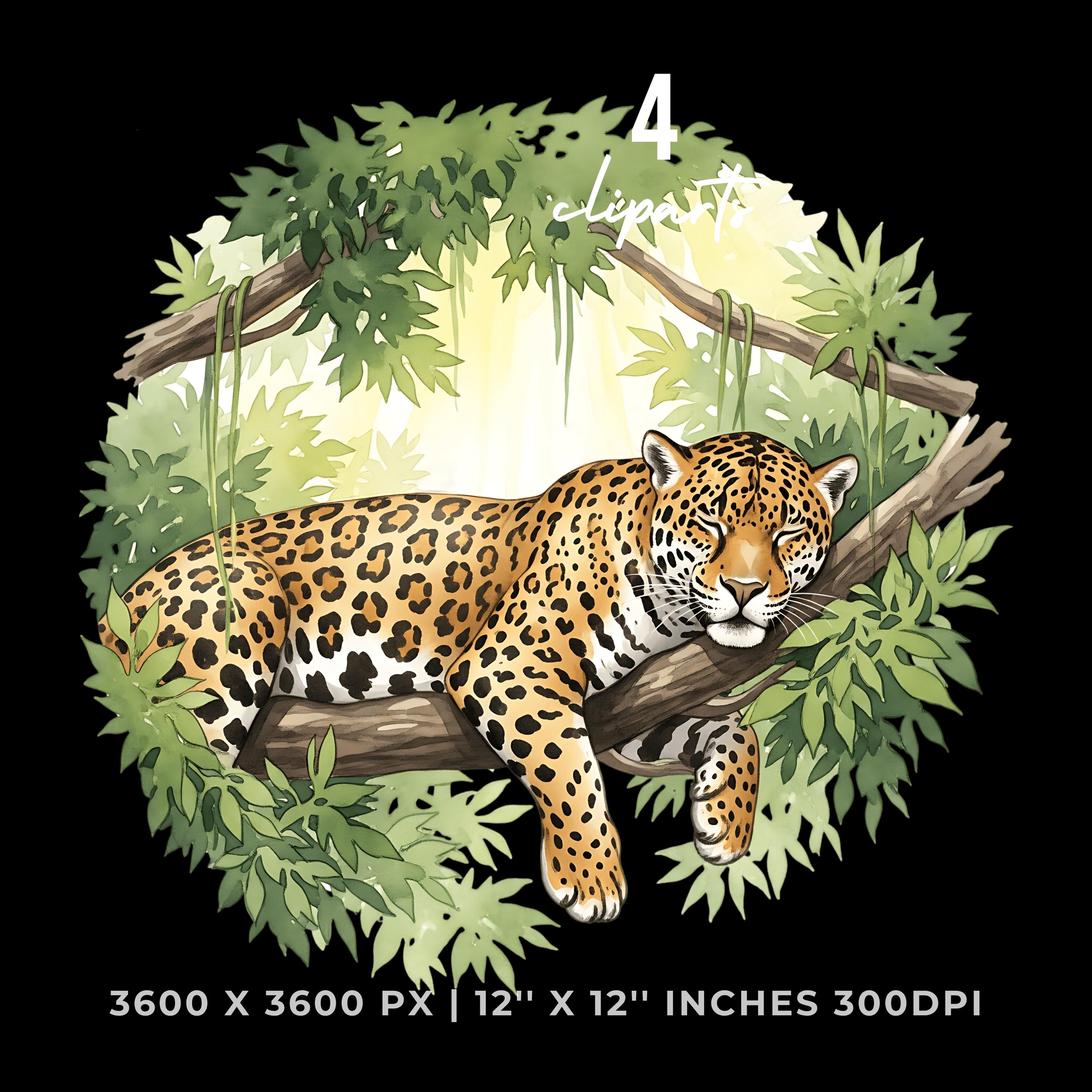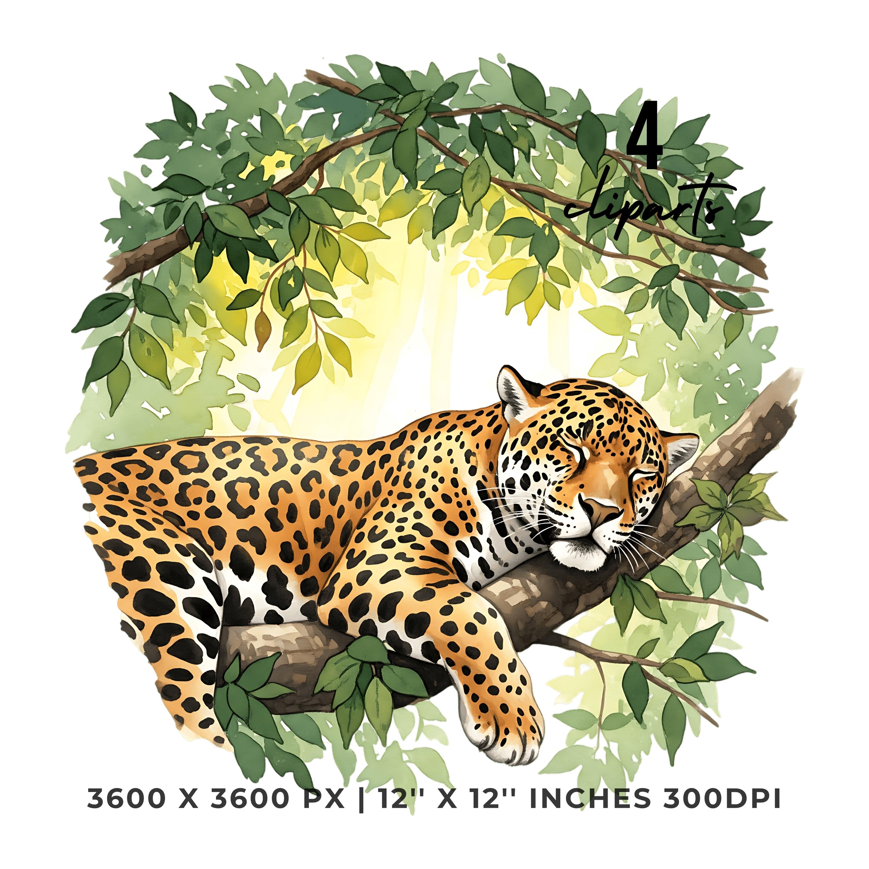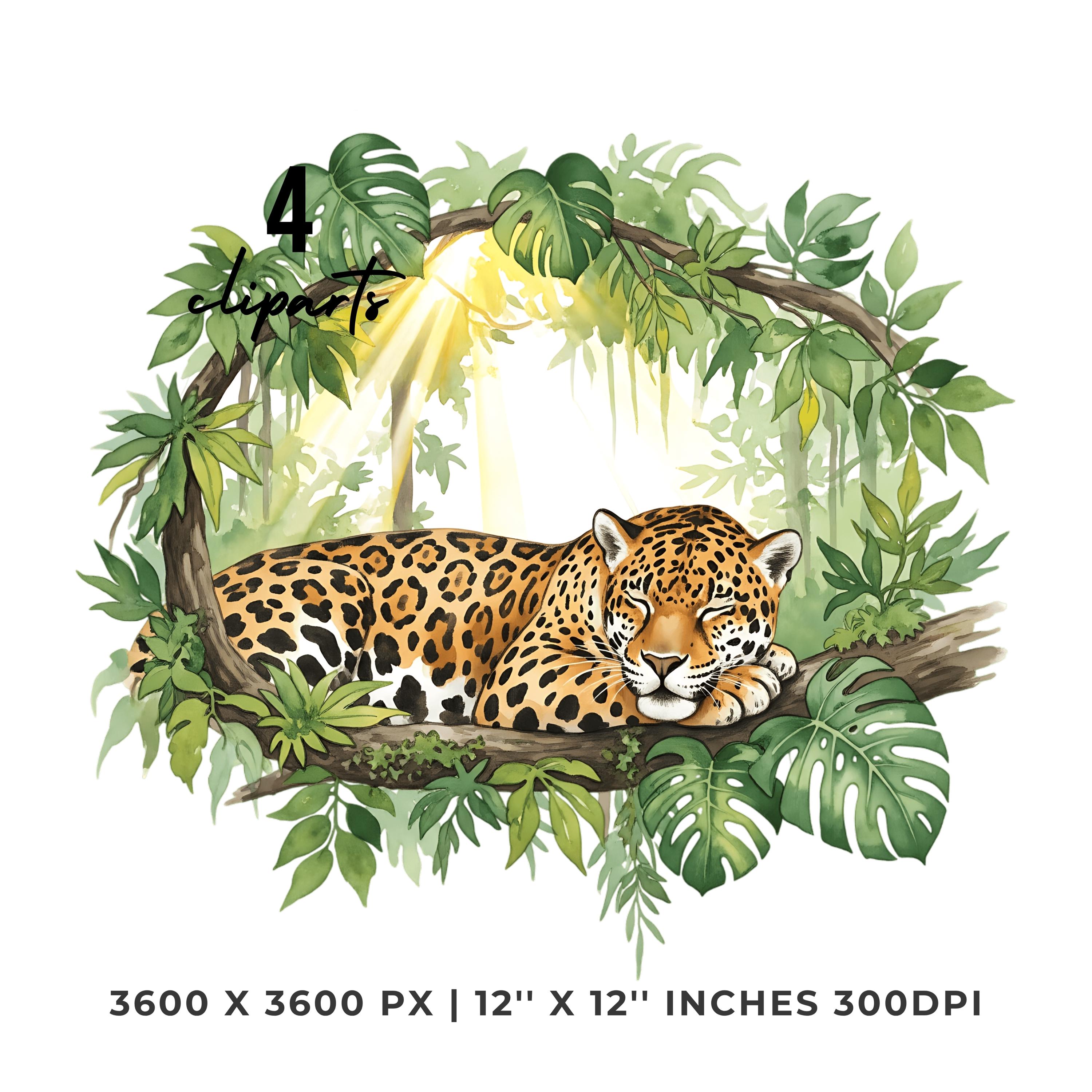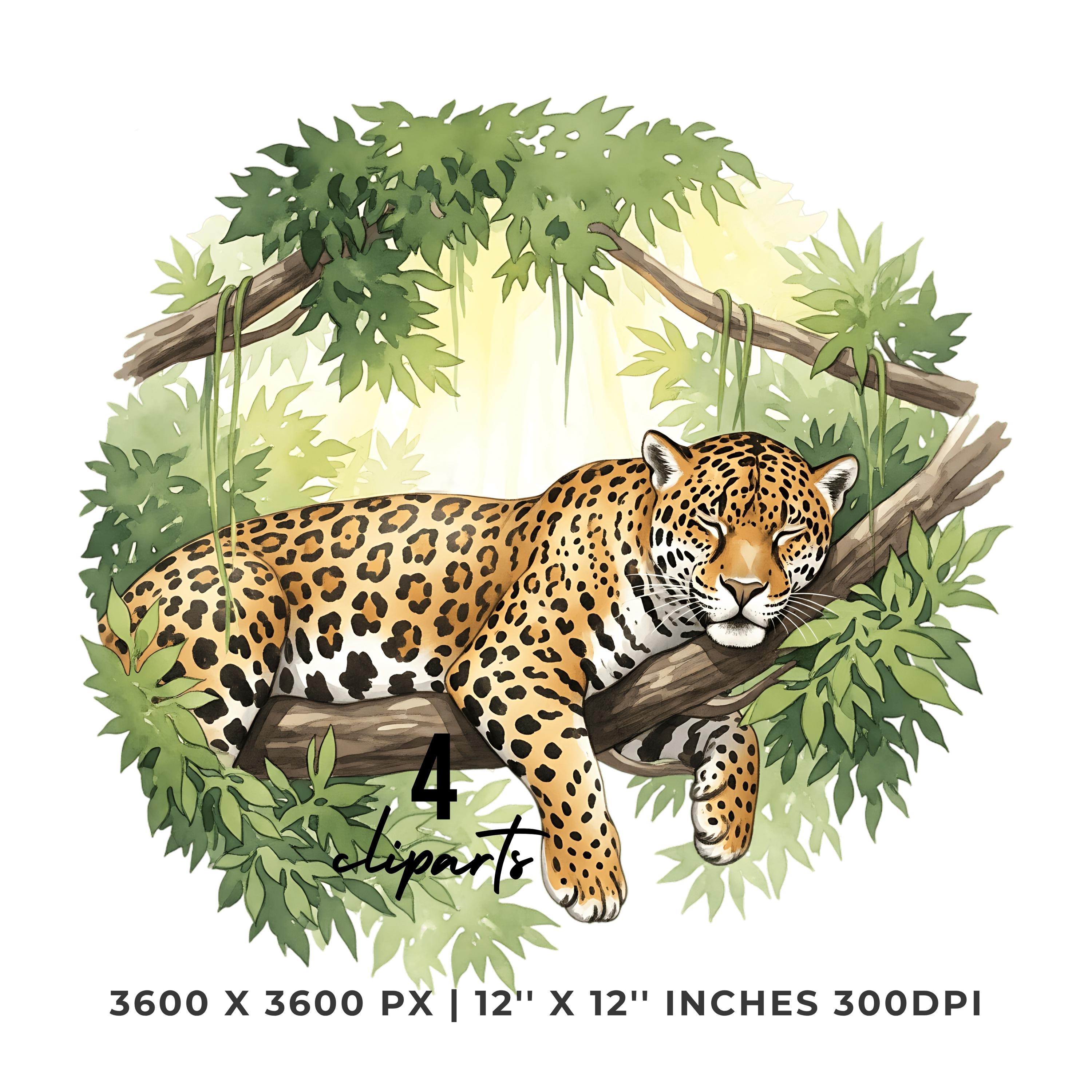 Jaguar Clipart PNG | 4 Watercolor Jaguar taking a nap in a rainforest canopy, sunlight through the leaves | Sublimation Commercial Use is an eye-catching, high-resolution digital asset designed for creators, crafters, teachers, and small business owners looking to elevate their visuals.
