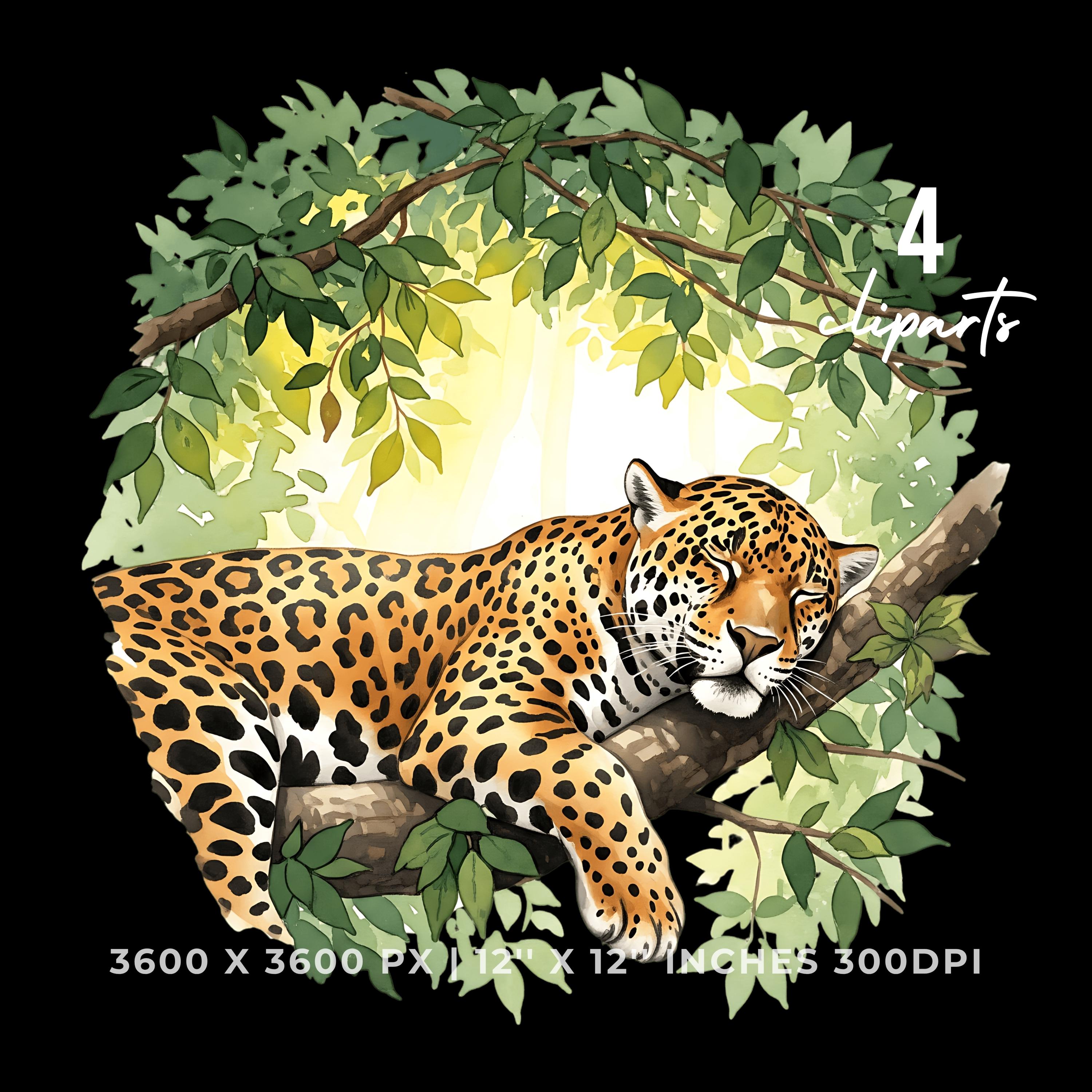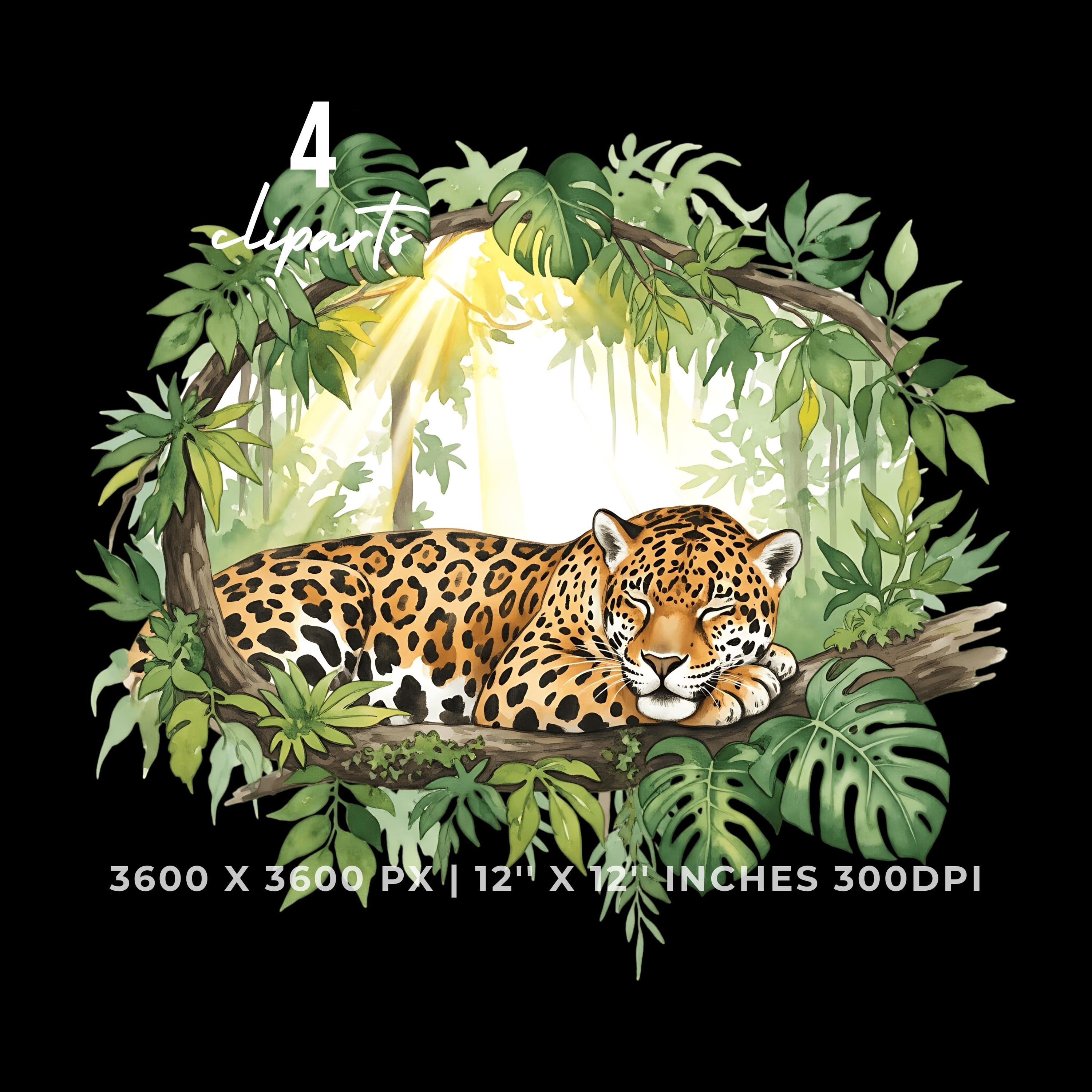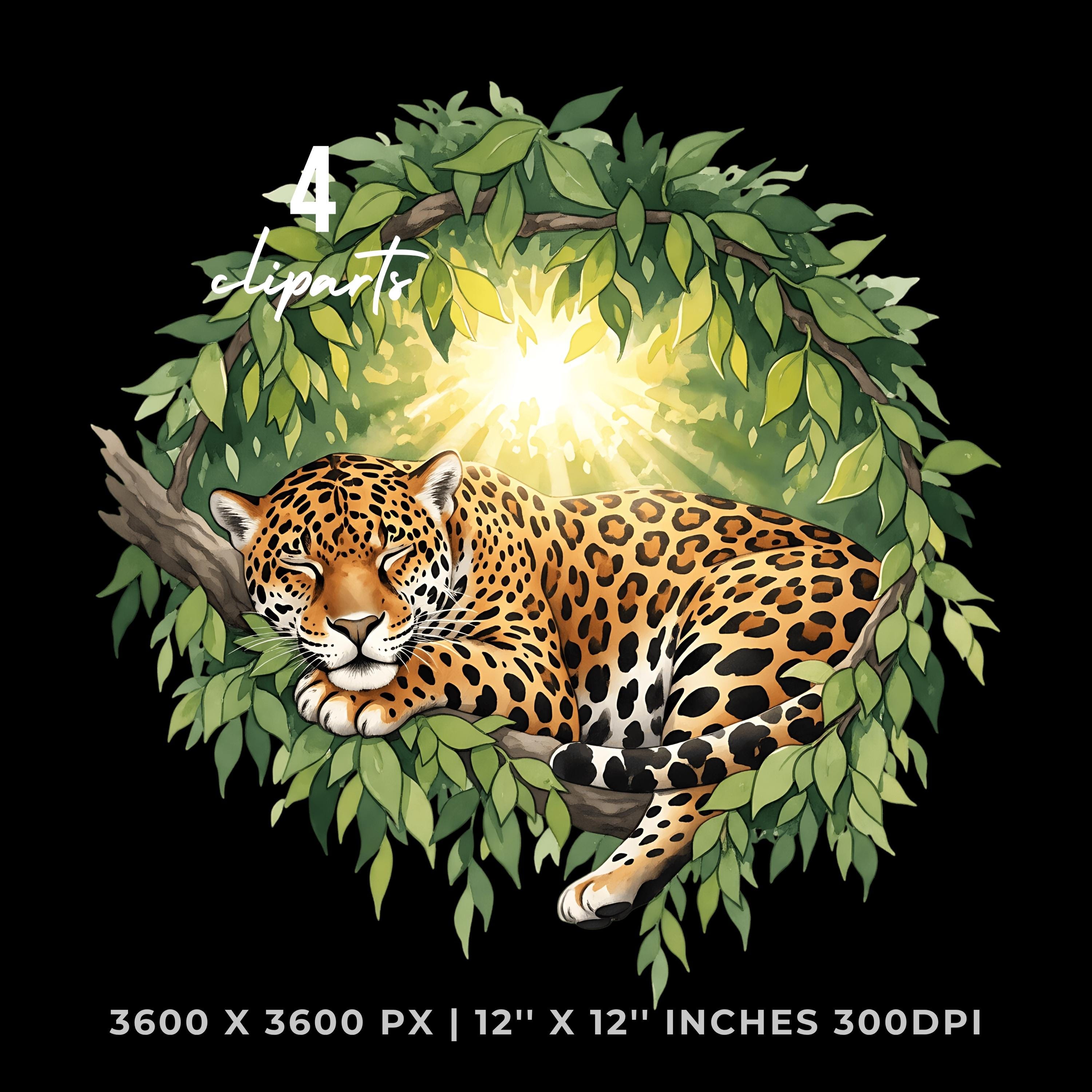 Jaguar Clipart PNG | 4 Watercolor Jaguar taking a nap in a rainforest canopy, golden summer light filtering through the leaves | Sublimation Transparent Commercial Use