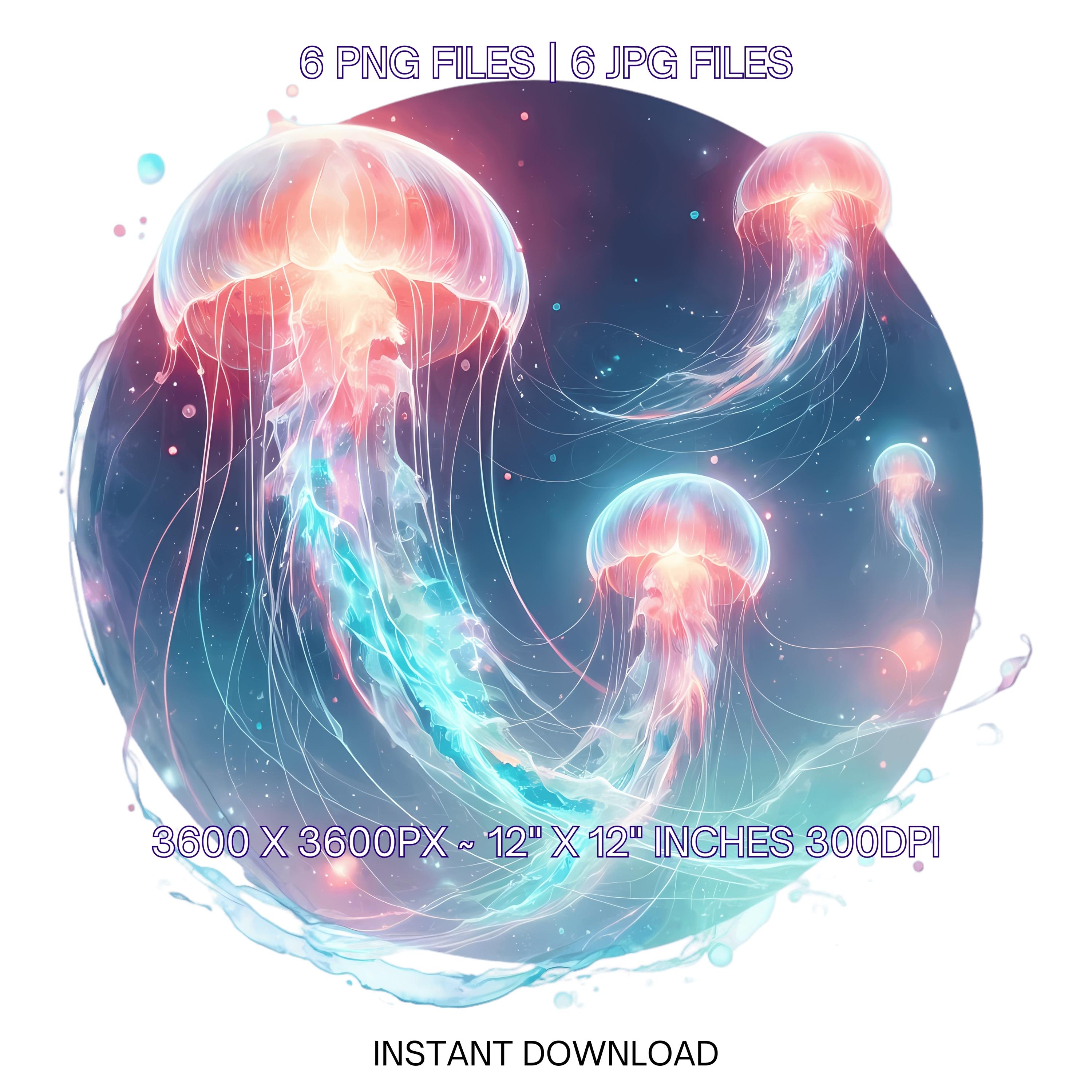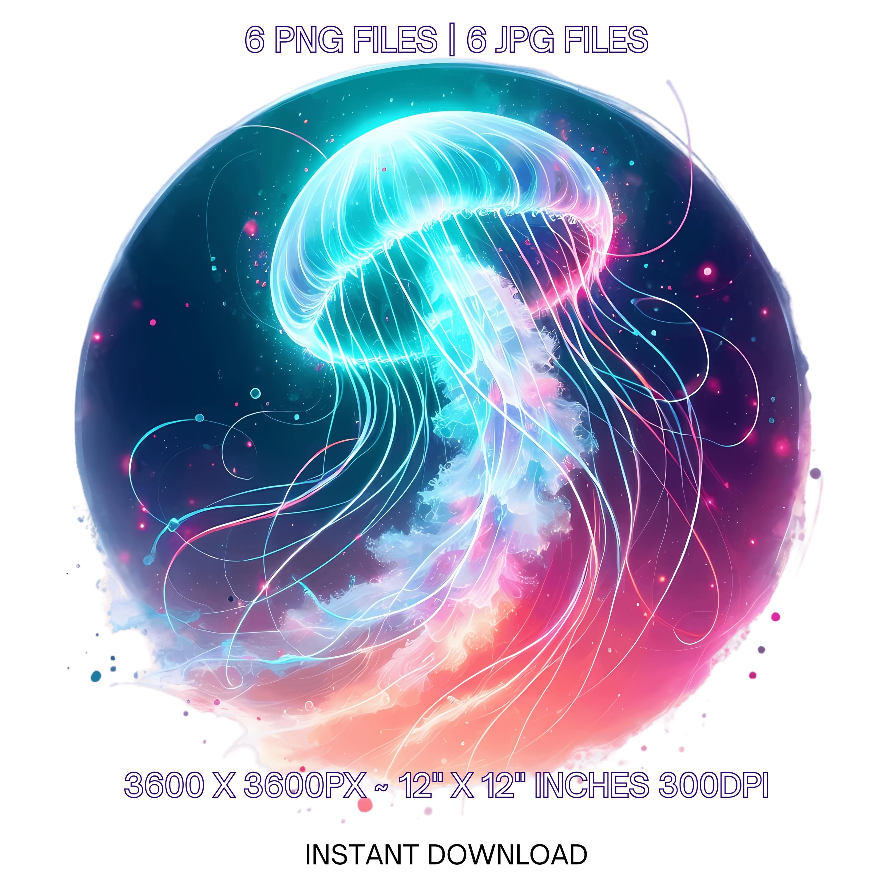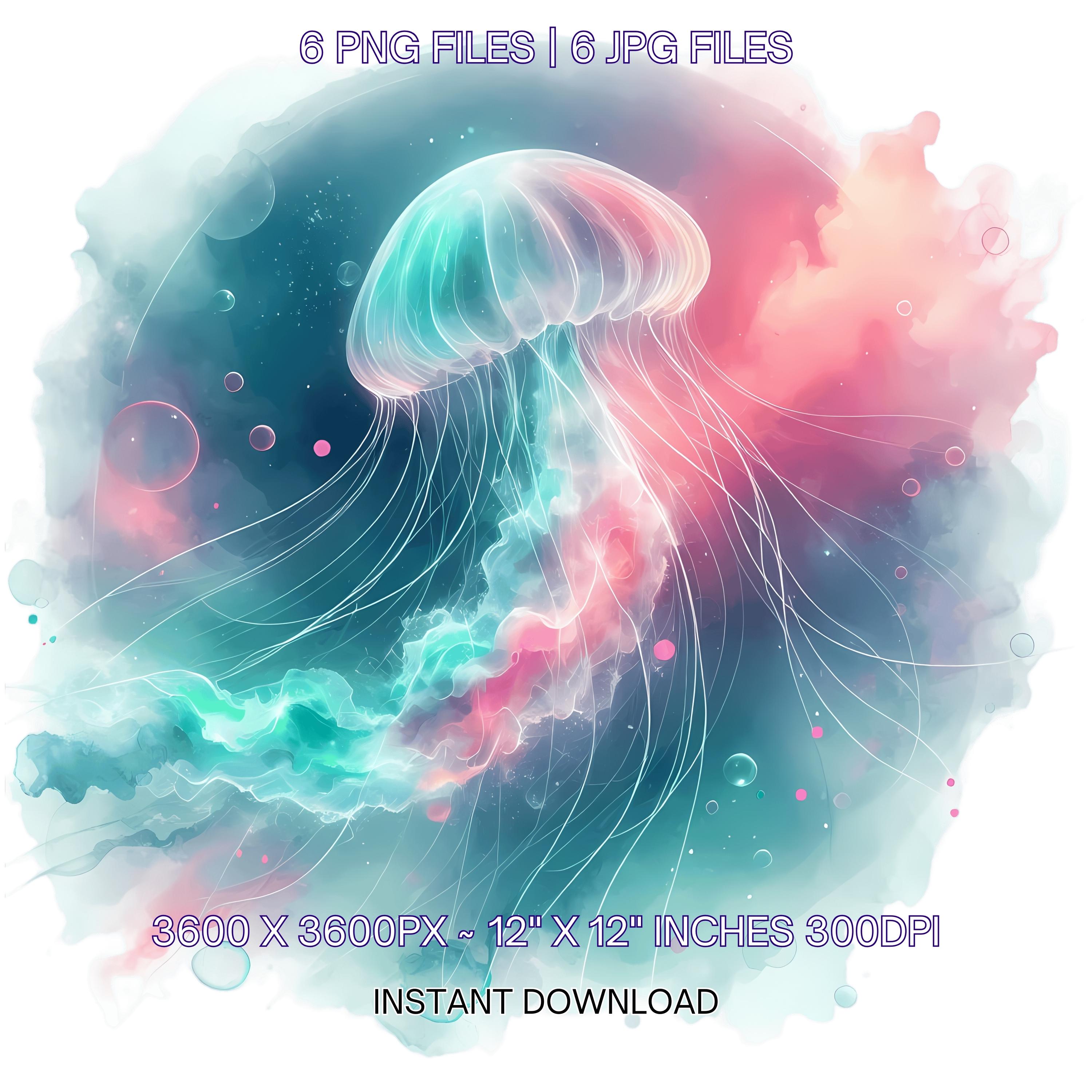Jellyfish Clipart PNG | 6 Watercolor Jellyfish floating Gracefully in neon-colored currents & dreamy underwater | Sublimation Commercial Use is an eye-catching, high-resolution digital asset designed for creators, crafters, teachers, and small business owners looking to elevate their visuals.