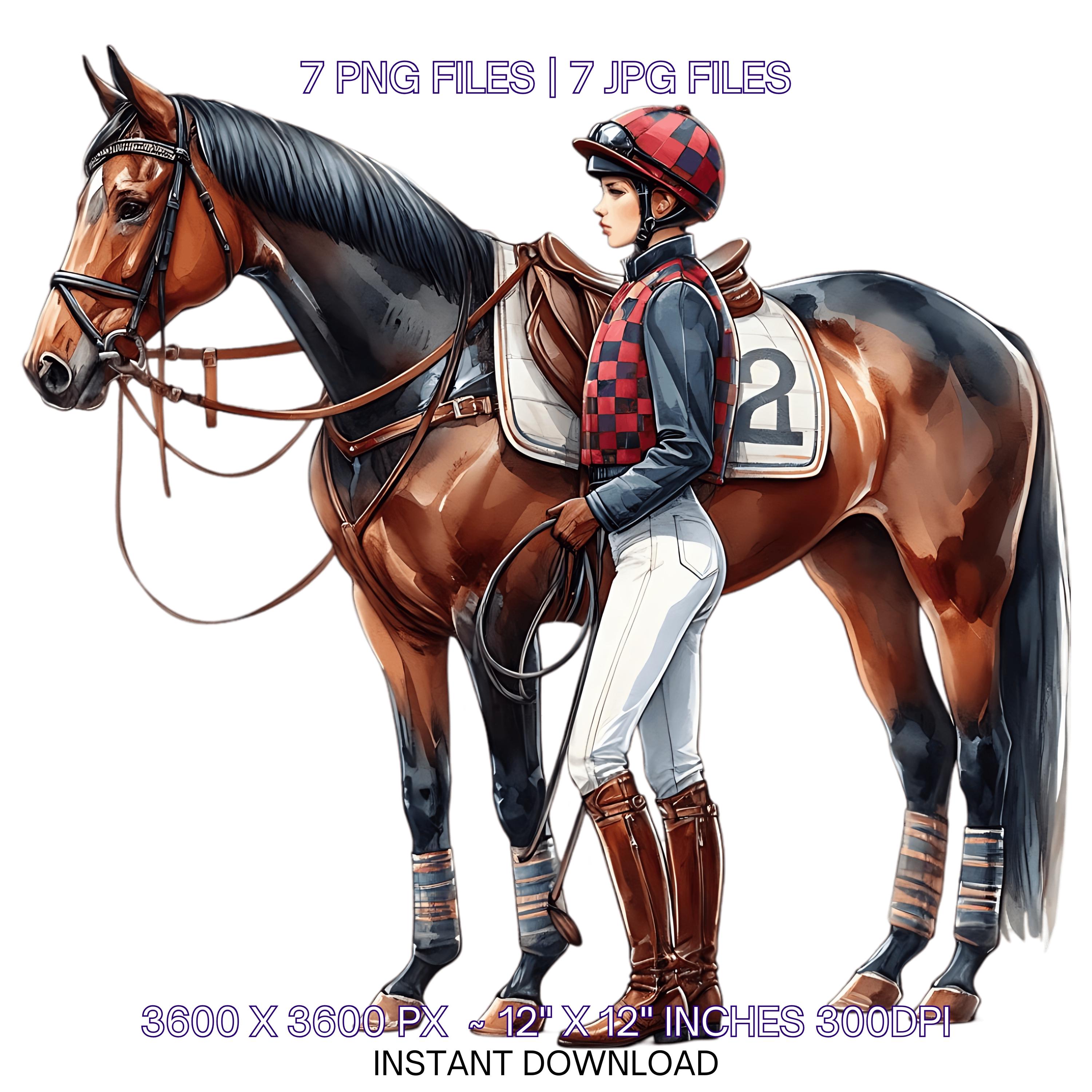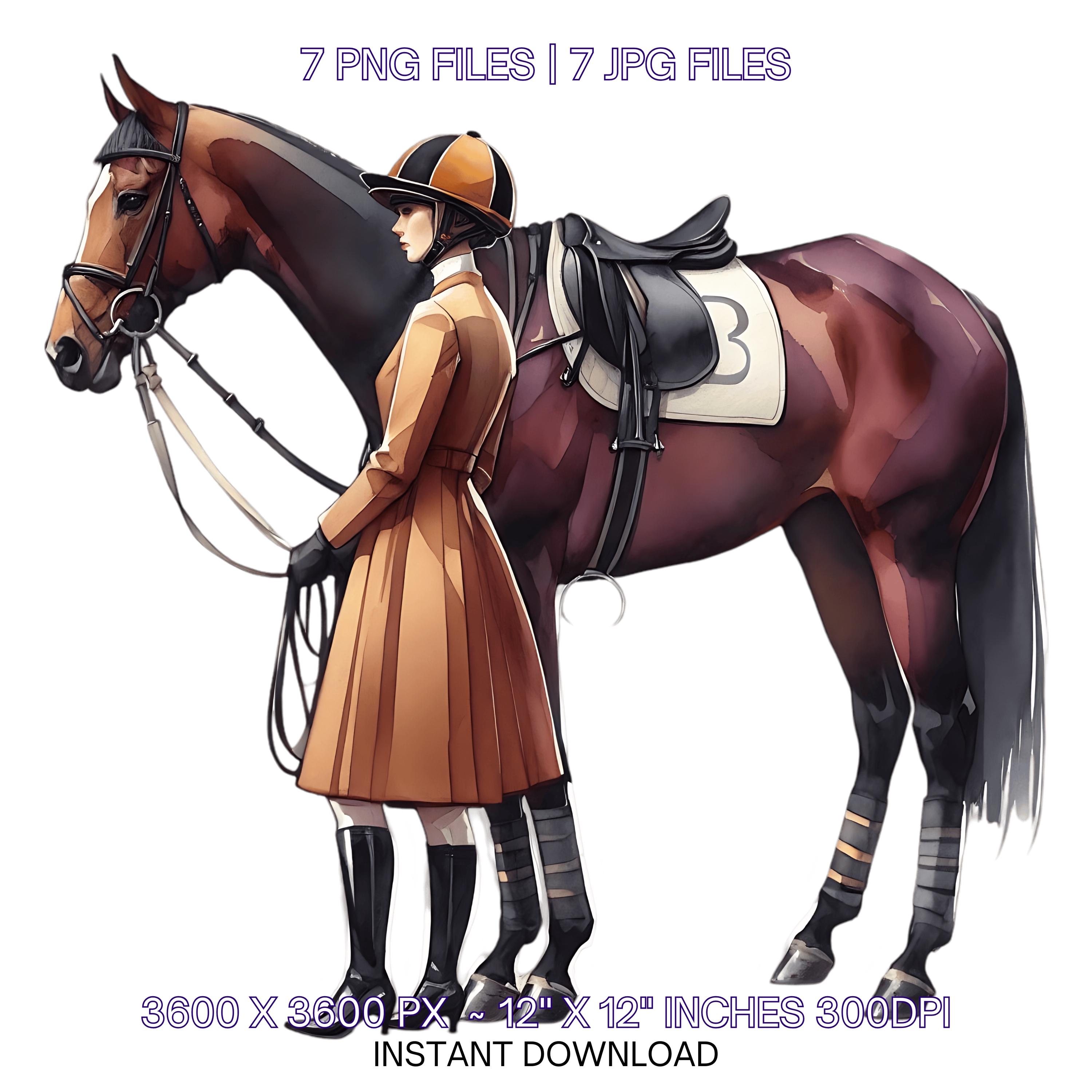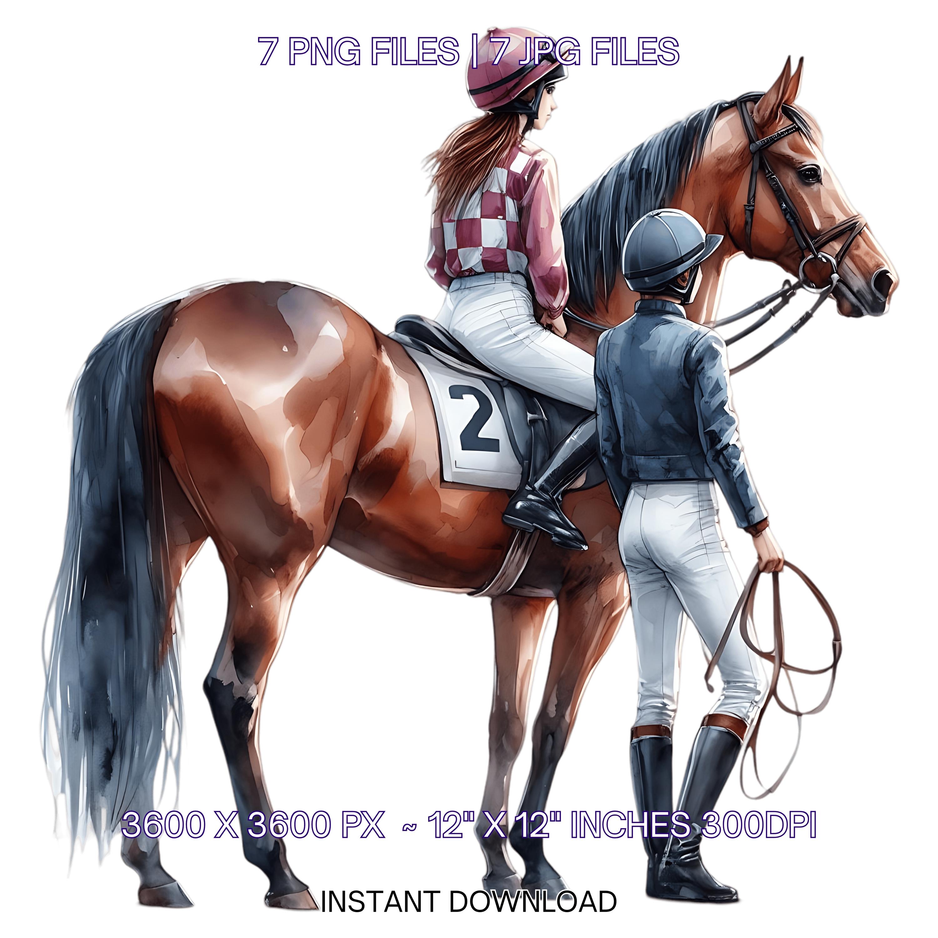 Jockey Girl & Horse Clipart PNG | 7 Watercolor Equestrian Sport Female Jockey | Sublimation Illustration Design | Commercial use is an eye-catching, high-resolution digital asset designed for creators, crafters, teachers, and small business owners looking to elevate their visuals.