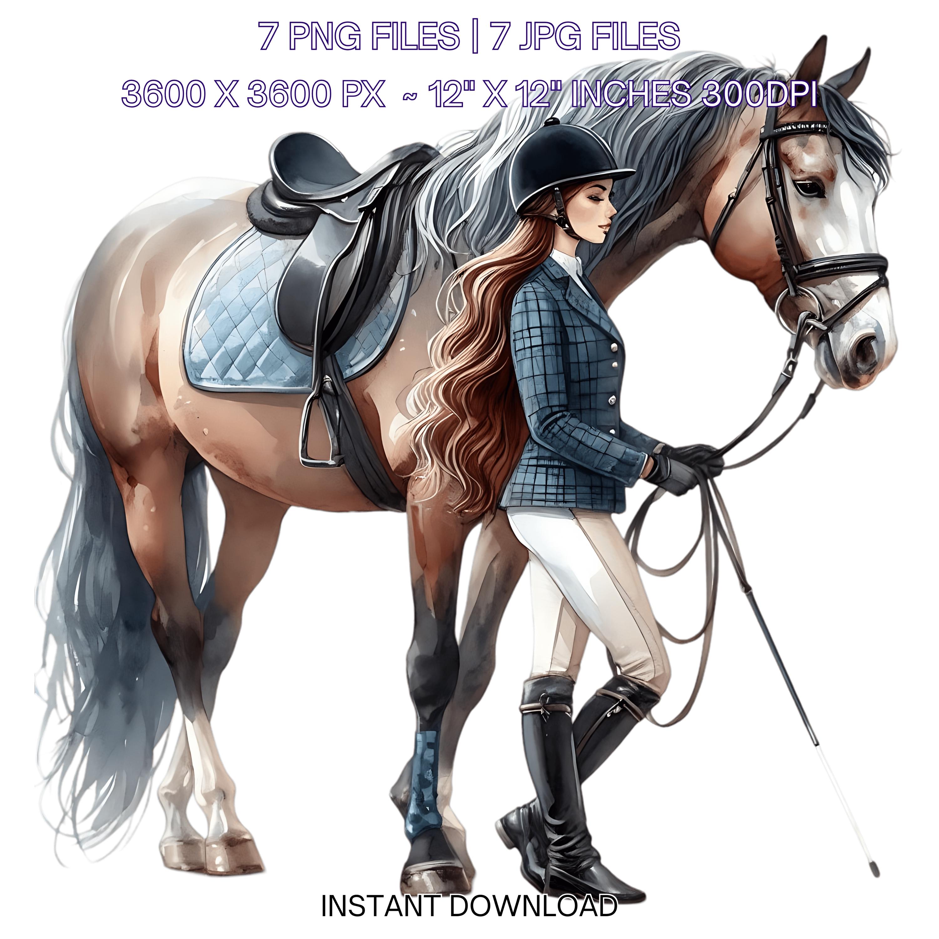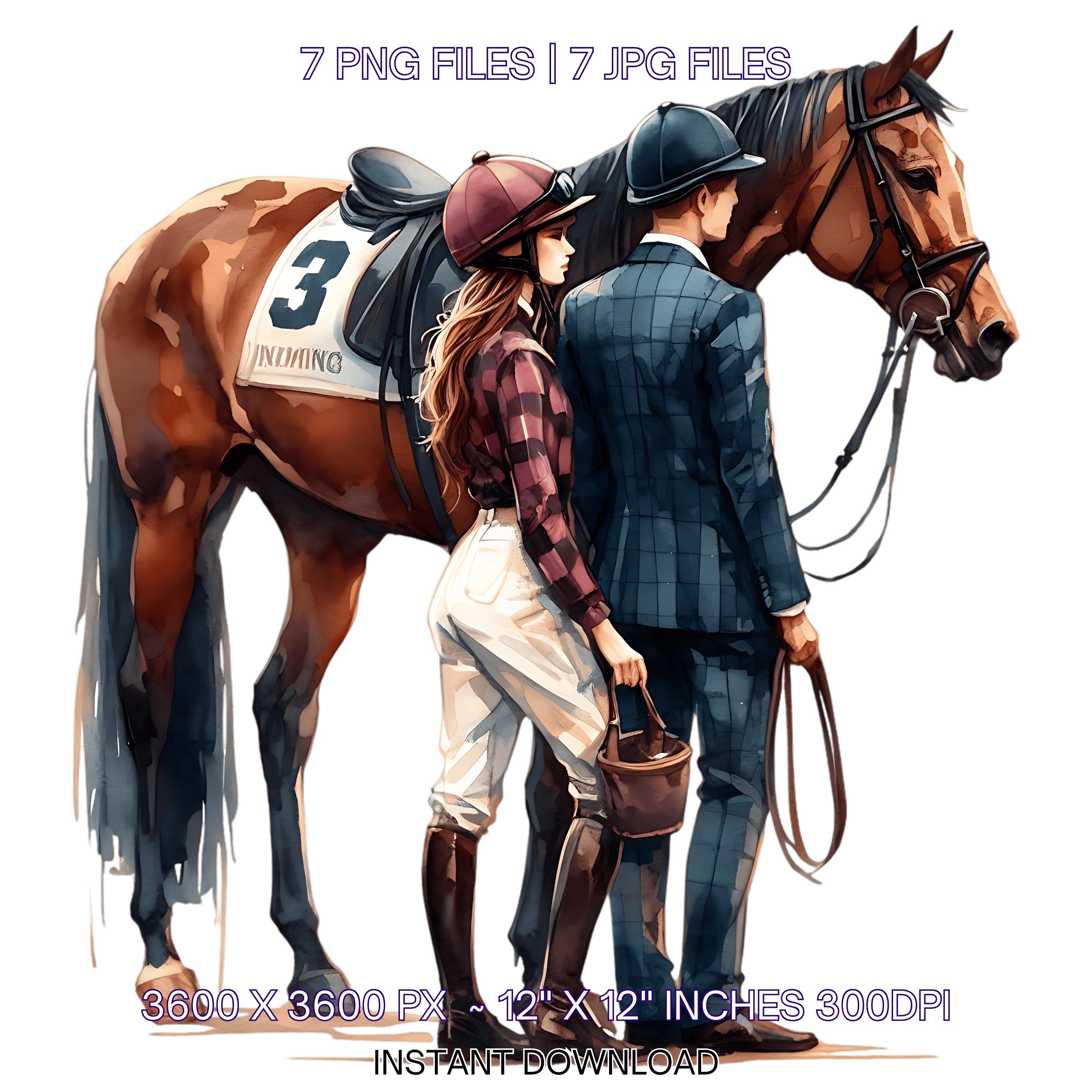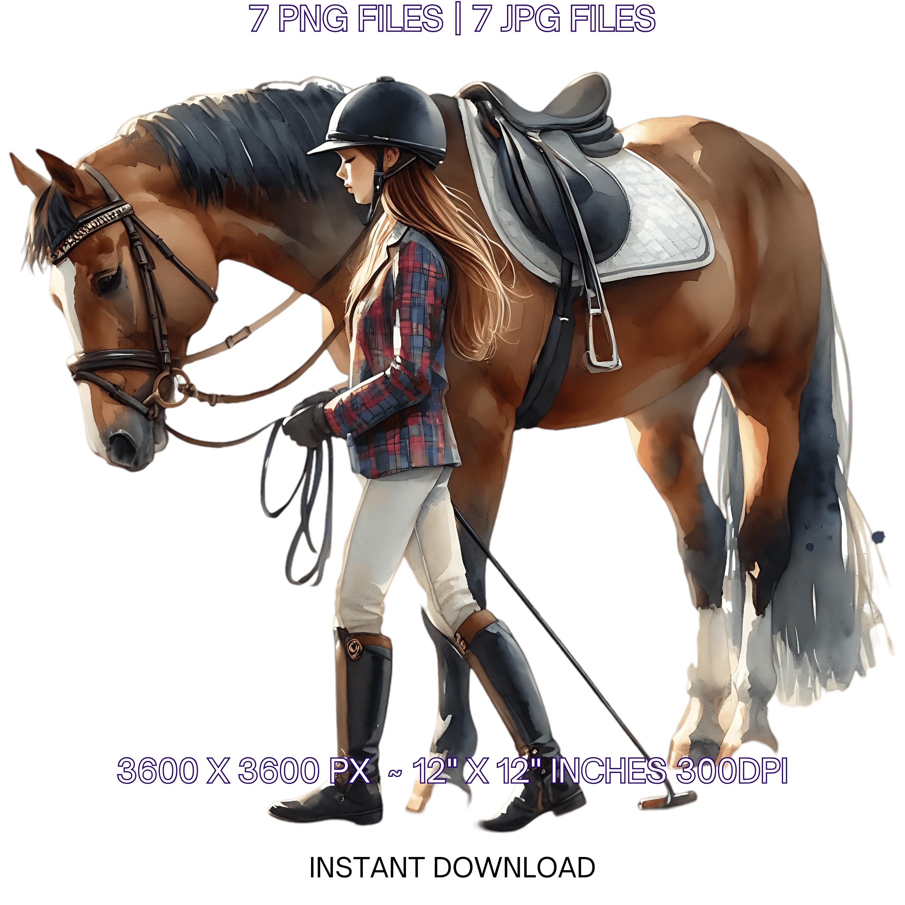 Jockey Girl & Horse Clipart PNG | 7 Watercolor Equestrian Sport Female Jockey | Sublimation Illustration Design | Commercial use is an eye-catching, high-resolution digital asset designed for creators, crafters, teachers, and small business owners looking to elevate their visuals.