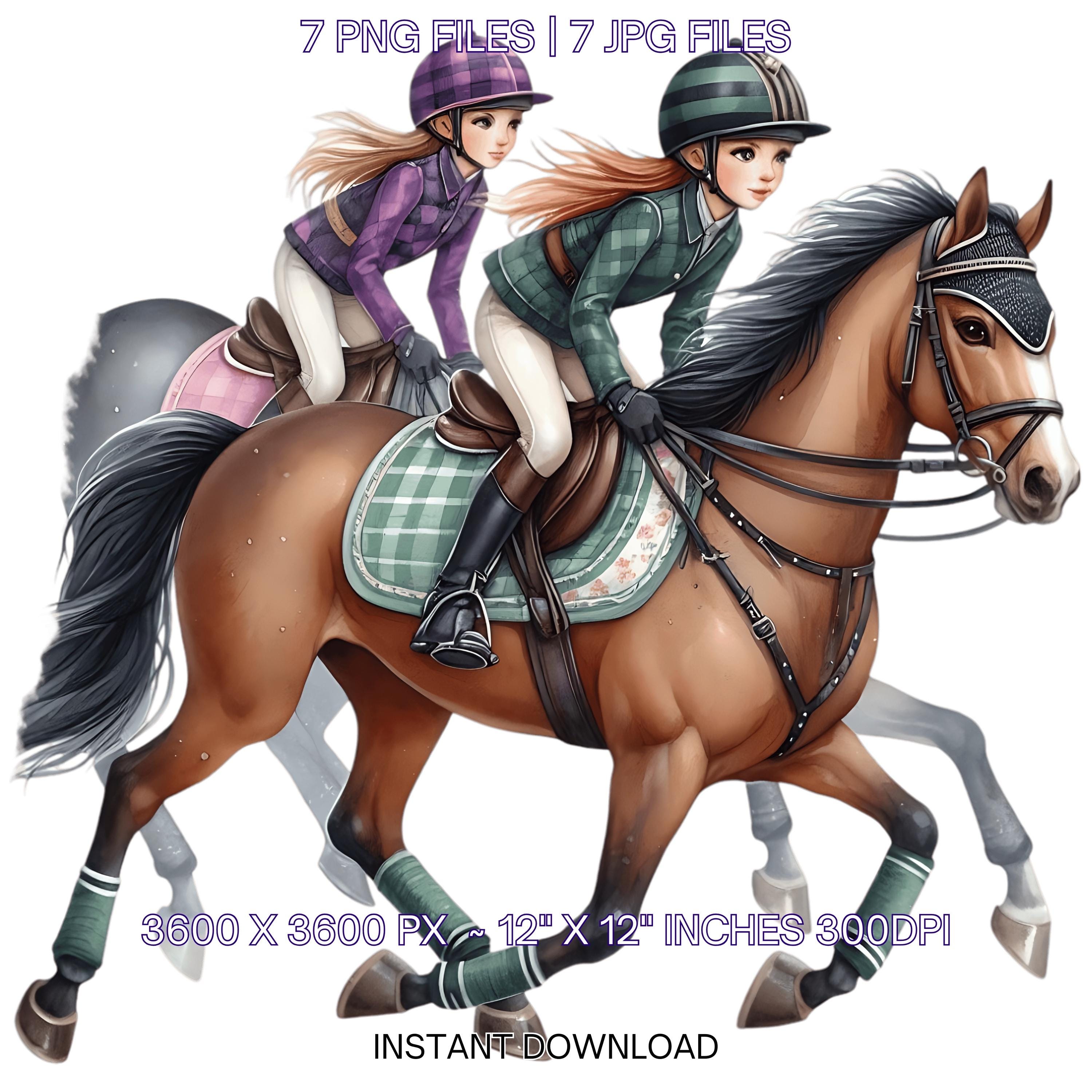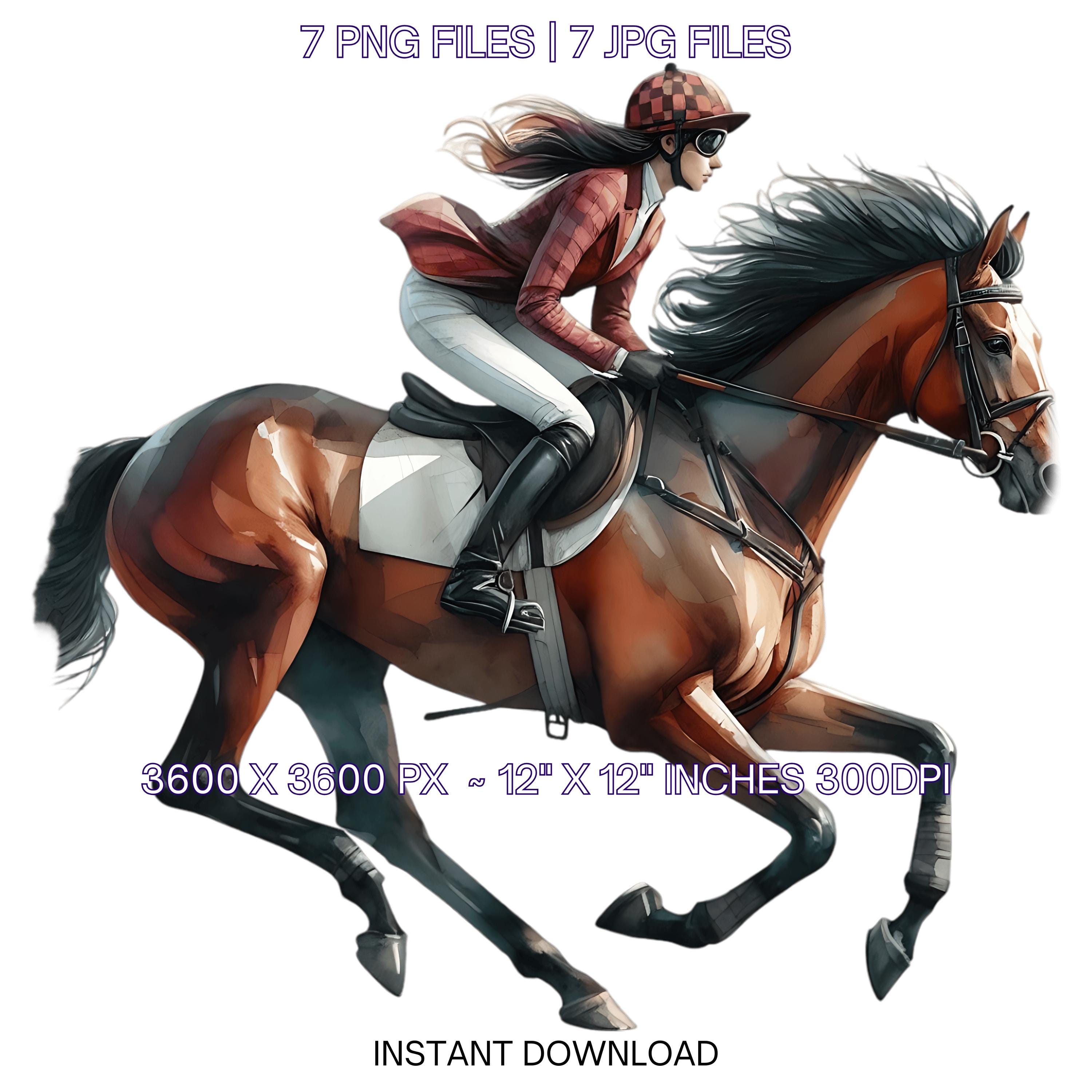 Jockey Girl Horseback Riding Clipart PNG | 7 Watercolor Equestrian Sport Female Jockey | Sublimation Illustration Design | Commercial use is an eye-catching, high-resolution digital asset designed for creators, crafters, teachers, and small business owners looking to elevate their visuals.