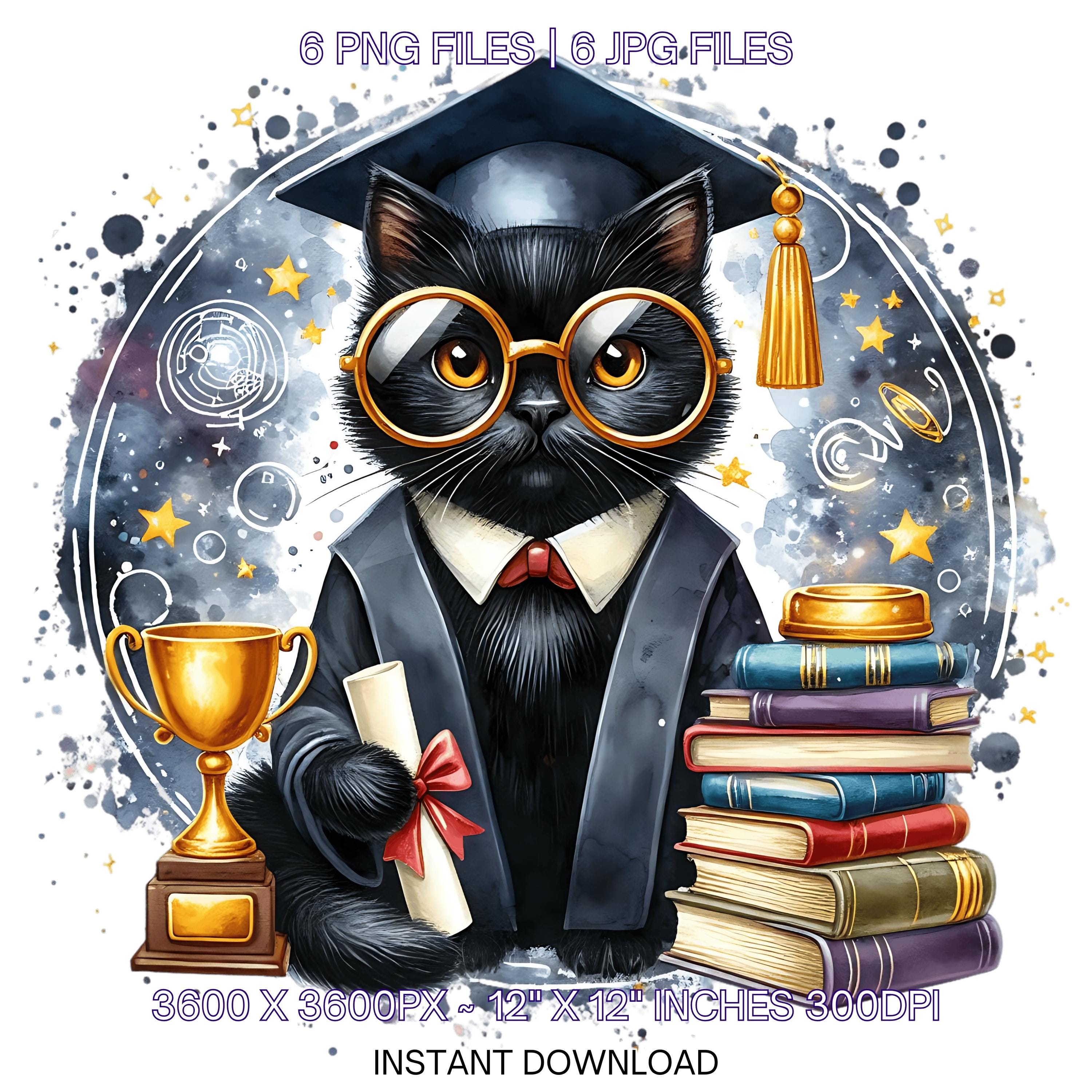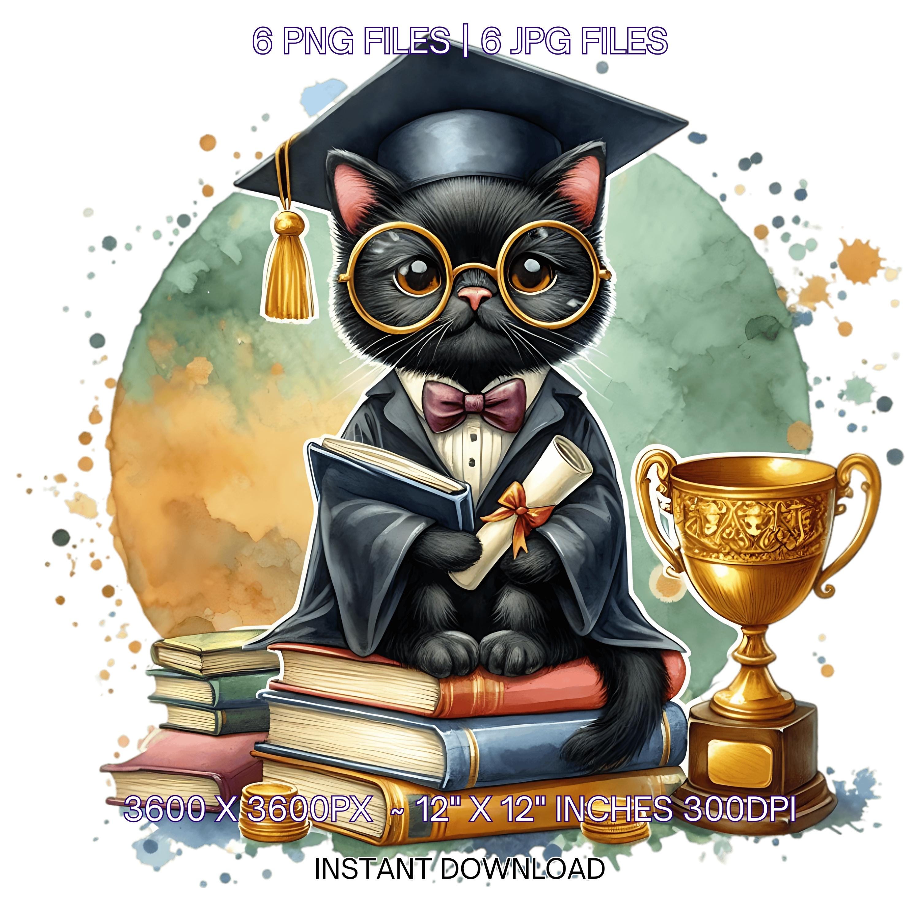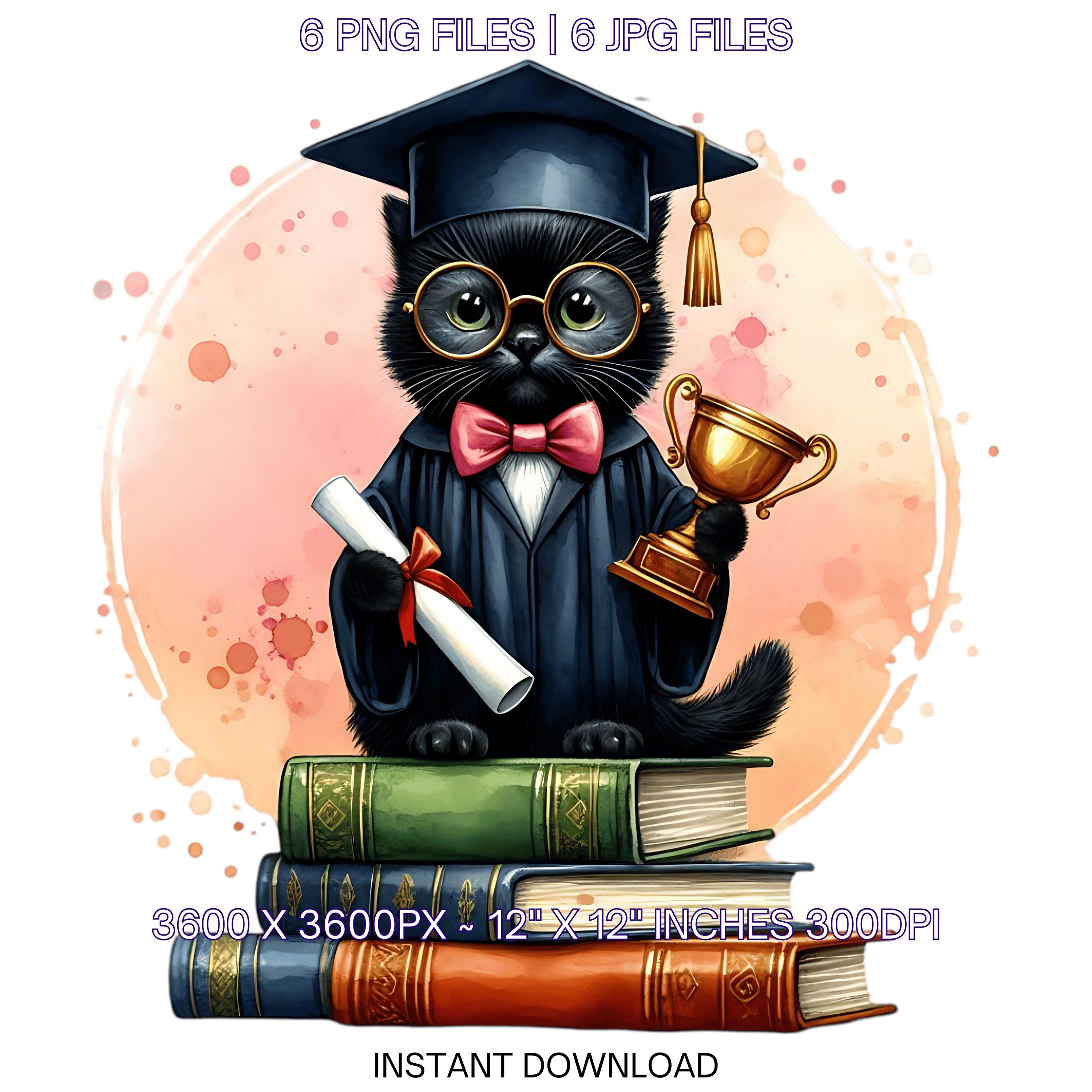 Kindergarten Black Cat wearing Cap holding a Diploma PNG | Graduation Cat Clipart | Grad Student | Graduate Kid | 6 JPG-PNG Commercial Use is an eye-catching, high-resolution digital asset designed for creators, crafters, teachers, and small business owners looking to elevate their visuals.