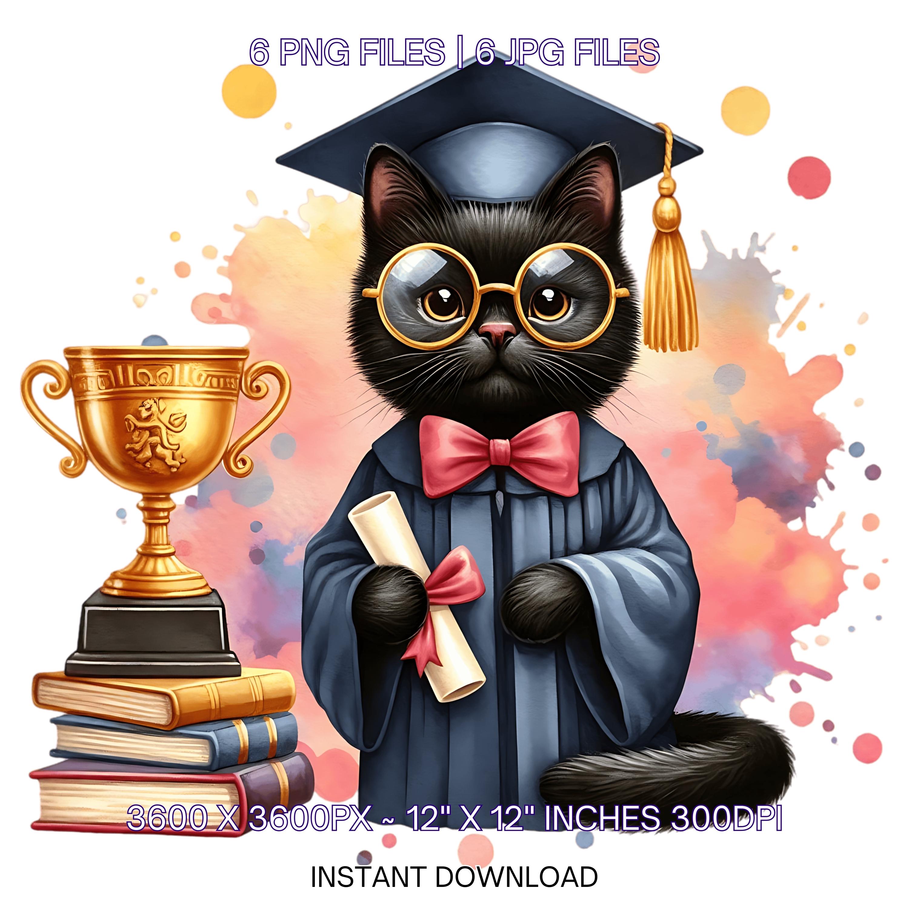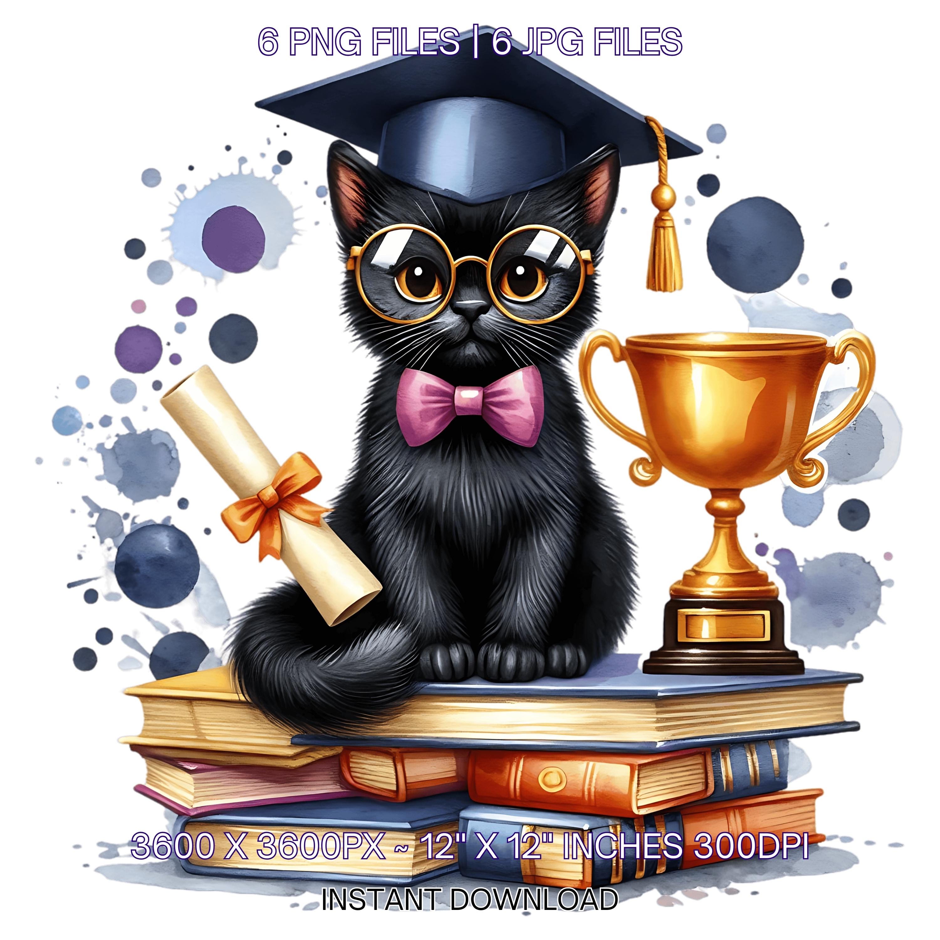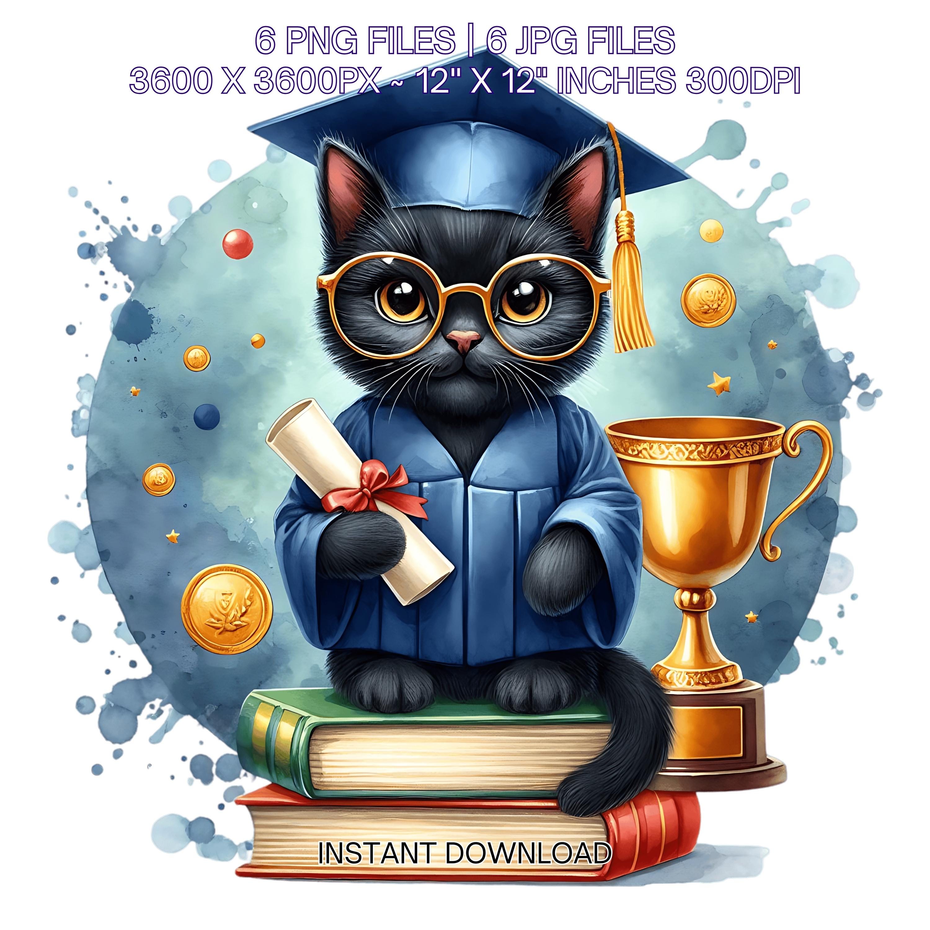 Kindergarten Black Cat wearing Cap holding a Diploma PNG | Graduation Cat Clipart | Grad Student | Graduate Kid | 6 JPG-PNG Commercial Use is an eye-catching, high-resolution digital asset designed for creators, crafters, teachers, and small business owners looking to elevate their visuals.