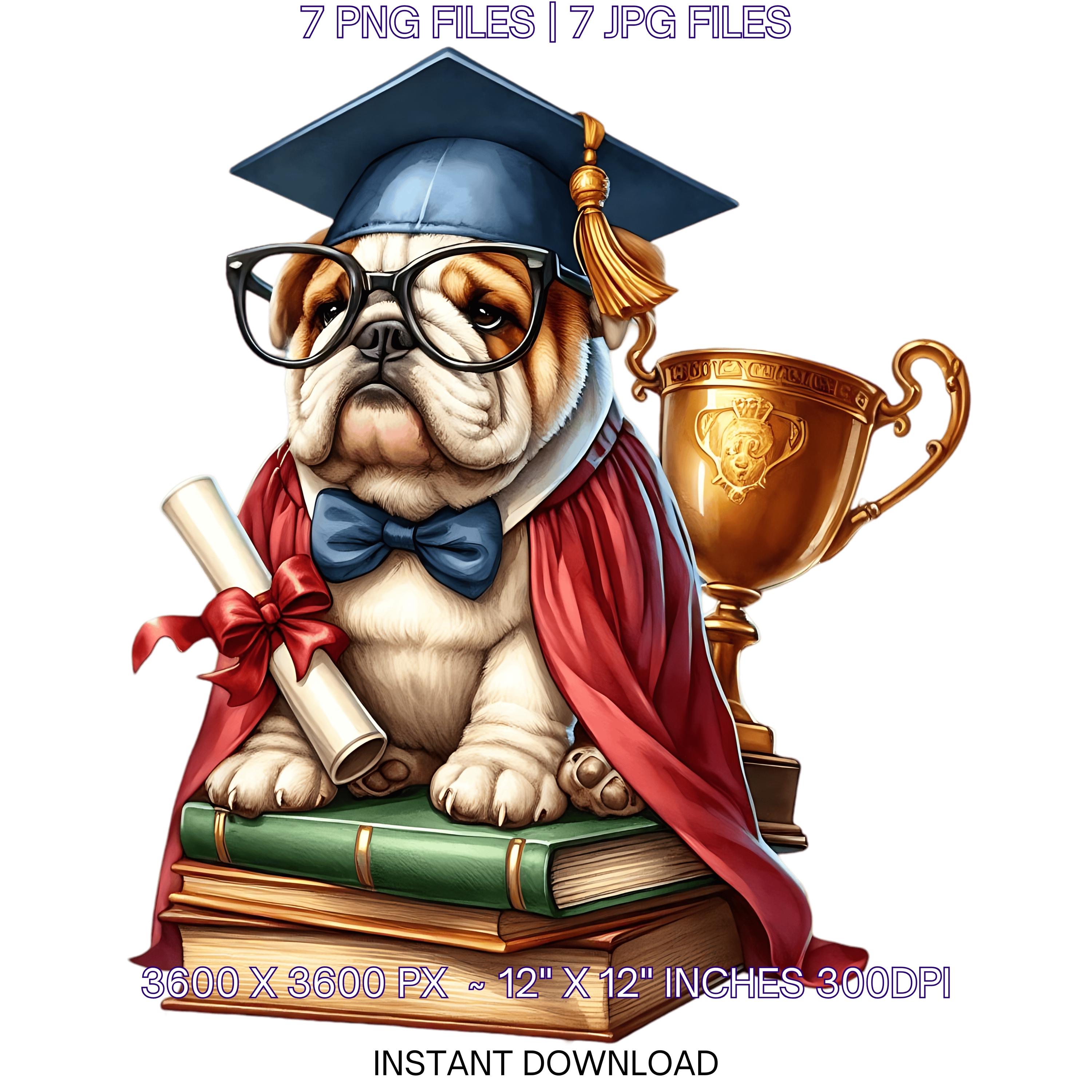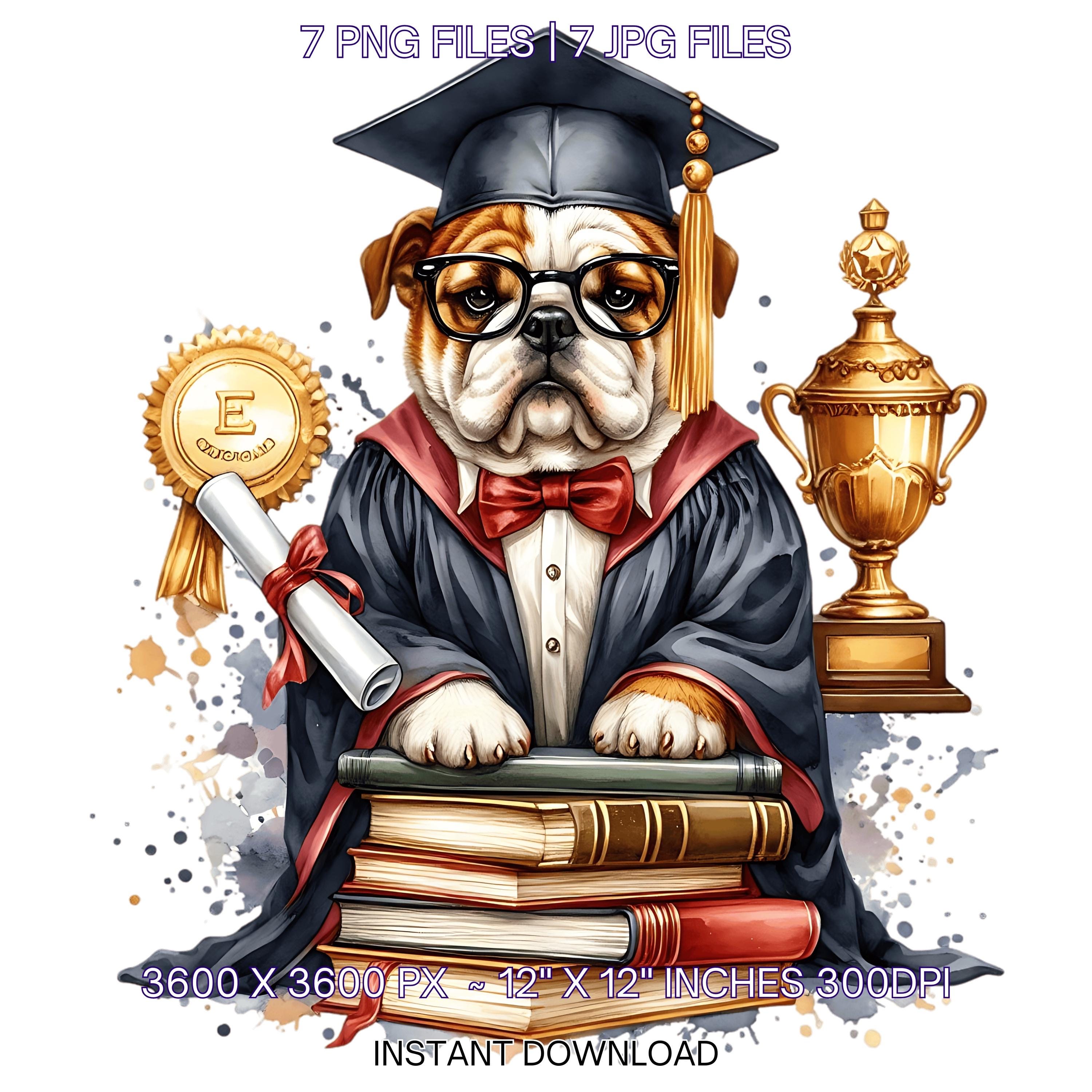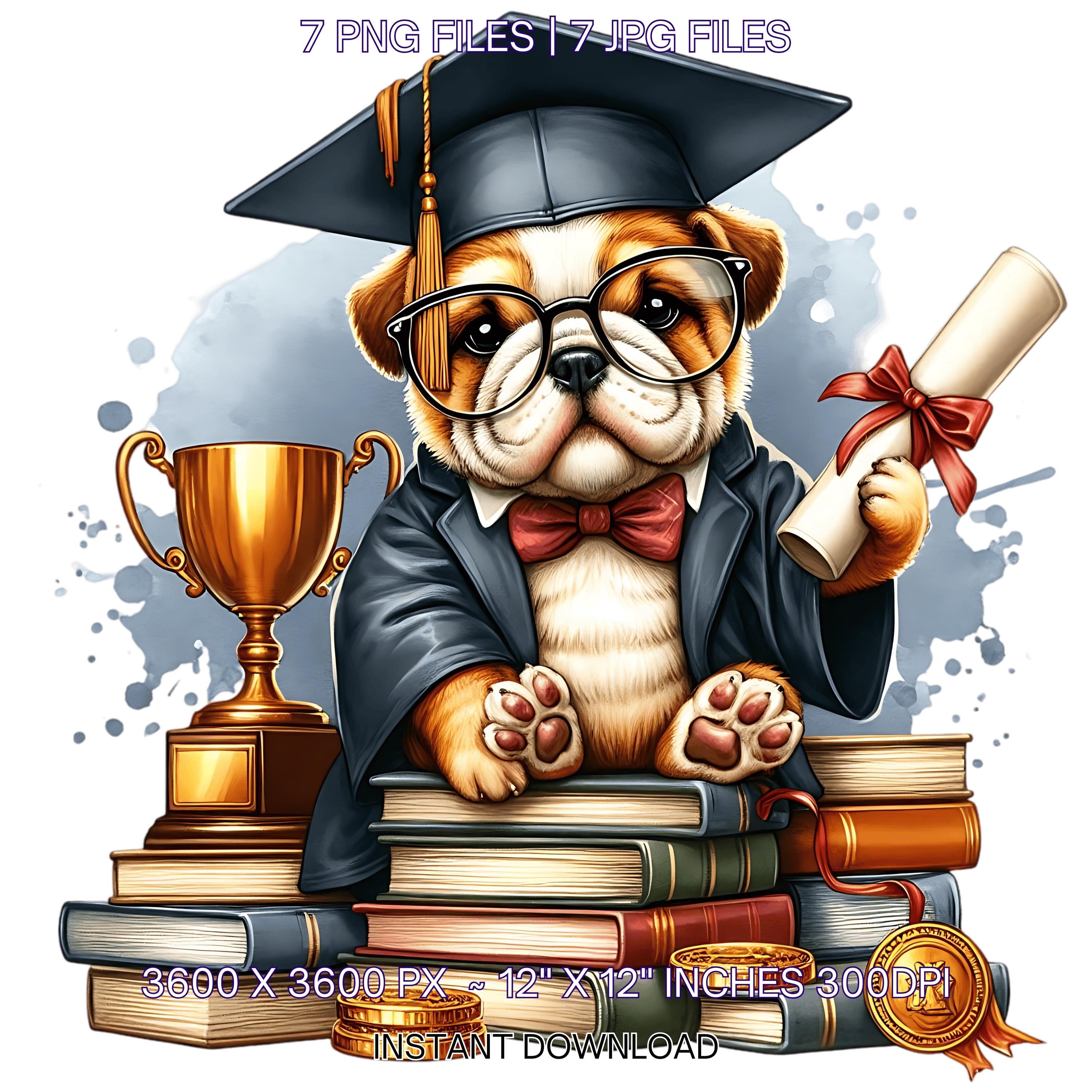 Kindergarten Bulldog Dog wearing Cap holding a Diploma PNG | Graduation Bulldog Clipart | Grad Student | Graduate Kid | 7 JPG-PNG Commercial is an eye-catching, high-resolution digital asset designed for creators, crafters, teachers, and small business owners looking to elevate their visuals.