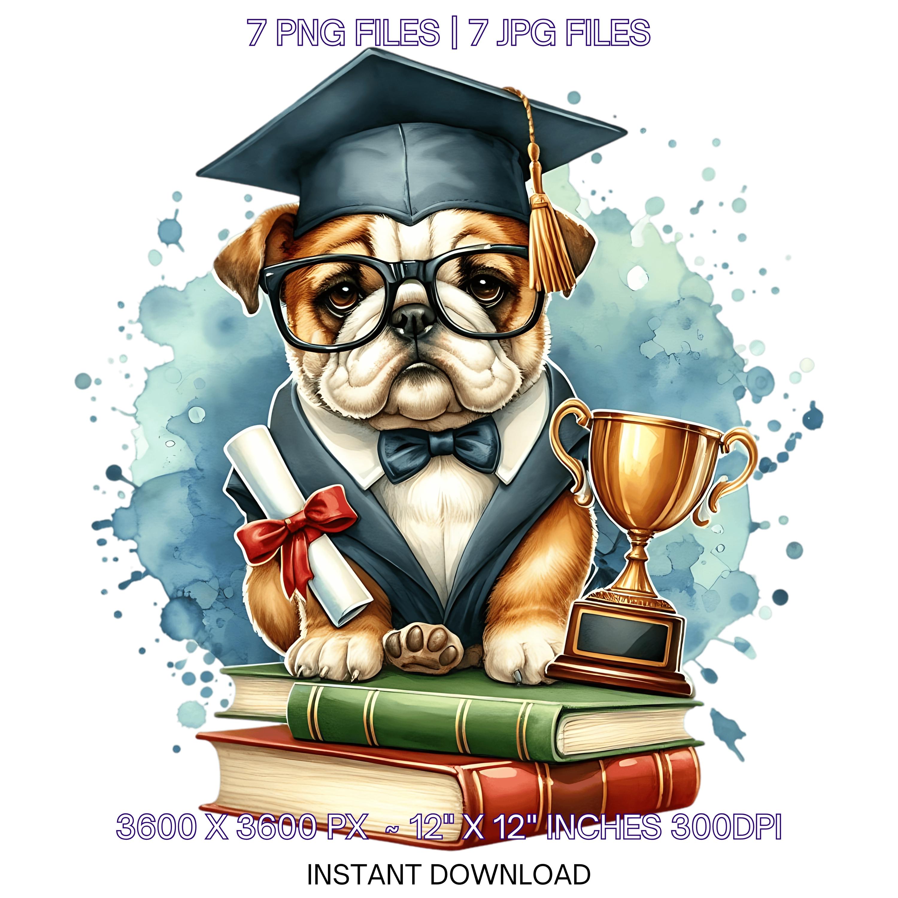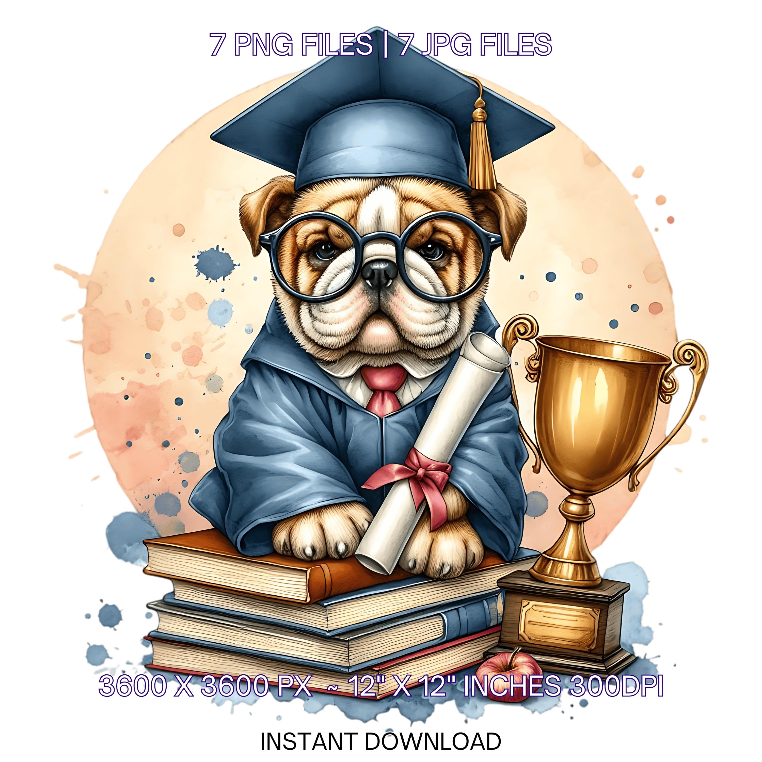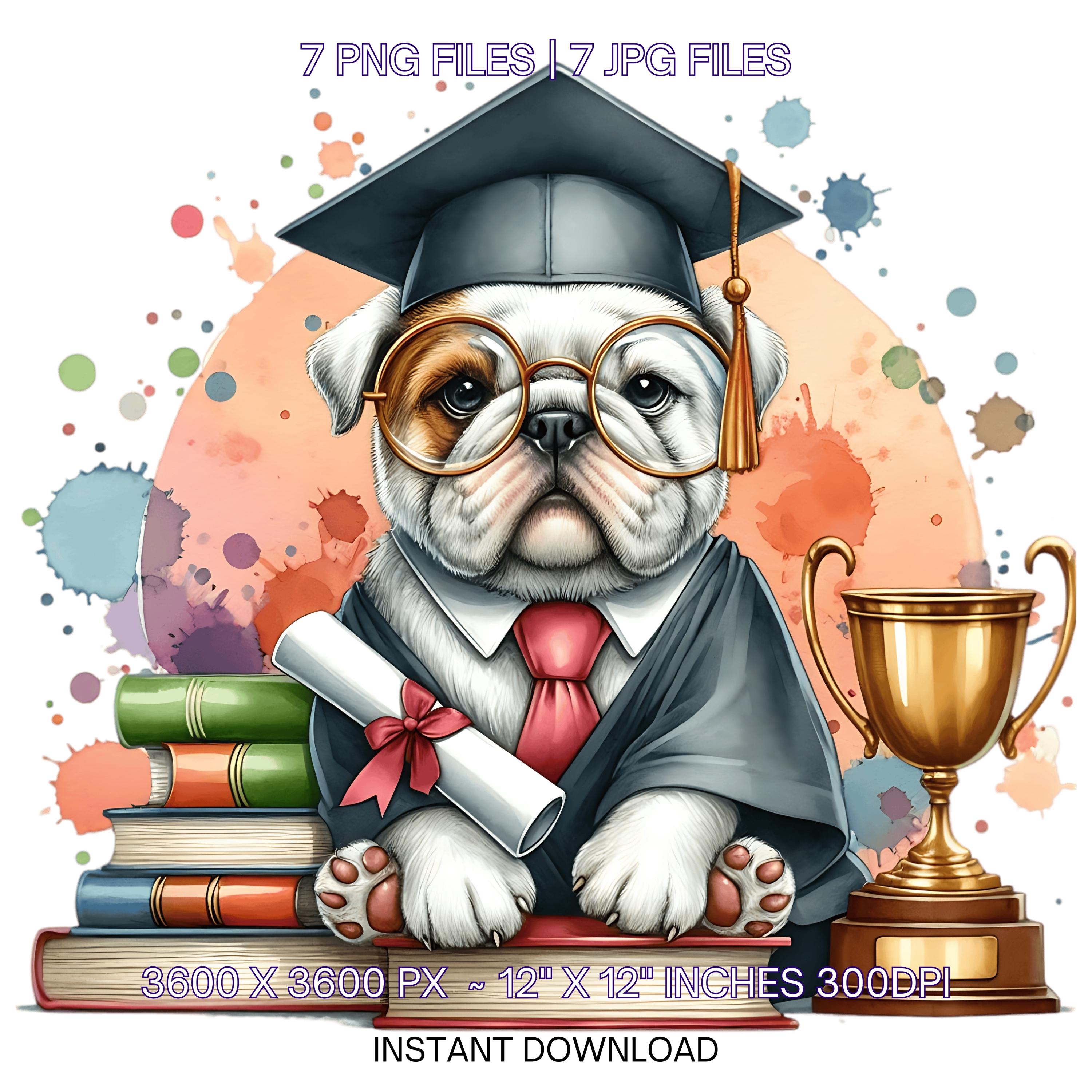 Kindergarten Bulldog Dog wearing Cap holding a Diploma PNG | Graduation Bulldog Clipart | Grad Student | Graduate Kid | 7 JPG-PNG Commercial is an eye-catching, high-resolution digital asset designed for creators, crafters, teachers, and small business owners looking to elevate their visuals.
