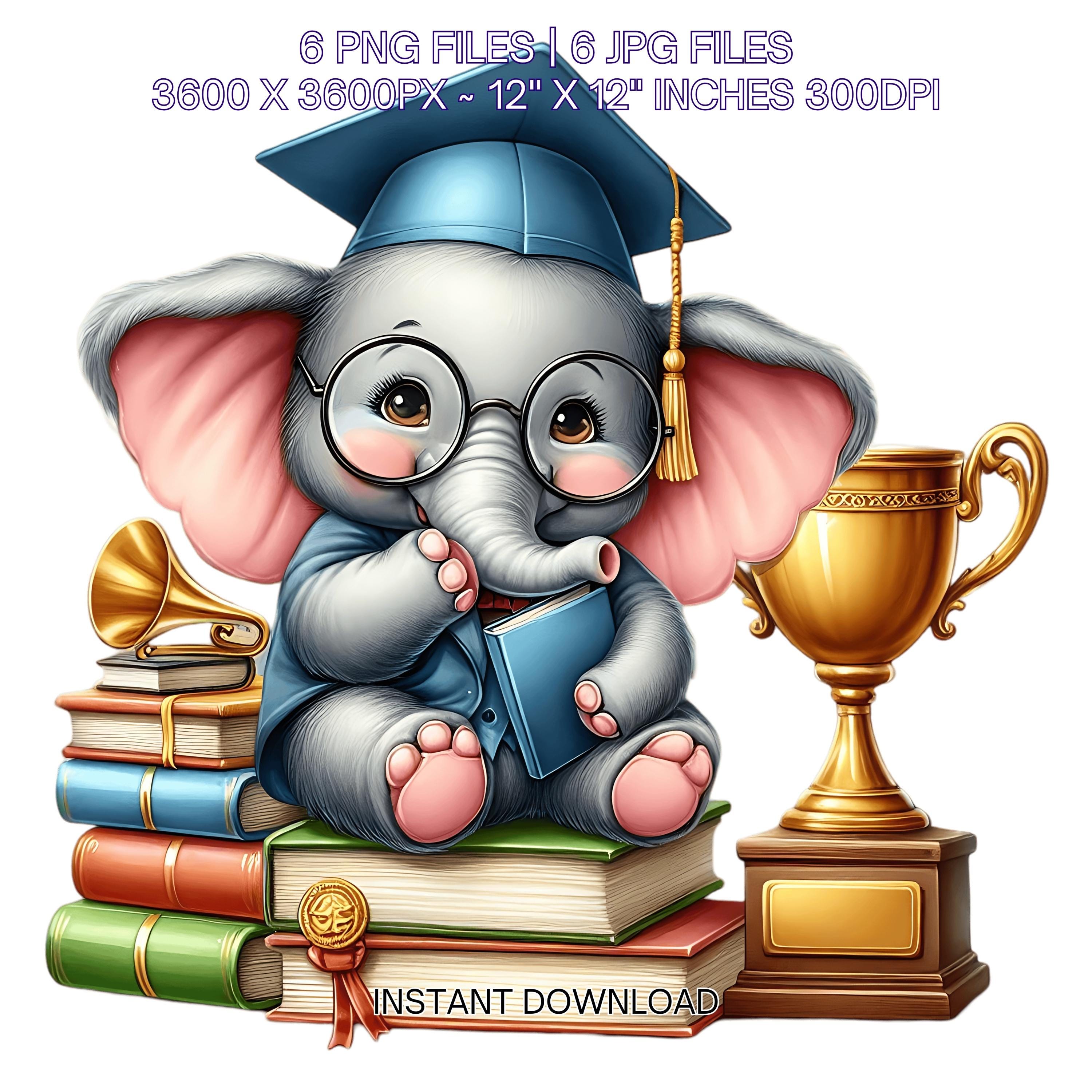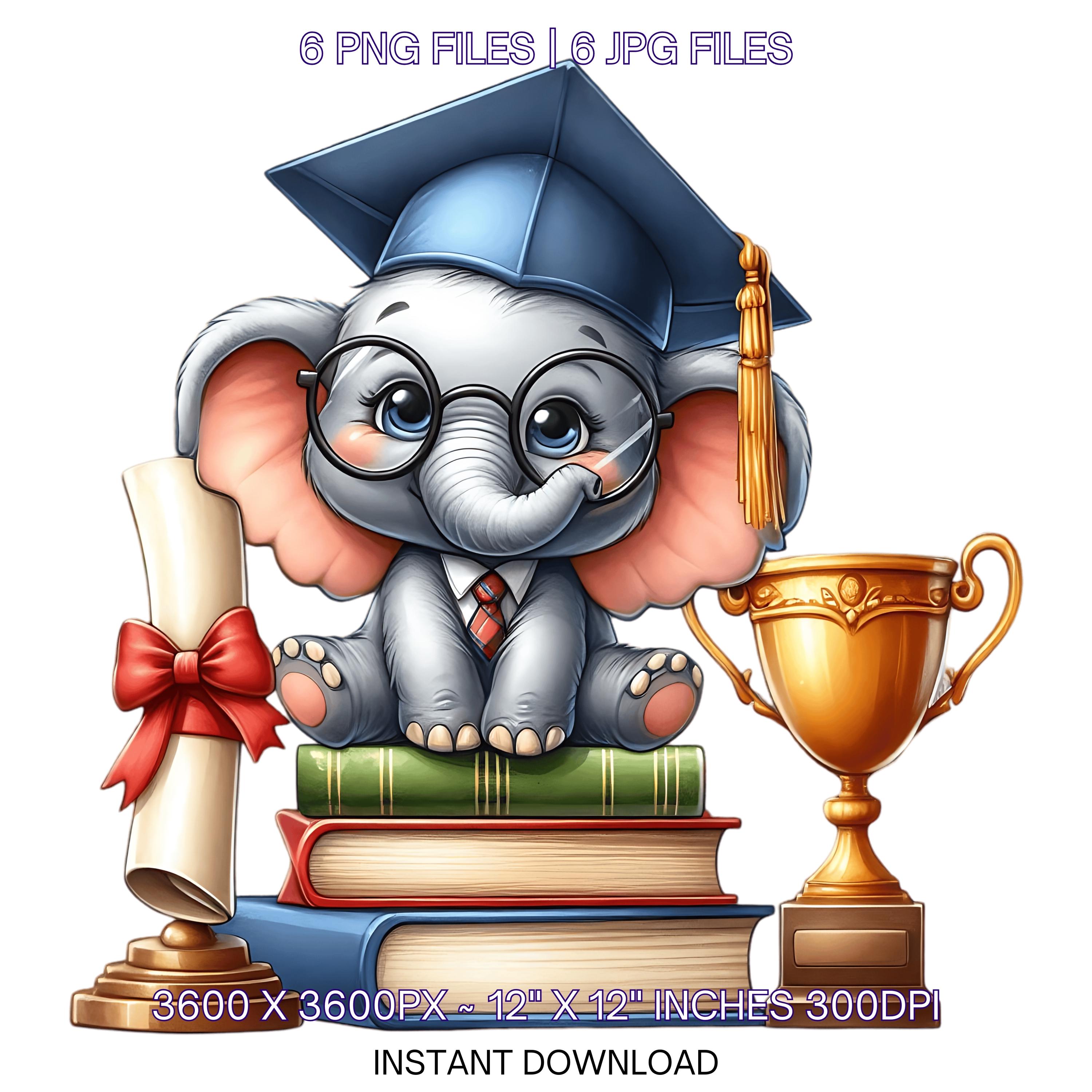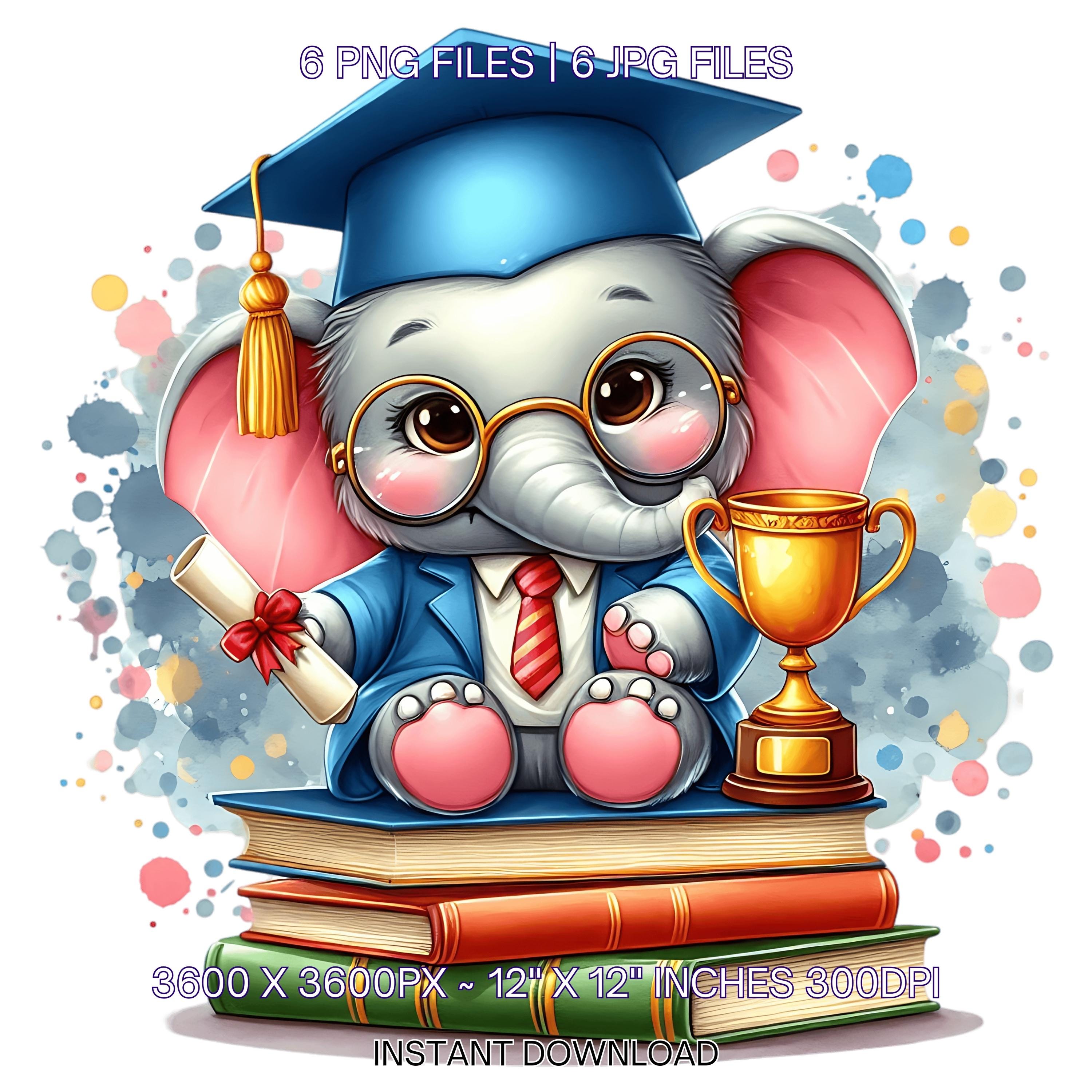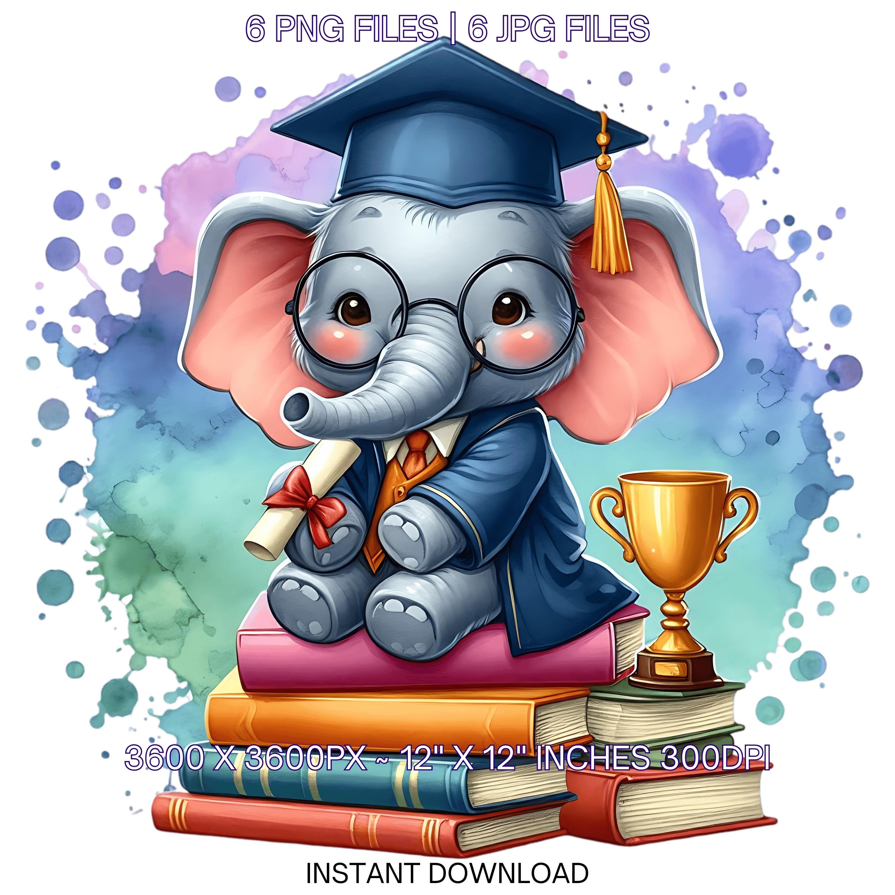 Kindergarten Graduation Elephant Clipart Grad Student | Elephant wearing Cap holding a Diploma PNG | Kindergarten Graduate Sublimation | 6 JPG-PNG Commercial Use