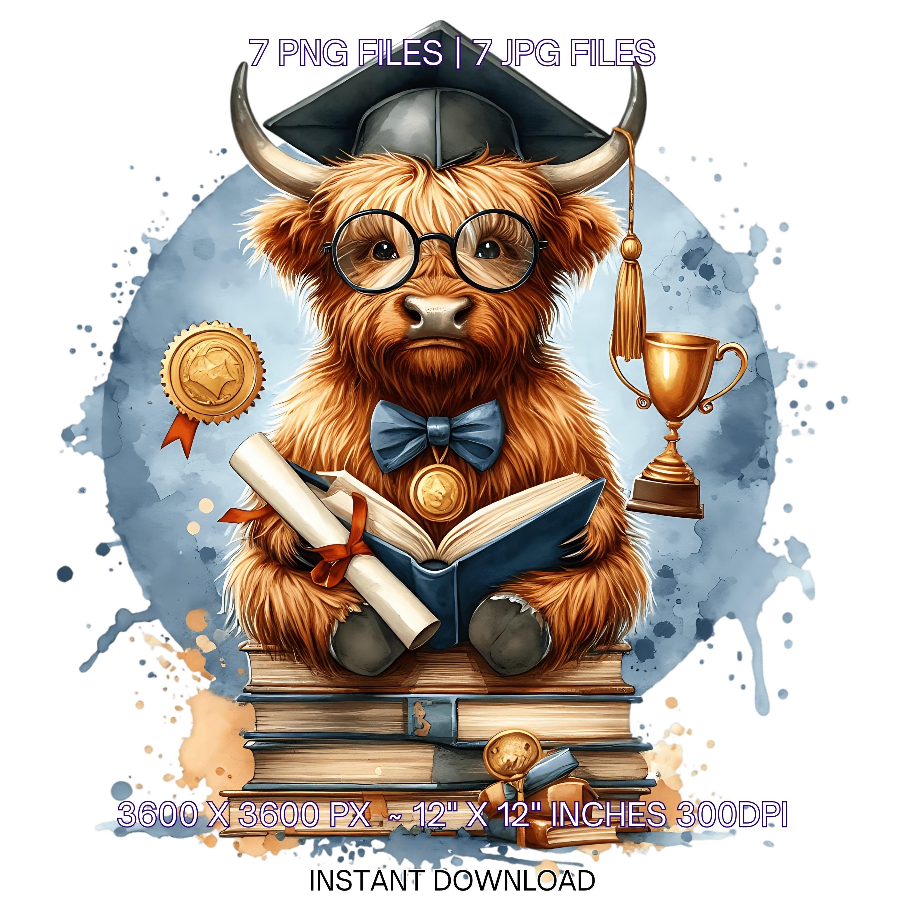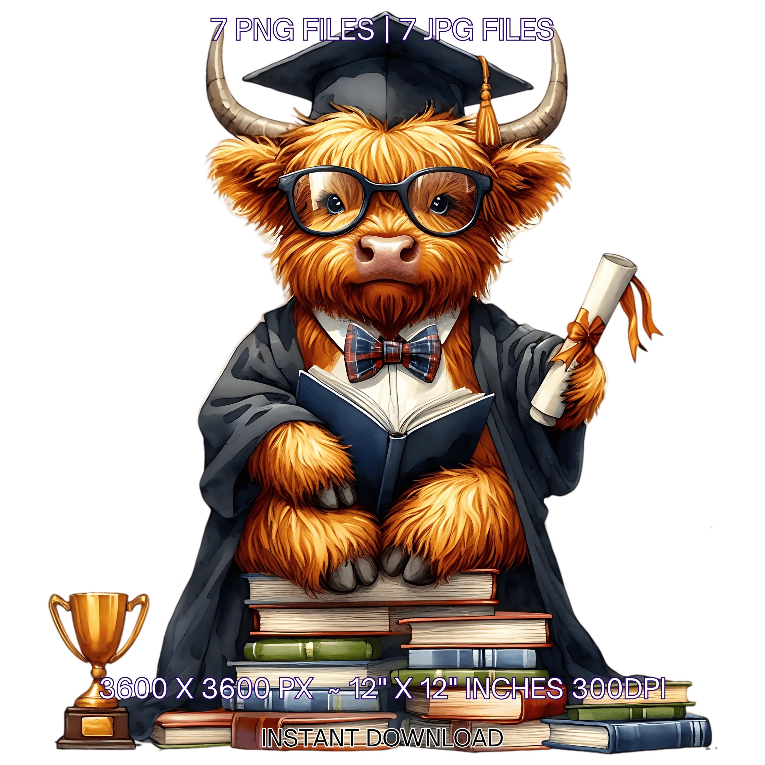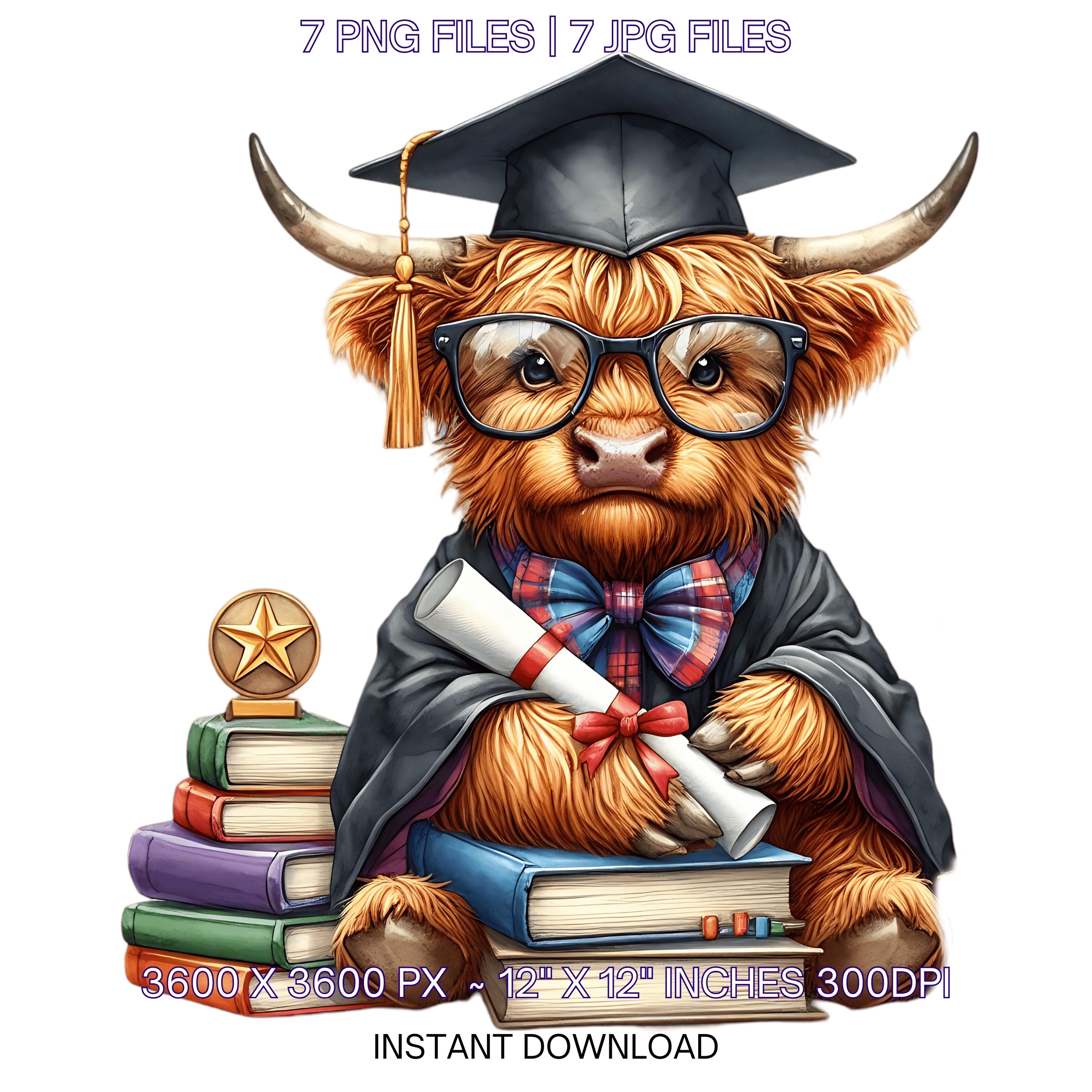 Kindergarten Graduation Highland Cow Clipart Grad Student | Cow wearing Cap holding a Diploma PNG | Kindergarten Graduate Sublimation | 6 JPG-PNG Commercial Use