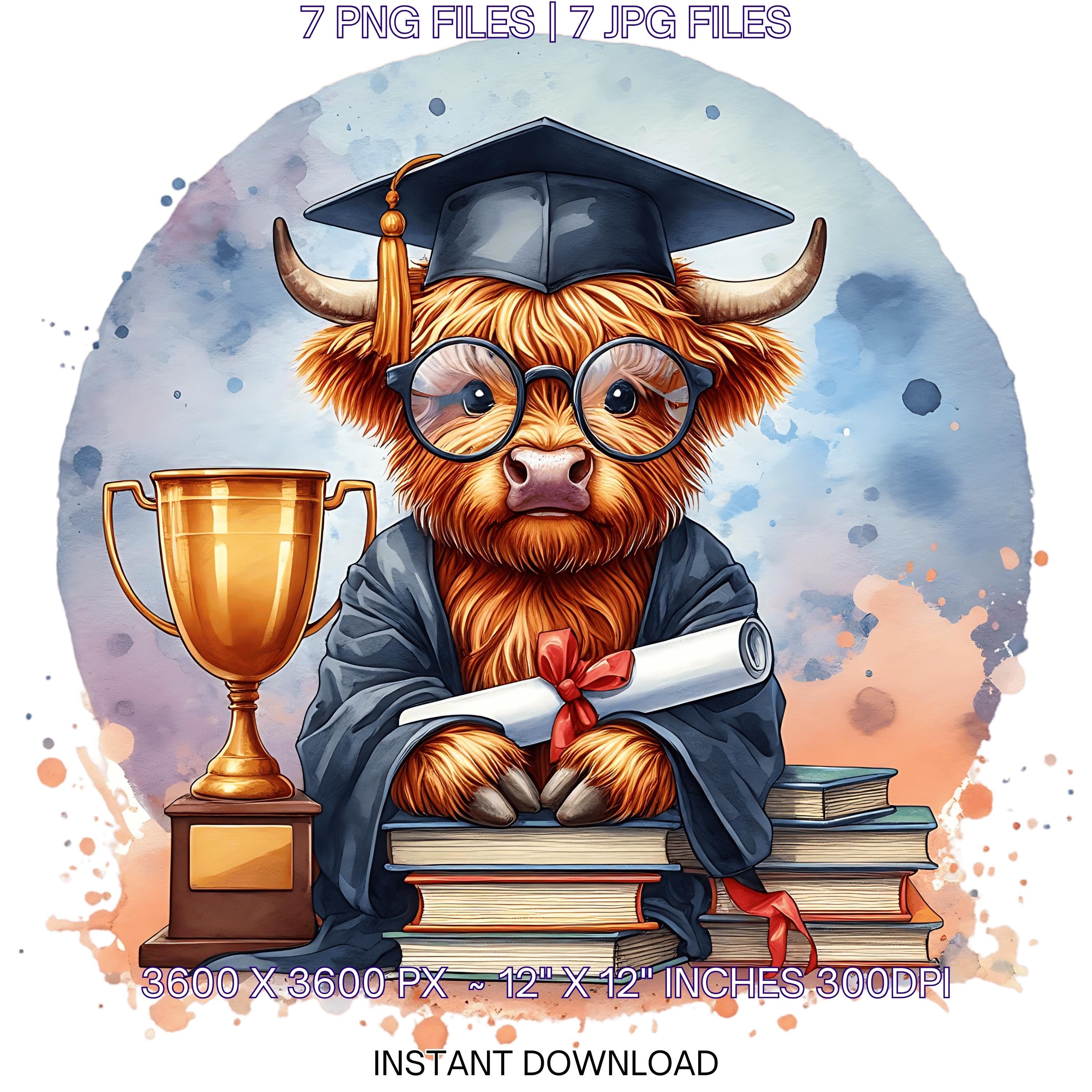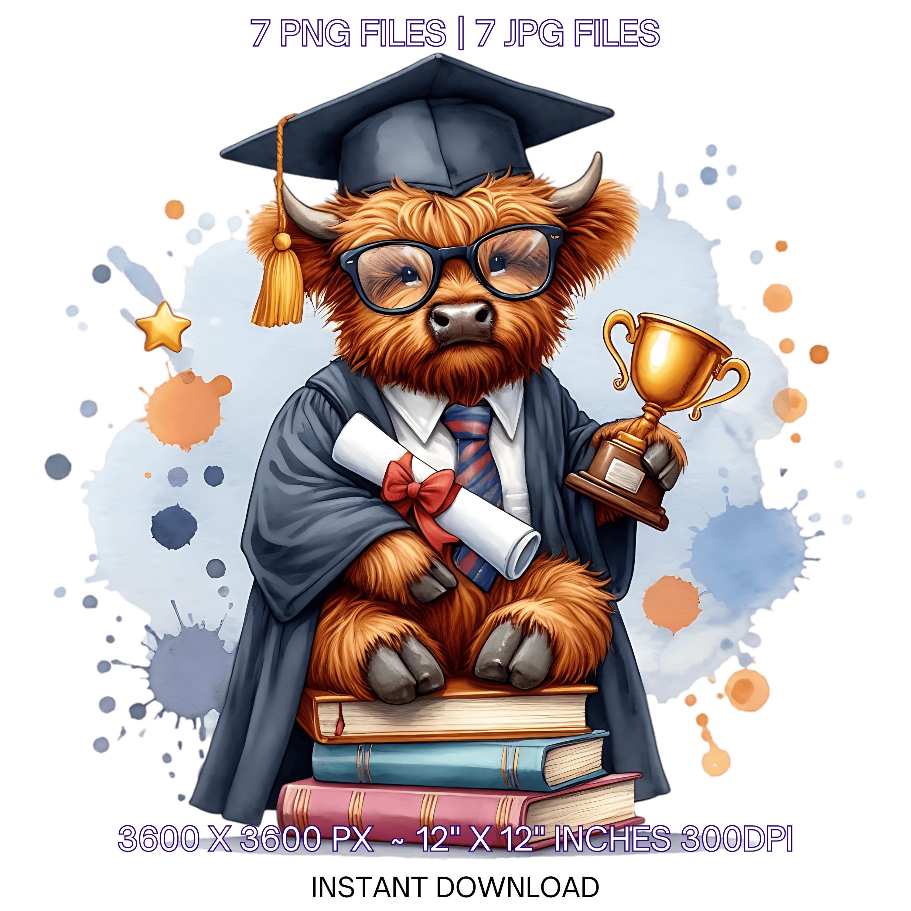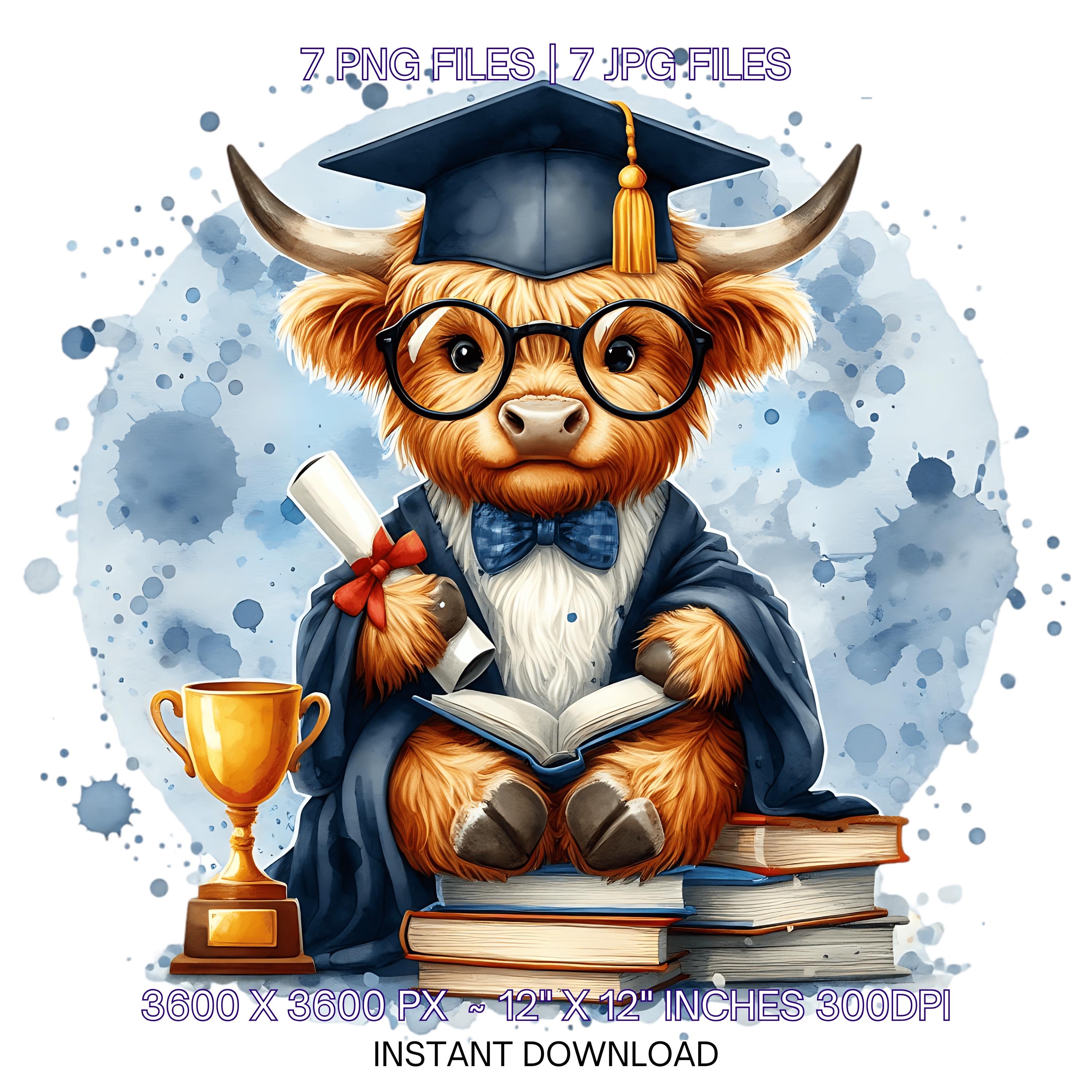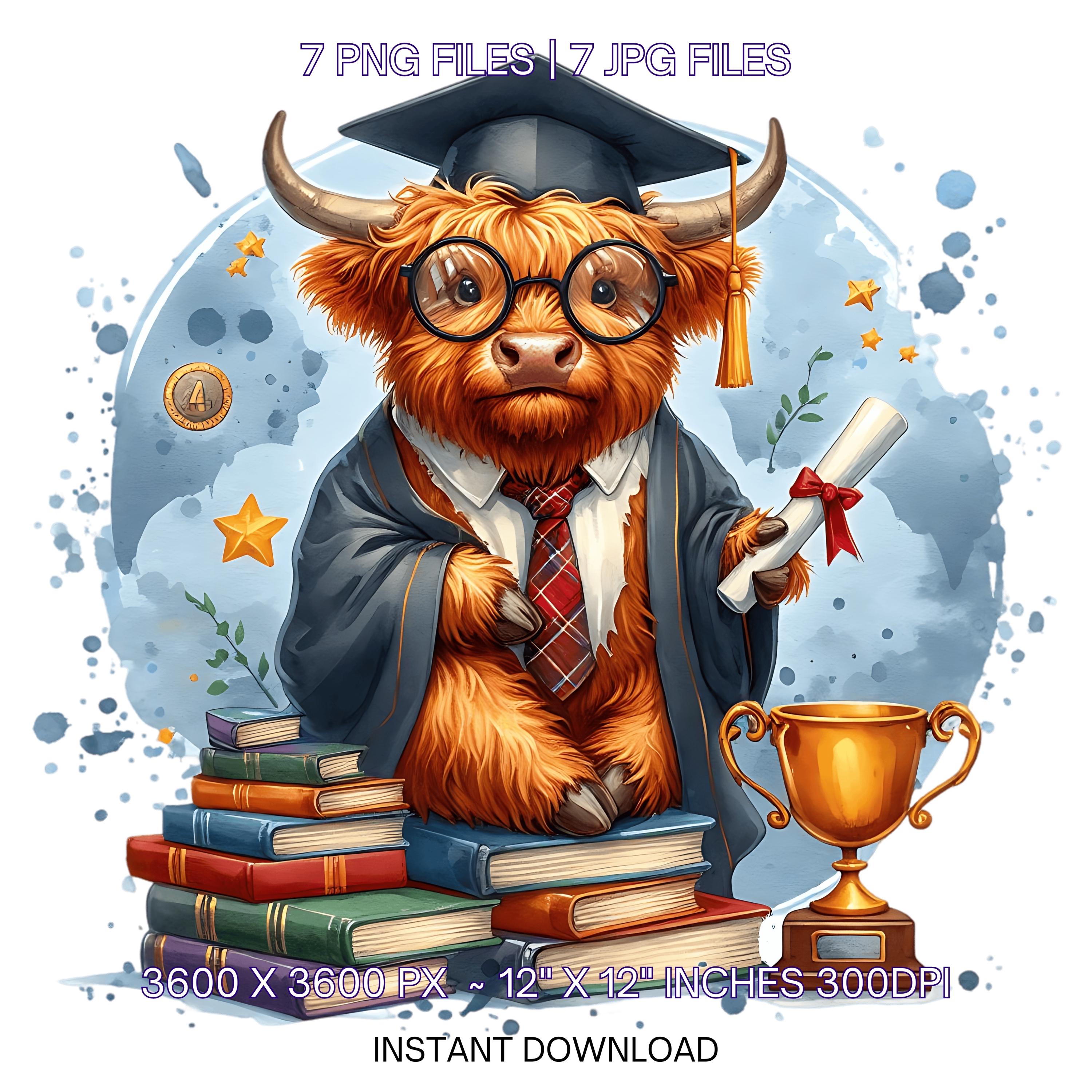 Kindergarten Graduation Highland Cow Clipart Grad Student | Cow wearing Cap holding a Diploma PNG | Kindergarten Graduate Sublimation | 6 JPG-PNG Commercial Use