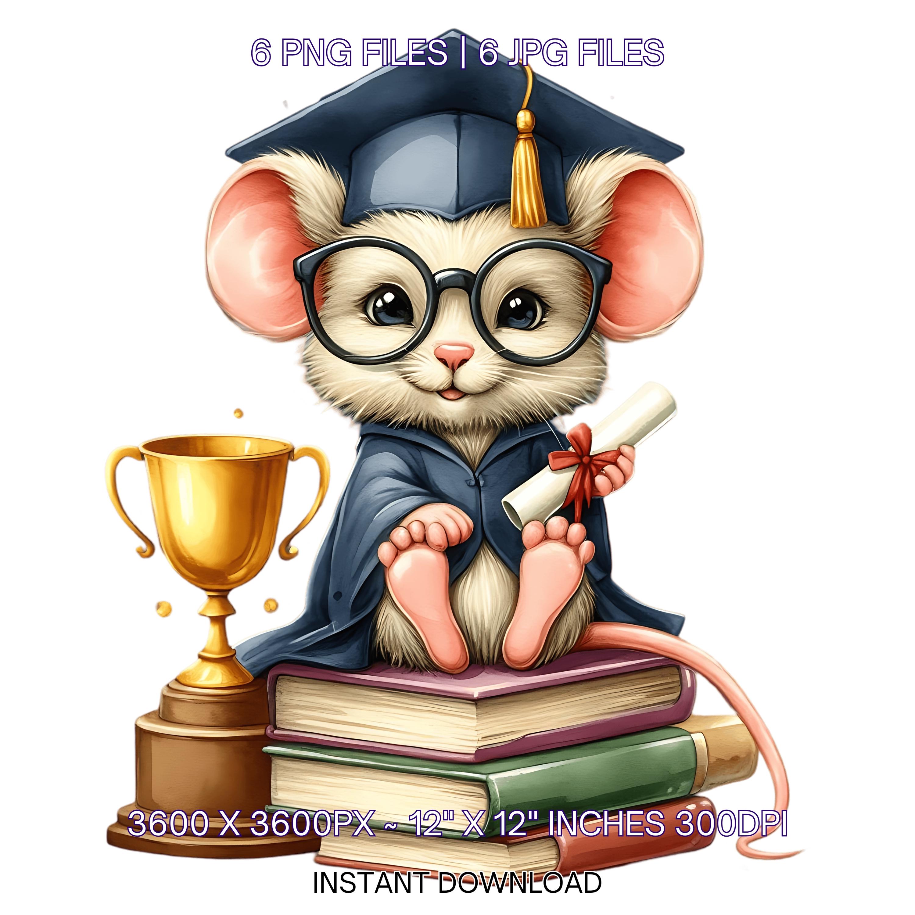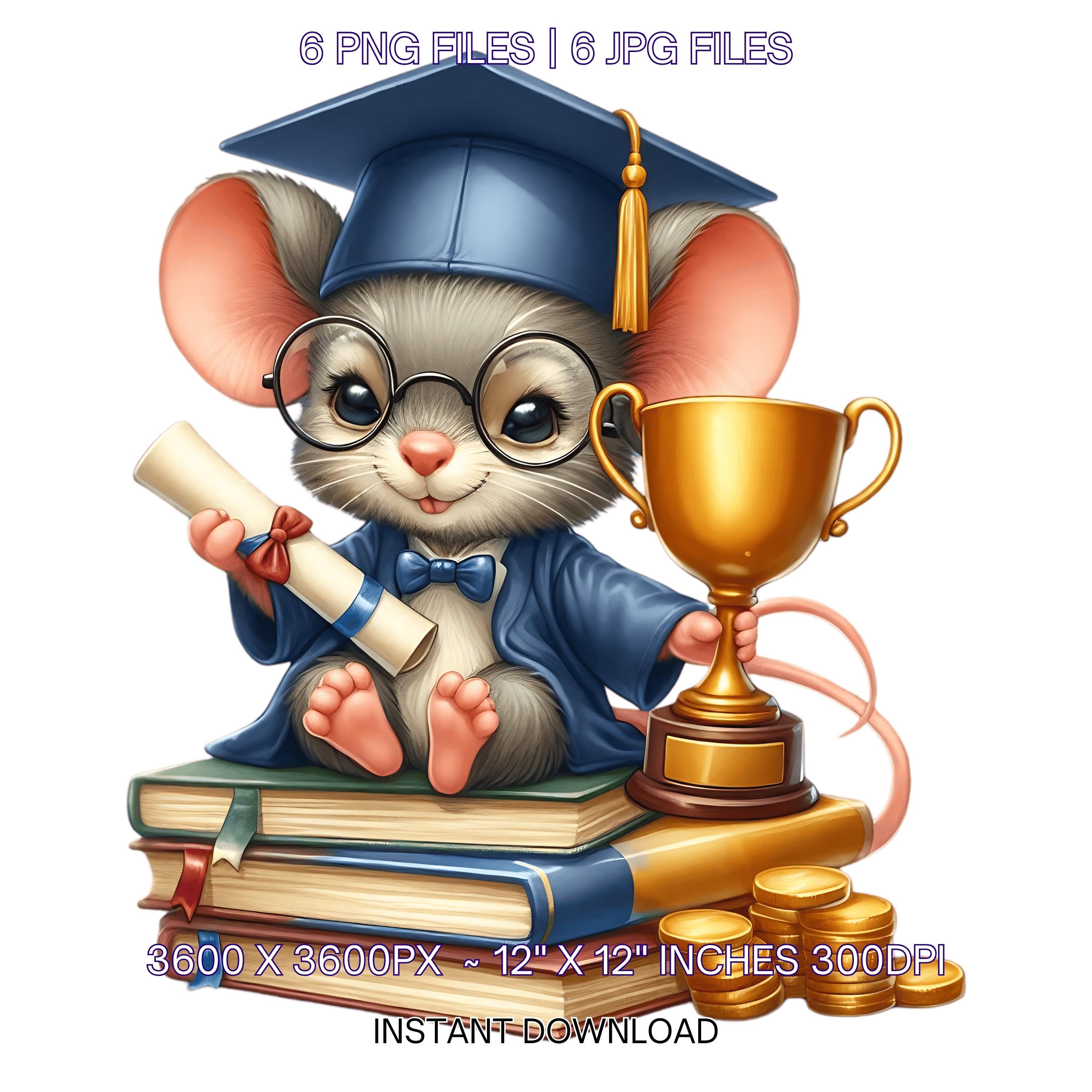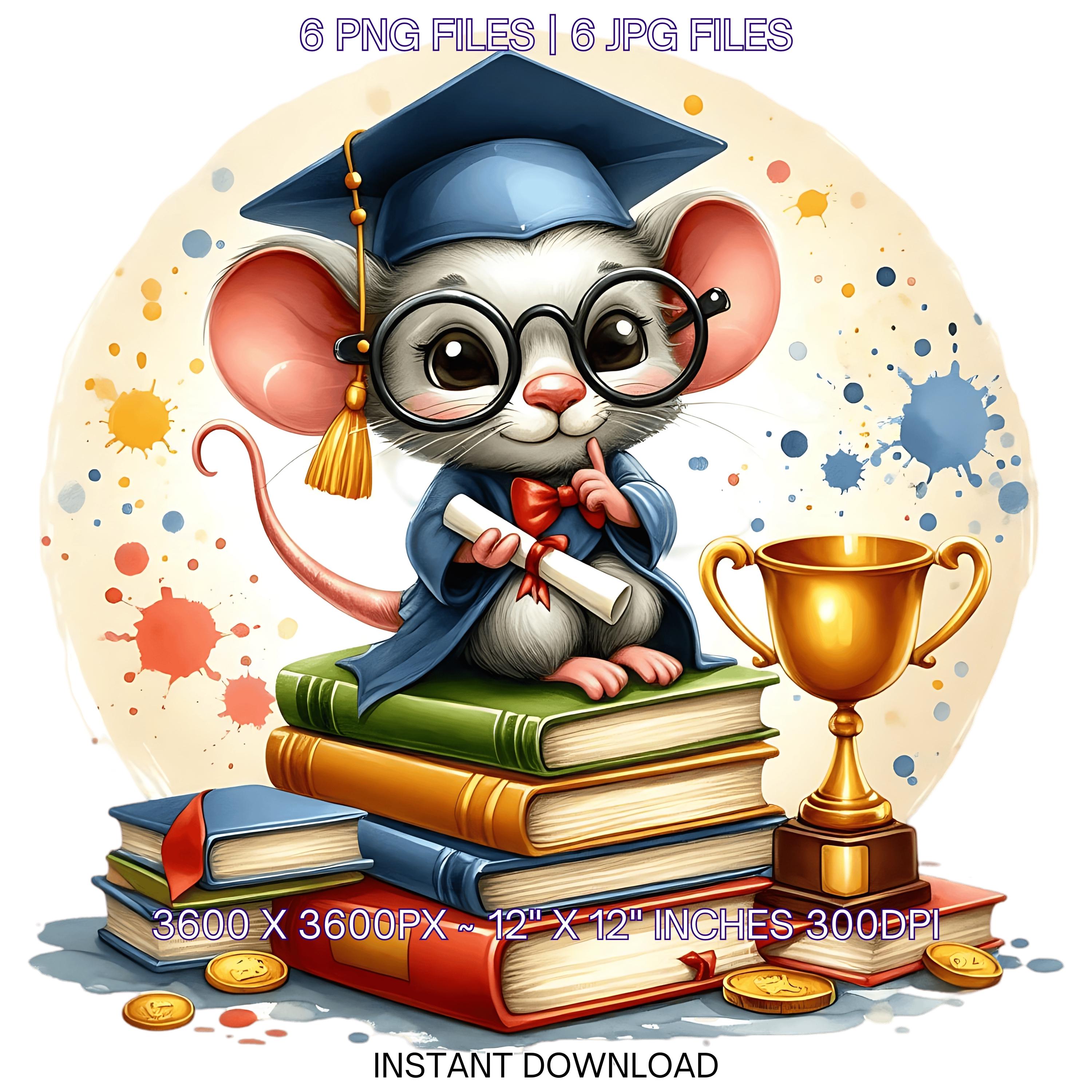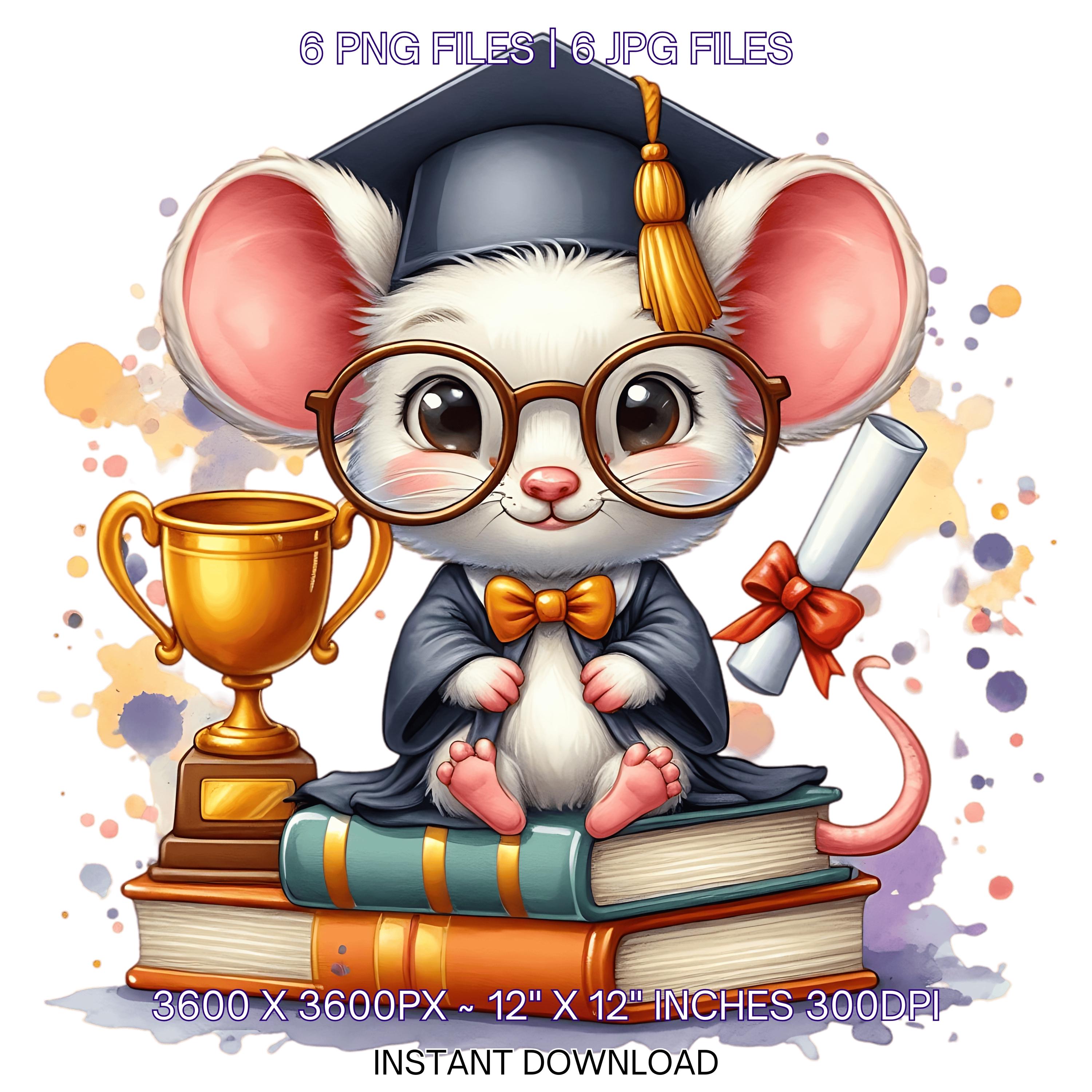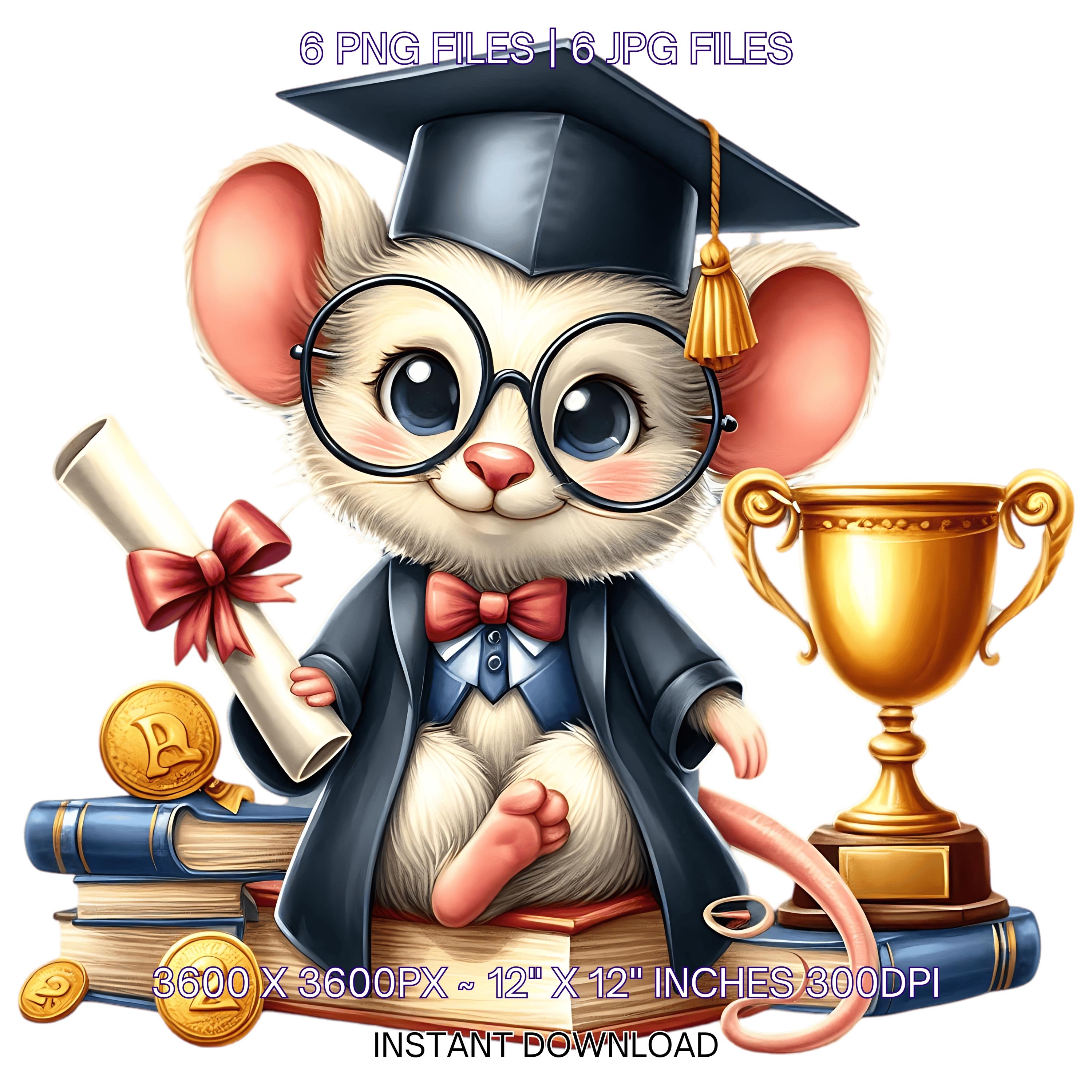 Kindergarten Graduation Mouse Clipart Grad Student | Mouse wearing Cap holding a Diploma PNG | Kindergarten Graduate Sublimation | 6 JPG-PNG Commercial Use