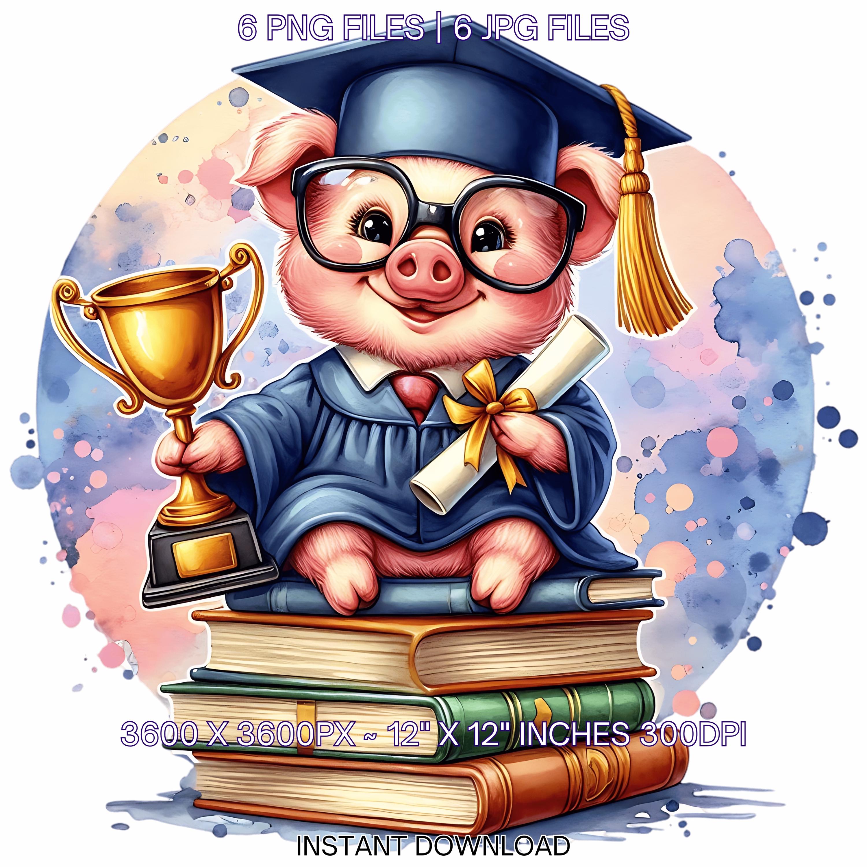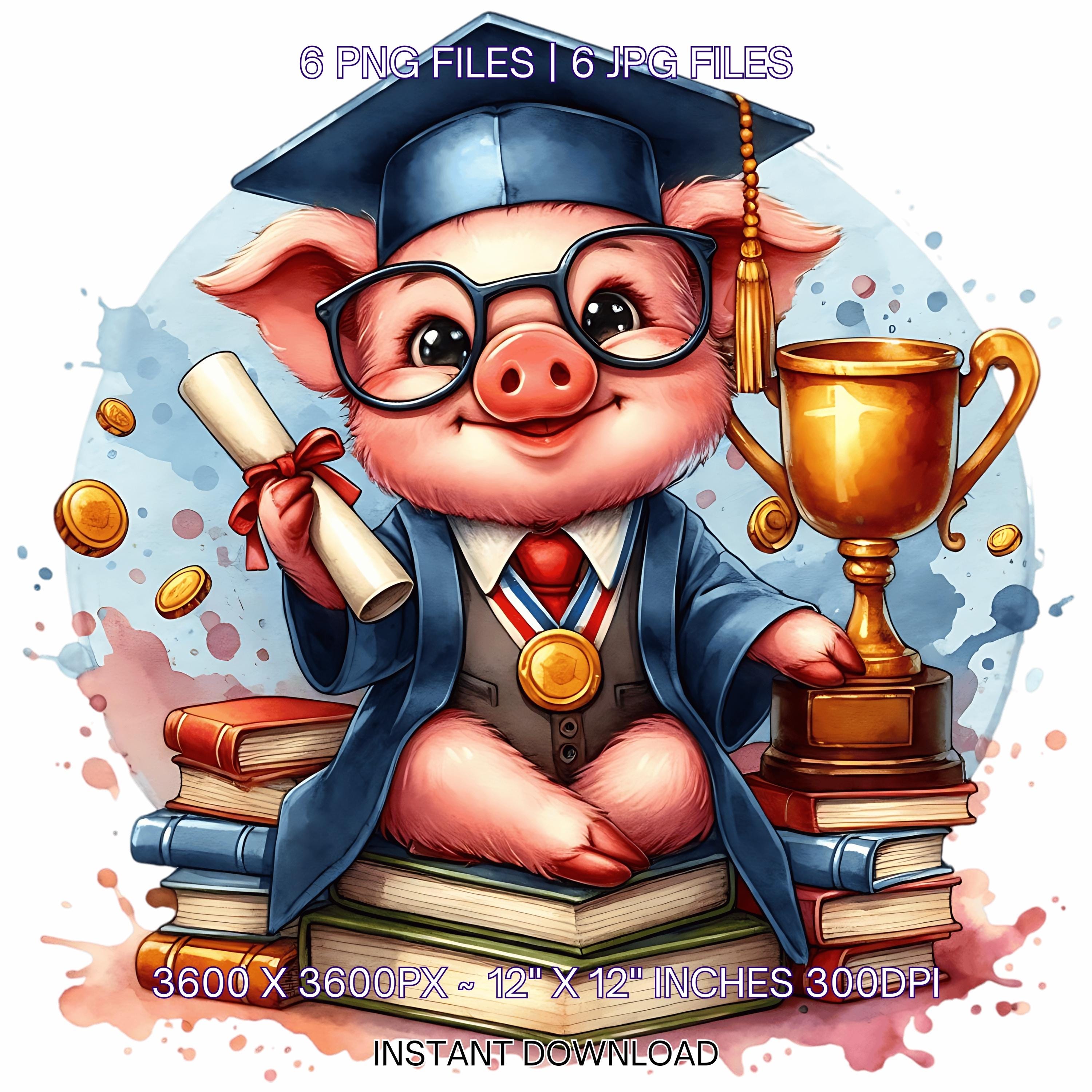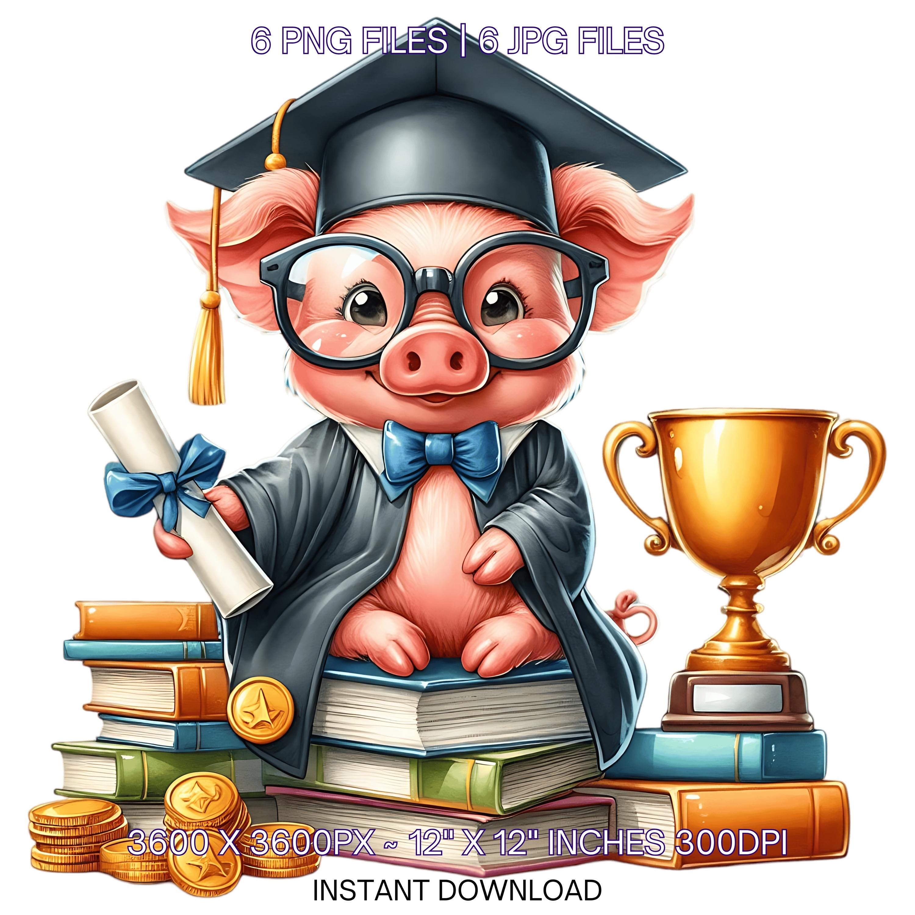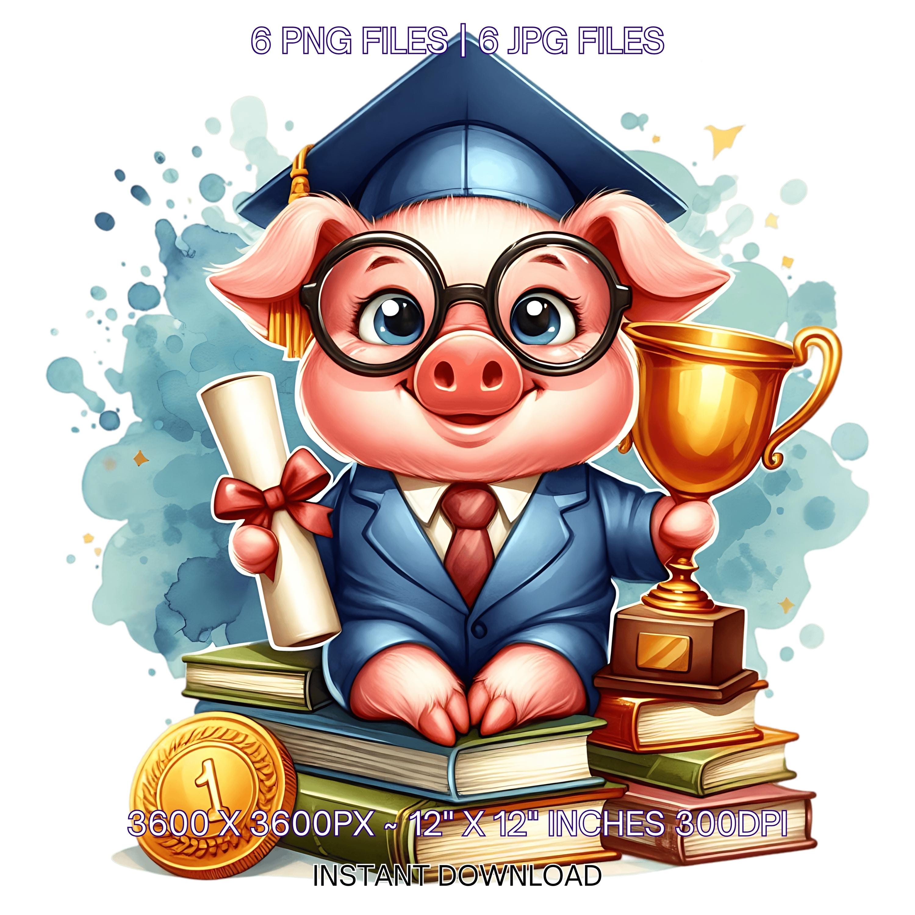 Kindergarten Graduation Pig Clipart Grad Student | Pig wearing Cap holding a Diploma PNG | Kindergarten Graduate Sublimation | 6 JPG-PNG Commercial Use