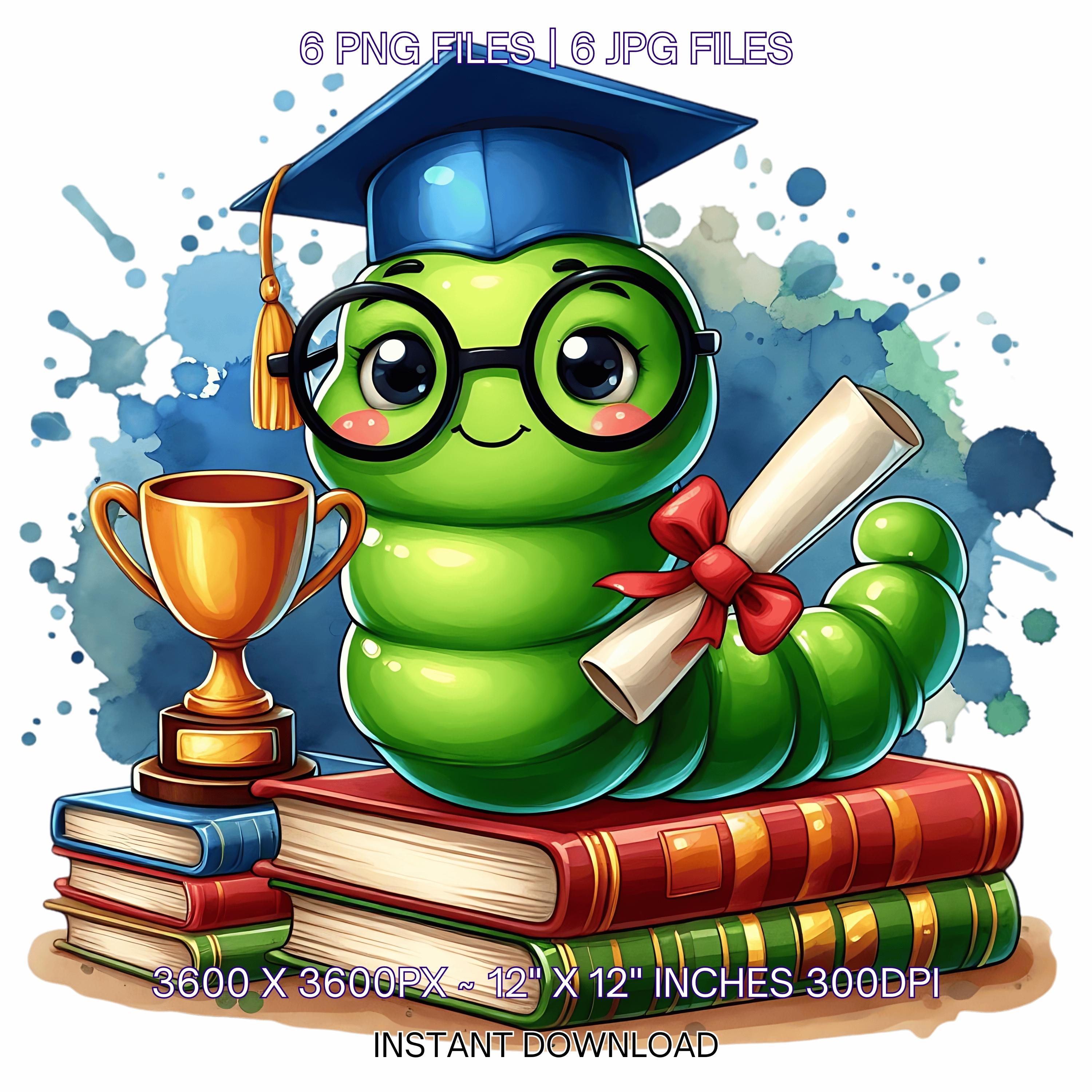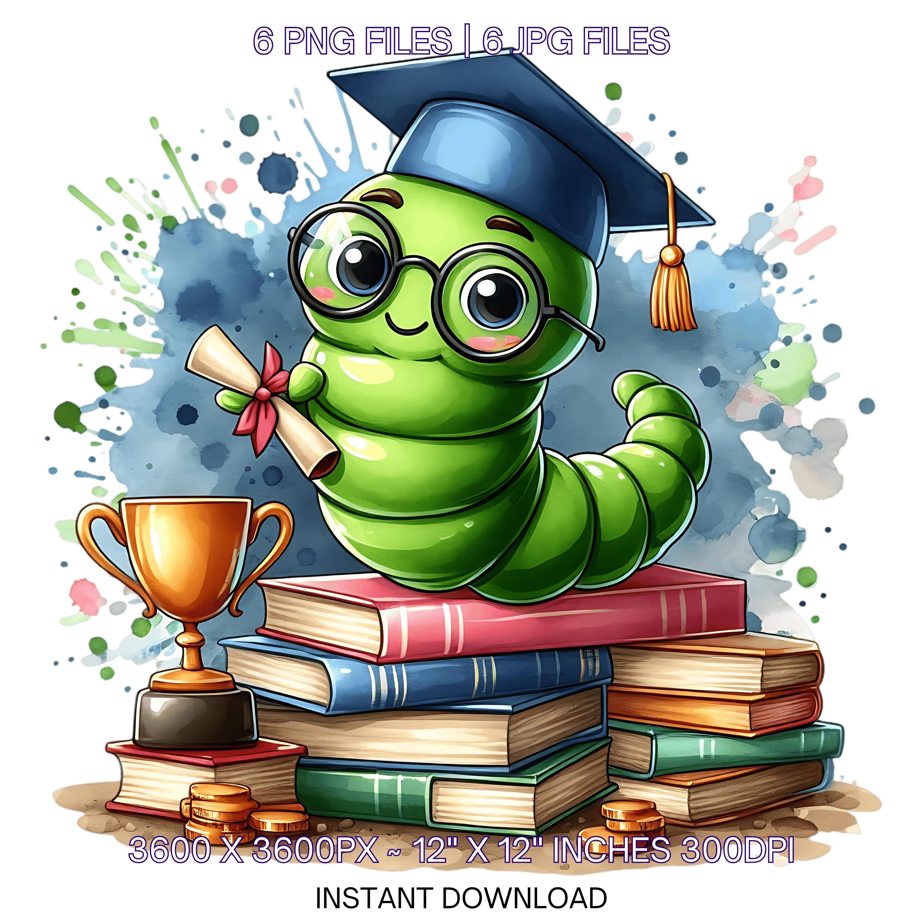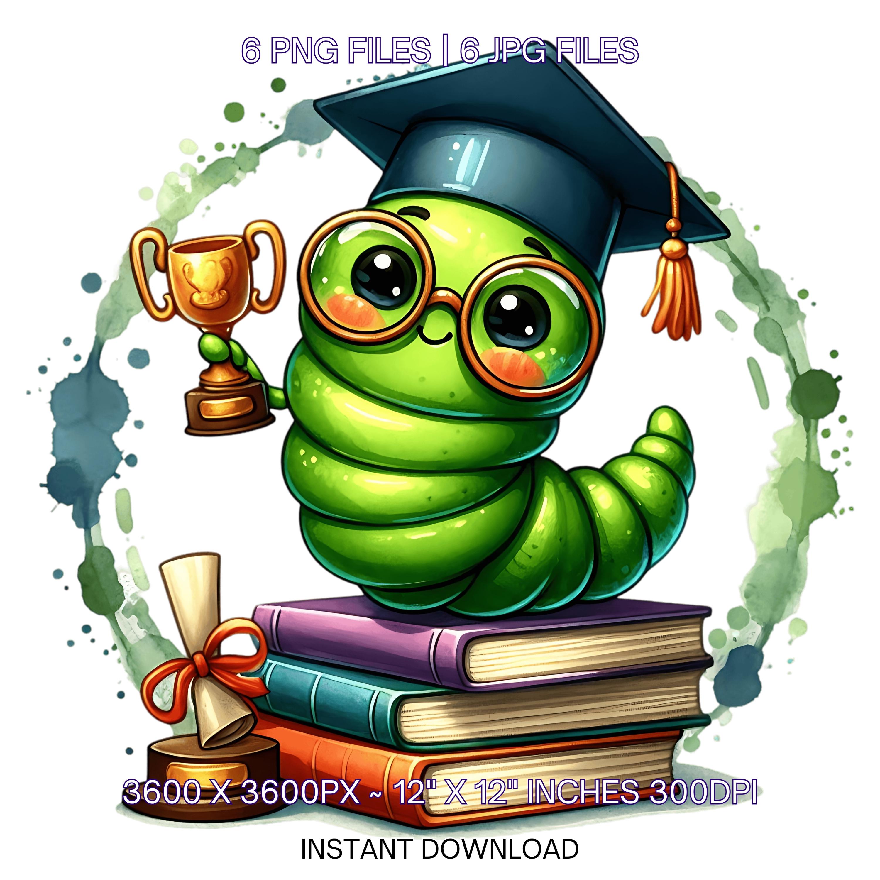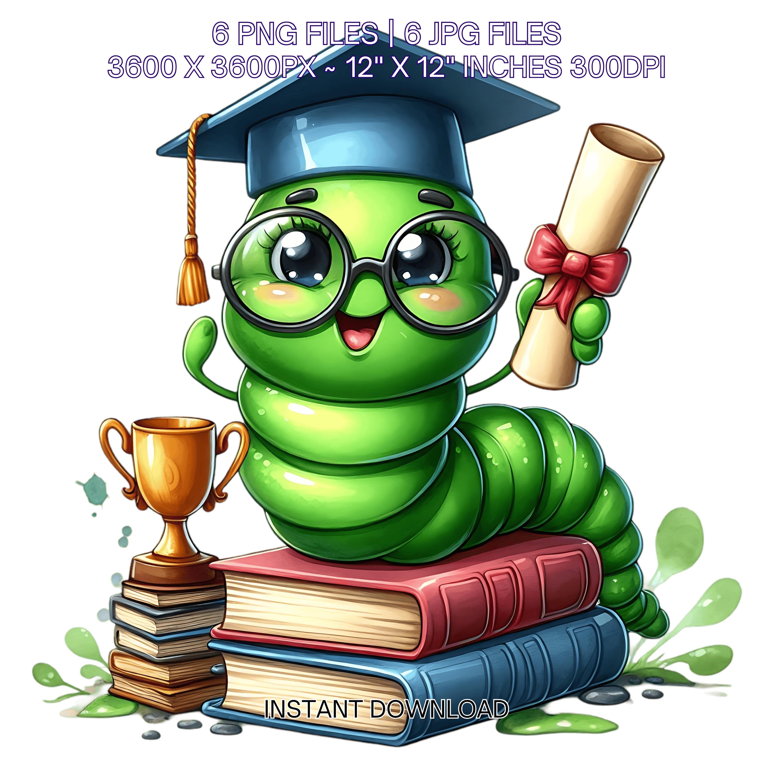 Kindergarten Graduation Worm Clipart Grad Student | Green Worm wearing Cap holding a Diploma PNG | Kindergarten Graduate Sublimation | 6 JPG-PNG Commercial Use