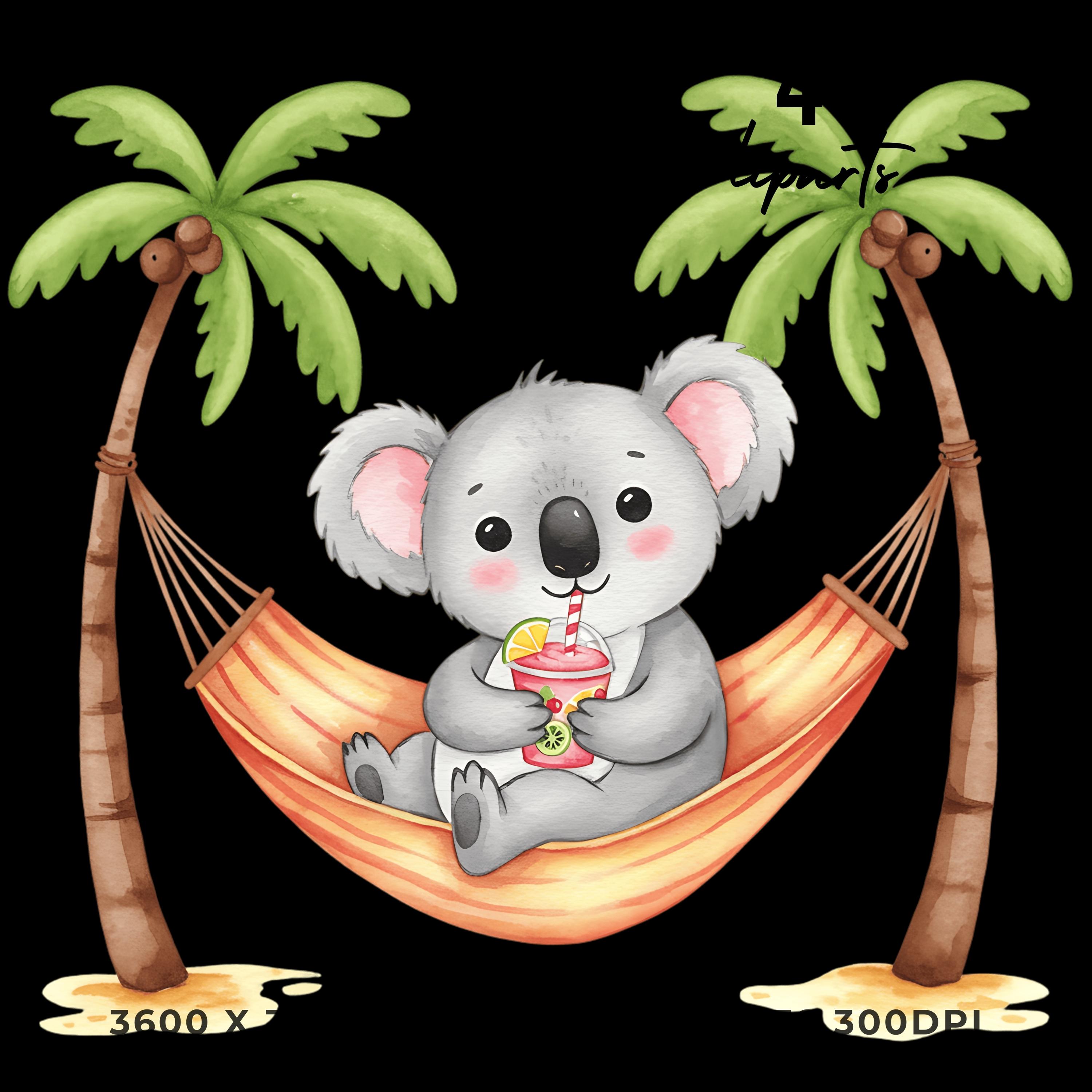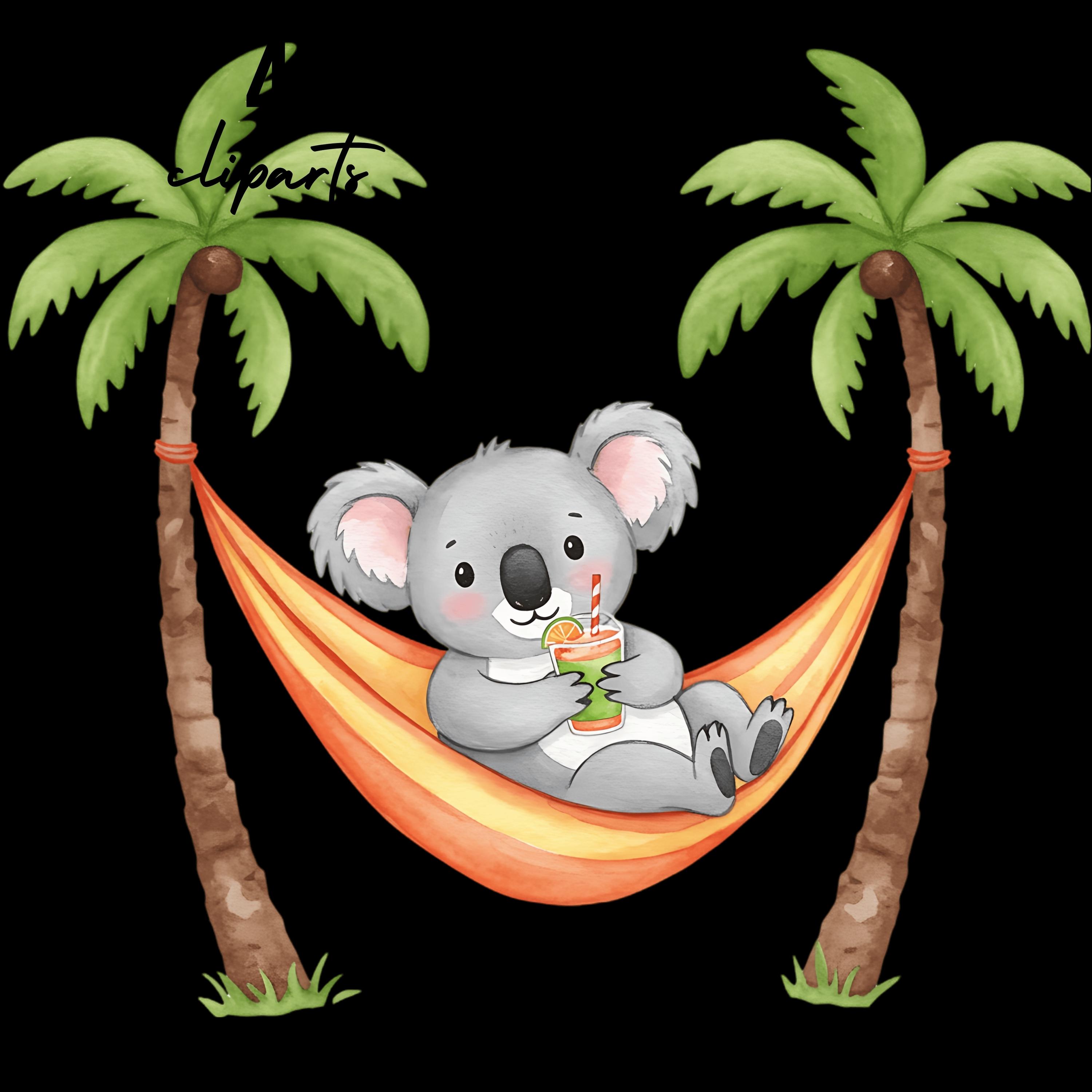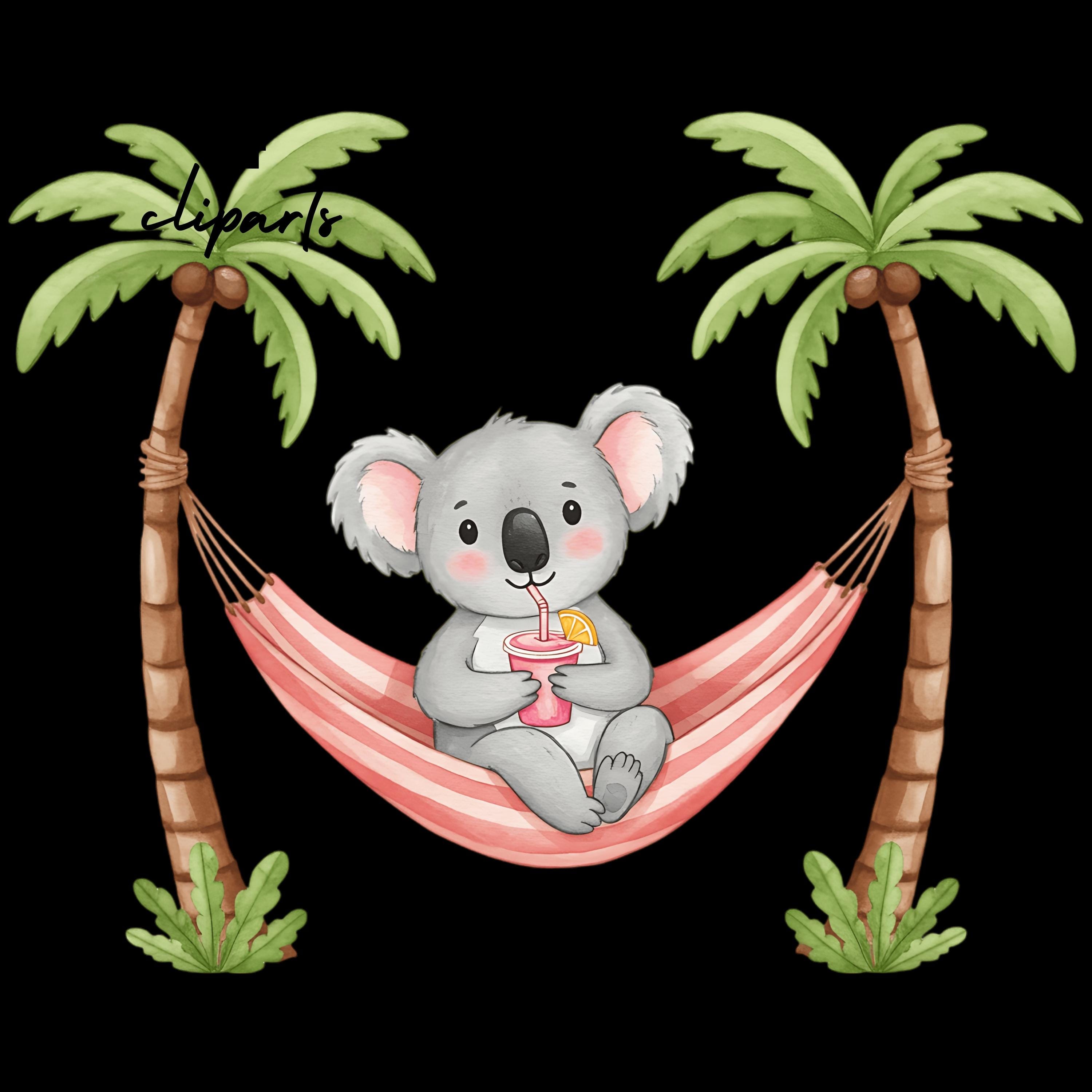 Koala Clipart PNG | 4 Watercolor Koala sipping a smoothie in a Hammock tied between two palm trees | Summer Sublimation Transparent Commercial Use