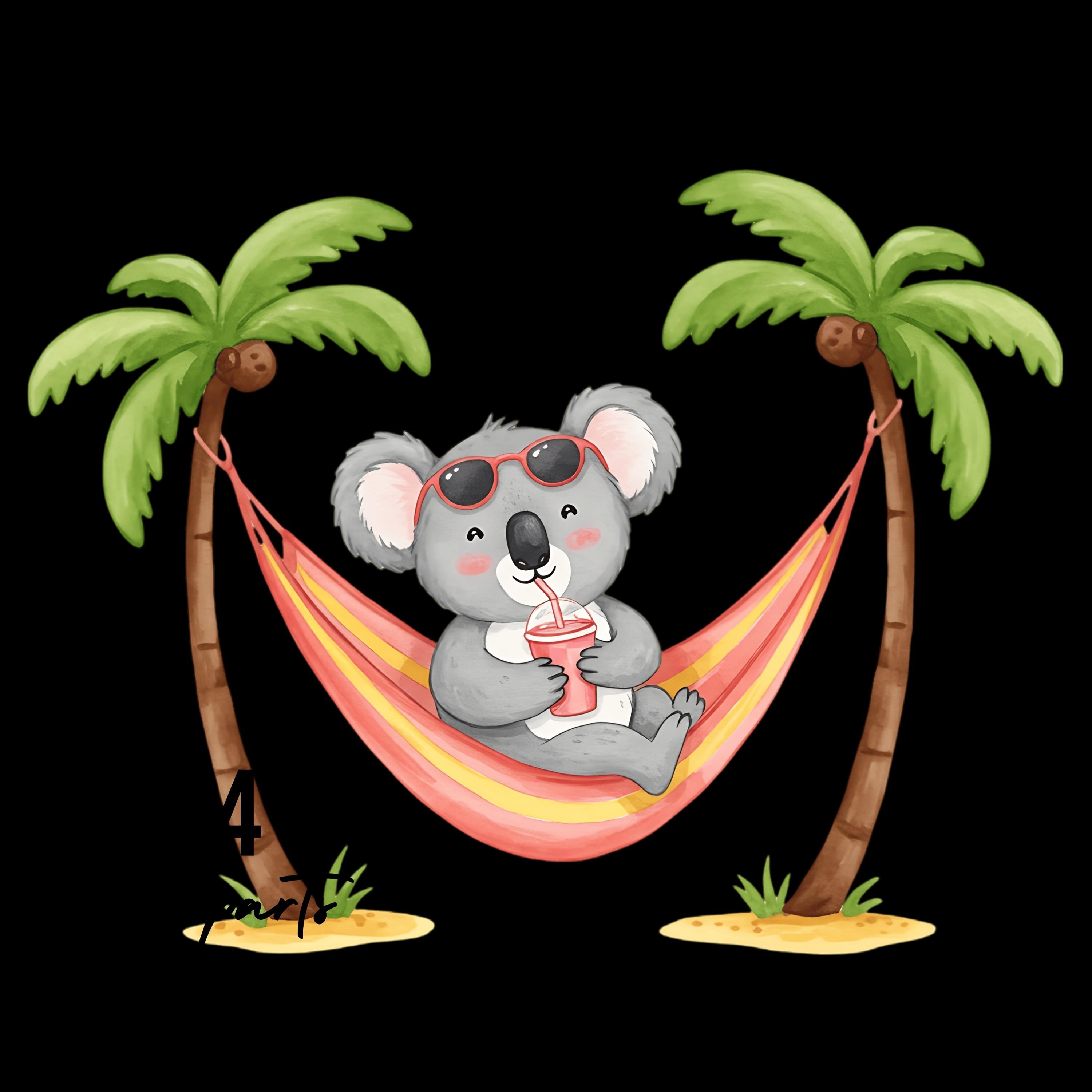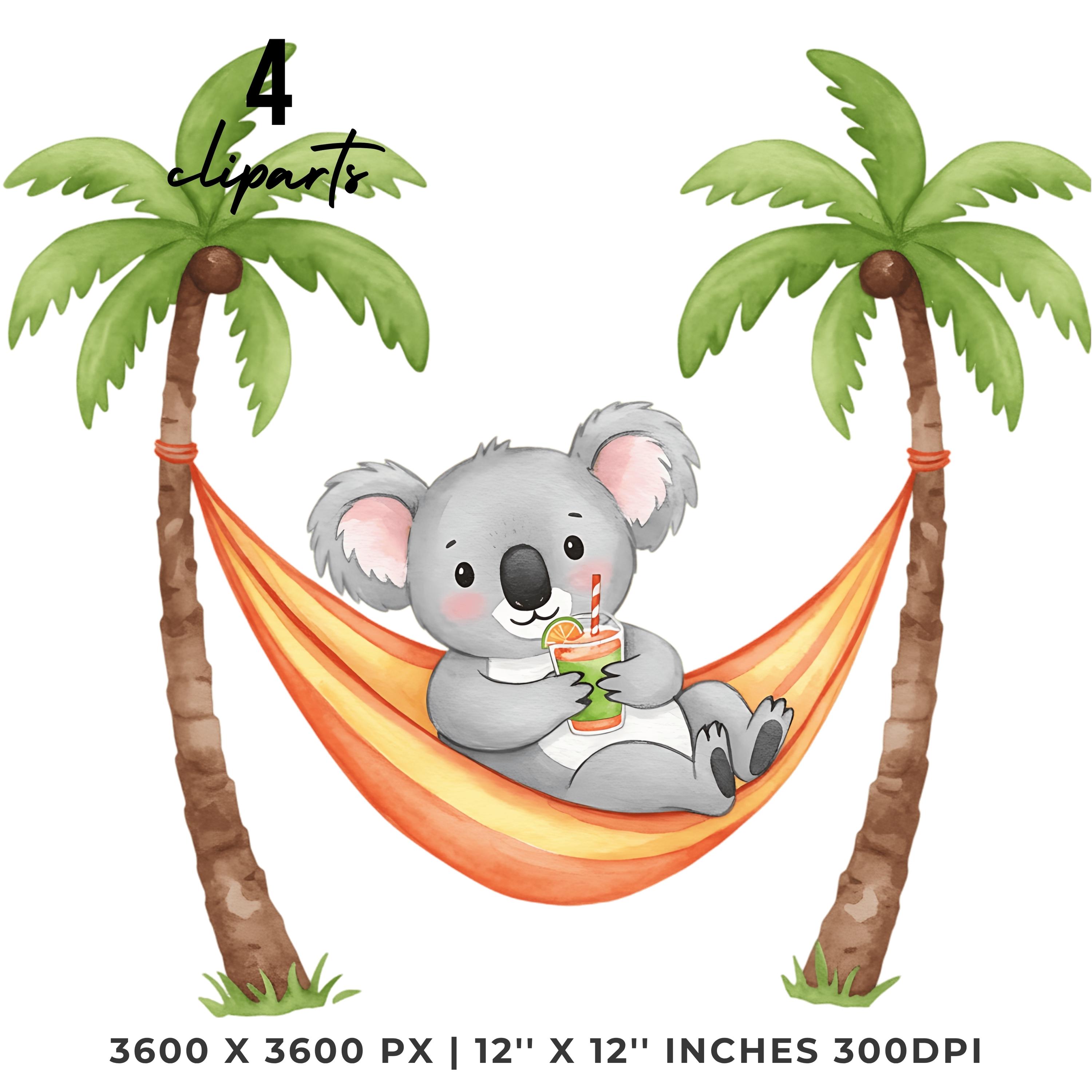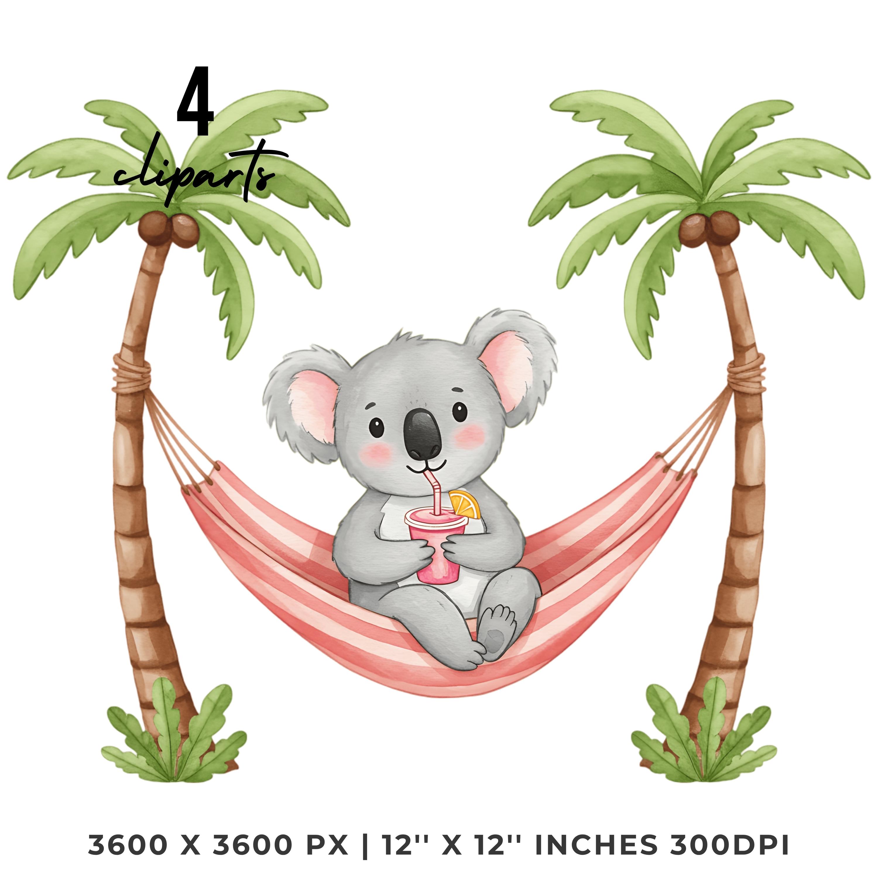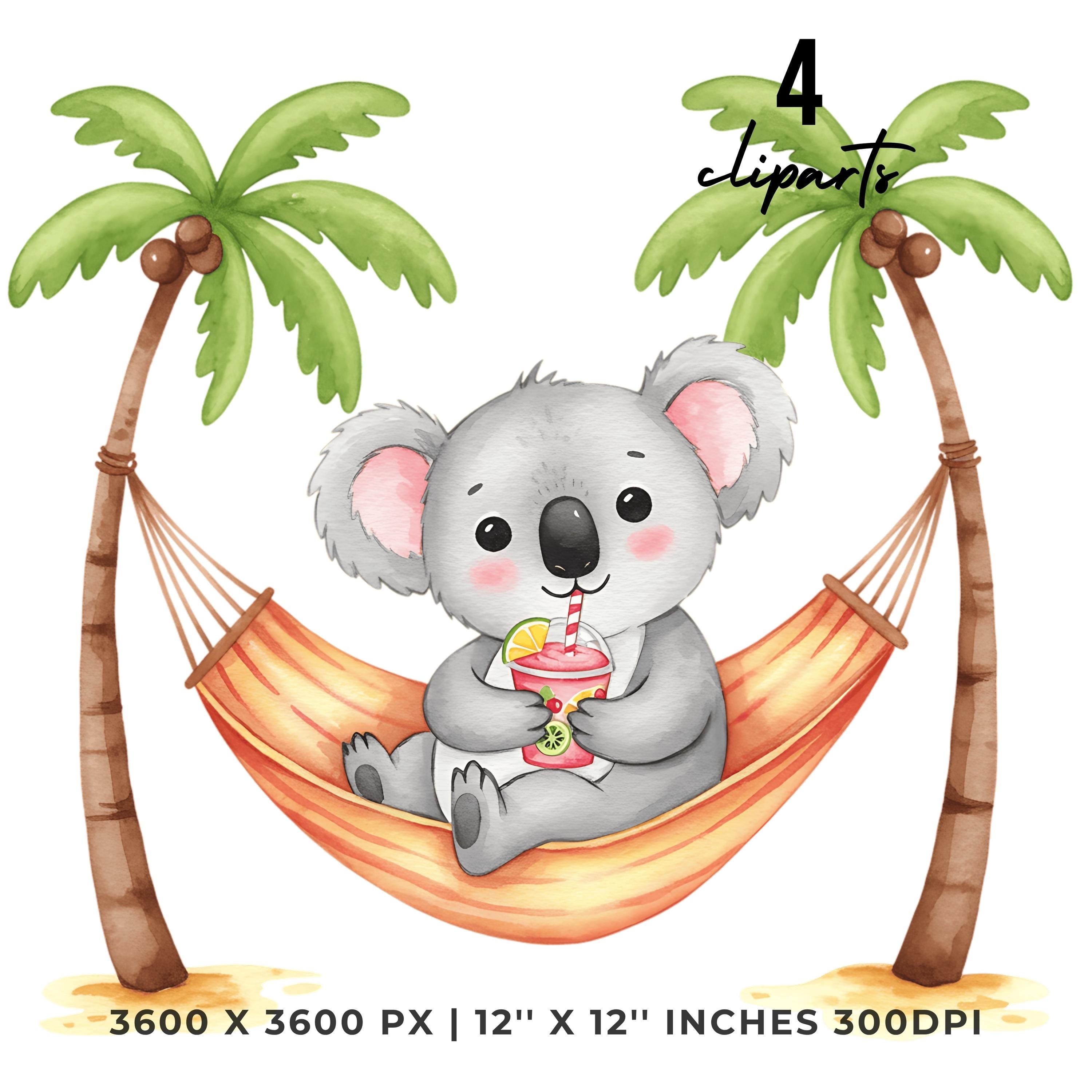 Koala Clipart PNG | 4 Watercolor Koala sipping a smoothie in a Hammock tied between two palm trees | Summer Sublimation Commercial Use is an eye-catching, high-resolution digital asset designed for creators, crafters, teachers, and small business owners looking to elevate their visuals.