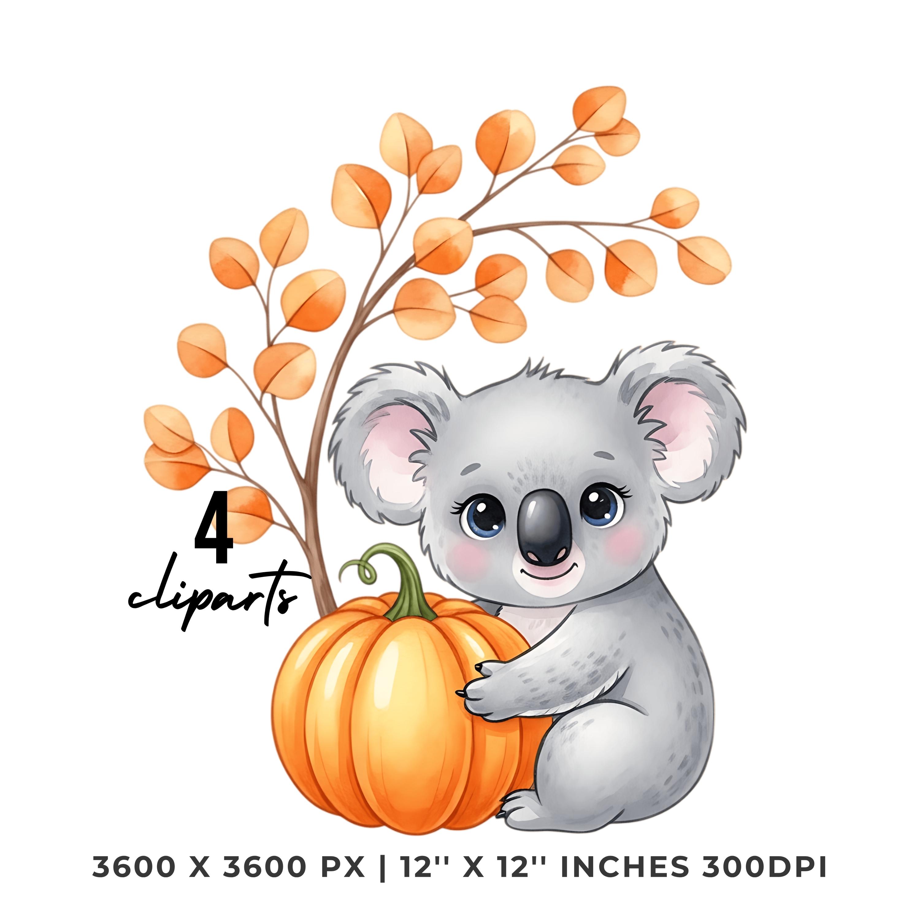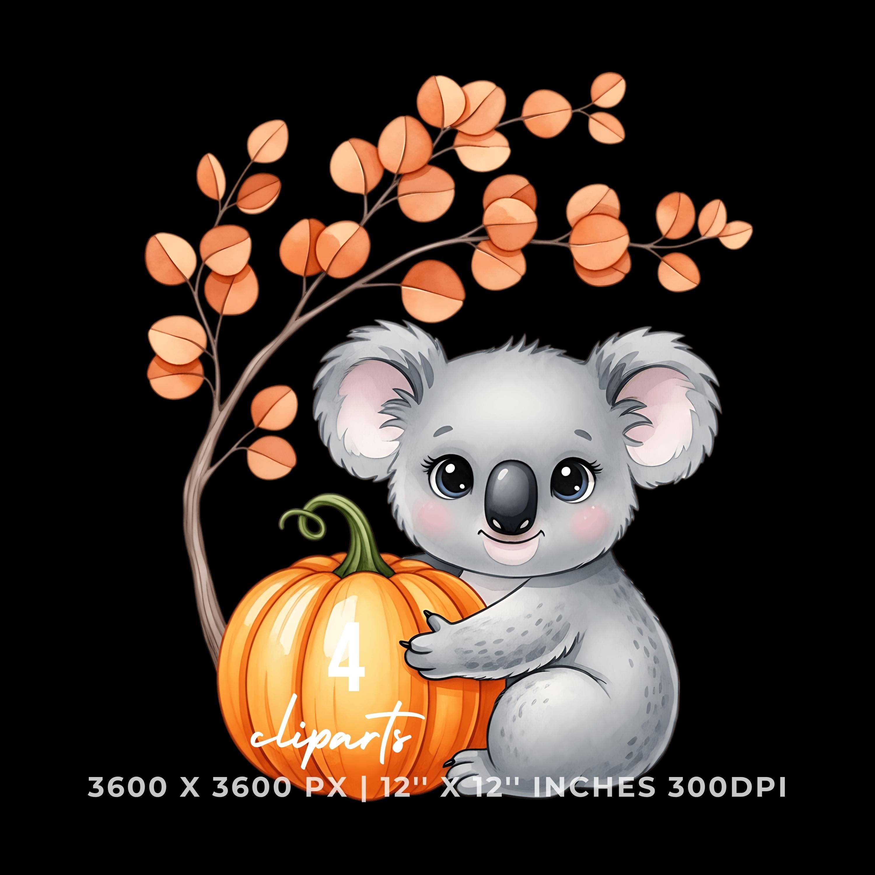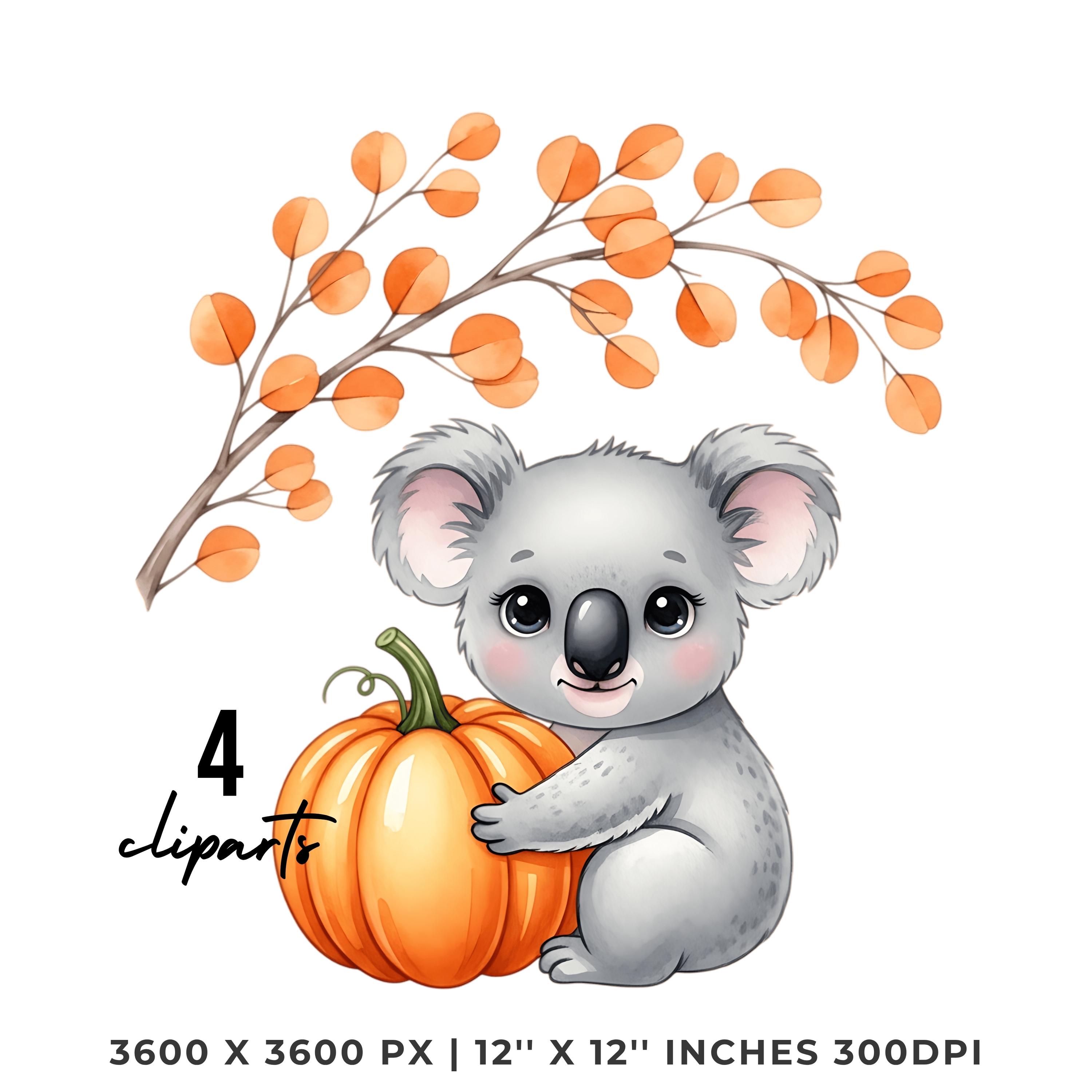 Koala Hugging Pumpkin Eucalyptus Fall Clipart | 4 PNG & 4 JPG | Sublimation Transparent Commercial Use is an eye-catching, high-resolution digital asset designed for creators, crafters, teachers, and small business owners looking to elevate their visuals.