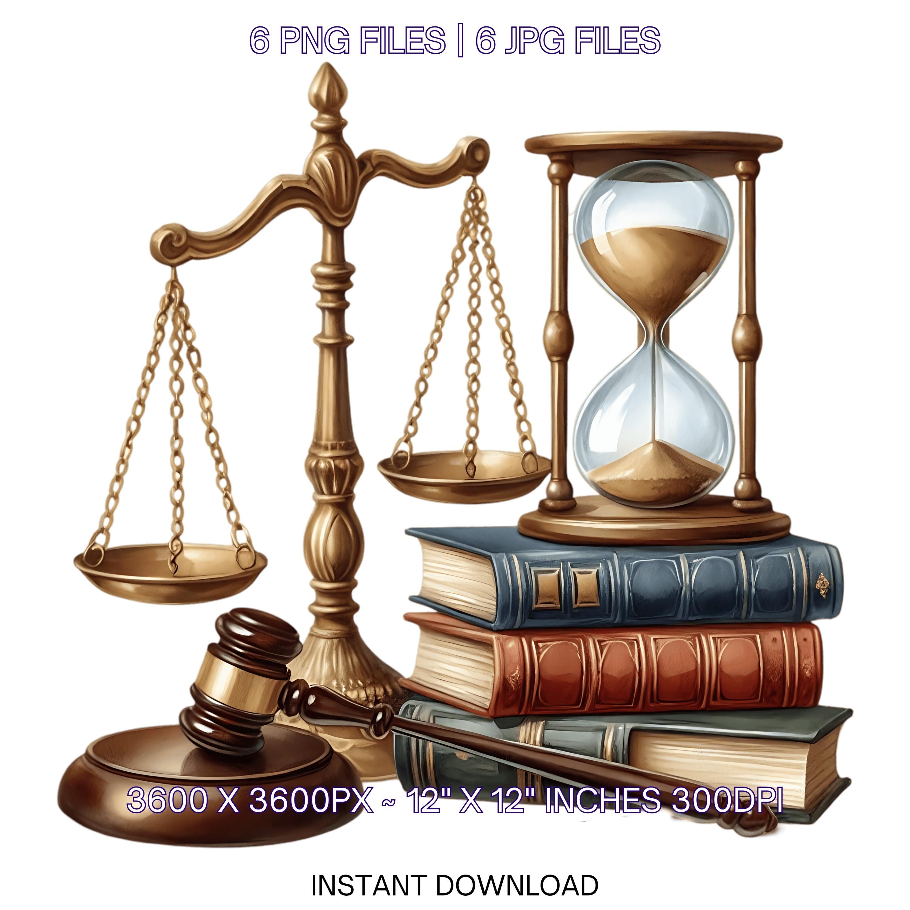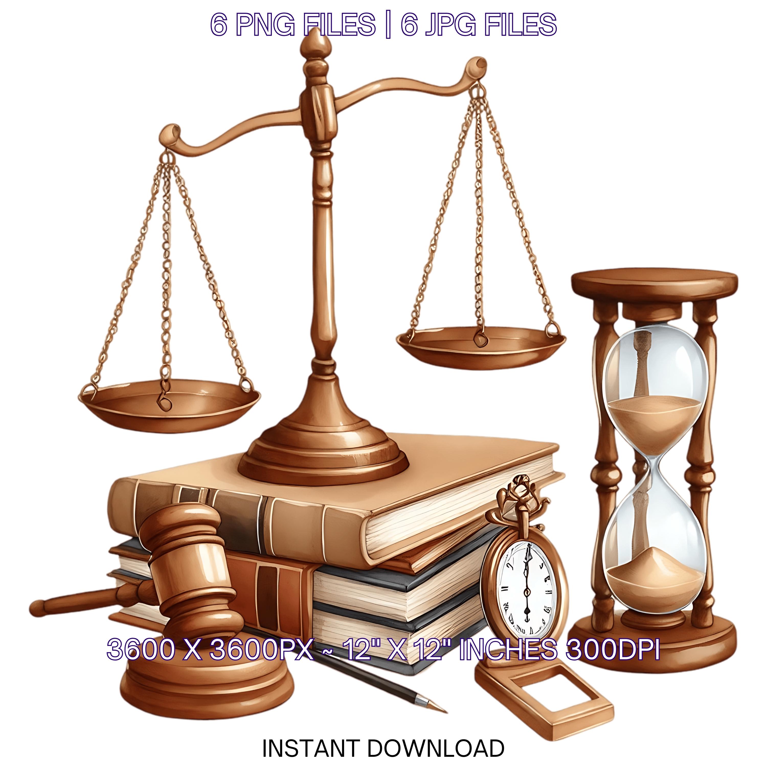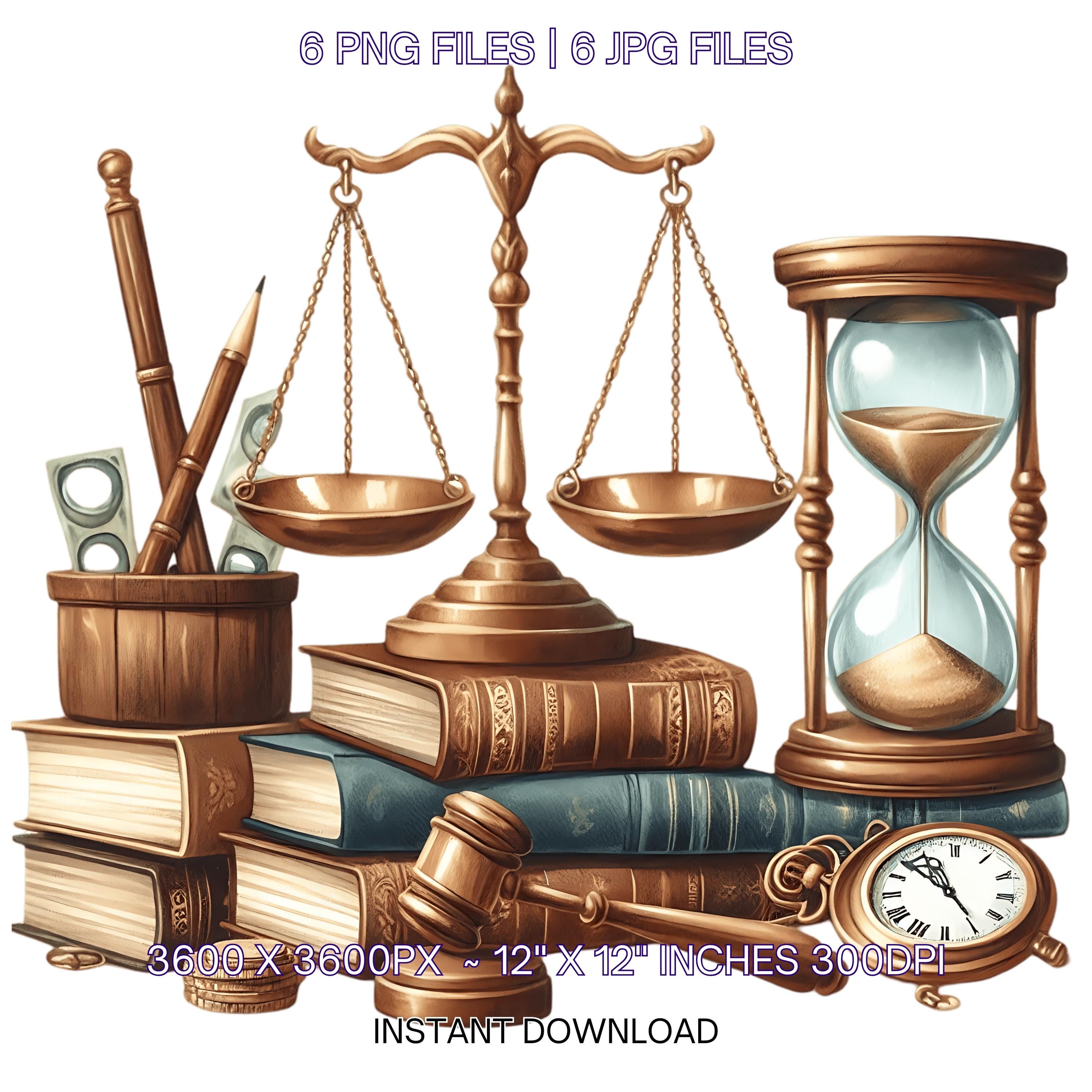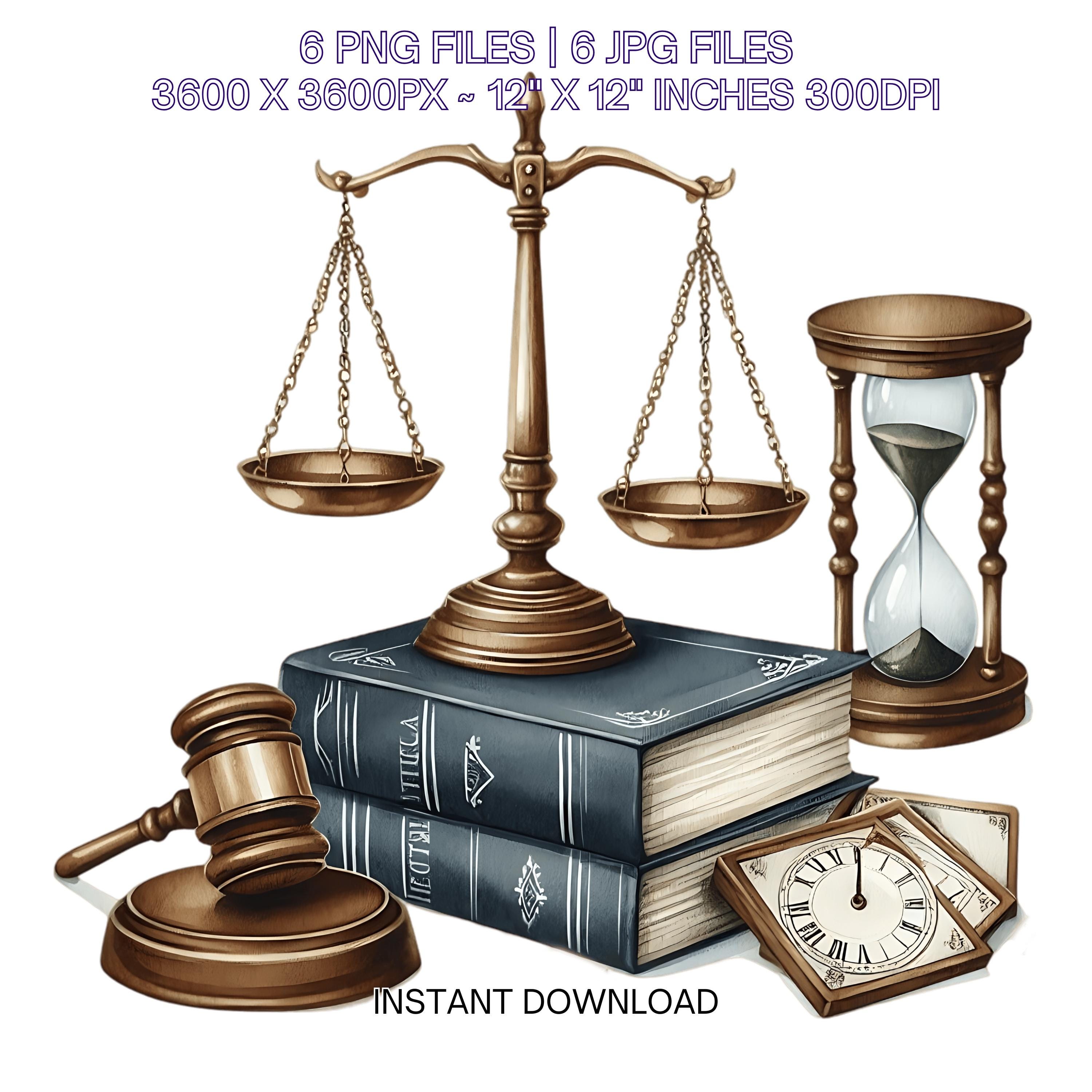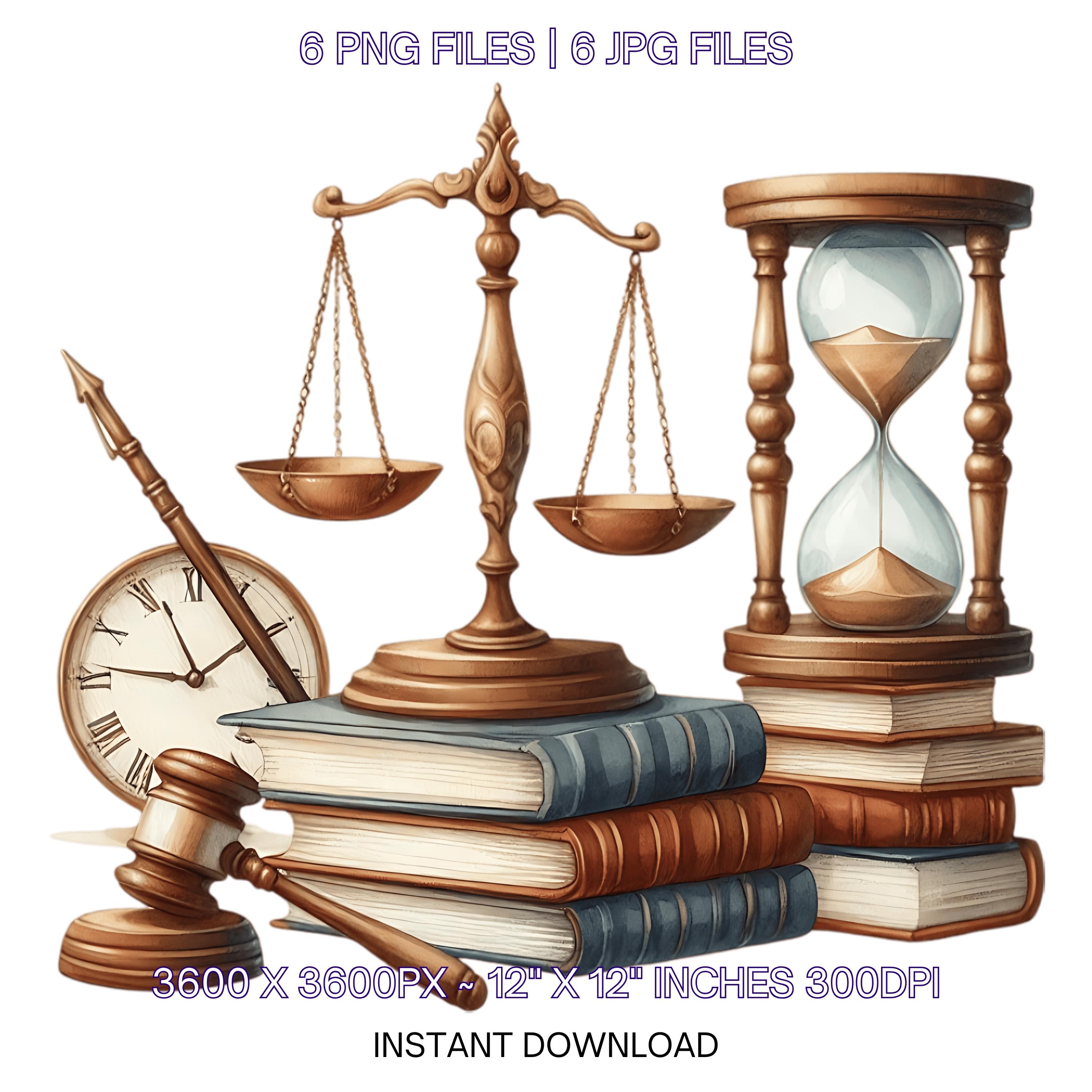 Lawyer Clipart with Lawyer’s Scale on a Stack of Lawyer’s Cards, Verdict Stick & Hourglass | Watercolor 6 PNG-JPG Sublimation Commercial Use is an eye-catching, high-resolution digital asset designed for creators, crafters, teachers, and small business owners looking to elevate their visuals.