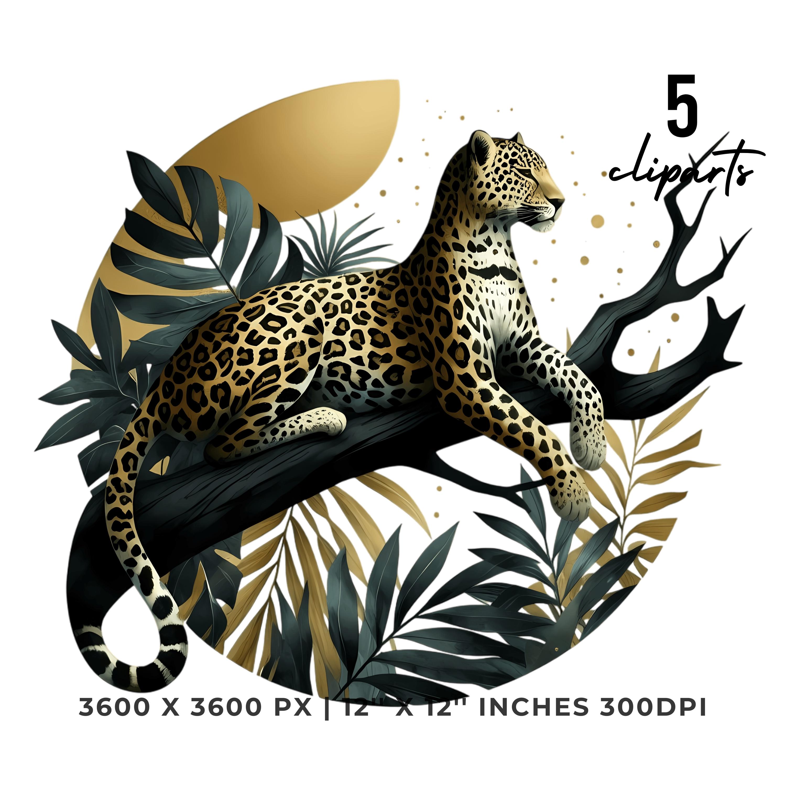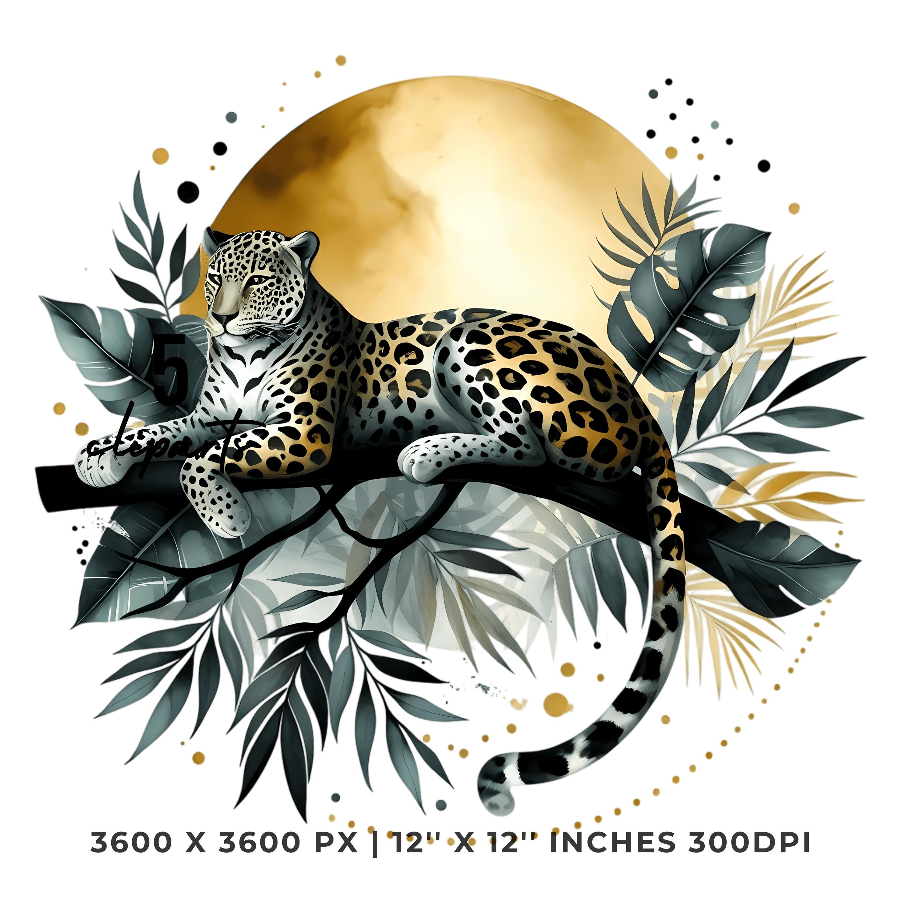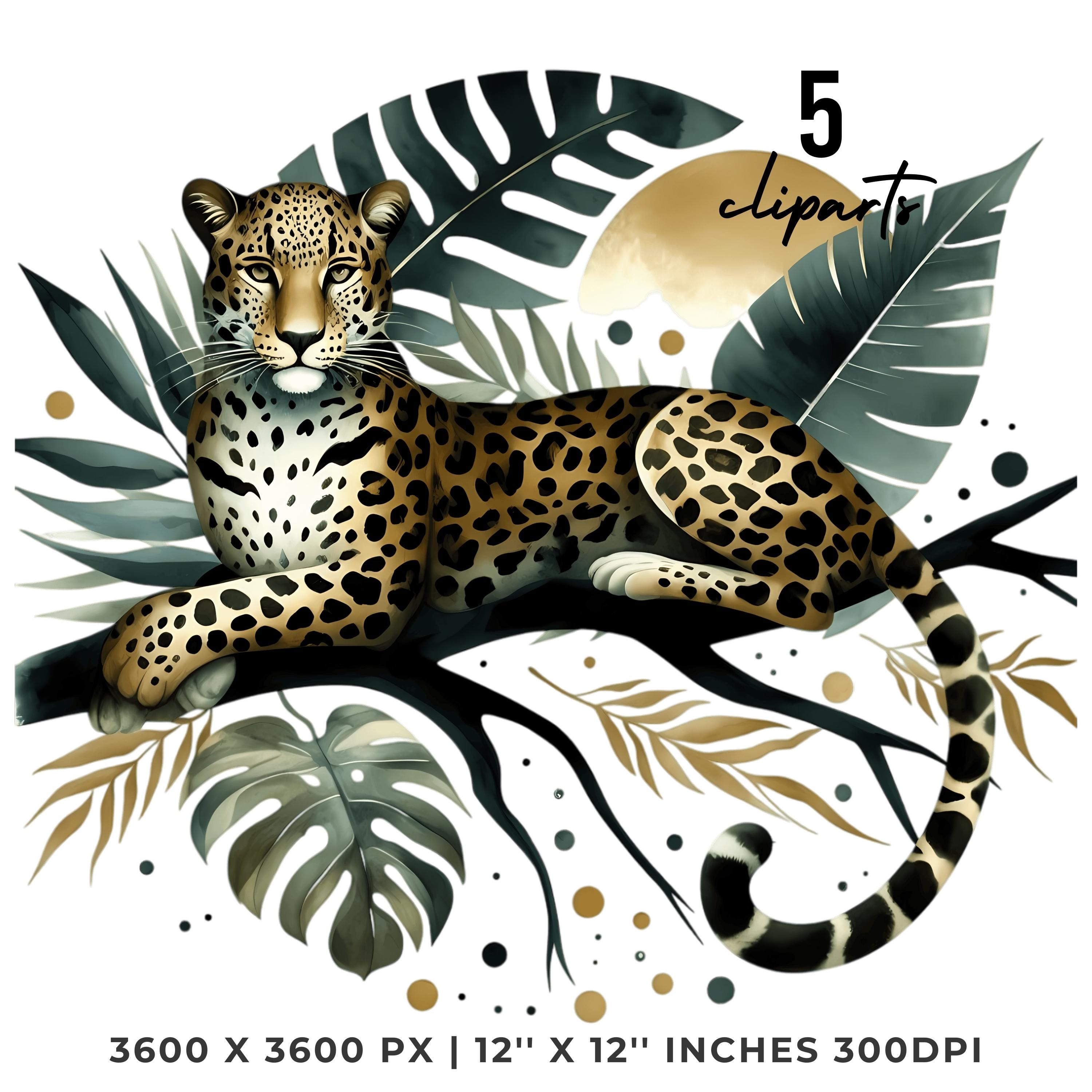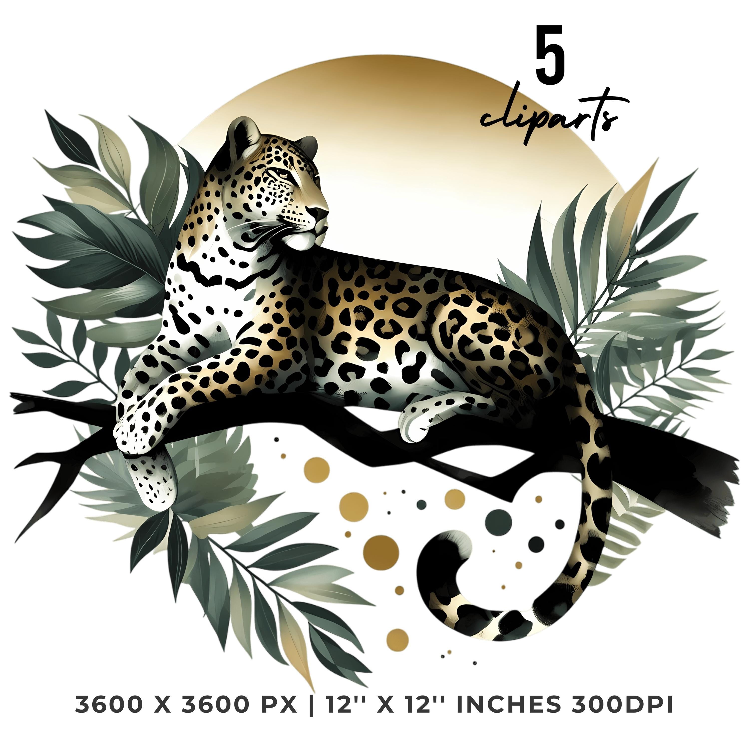 Leopard Clipart PNG | 5 Watercolor Sleek leopard lounging on a tree branch and tropical leaves | Jungle Leopard | Sublimation Commercial Use is an eye-catching, high-resolution digital asset designed for creators, crafters, teachers, and small business owners looking to elevate their visuals.