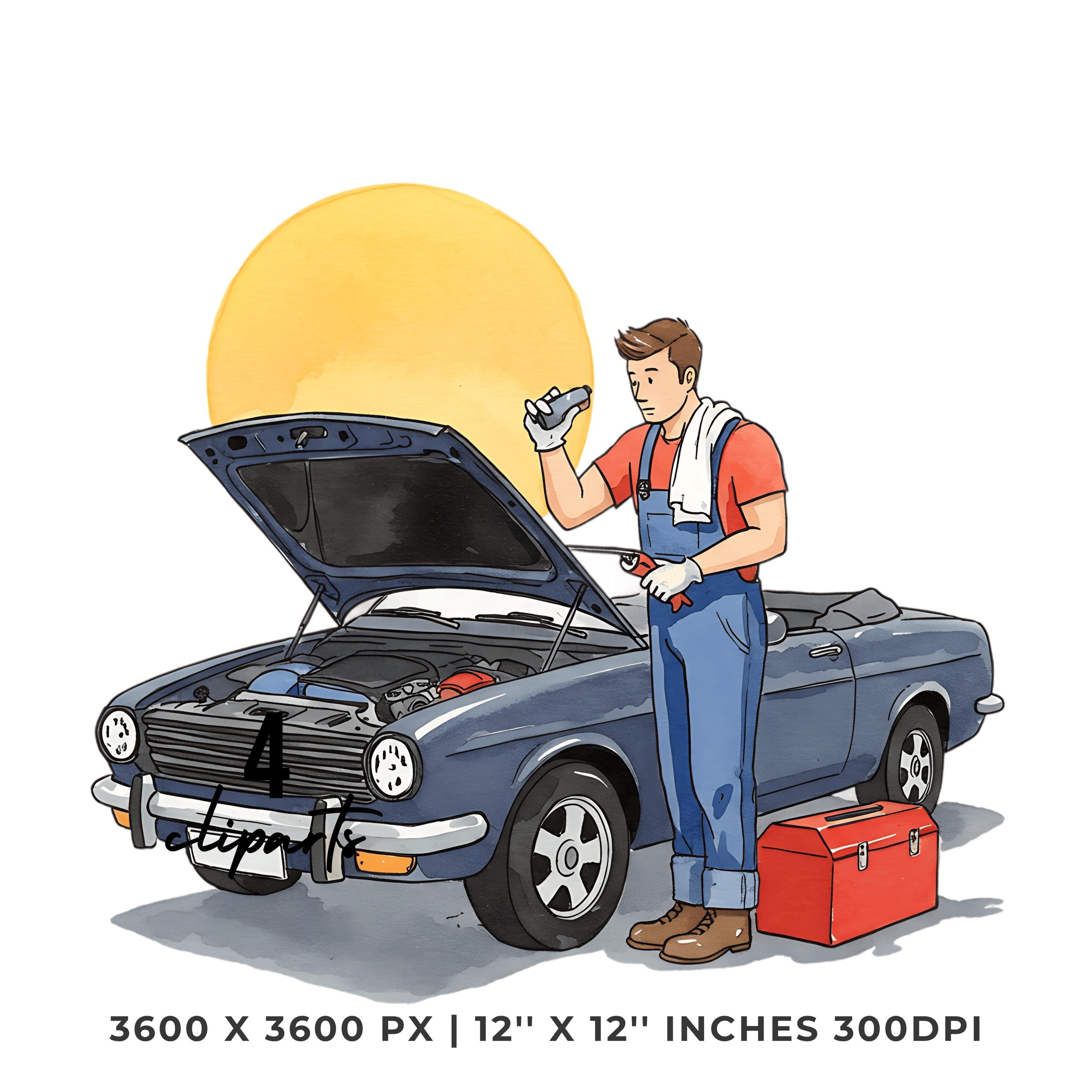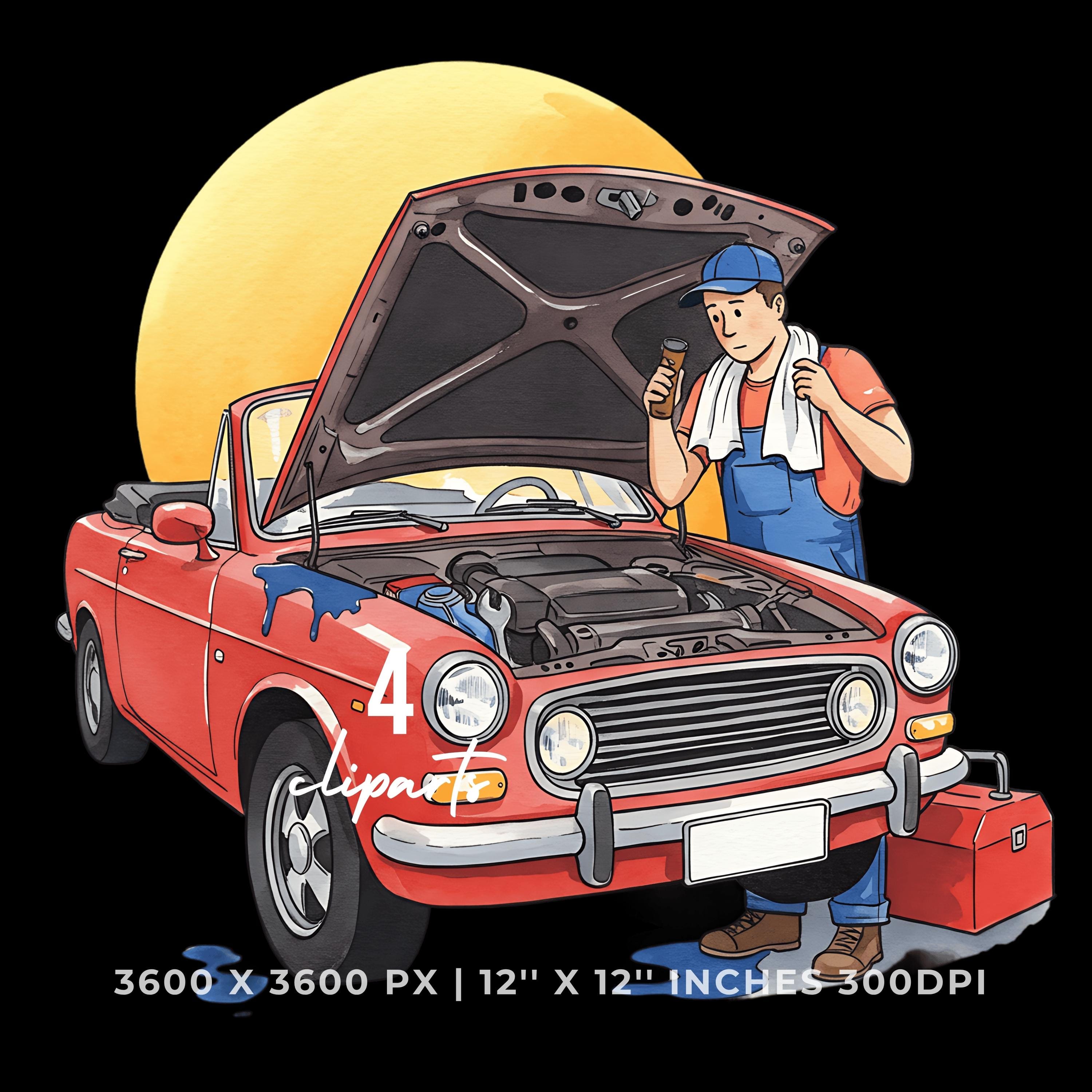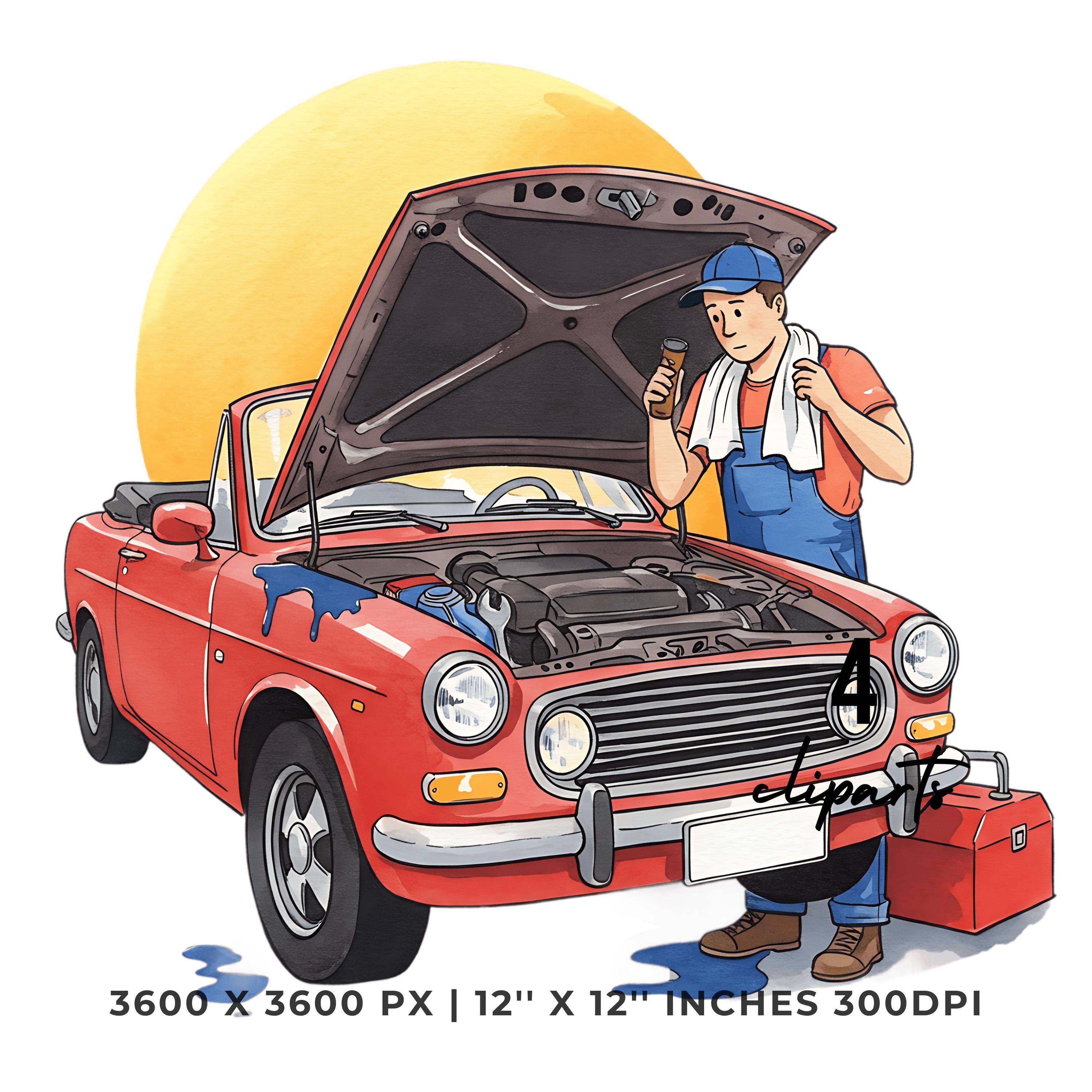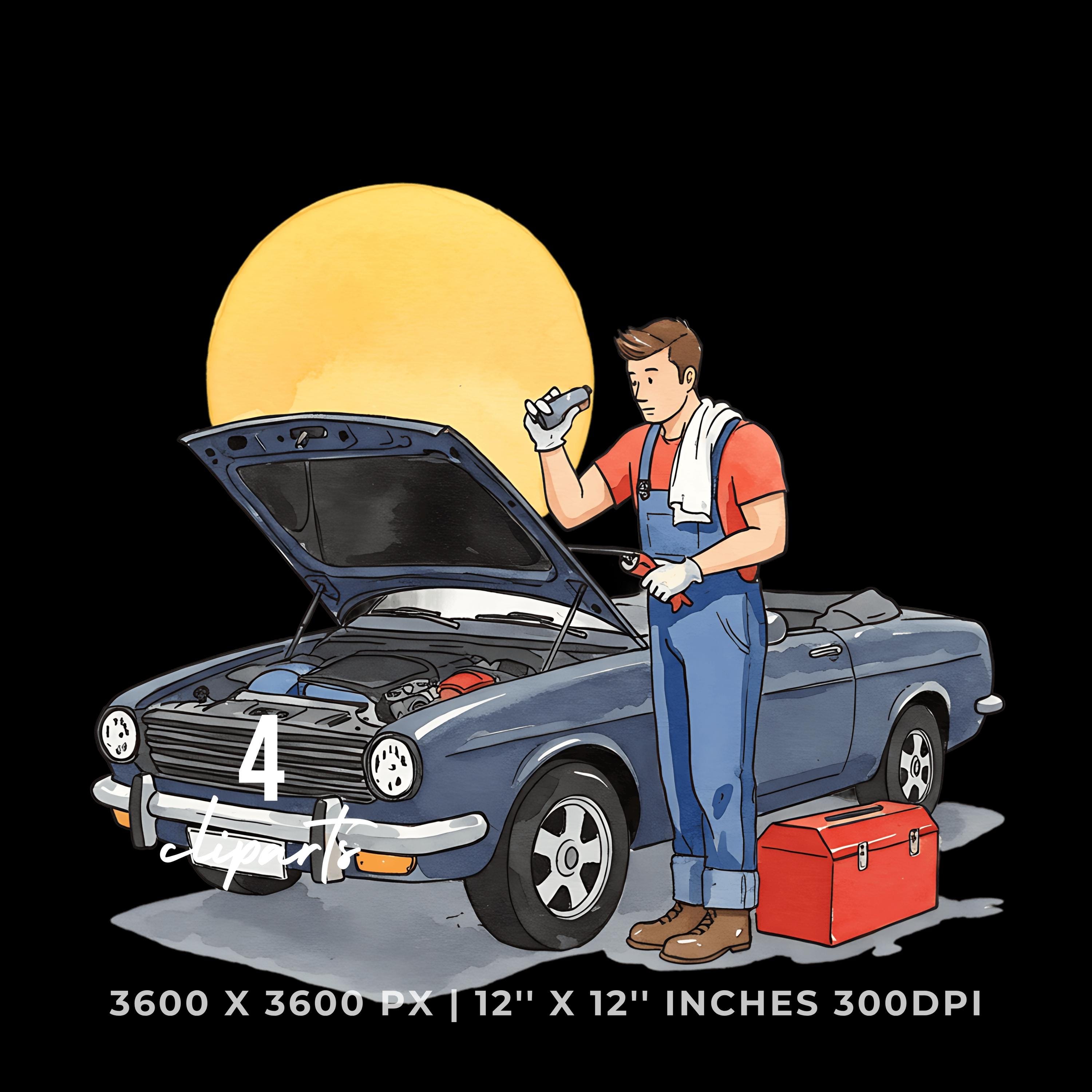 Mechanic Fixing Convertible Car Clipart | Classic Car Repair PNG JPG Bundle | Hand Drawn Auto Maintenance Artwork 12″x12″ 300DPI Graphic Commercial Use