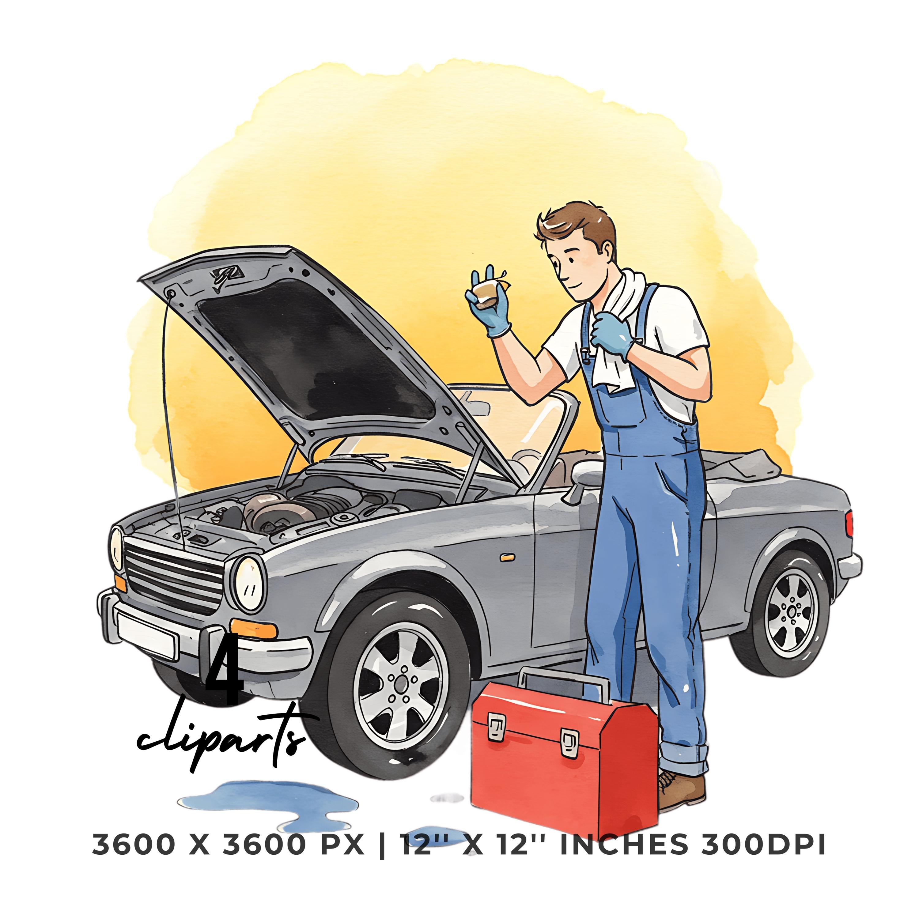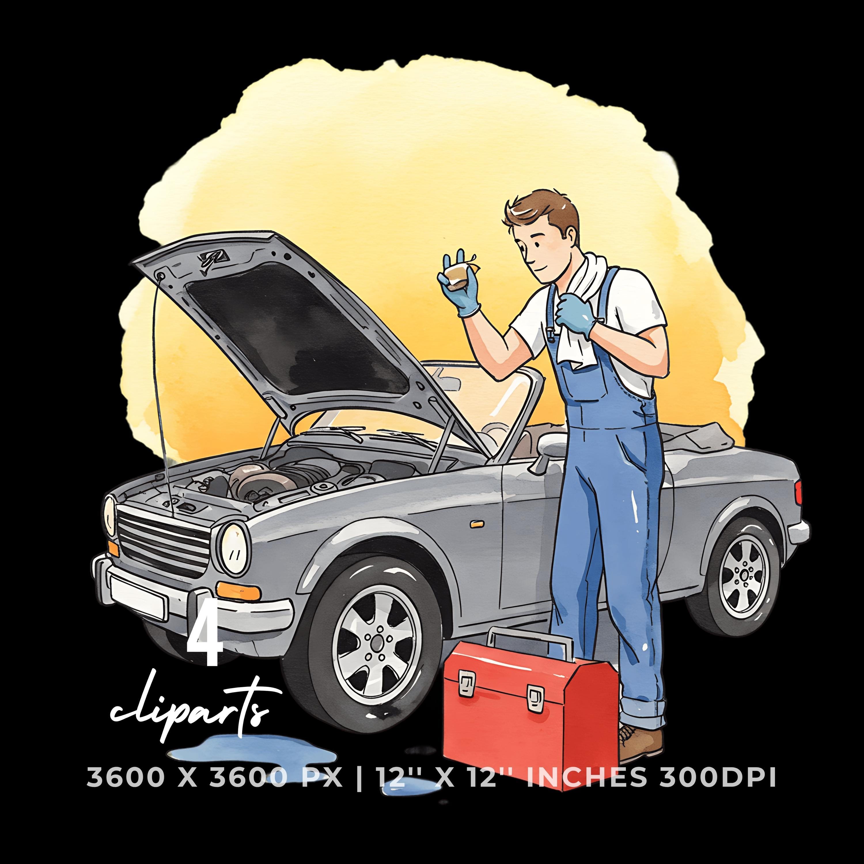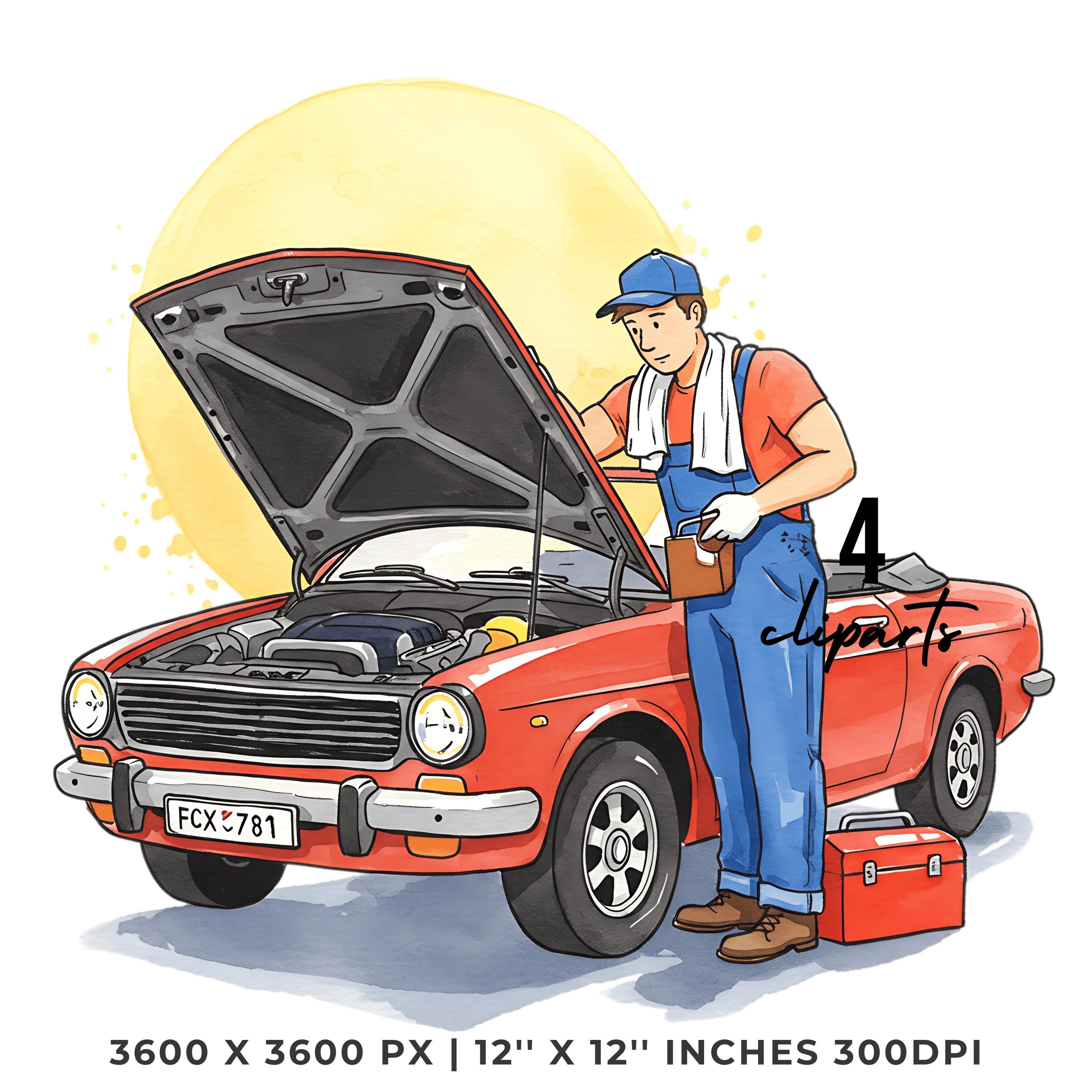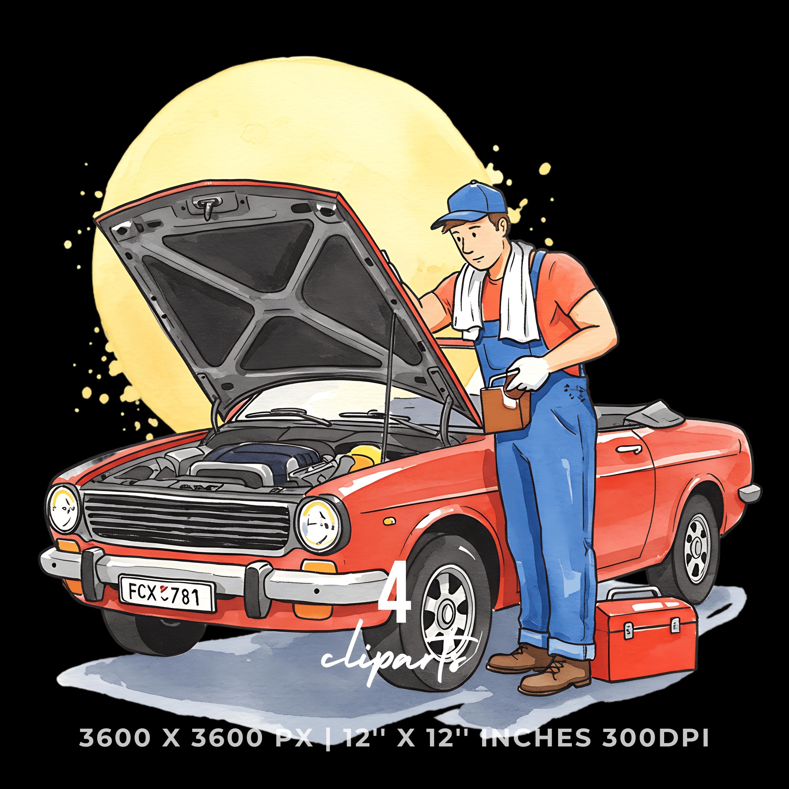 Mechanic Fixing Convertible Car Clipart | Classic Car Repair PNG JPG Bundle | Hand Drawn Auto Maintenance Artwork 12″x12″ 300DPI Graphic Commercial Use