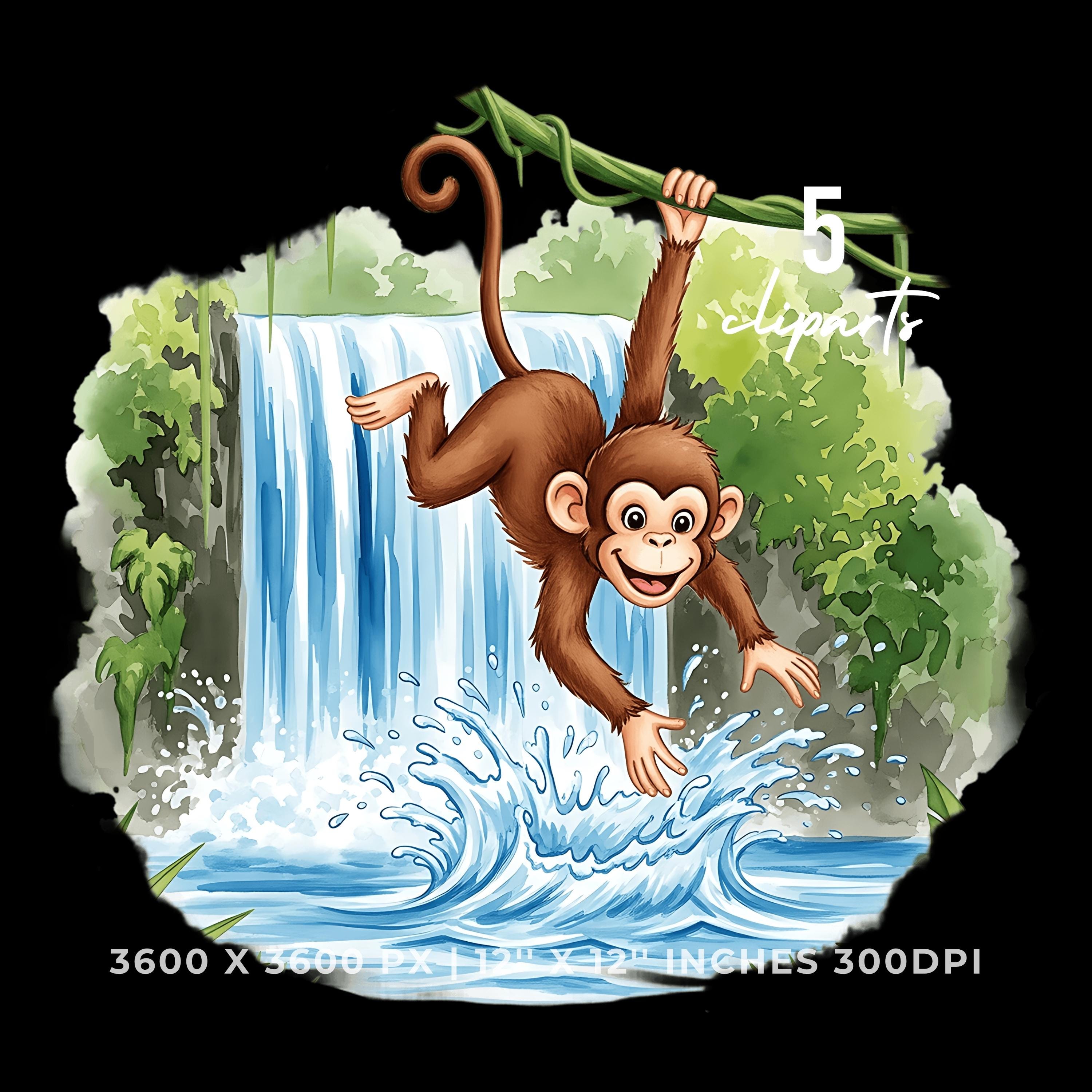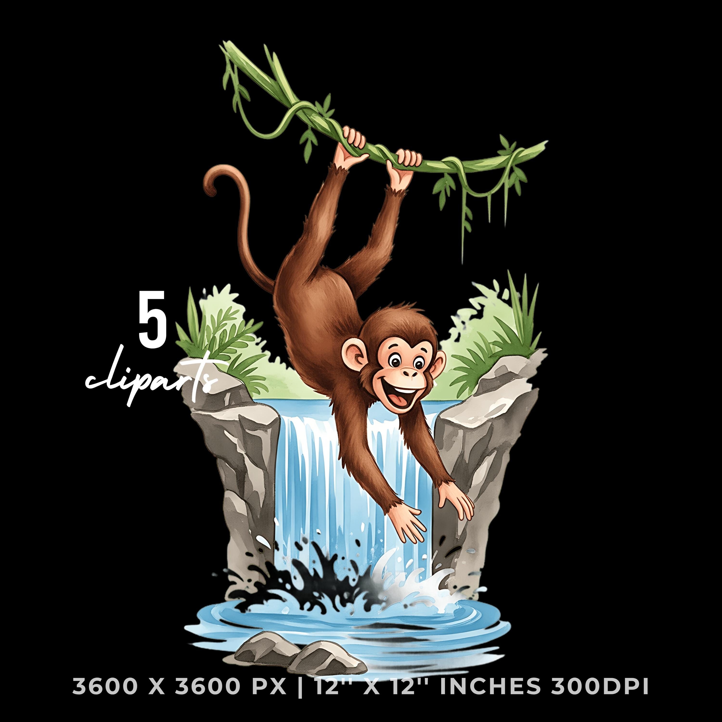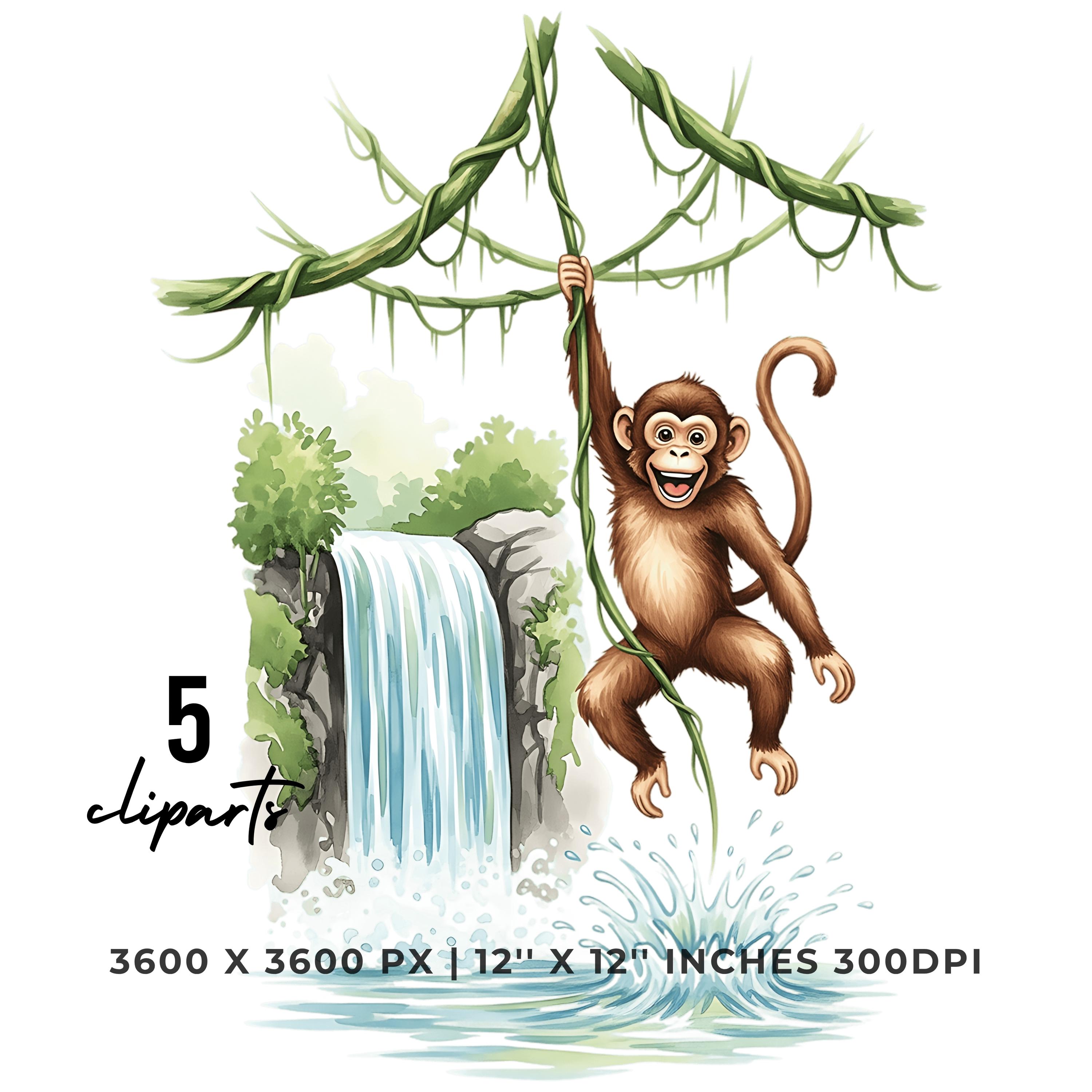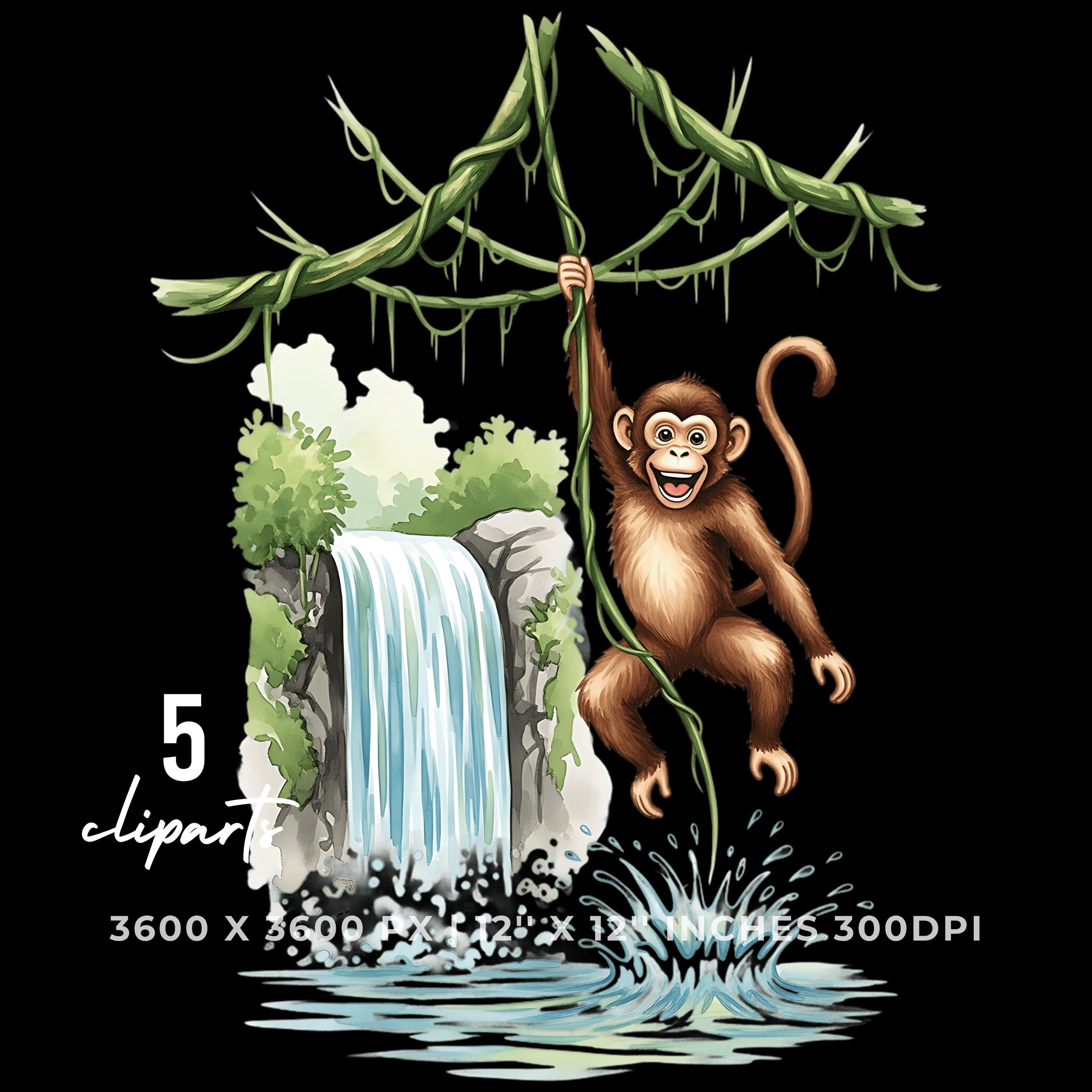 Monkey Jungle Swinging Clipart PNG JPG | Cute Animal Waterfall Scene | 5 PNG & 5 JPG | Sublimation Design | 12″x12″ 300DPI Graphic Commercial Use