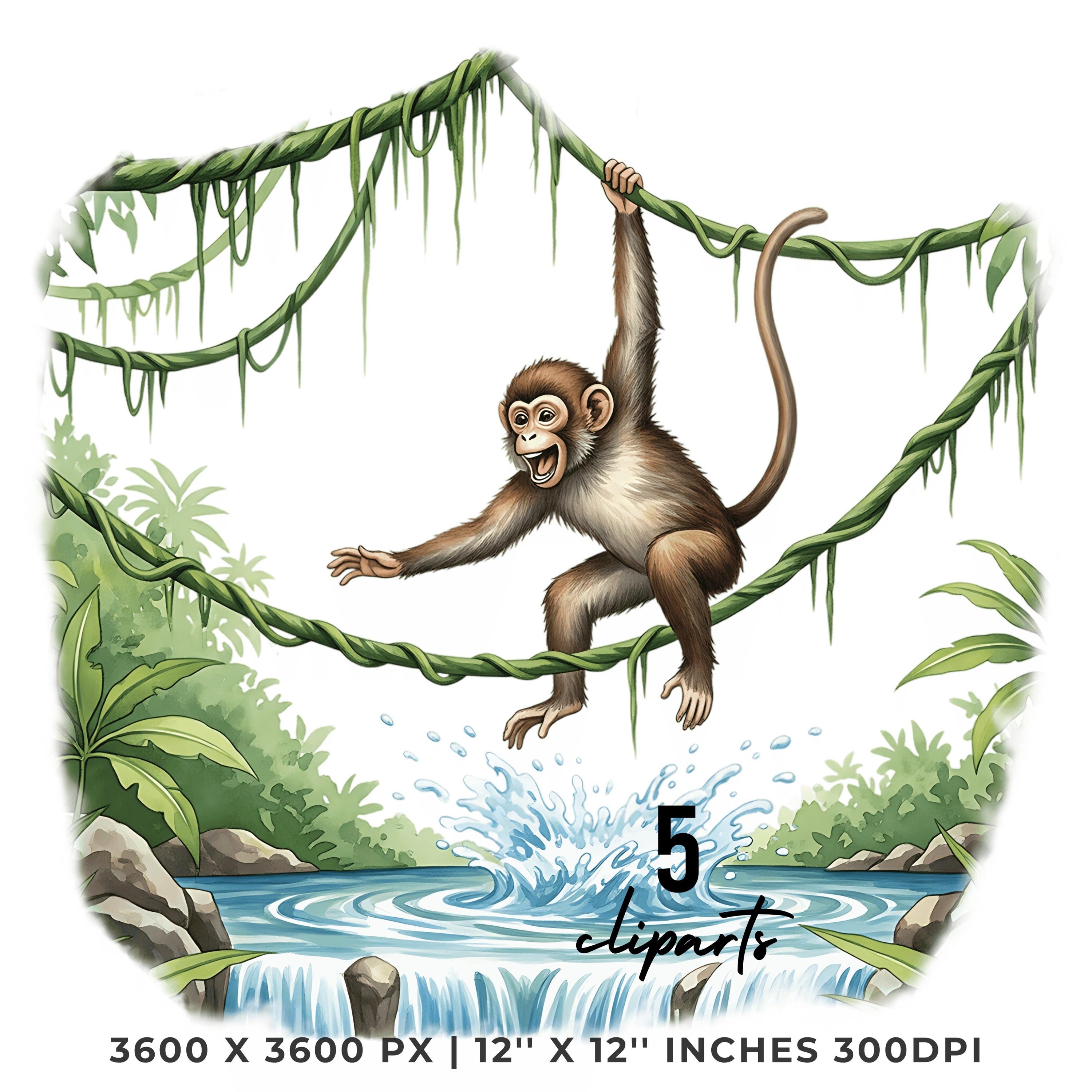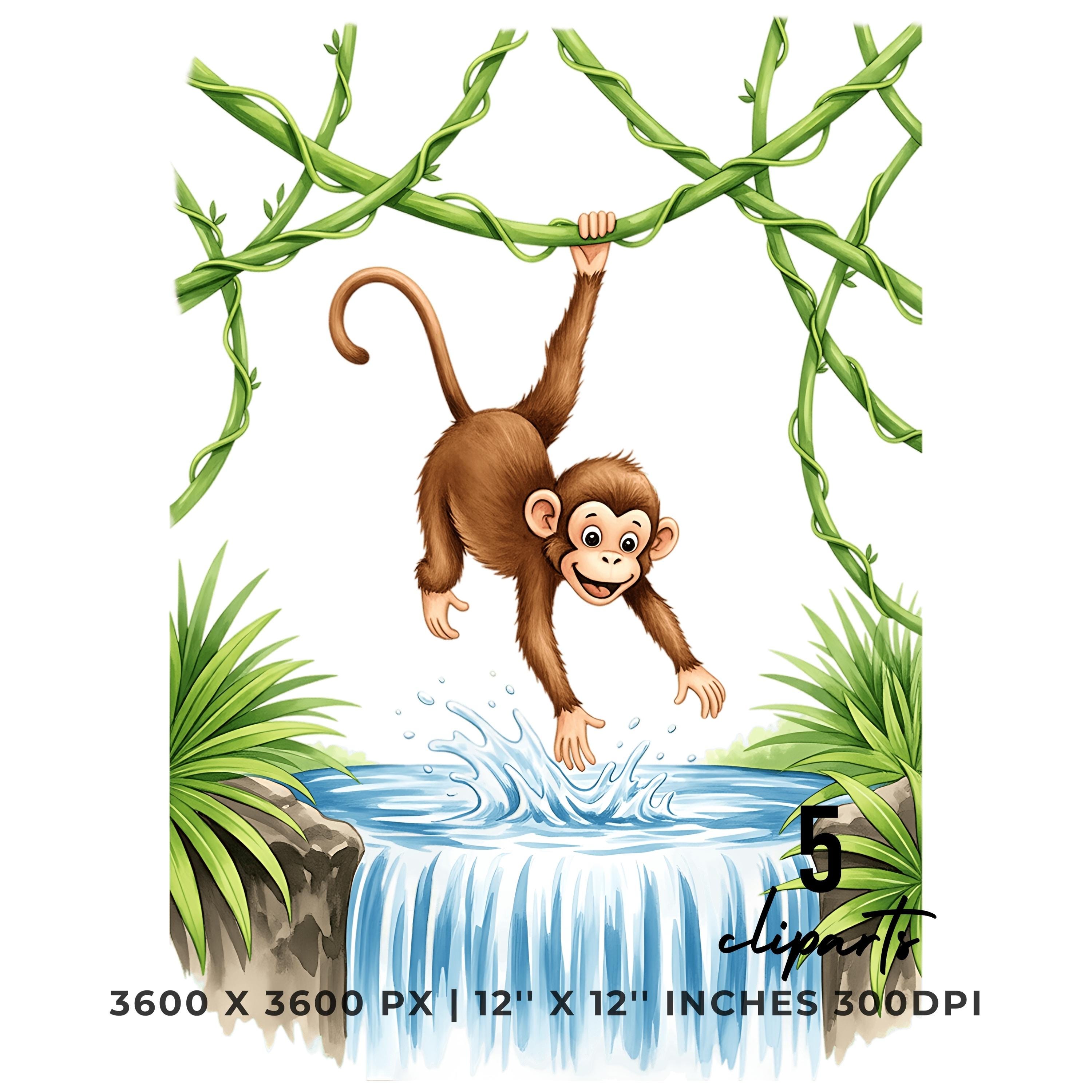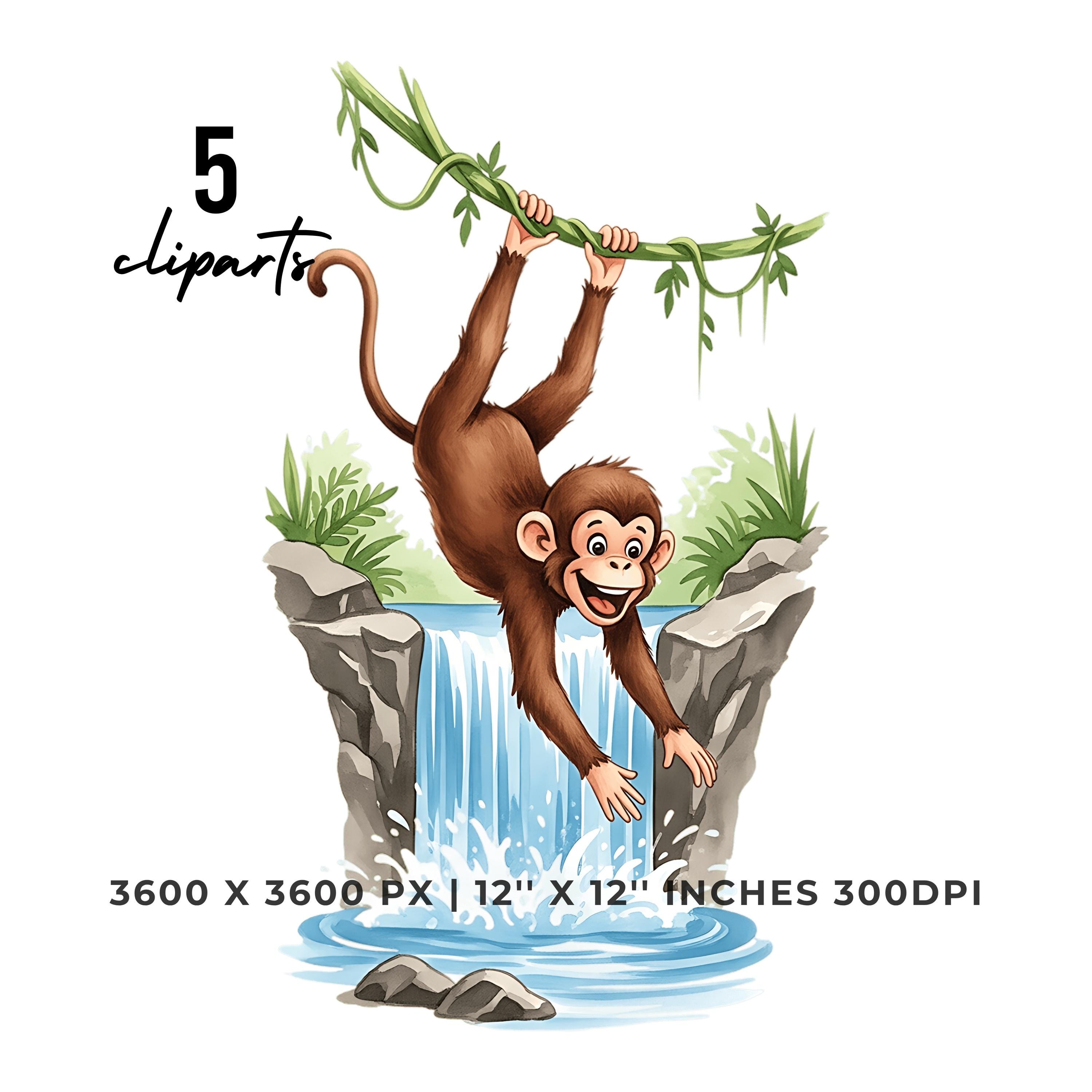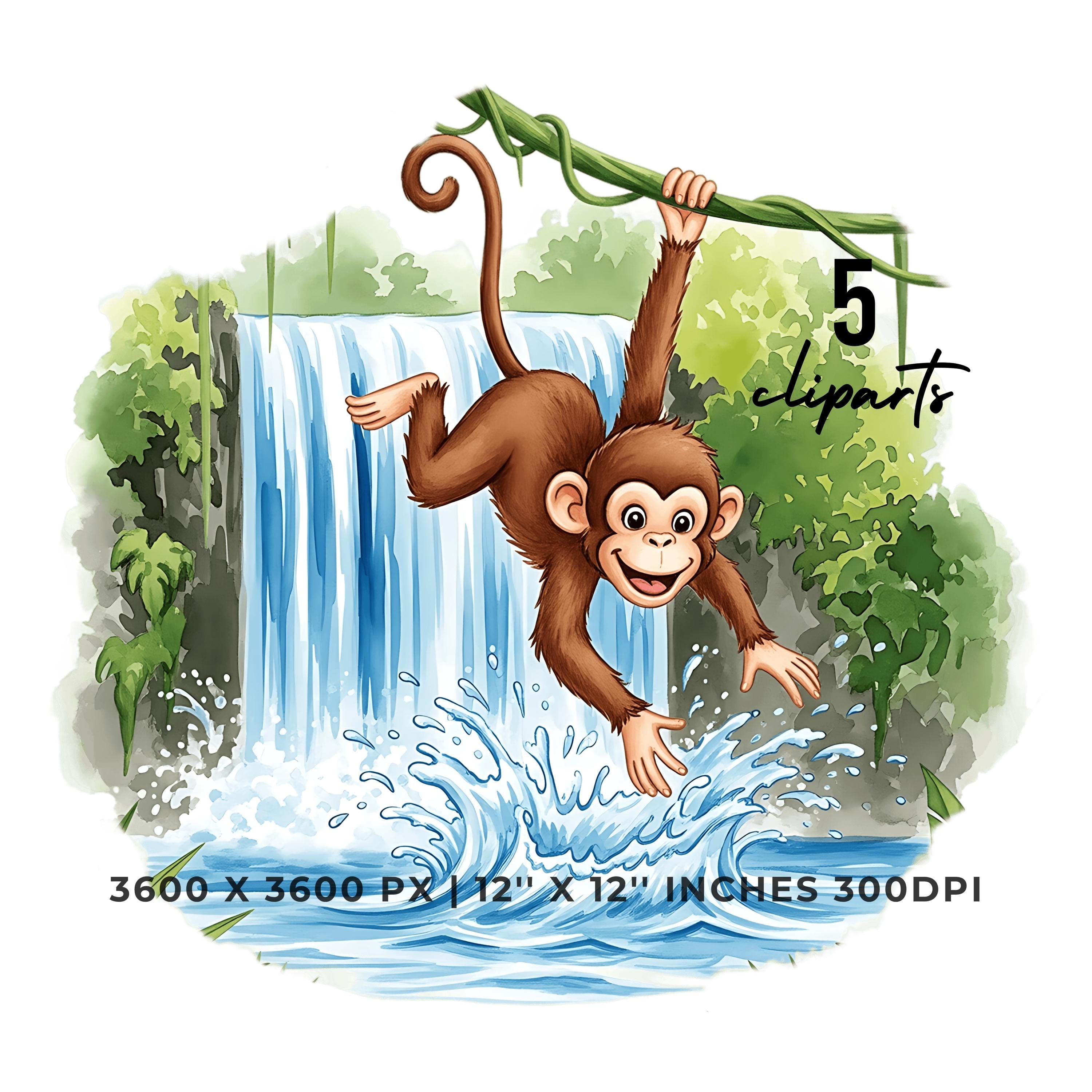 Monkey Jungle Swinging Clipart PNG JPG | Cute Animal Waterfall Scene | 5 PNG & 5 JPG | Sublimation Design | 12″x12″ 300DPI Graphic Commercial Use
