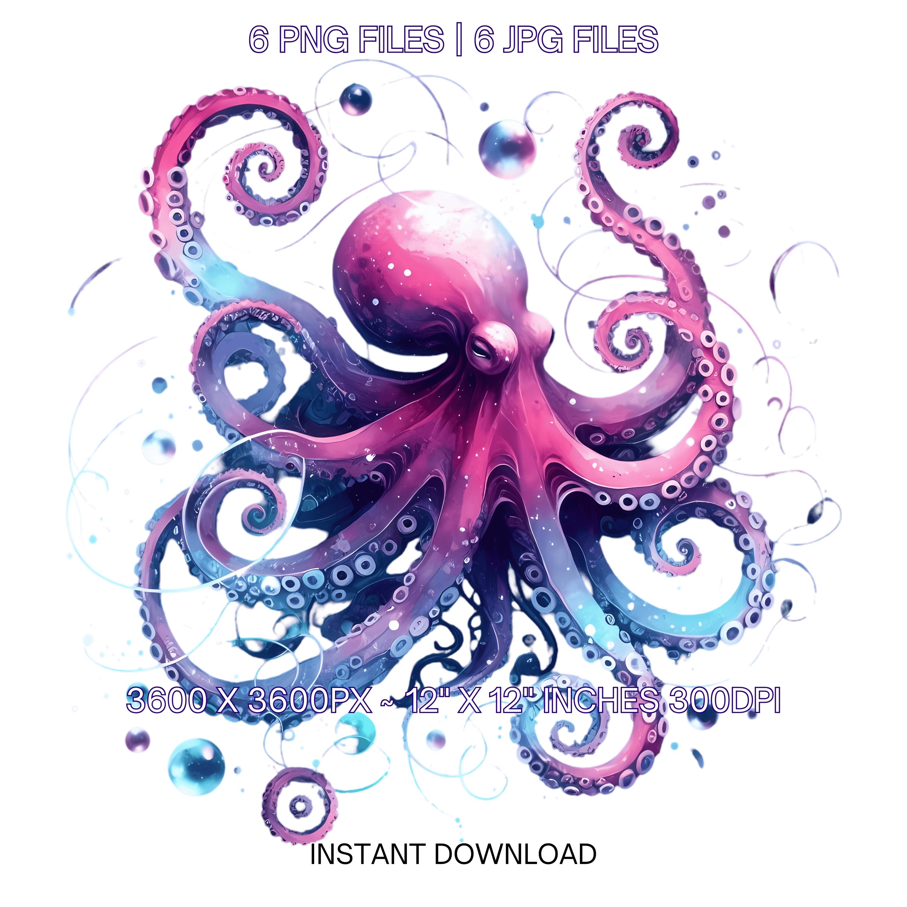 Octopus Clipart PNG | 6 Watercolor Swirling Tentacles of Mystical Octopus & Glowing Underwater Orbs | Underwater Sublimation Commercial Use is an eye-catching, high-resolution digital asset designed for creators, crafters, teachers, and small business owners looking to elevate their visuals.