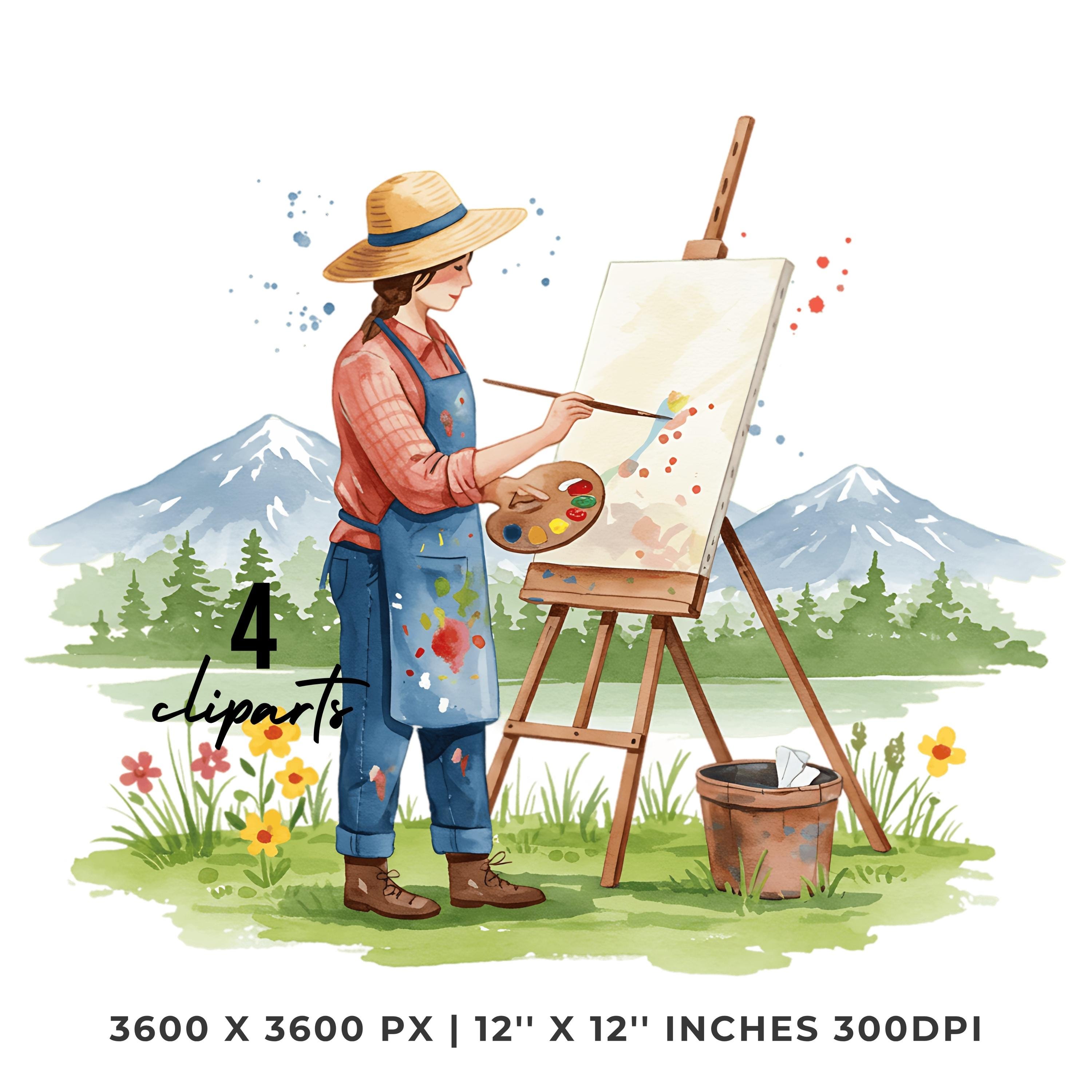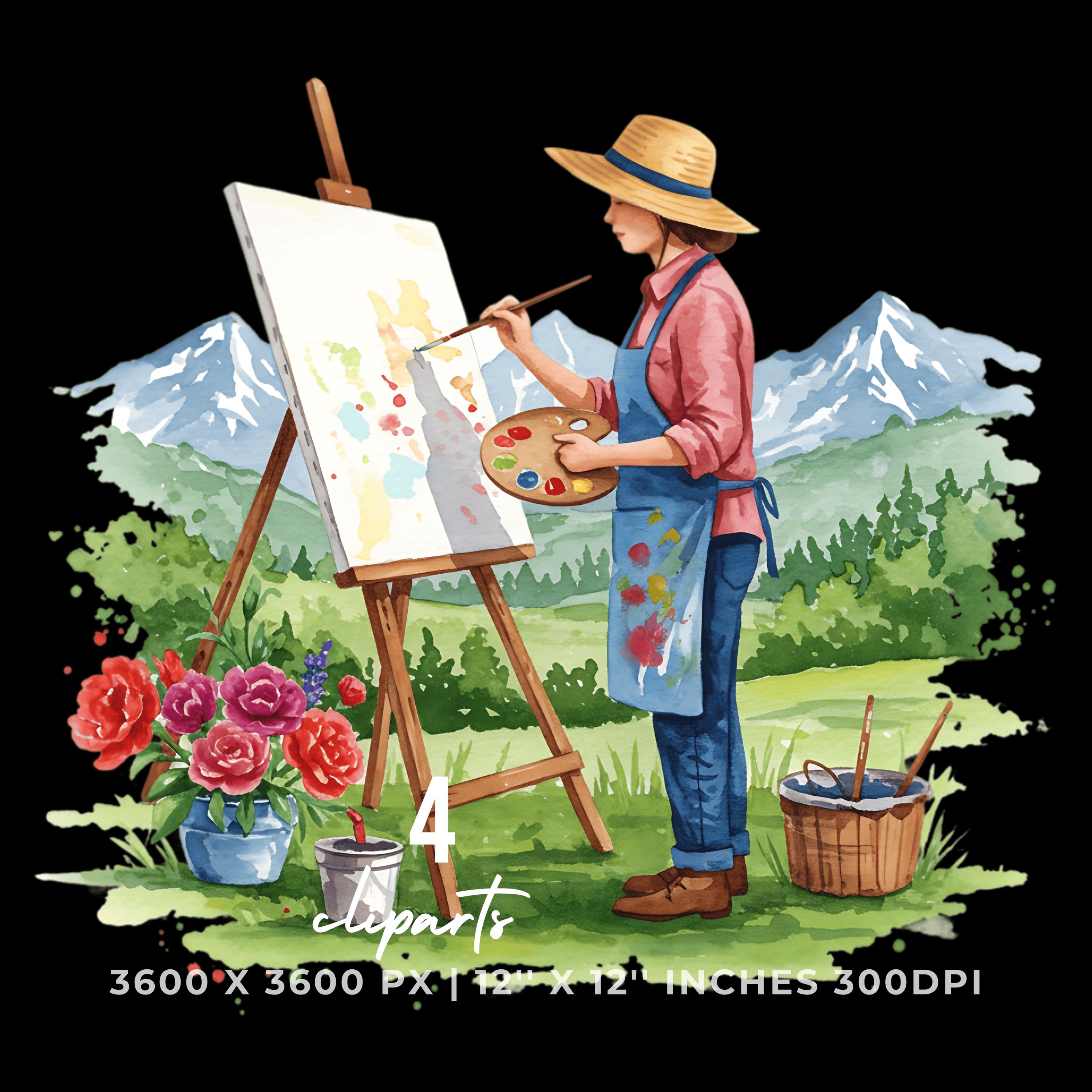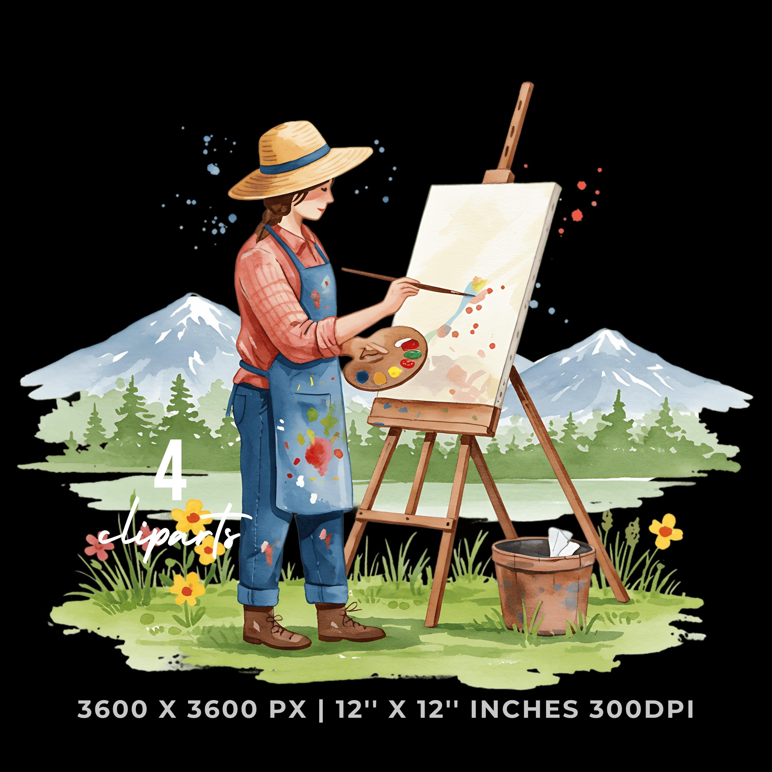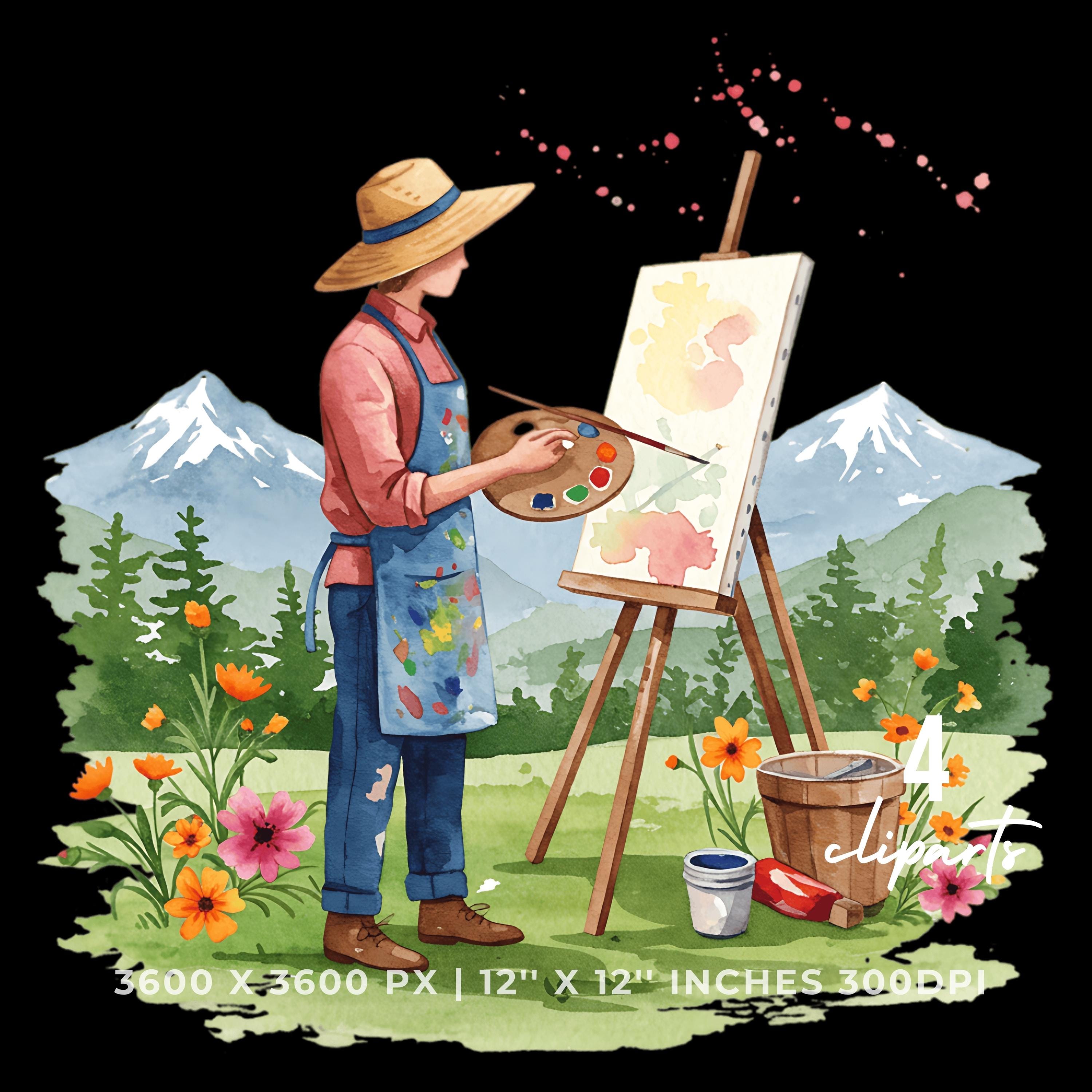 Painter in Straw Hat Clipart | Artist Outdoors | Sublimation Art Scene | 4 PNG & 4 JPG | Sublimation Design | 12″x12″ 300DPI Graphic Commercial Use