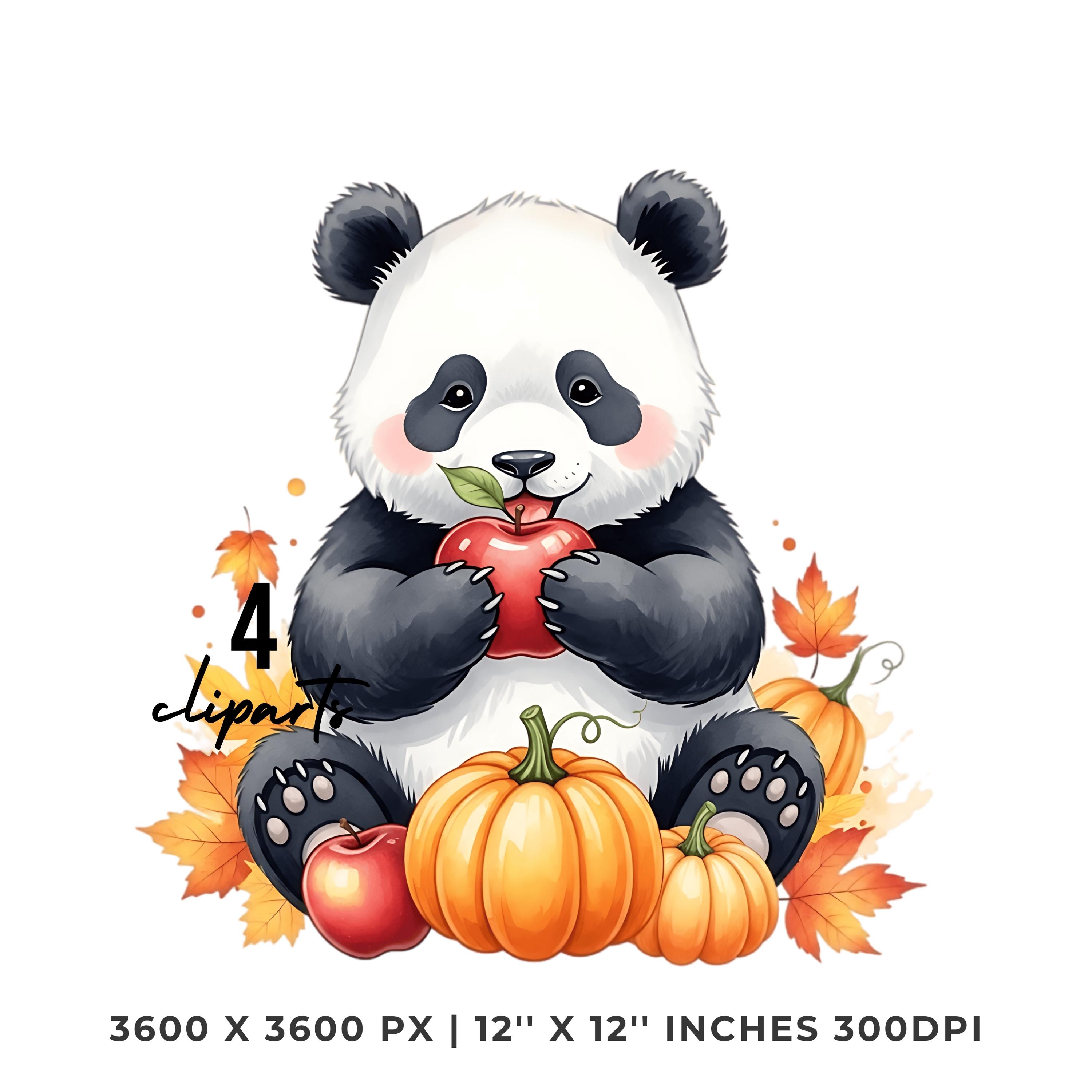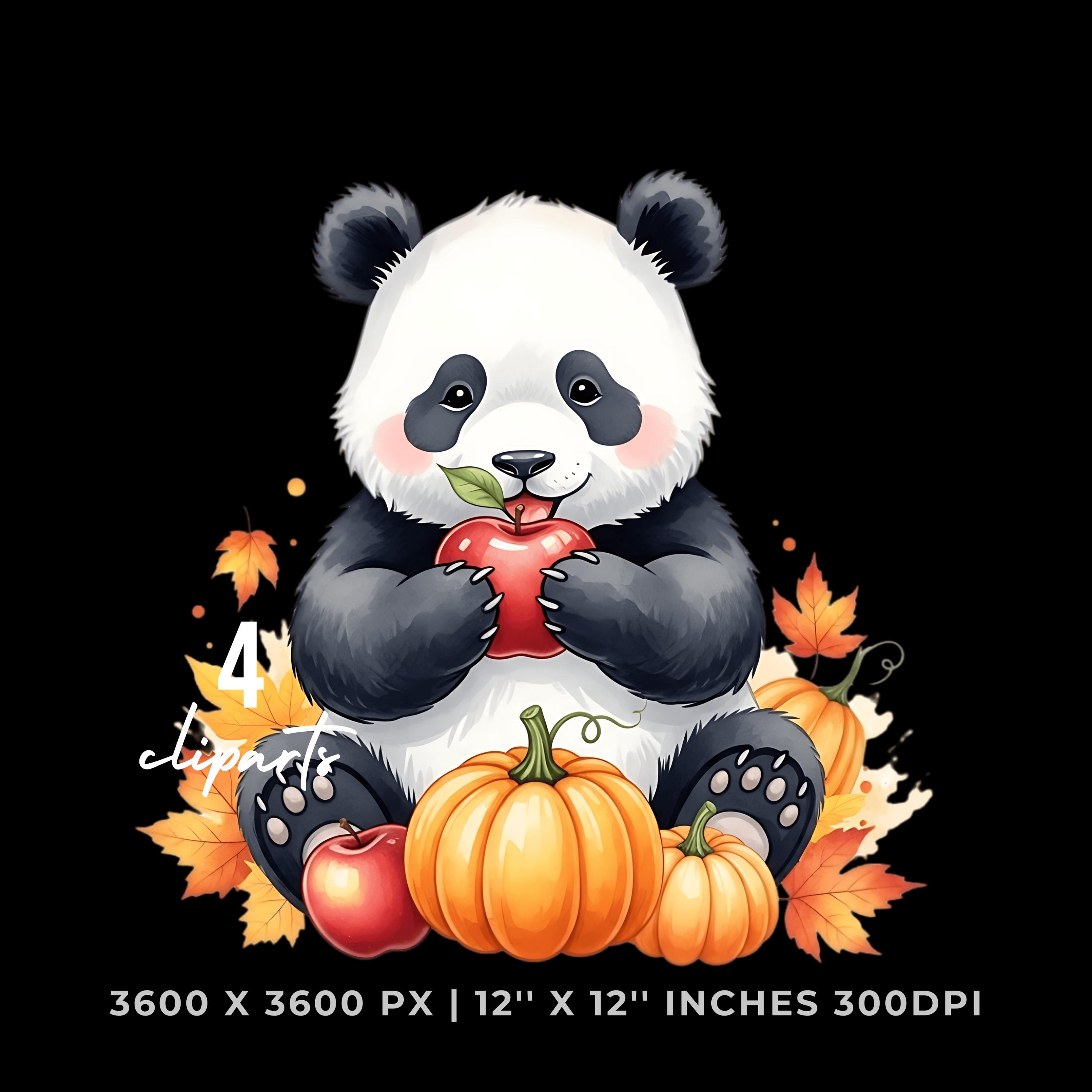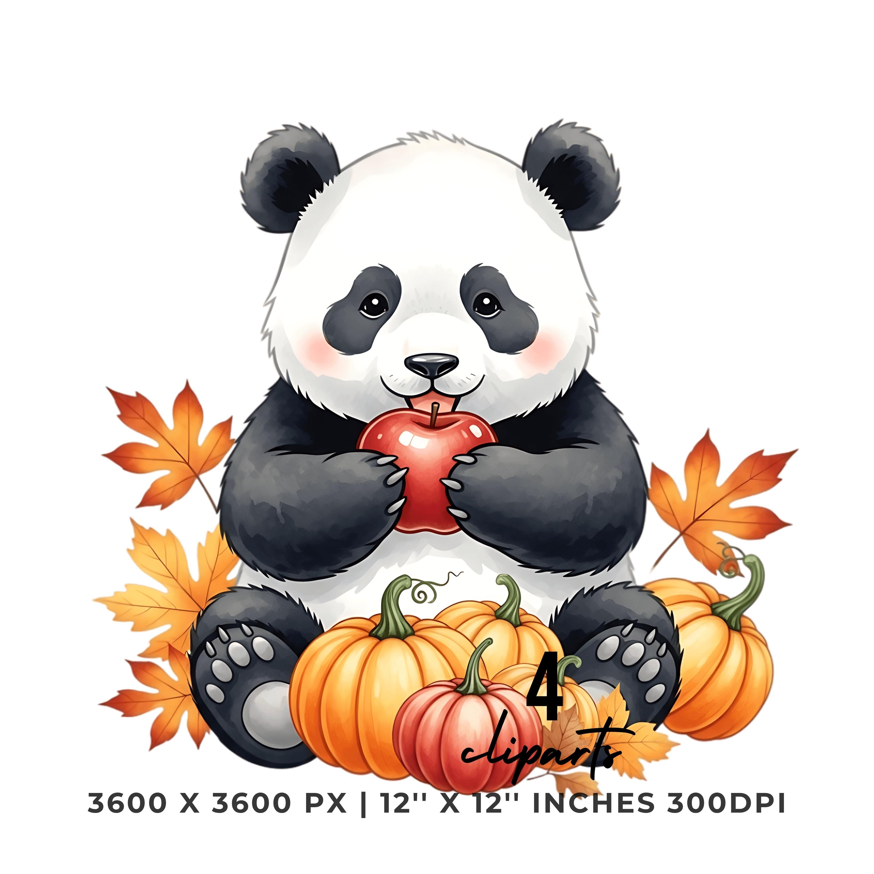 Panda with Apple Fall Pumpkin Clipart | 4 PNG & 4 JPG | Sublimation Transparent Commercial Use