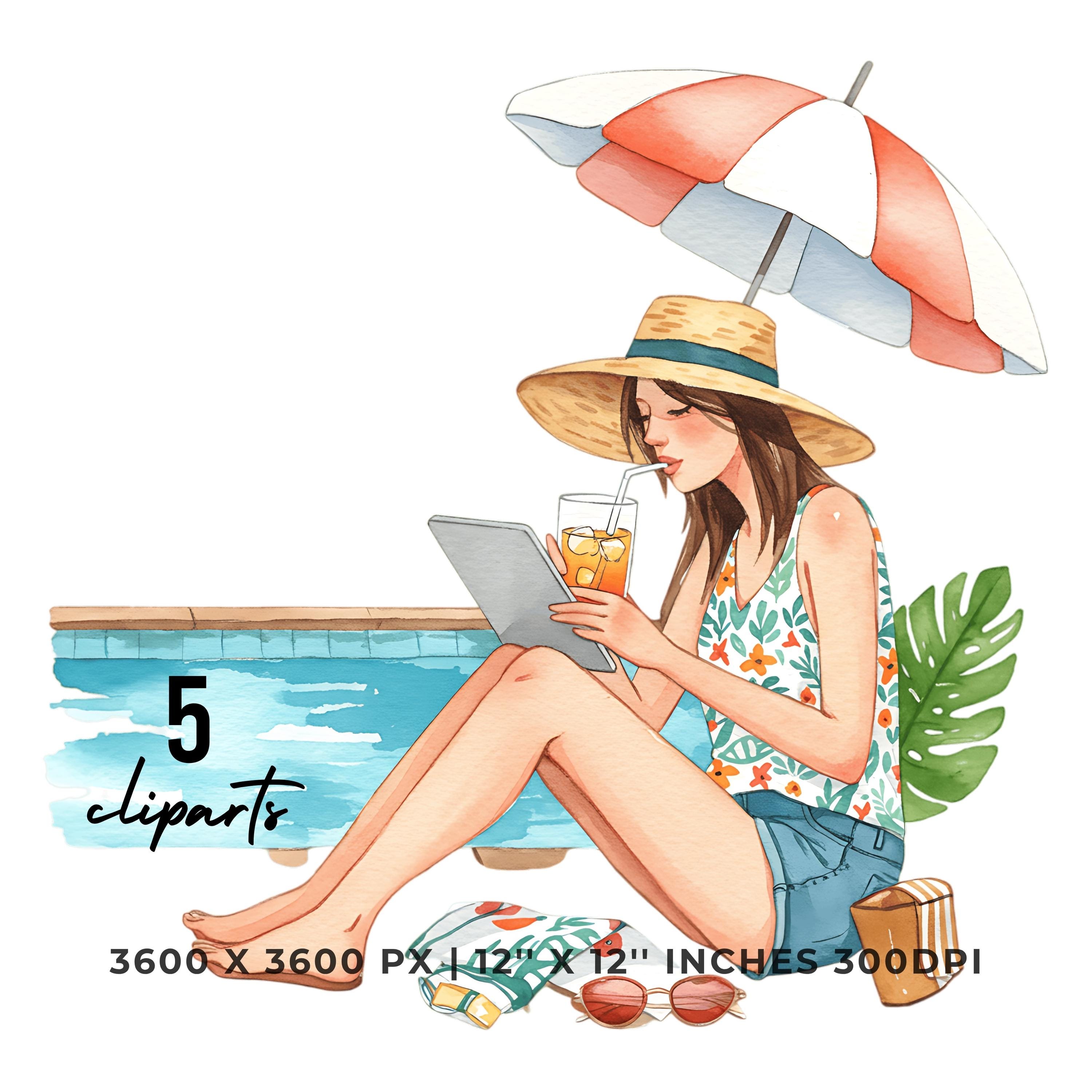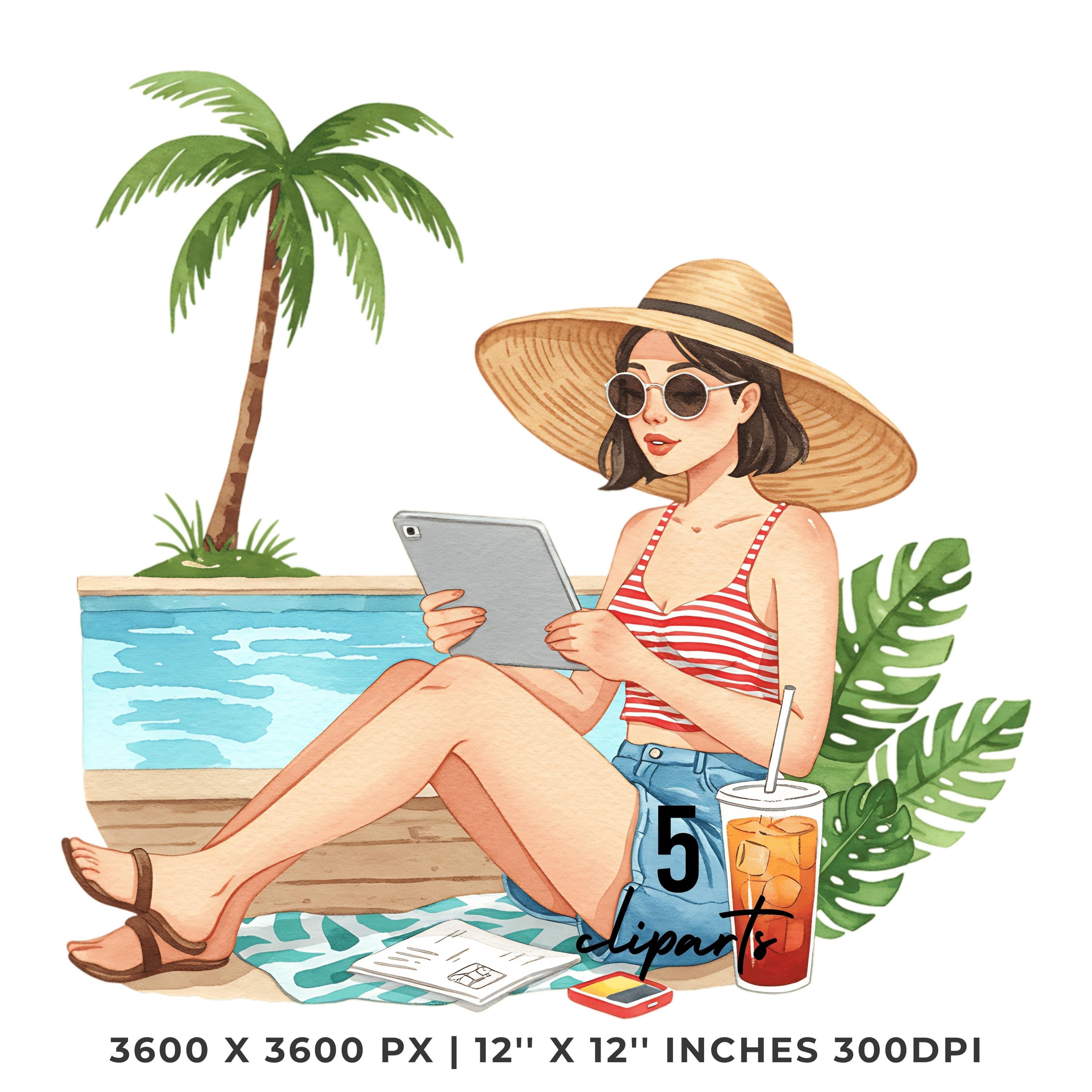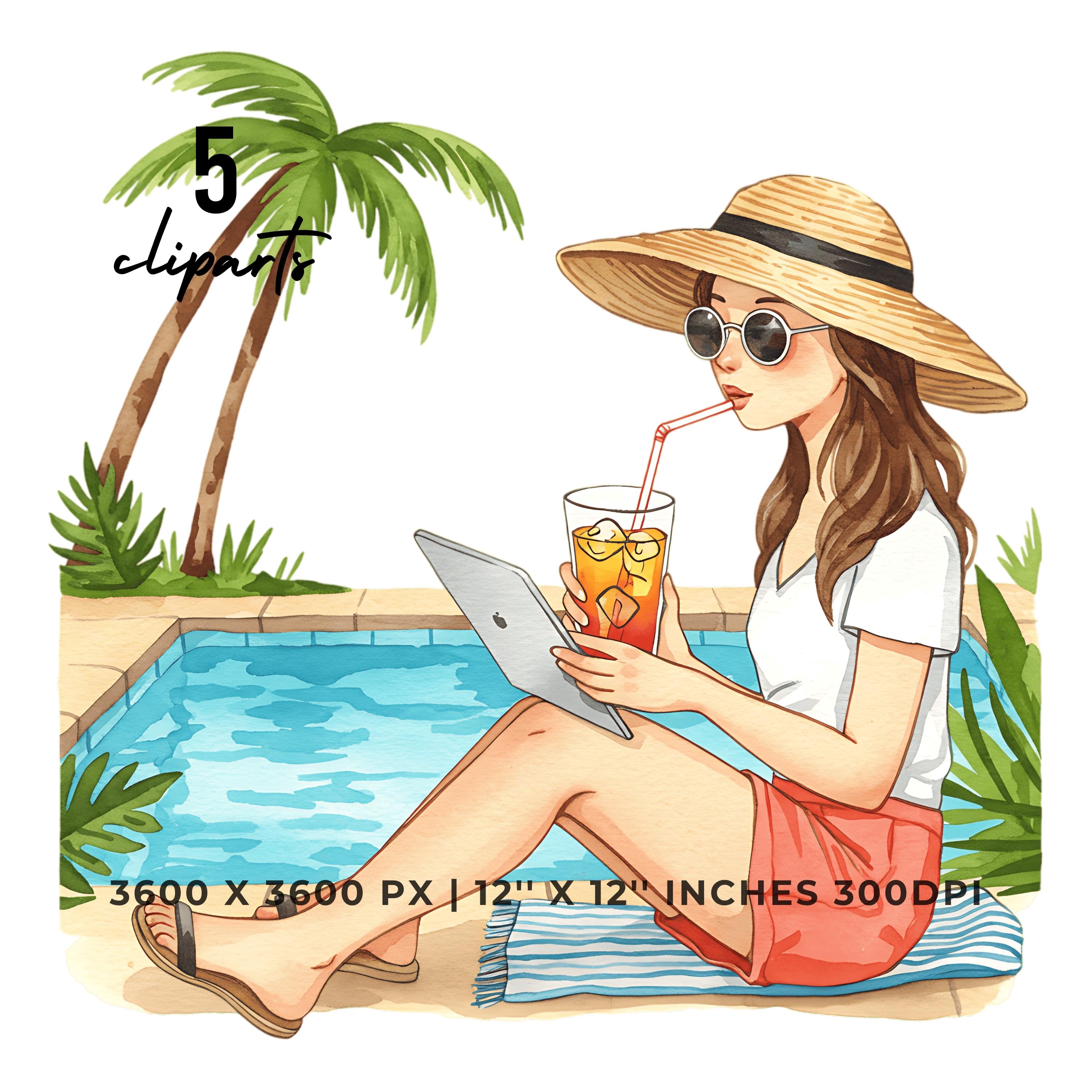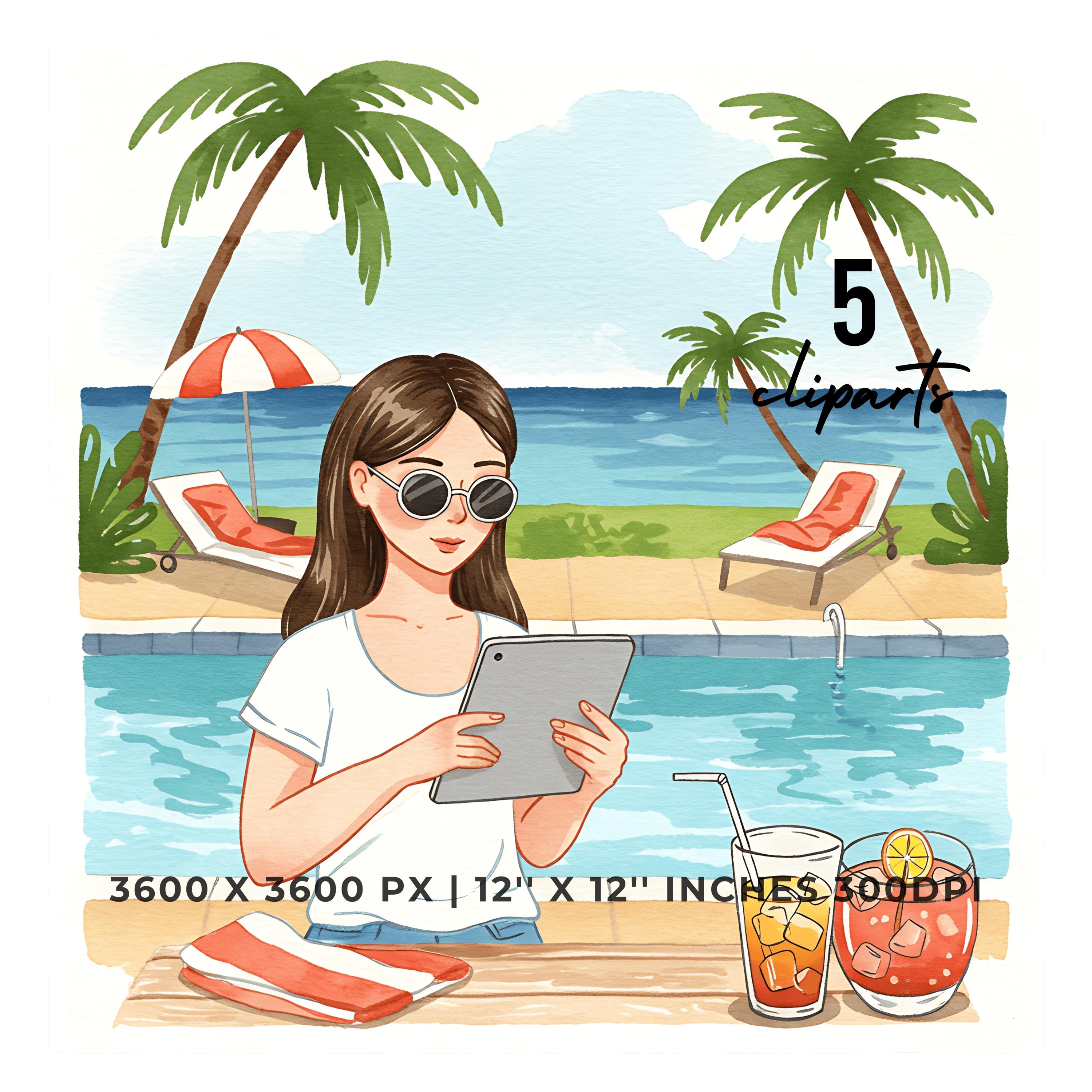 Personal Assistant at Pool Checking Emails png jpg Clipart Set | 5 PNG & 5 JPG | Sublimation Design | 12″x12″ 300DPI Graphic Commercial Use is an eye-catching, high-resolution digital asset designed for creators, crafters, teachers, and small business owners looking to elevate their visuals.