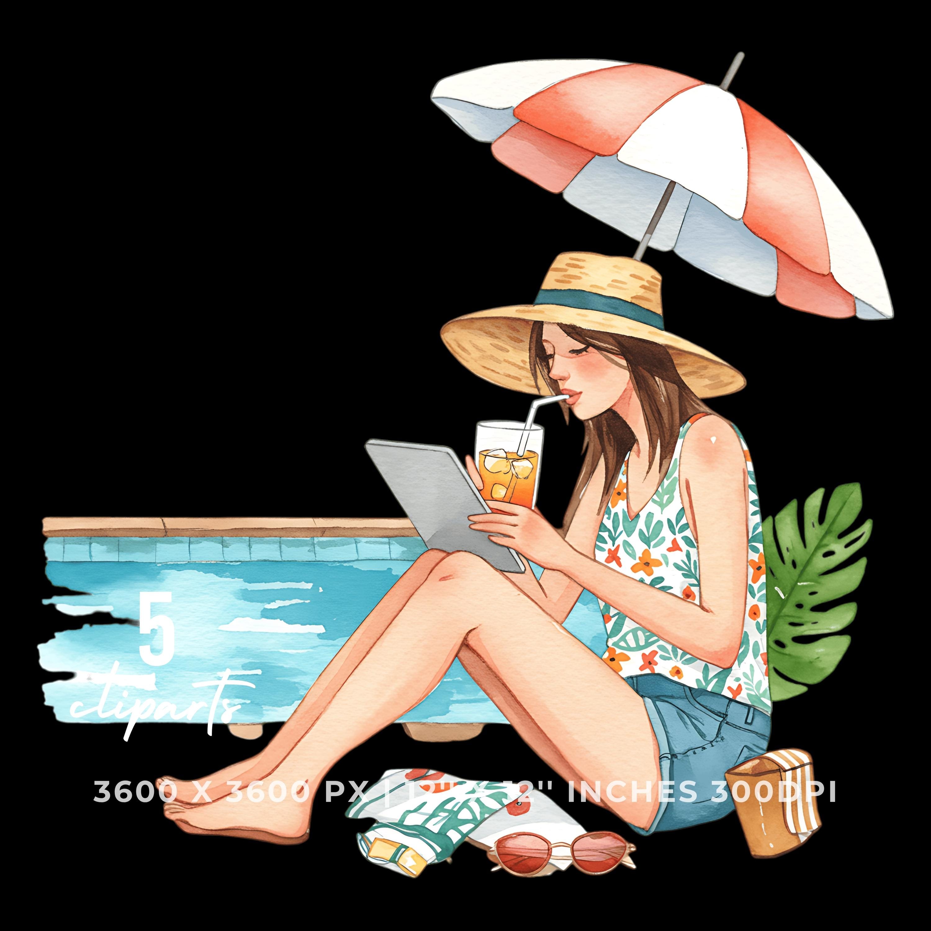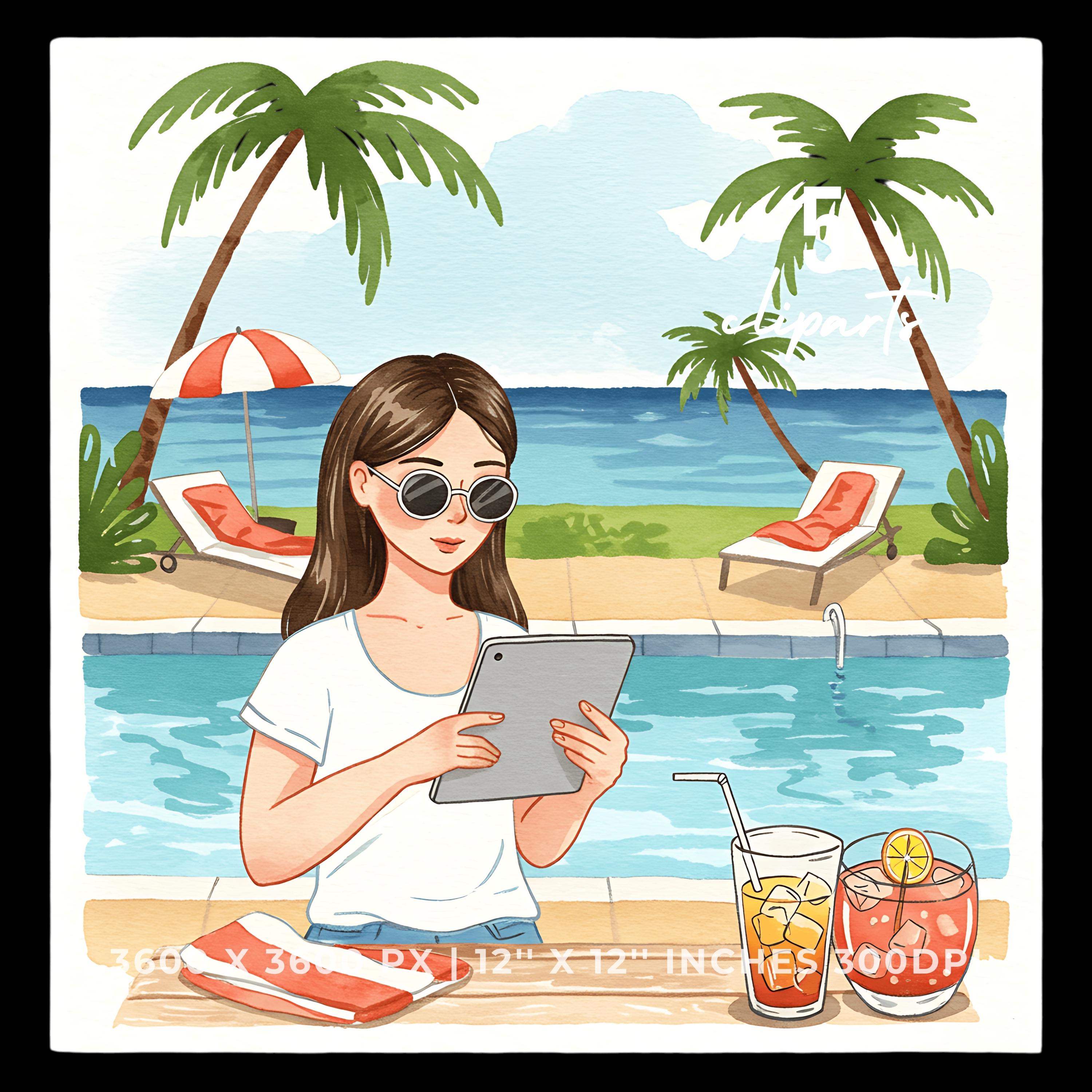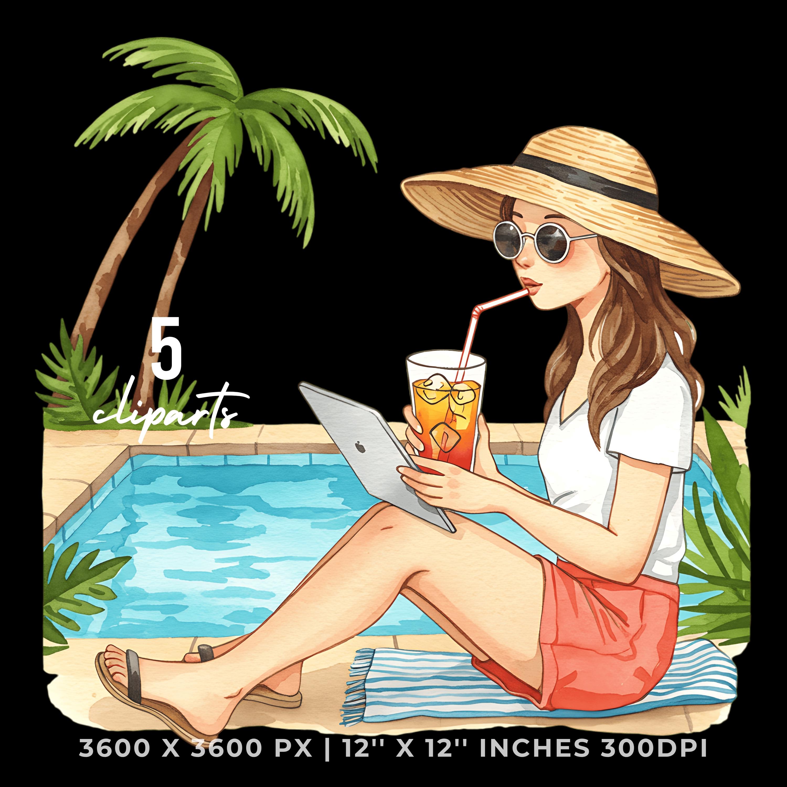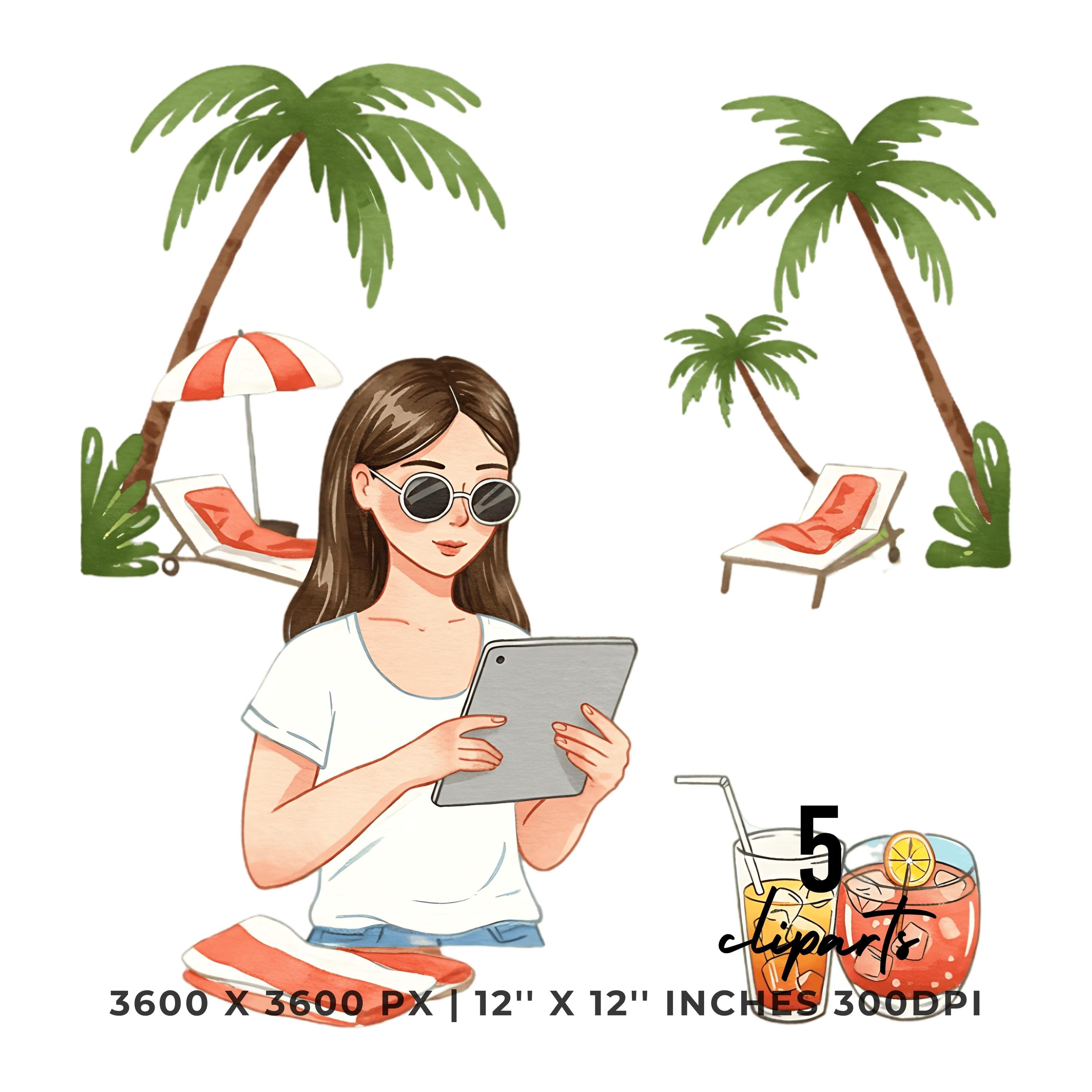 Personal Assistant at Pool Checking Emails png jpg Clipart Set | 5 PNG & 5 JPG | Sublimation Design | 12″x12″ 300DPI Graphic Commercial Use is an eye-catching, high-resolution digital asset designed for creators, crafters, teachers, and small business owners looking to elevate their visuals.