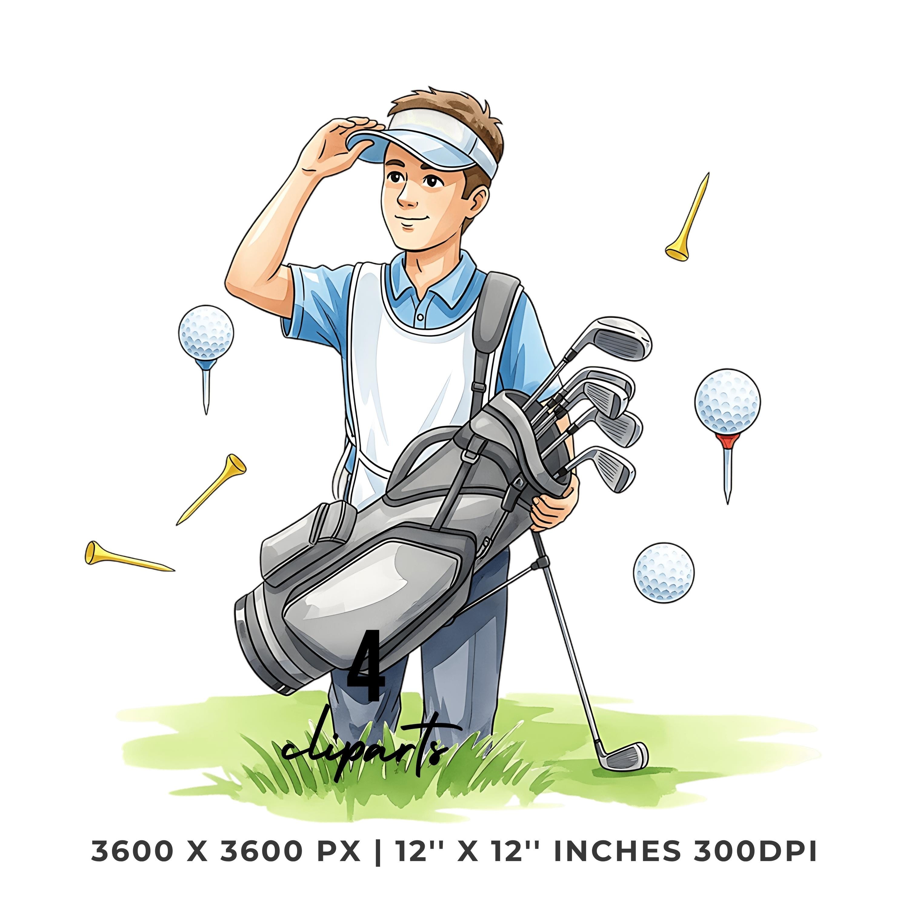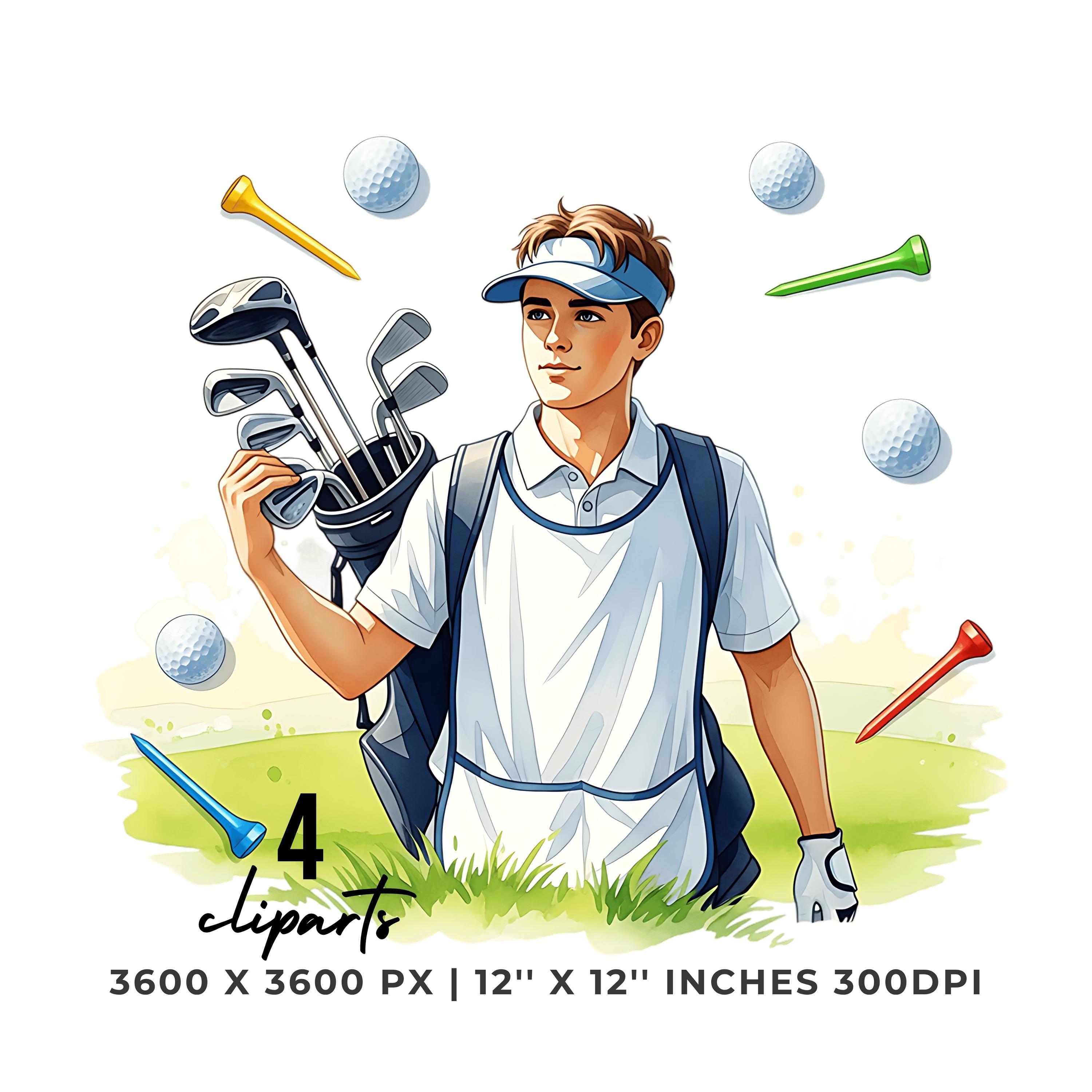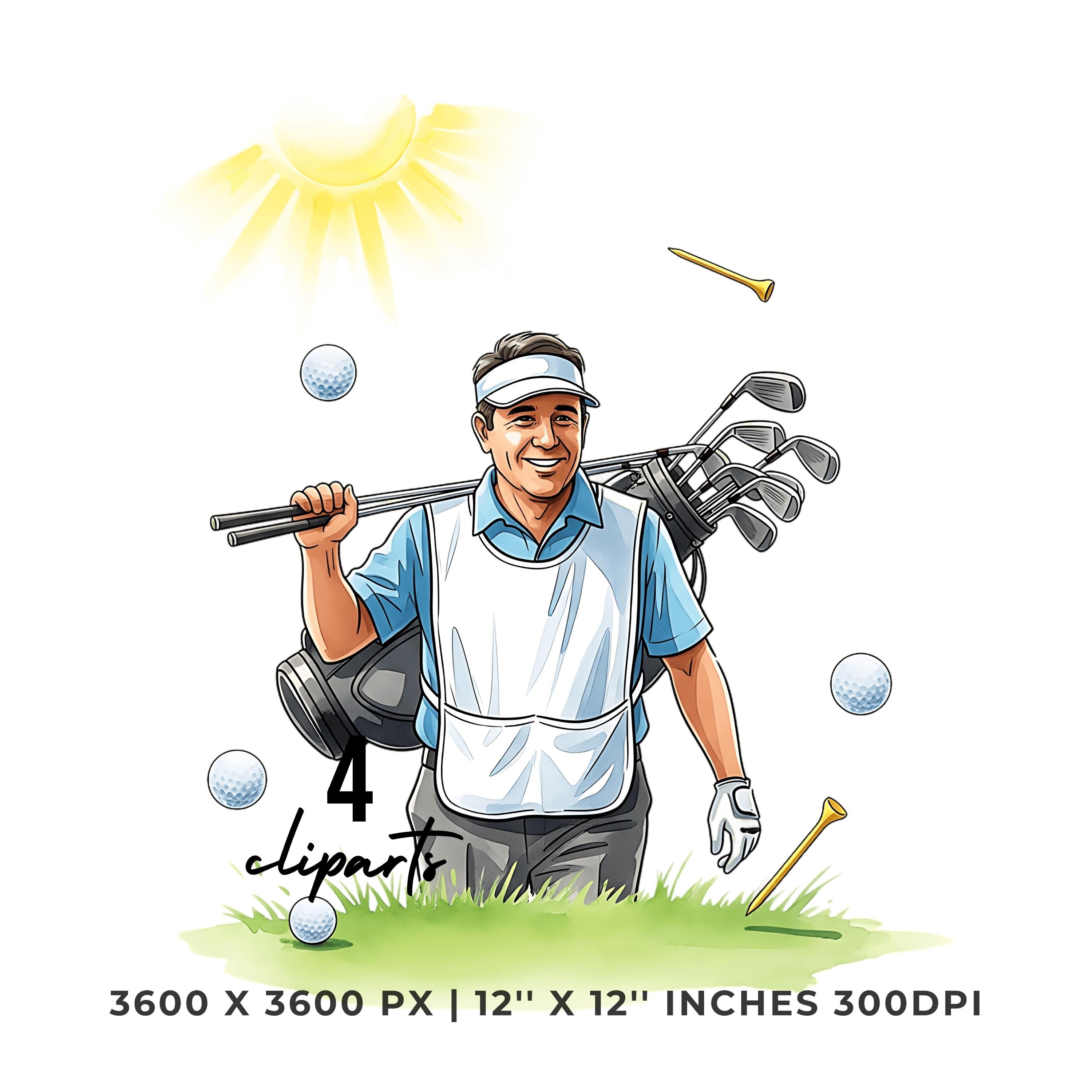 Playing Golf PNG Clipart | Watercolor Golf Caddy carrying clubs across a sunny course | Summer at Golf 4 PNG – 4 JPG Graphic Commercial Use is an eye-catching, high-resolution digital asset designed for creators, crafters, teachers, and small business owners looking to elevate their visuals.