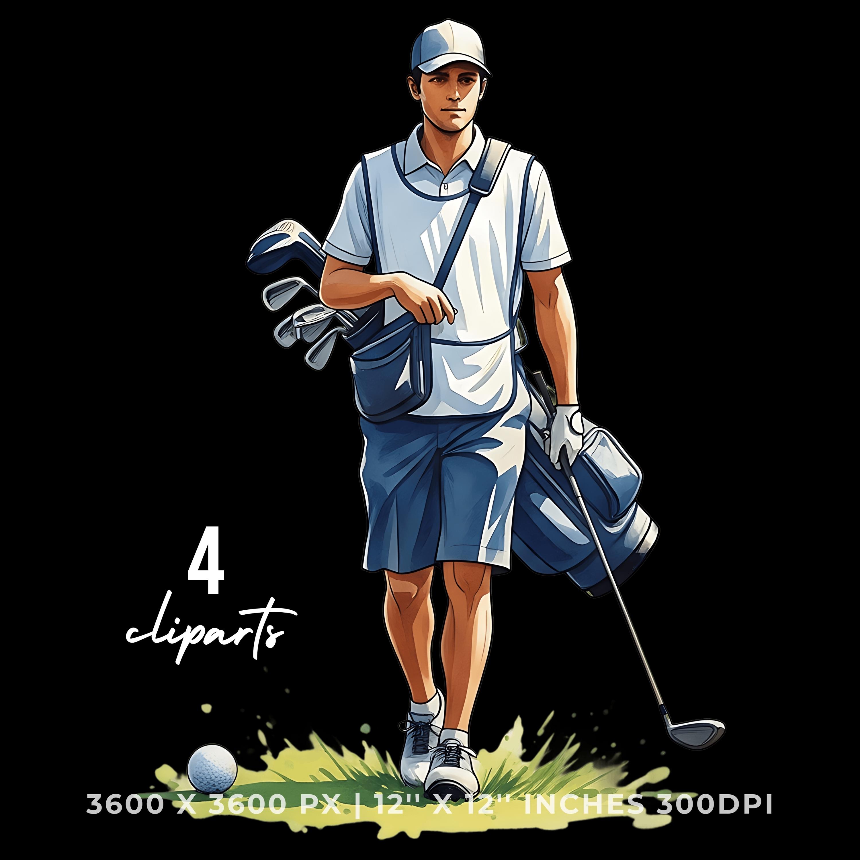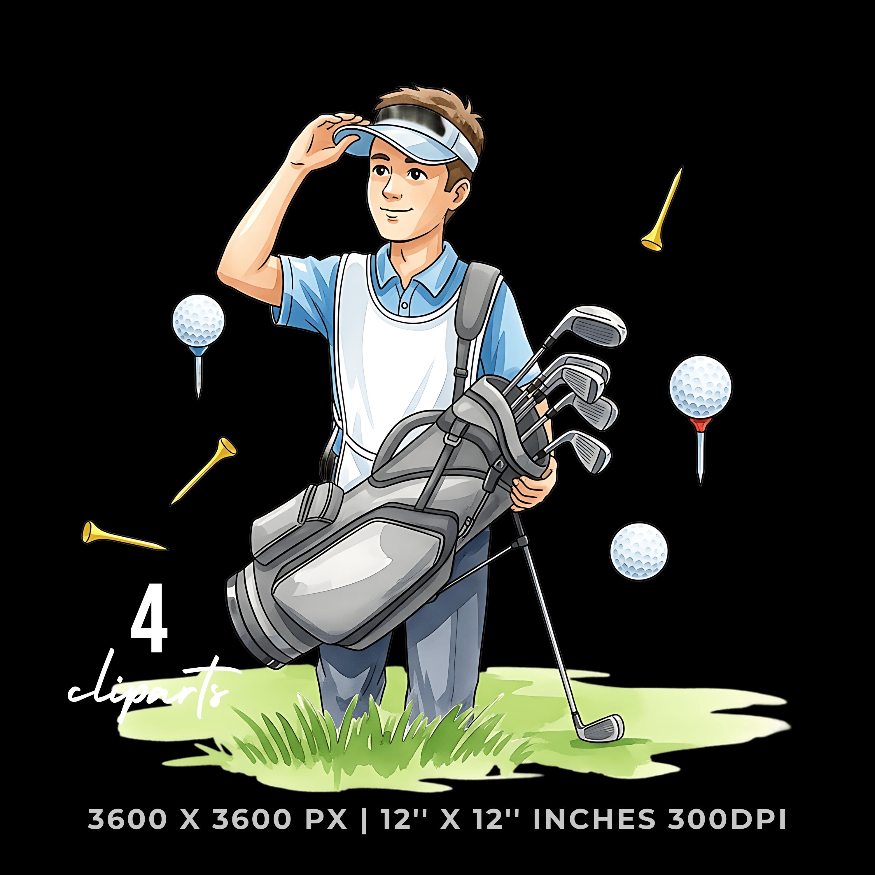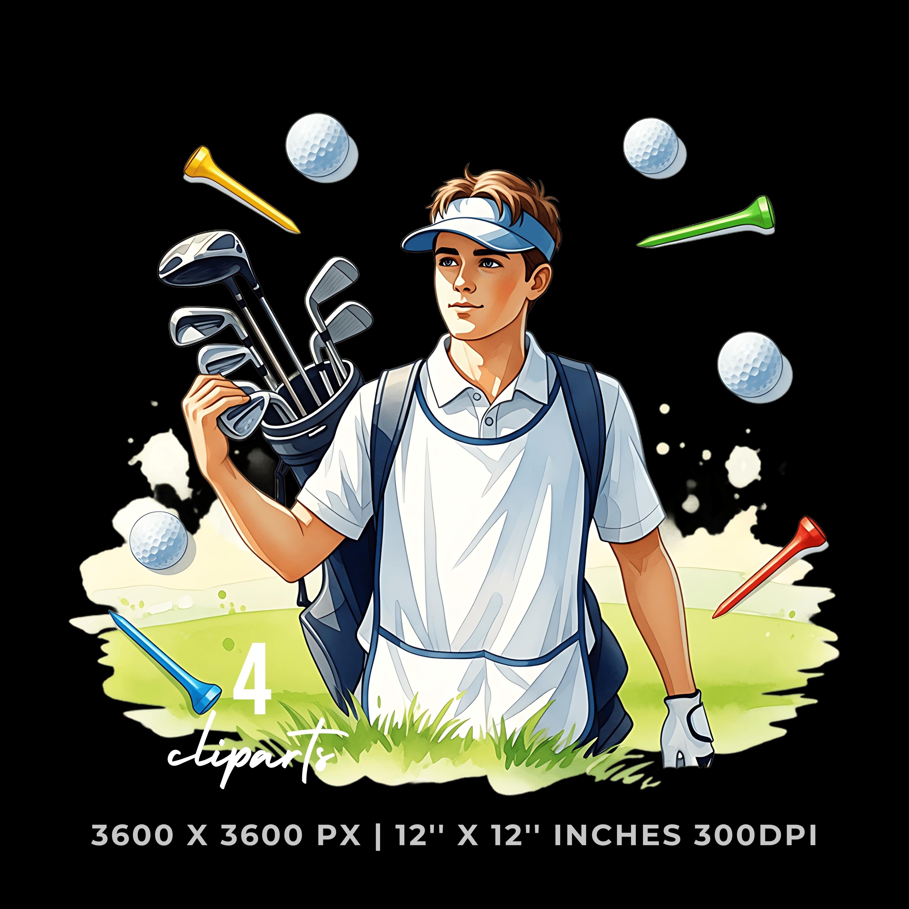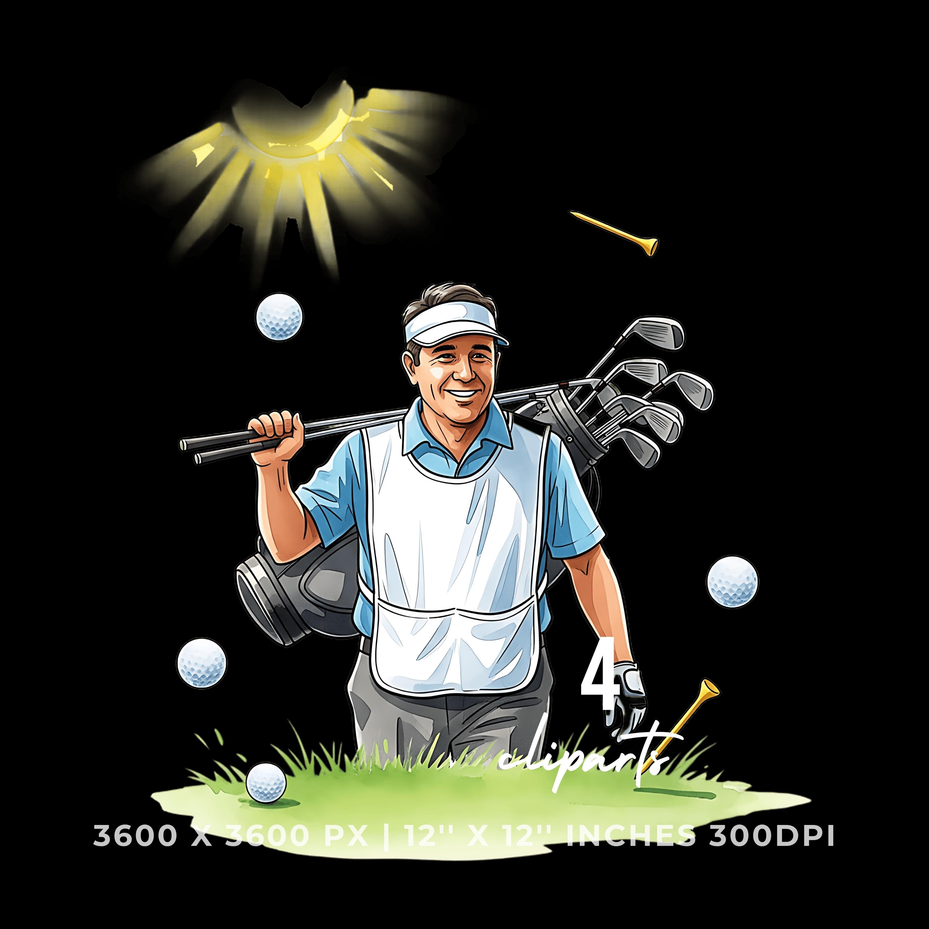 Playing Golf PNG Clipart | Watercolor Golf Caddy carrying clubs across a sunny course | Summer at Golf 4 PNG – 4 JPG Graphic Commercial Use is an eye-catching, high-resolution digital asset designed for creators, crafters, teachers, and small business owners looking to elevate their visuals.
