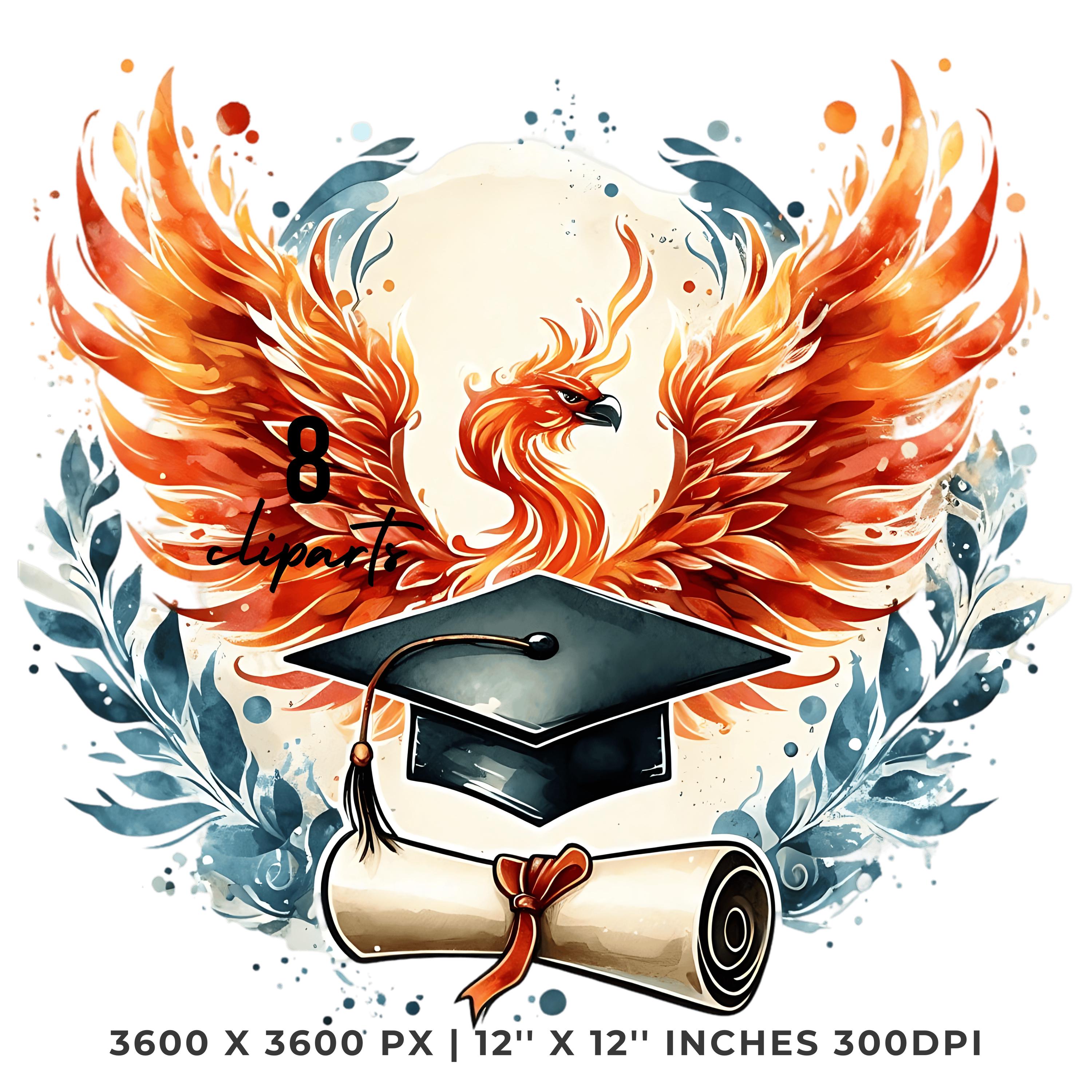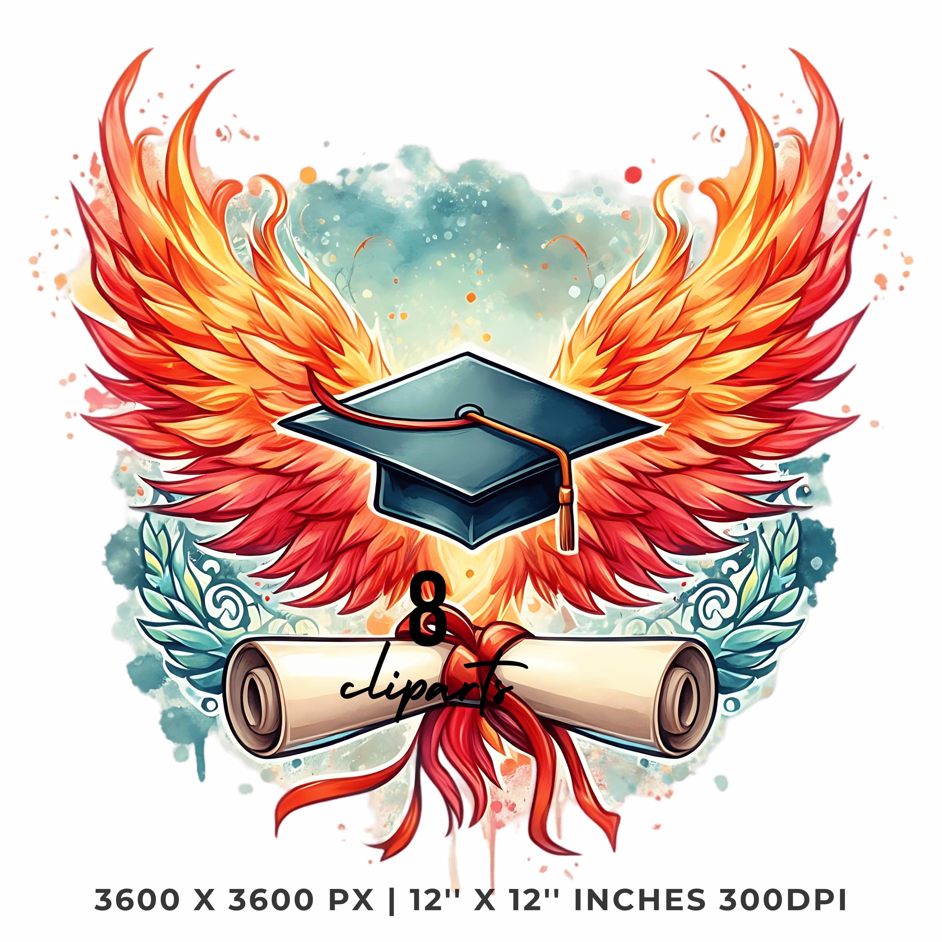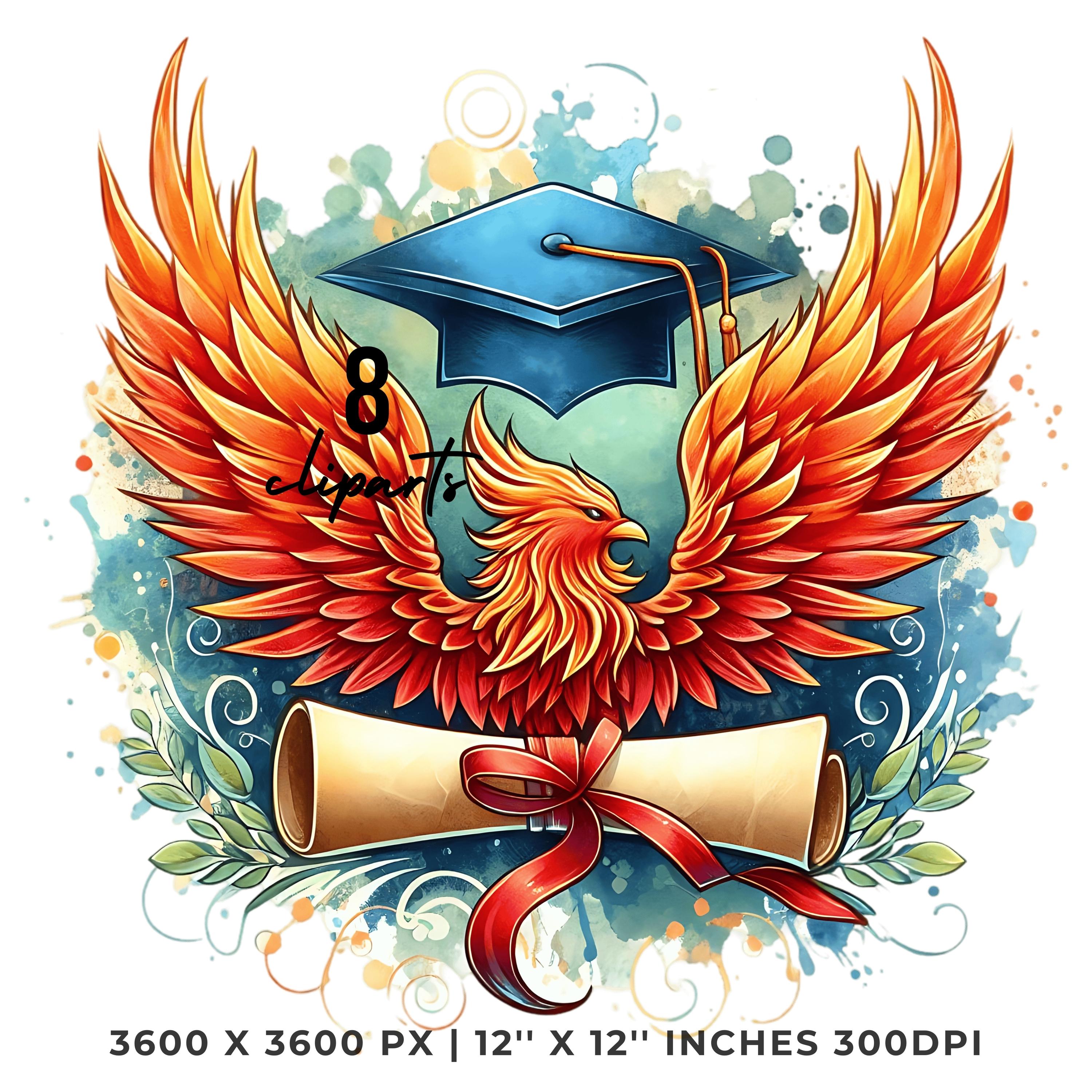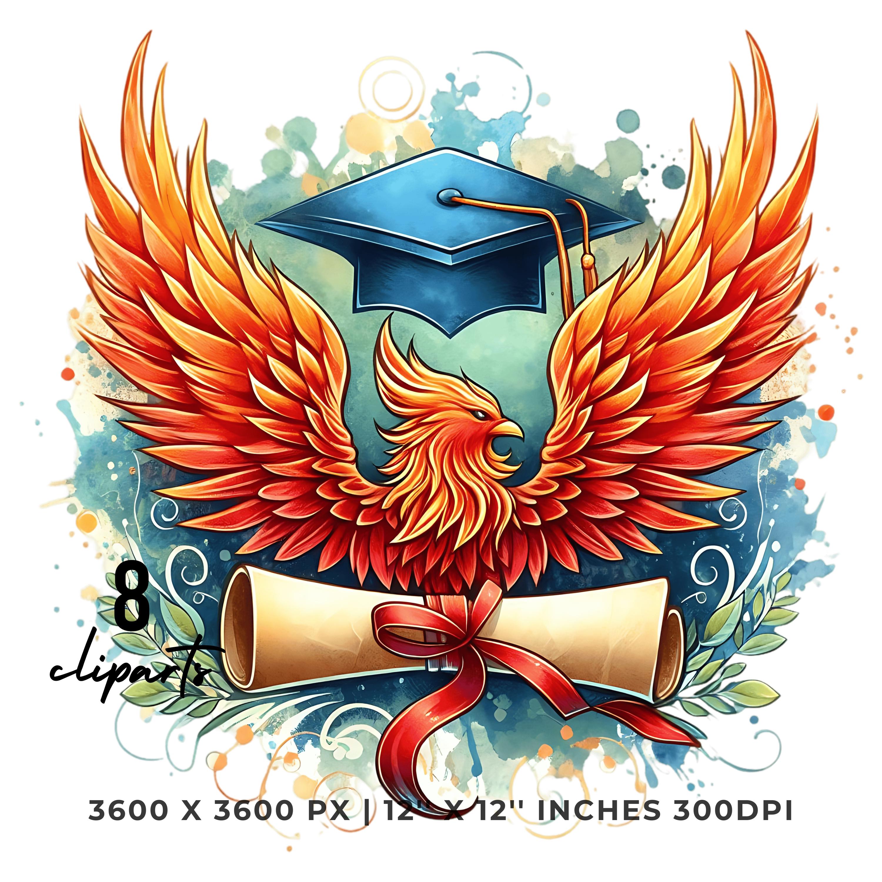 Proud Graduate | Fiery phoenix wings symbolizing freedom, growth, and transformation flying over a diploma scroll | 8 PNG-JPG Commercial Use is an eye-catching, high-resolution digital asset designed for creators, crafters, teachers, and small business owners looking to elevate their visuals.
