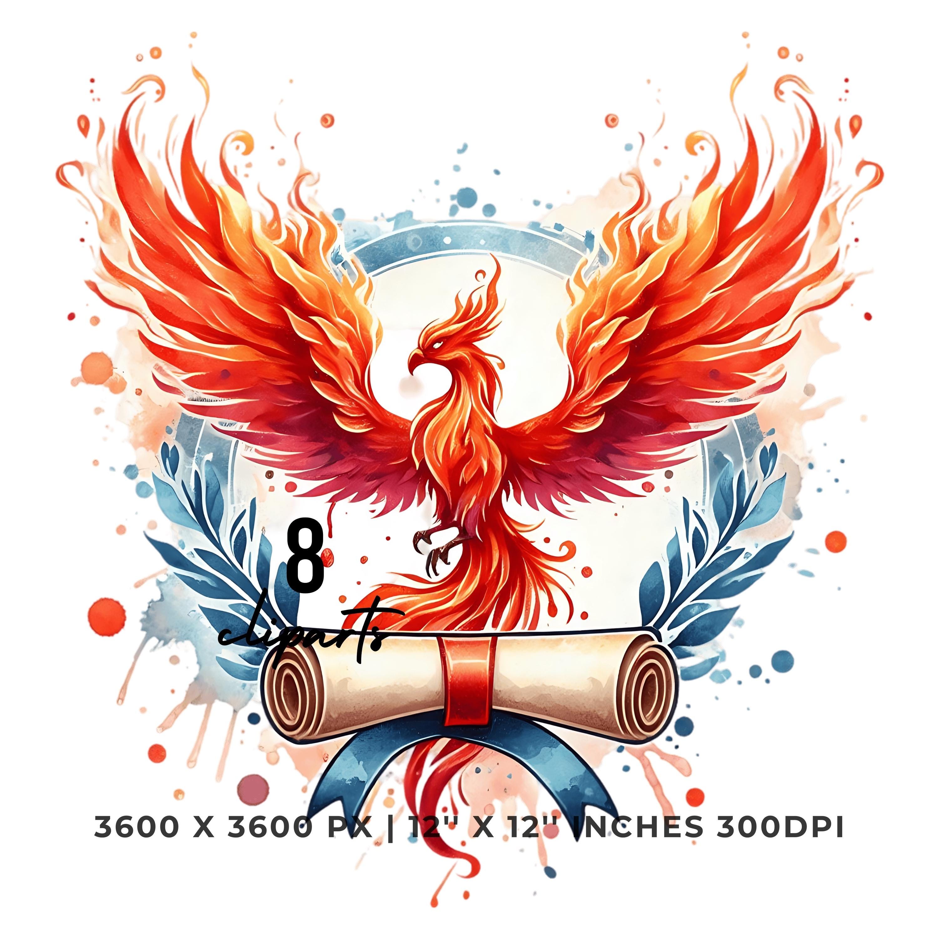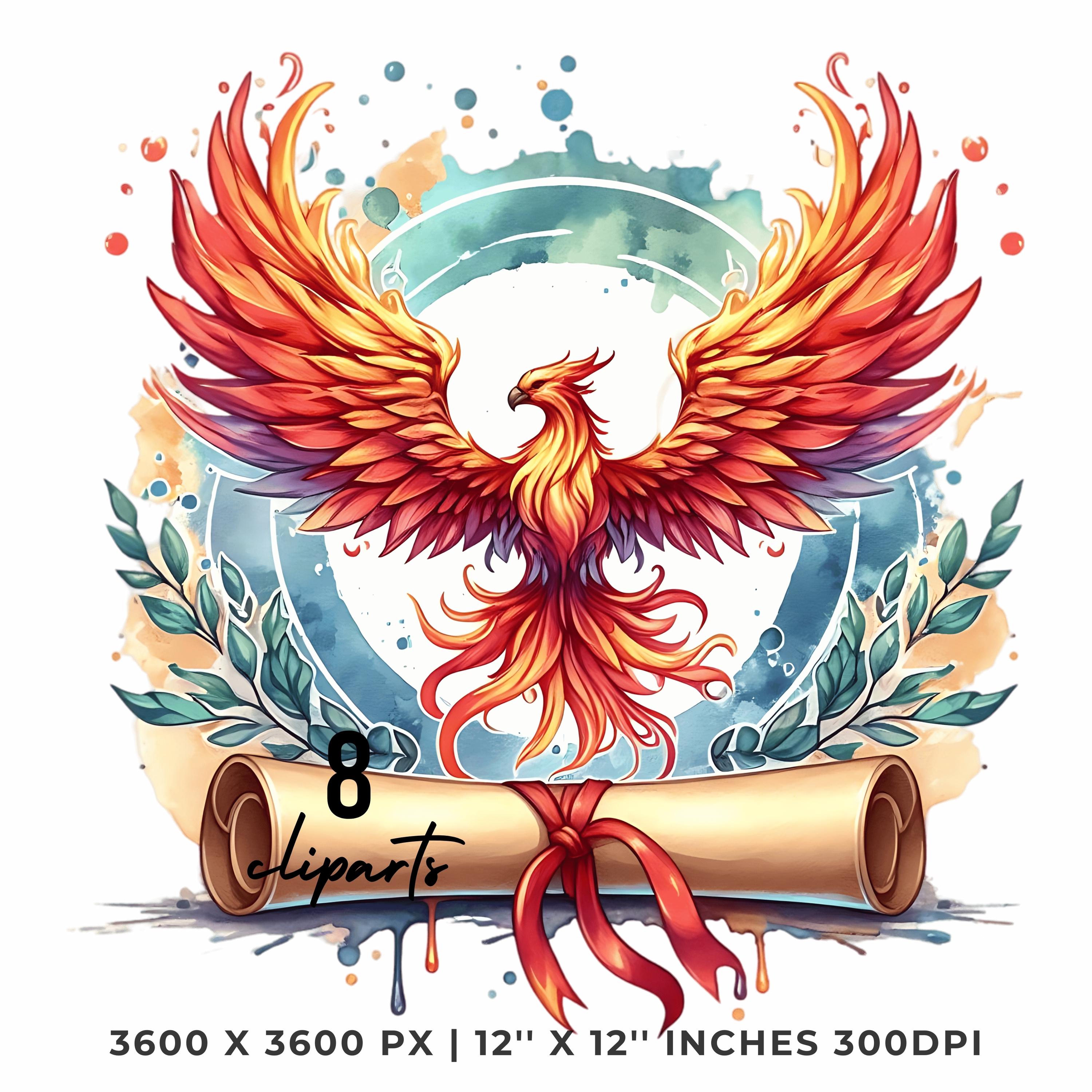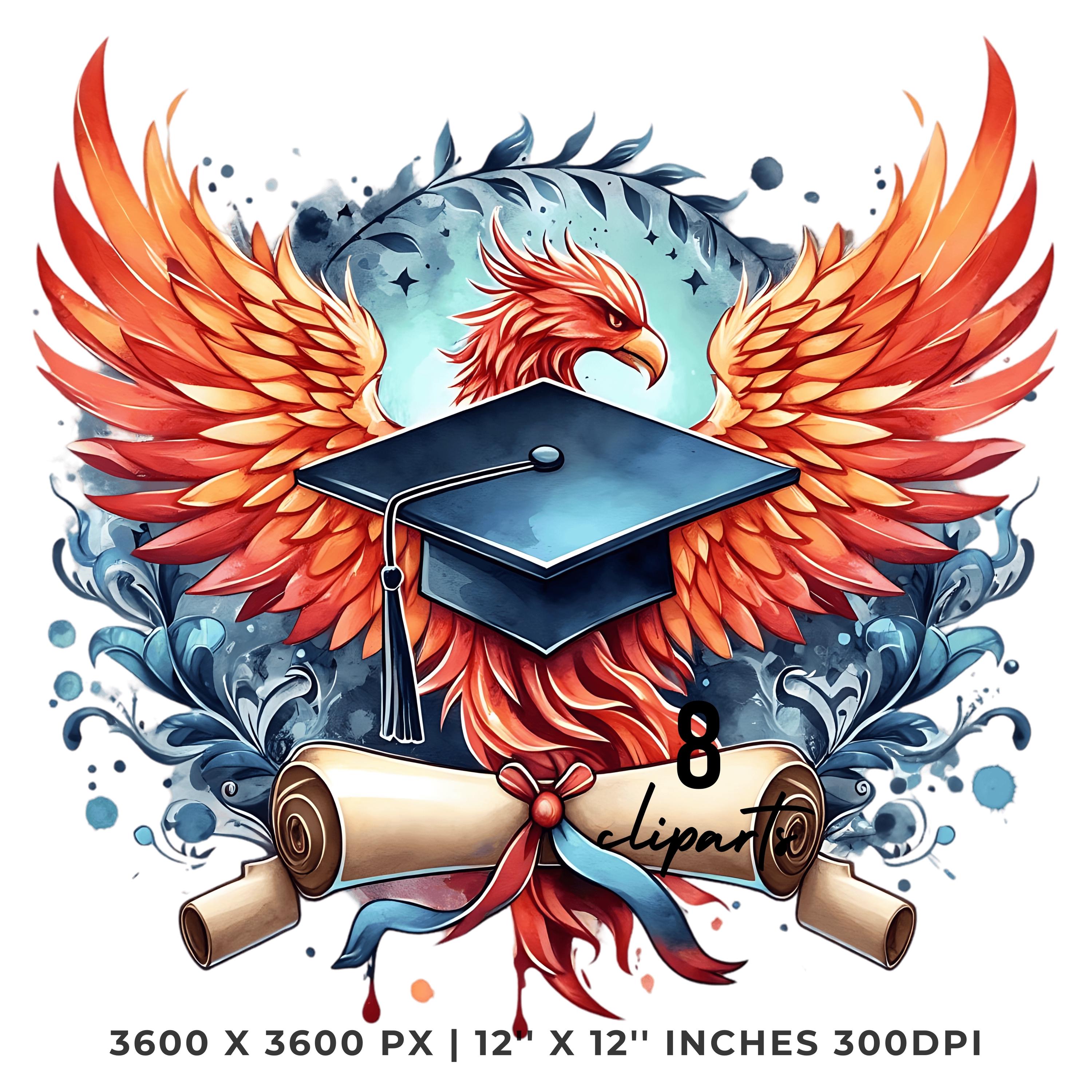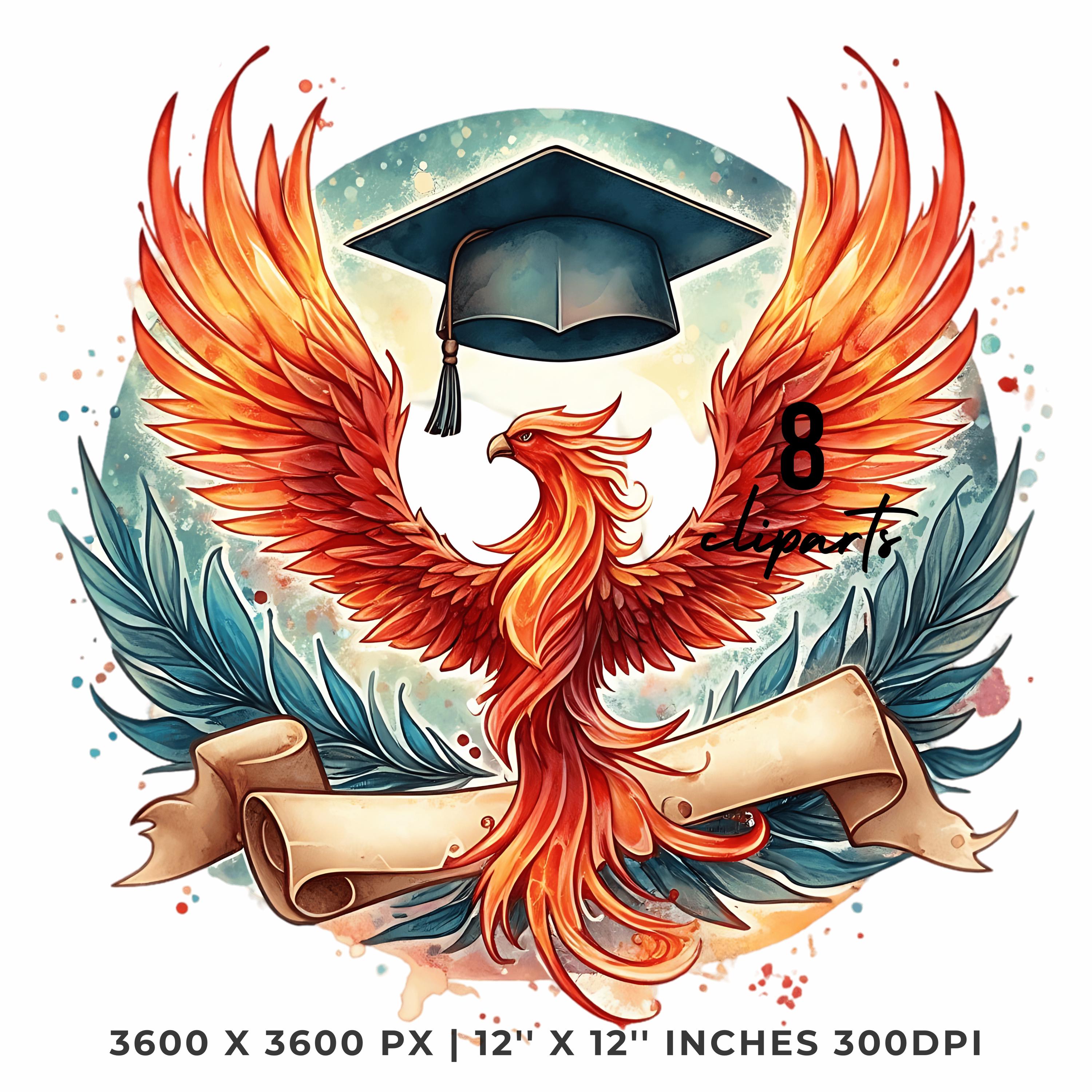 Proud Graduate | Fiery phoenix wings symbolizing freedom, growth, and transformation flying over a diploma scroll | 8 PNG-JPG Commercial Use is an eye-catching, high-resolution digital asset designed for creators, crafters, teachers, and small business owners looking to elevate their visuals.