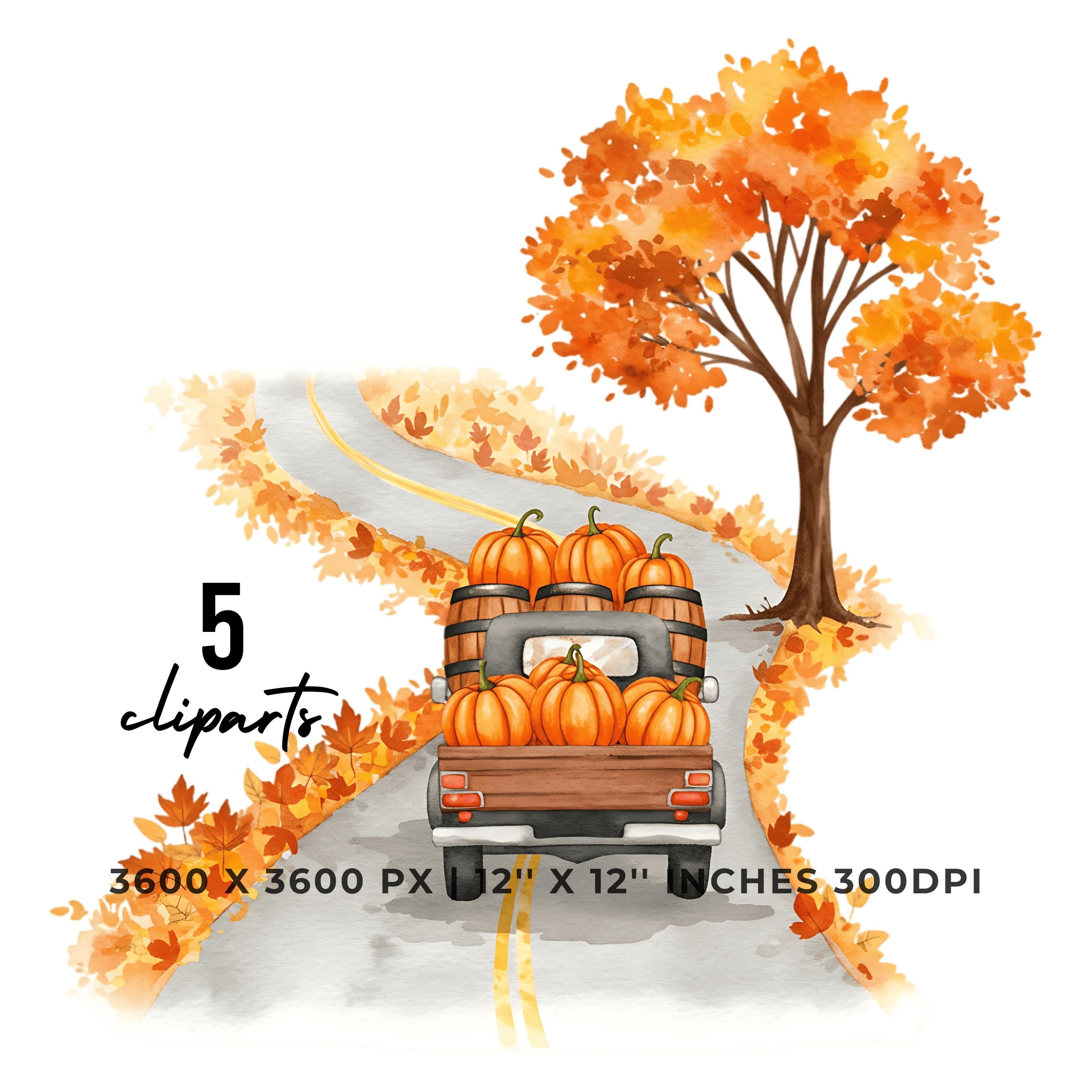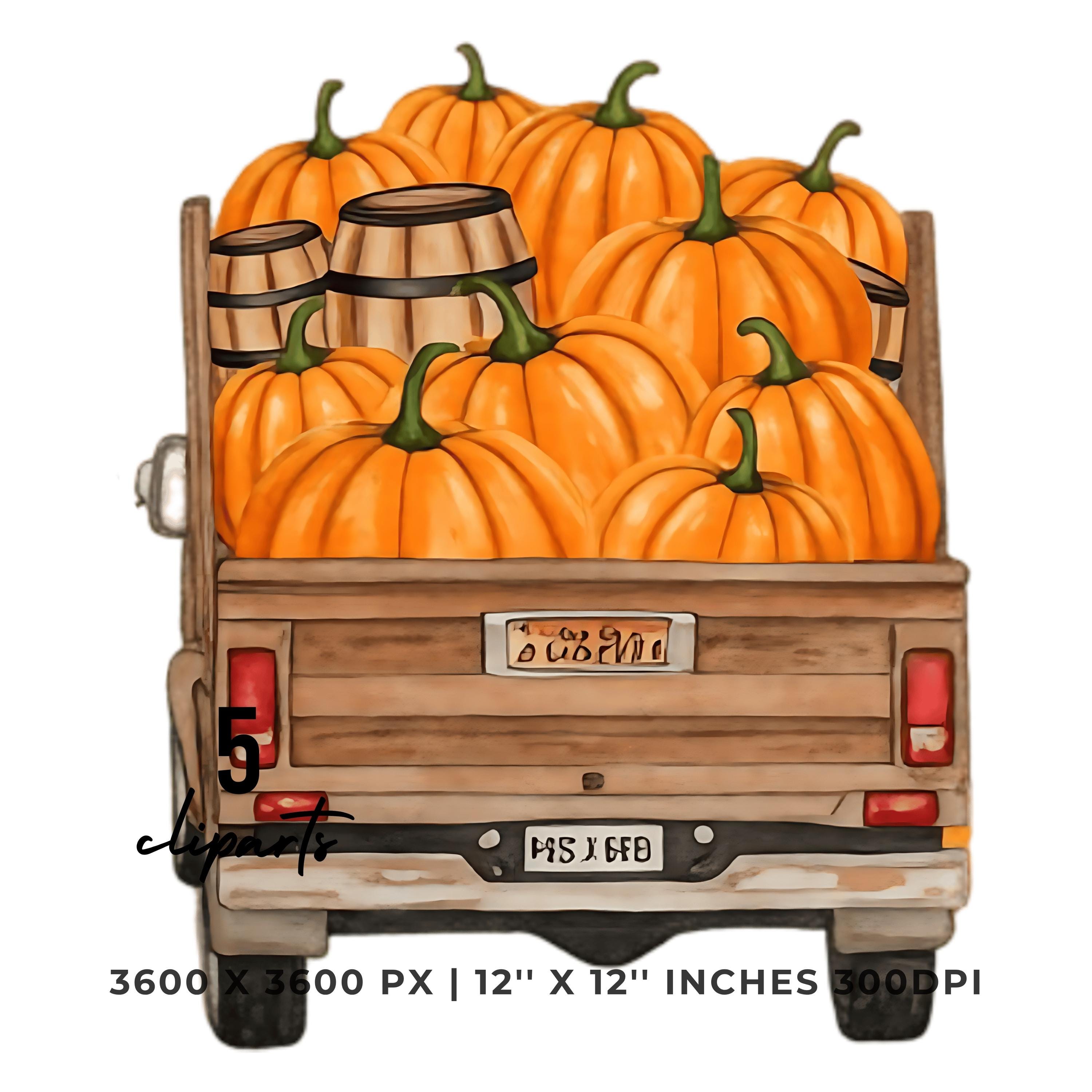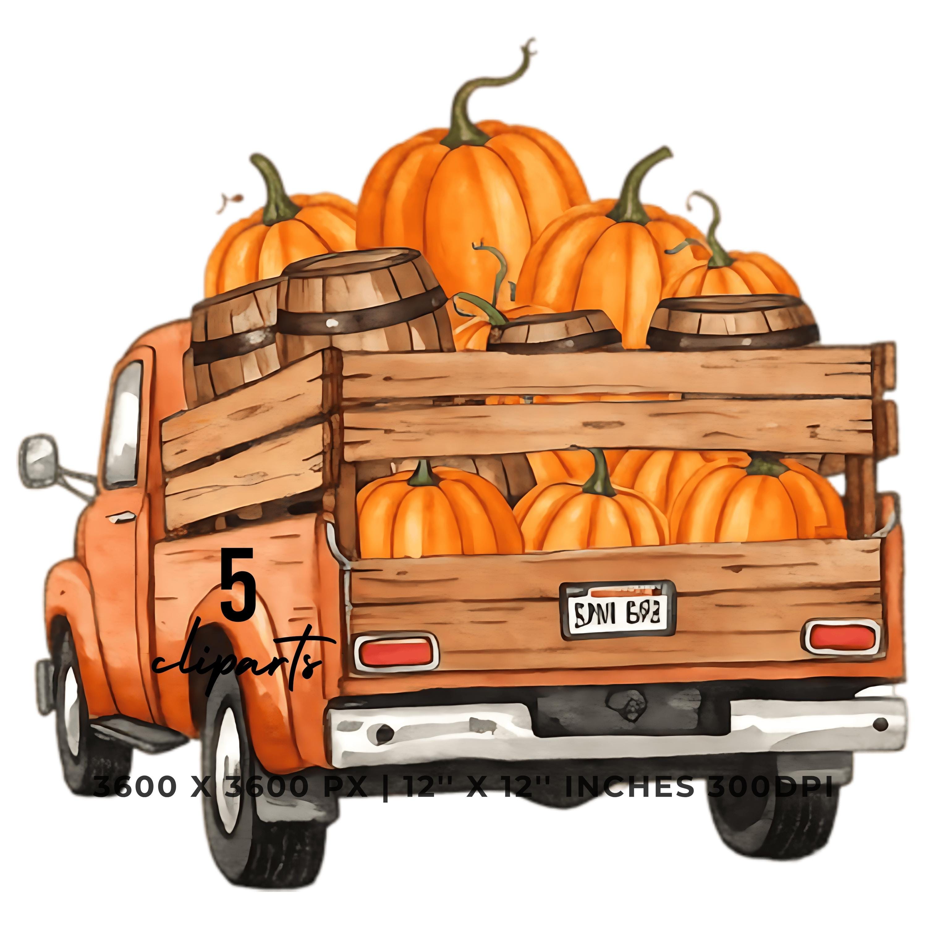 Pumpkin Truck Clipart Bundle | Autumn Cider Delivery PNG & JPG | Fall Harvest Barrel Truck Art | 5 Cliparts | 12″x12″ 300DPI Clipart Bundle | 12″x12″ 300 DPI | 5 JPG – 5 PNG Sublimation Commercial Use