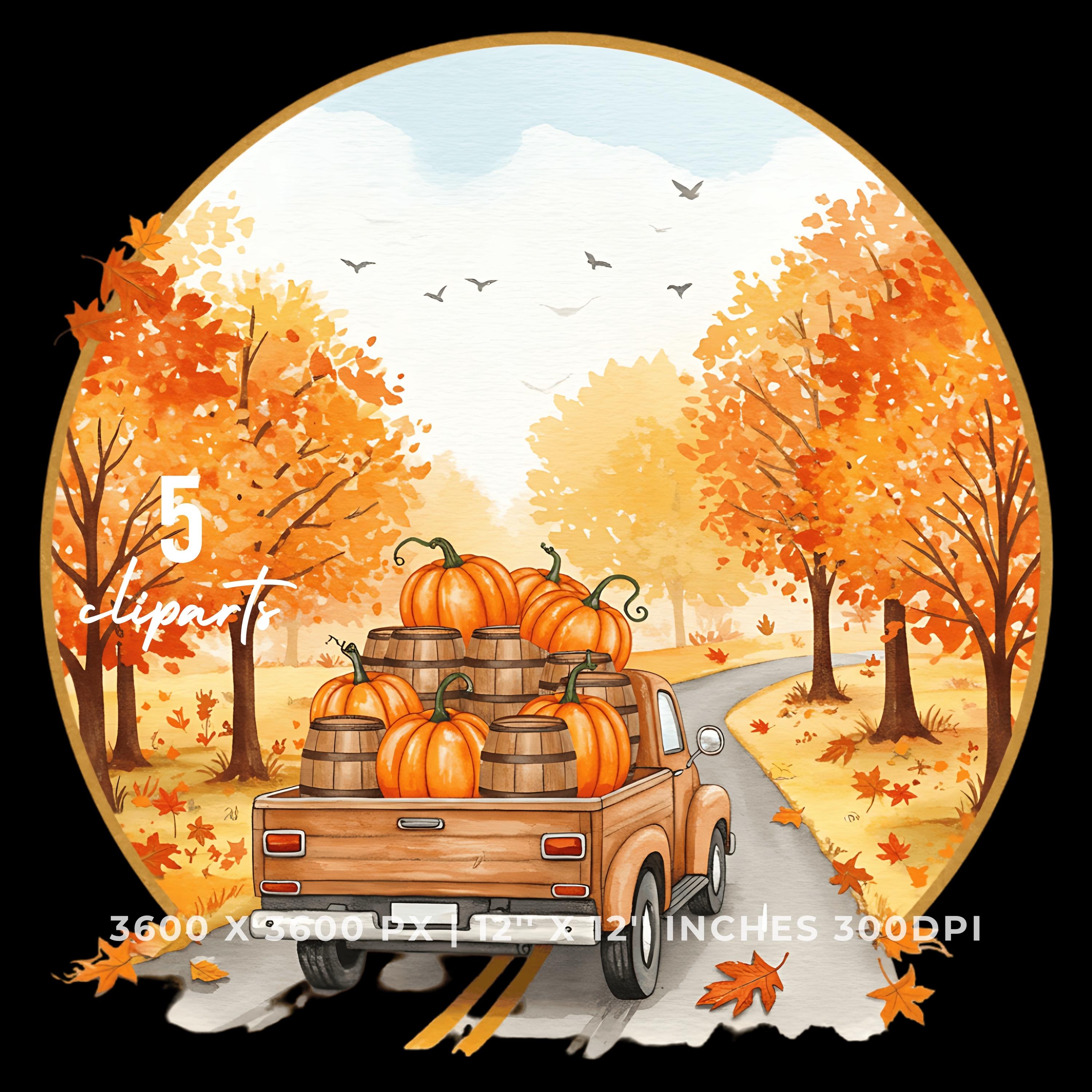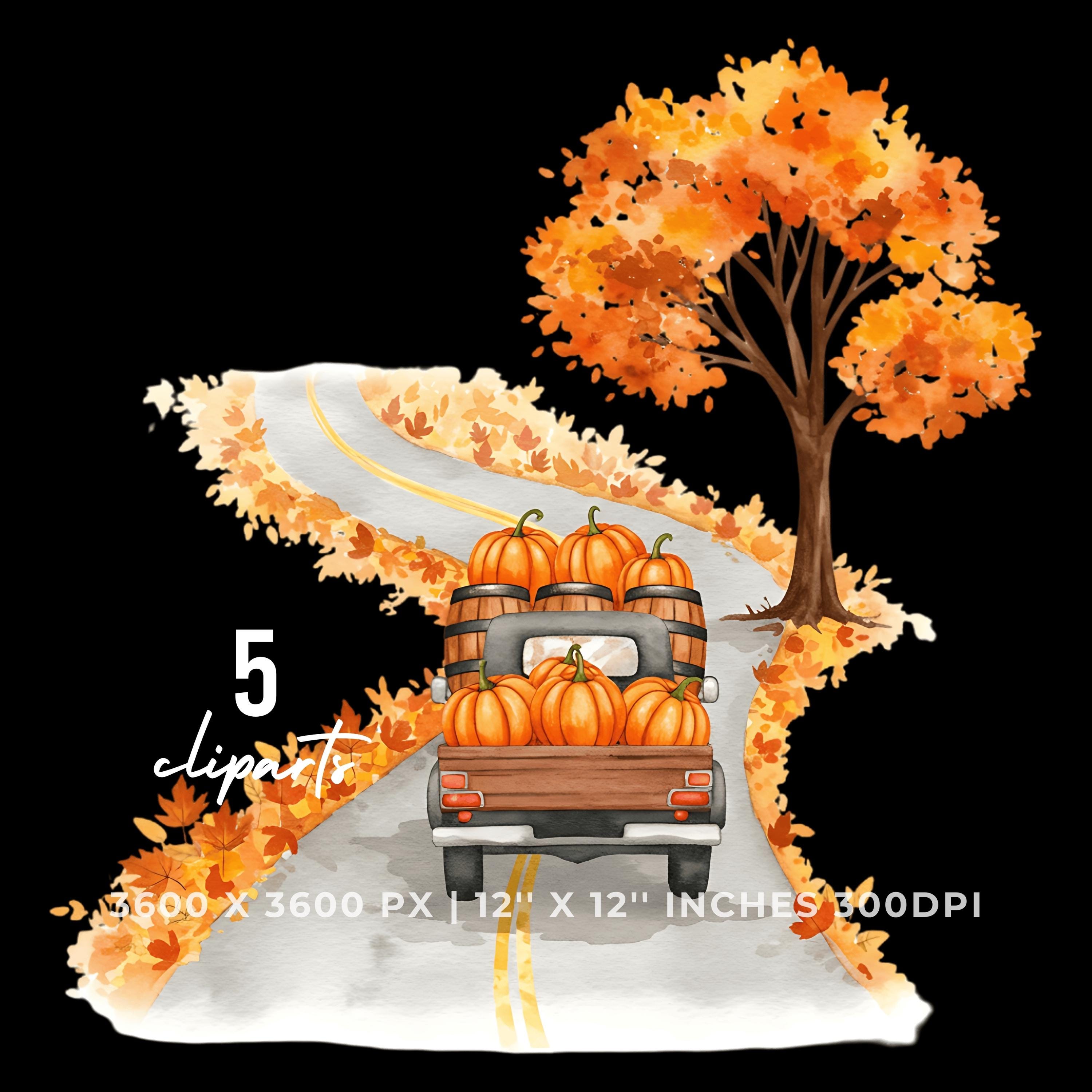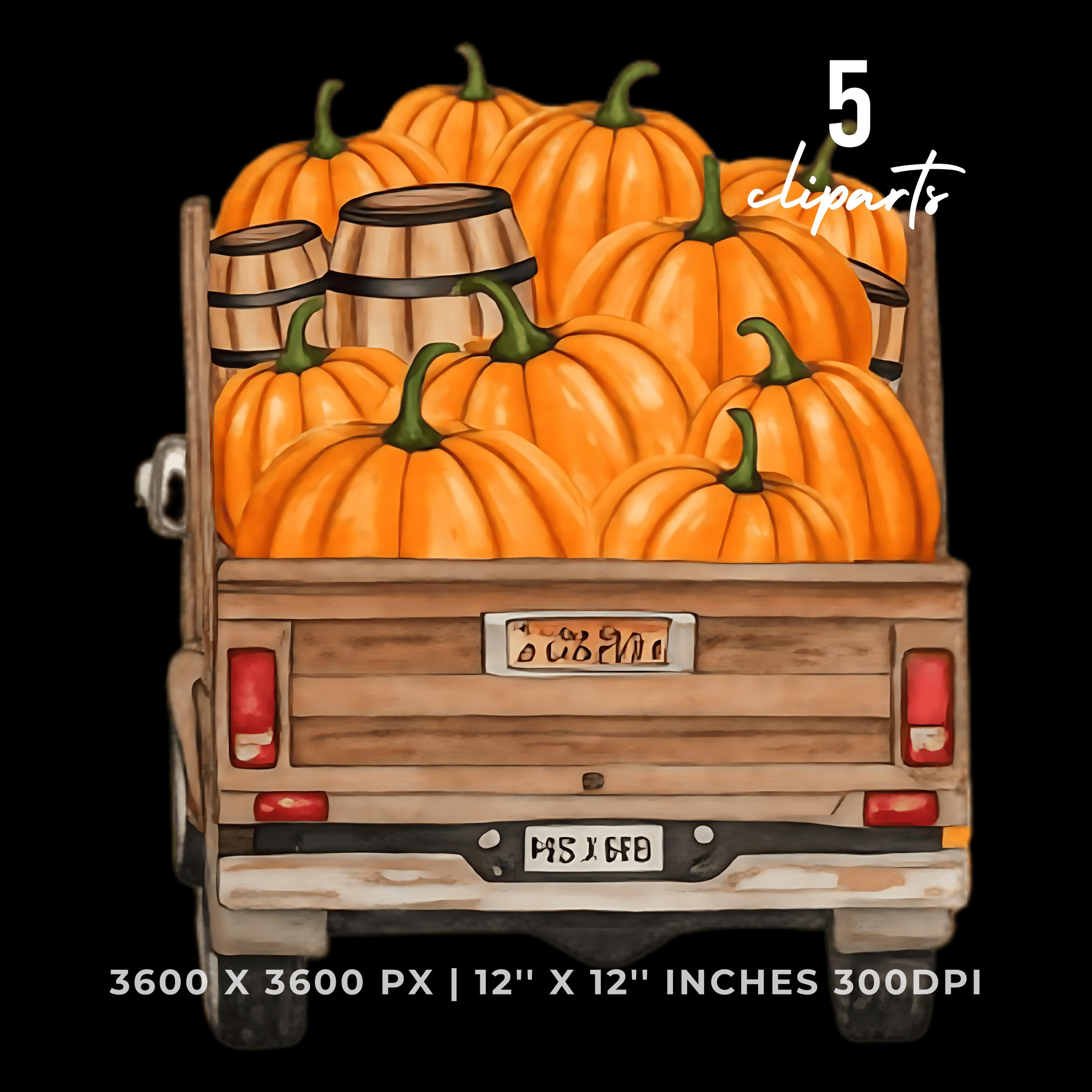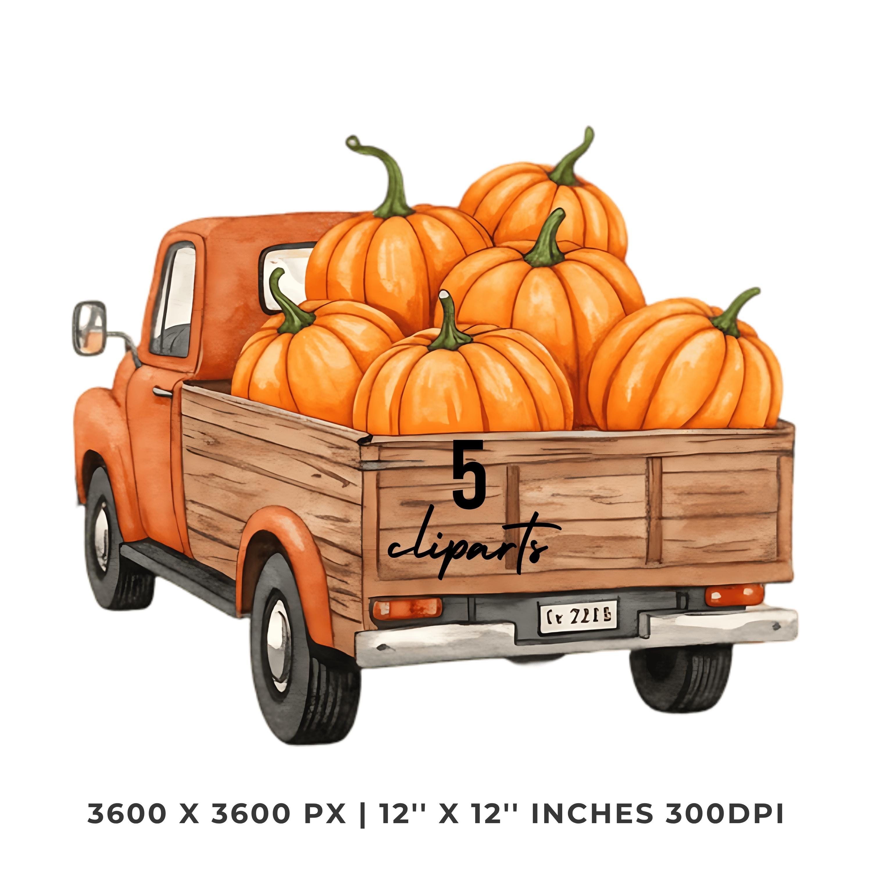 Pumpkin Truck Clipart Bundle | Autumn Cider Delivery PNG & JPG | Fall Harvest Barrel Truck Art | 5 Cliparts | 12″x12″ 300DPI Clipart Bundle | 12″x12″ 300 DPI | 5 JPG – 5 PNG Sublimation Commercial Use