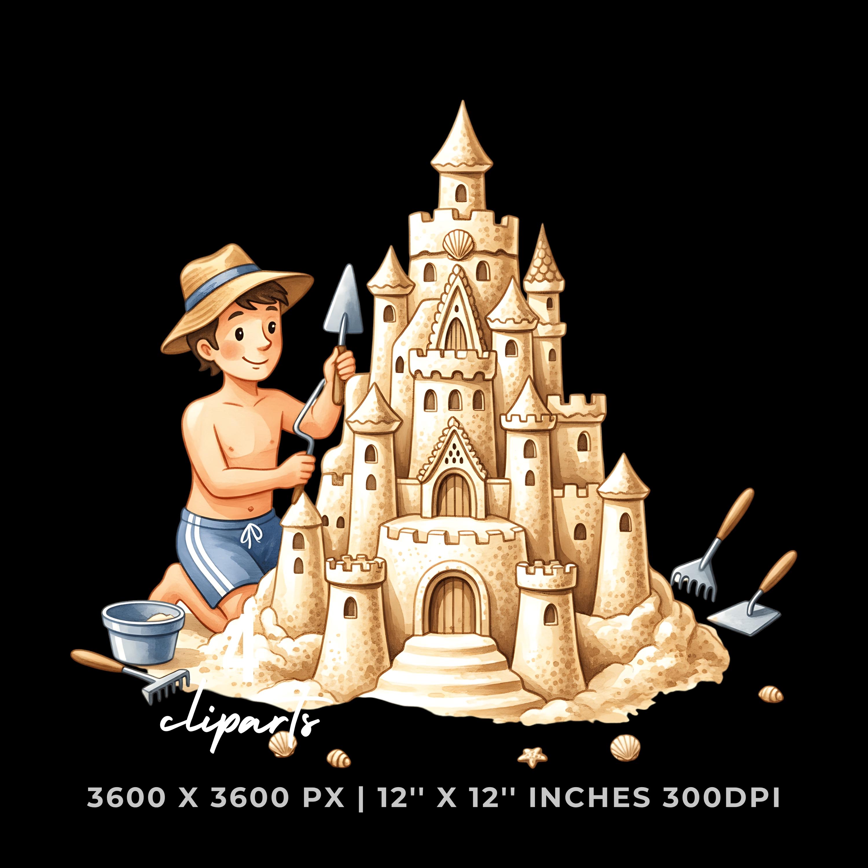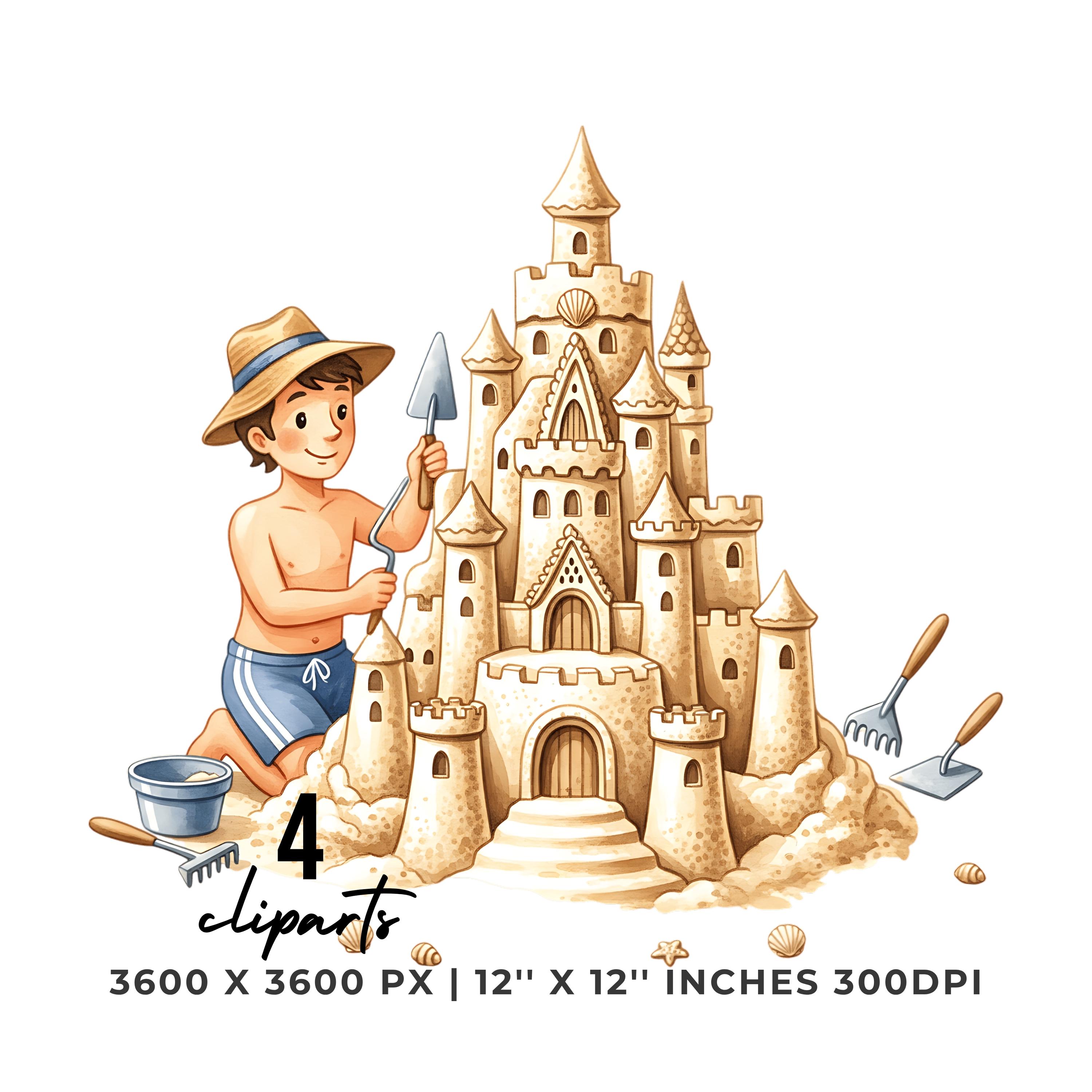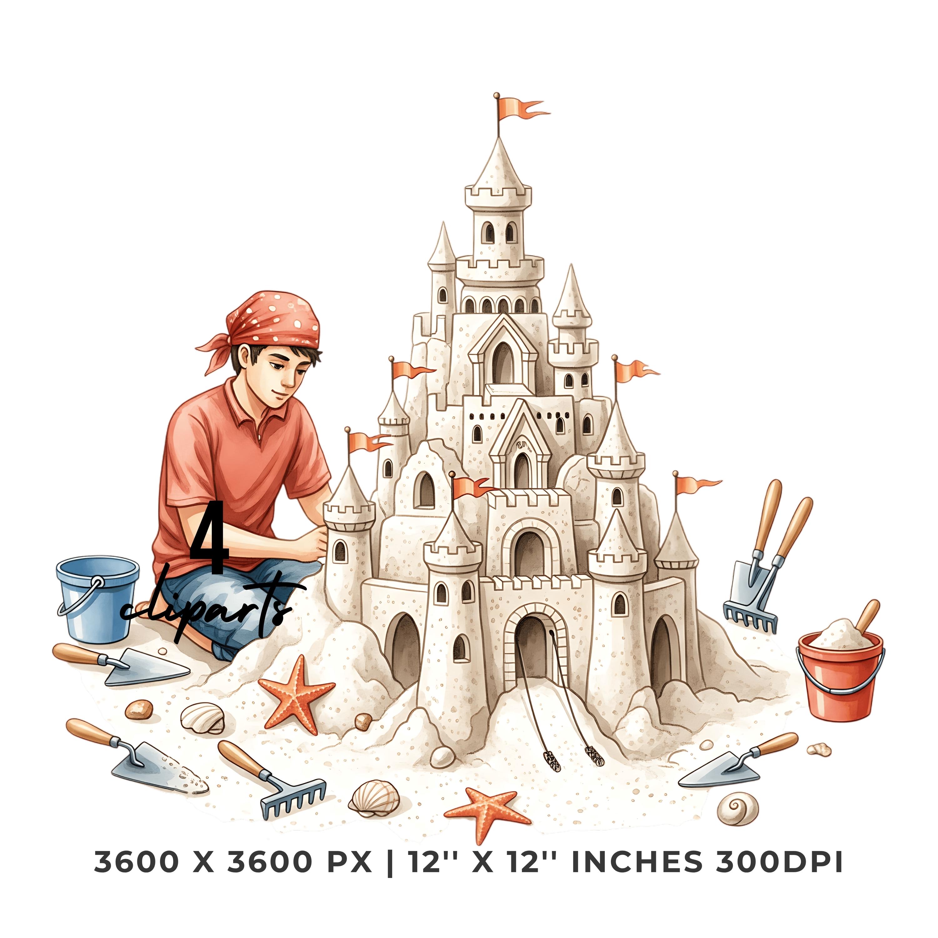 Sandcastle Builder Clipart Set | Summer Beach | Sand Art Clip Art | 4 PNG & 4 JPG | Digital Stickers | 12″x12″ 300DPI Graphic Commercial Use is an eye-catching, high-resolution digital asset designed for creators, crafters, teachers, and small business owners looking to elevate their visuals.