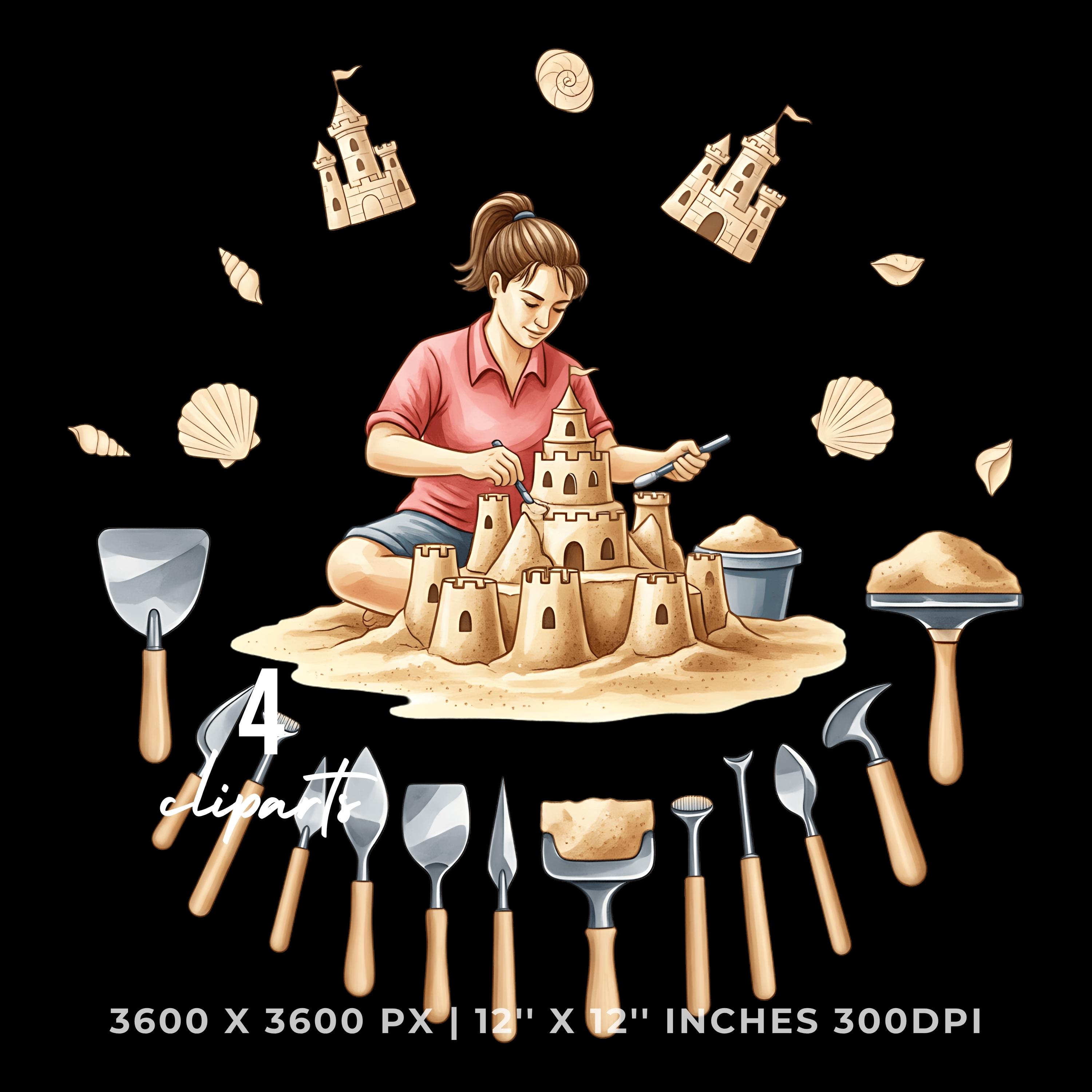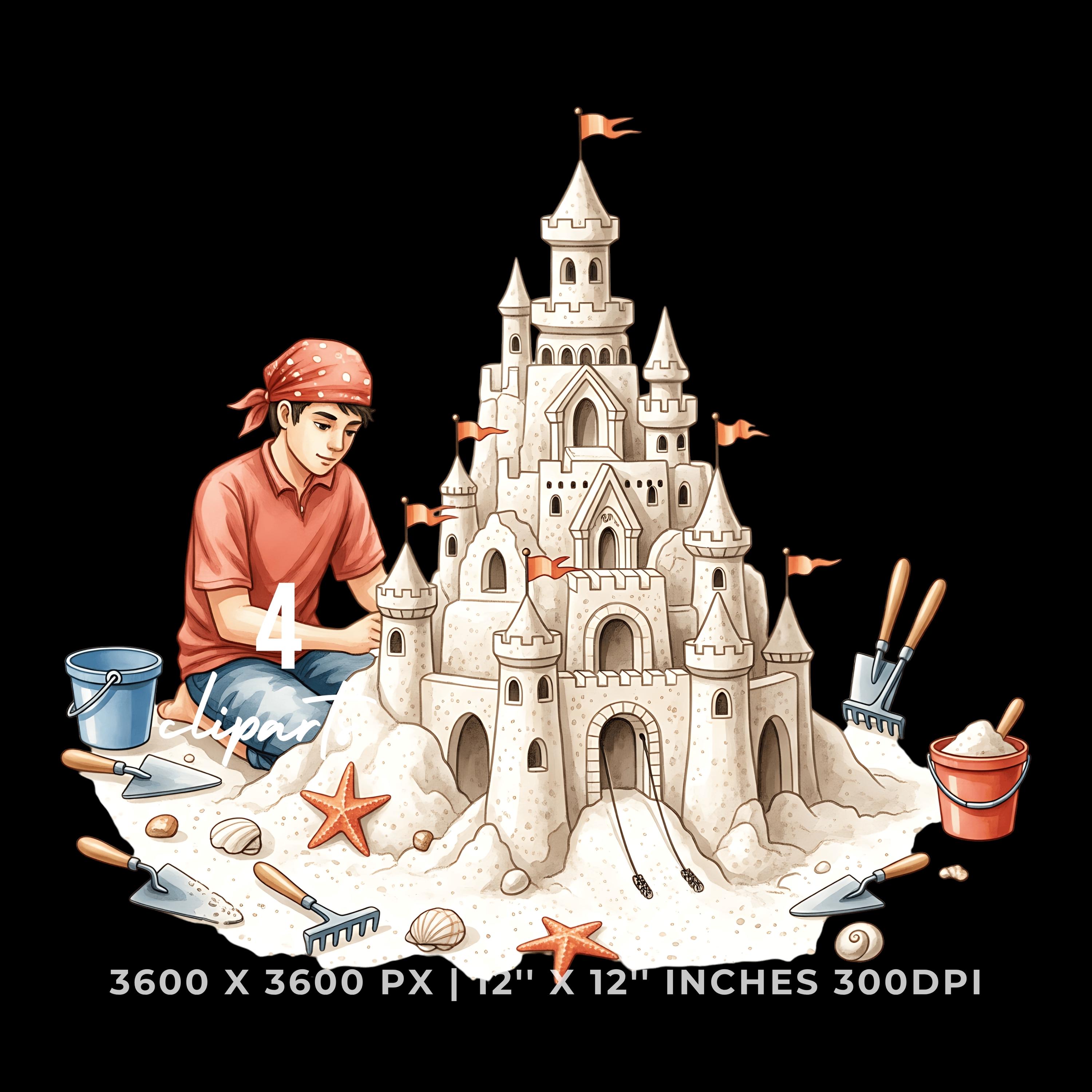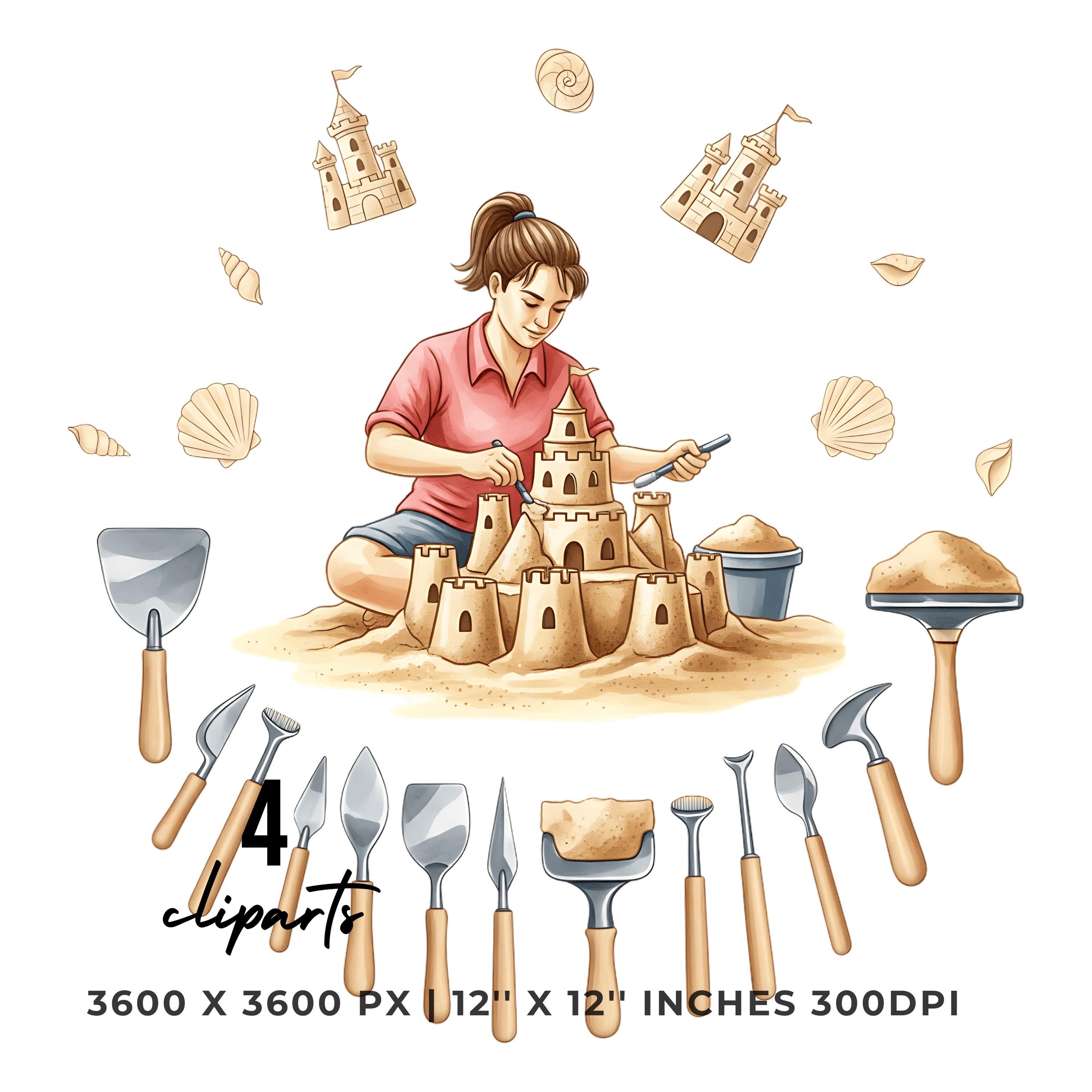 Sandcastle Builder Clipart Set | Summer Beach | Sand Art Clip Art | 4 PNG & 4 JPG | Digital Stickers | 12″x12″ 300DPI Graphic Commercial Use is an eye-catching, high-resolution digital asset designed for creators, crafters, teachers, and small business owners looking to elevate their visuals.