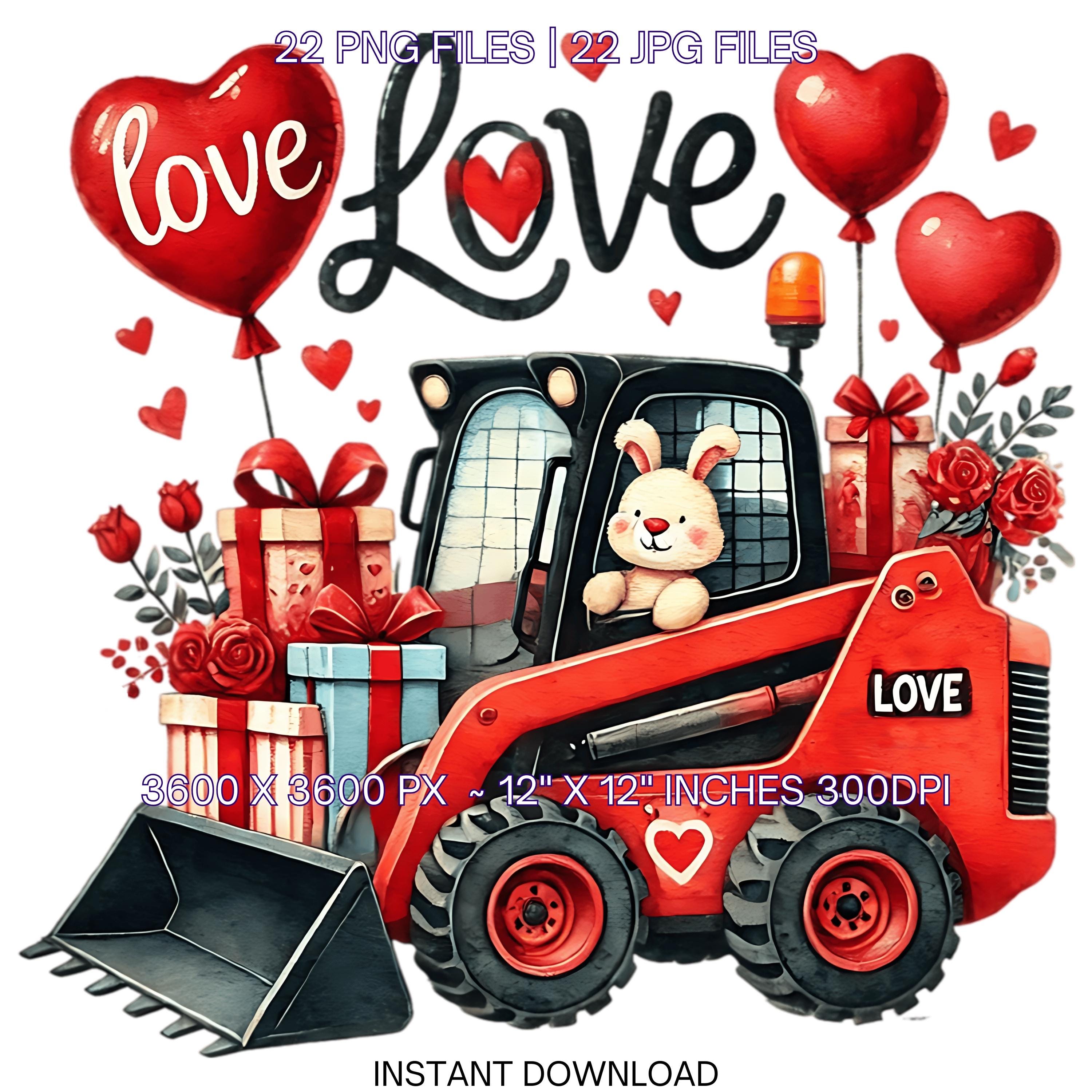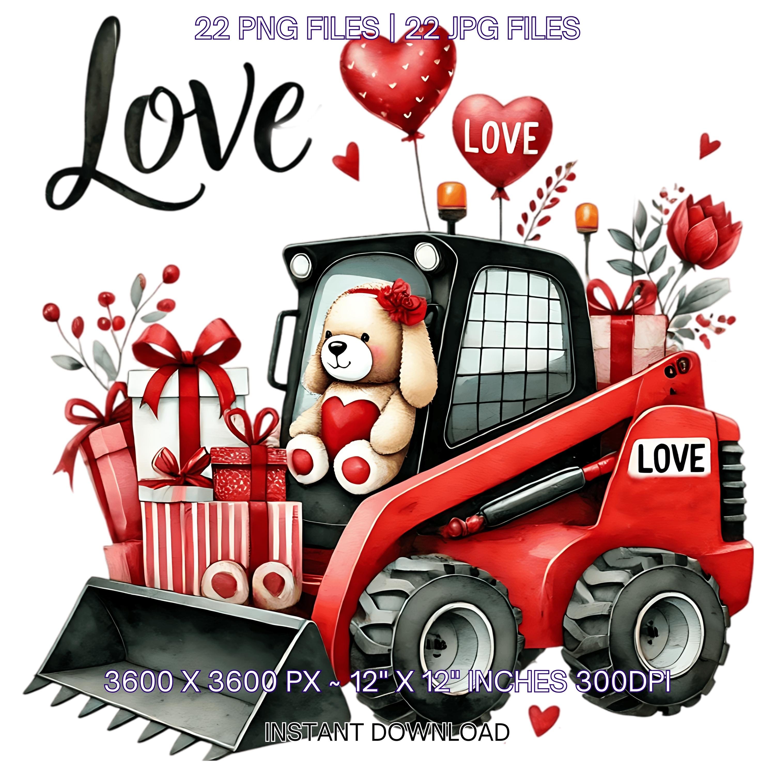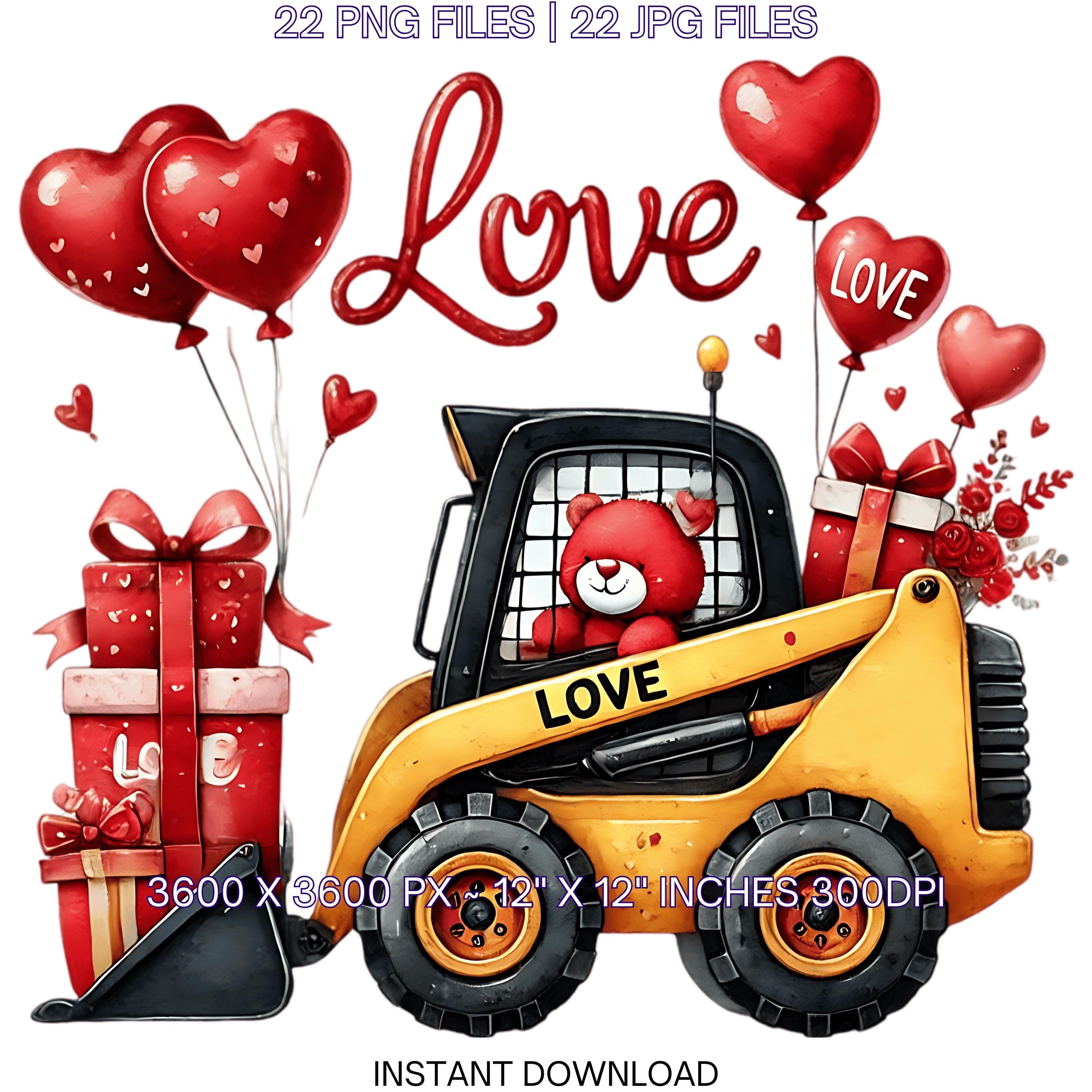 22 Valentine Skid Steer PNG Clipart | Watercolor Construction Skid Steer for Boys | Love Skid Steer Vehicle Cars PNG Commercial Use