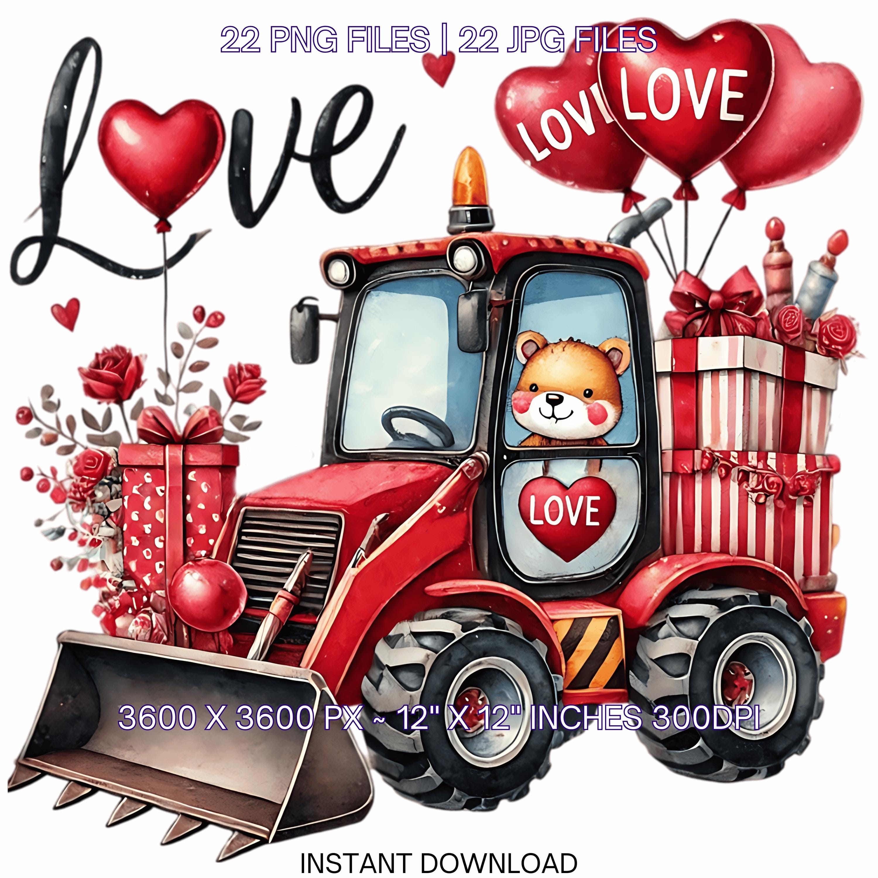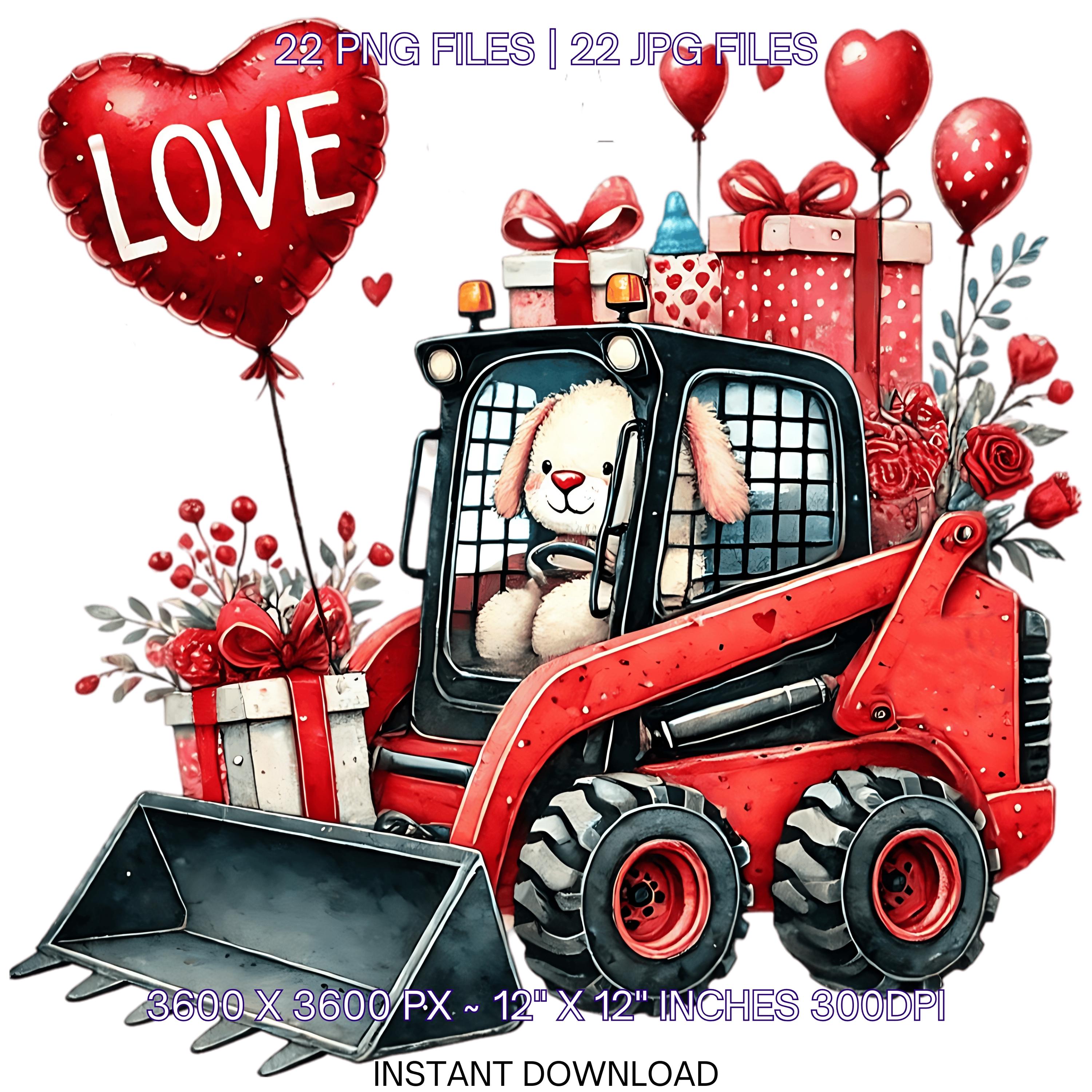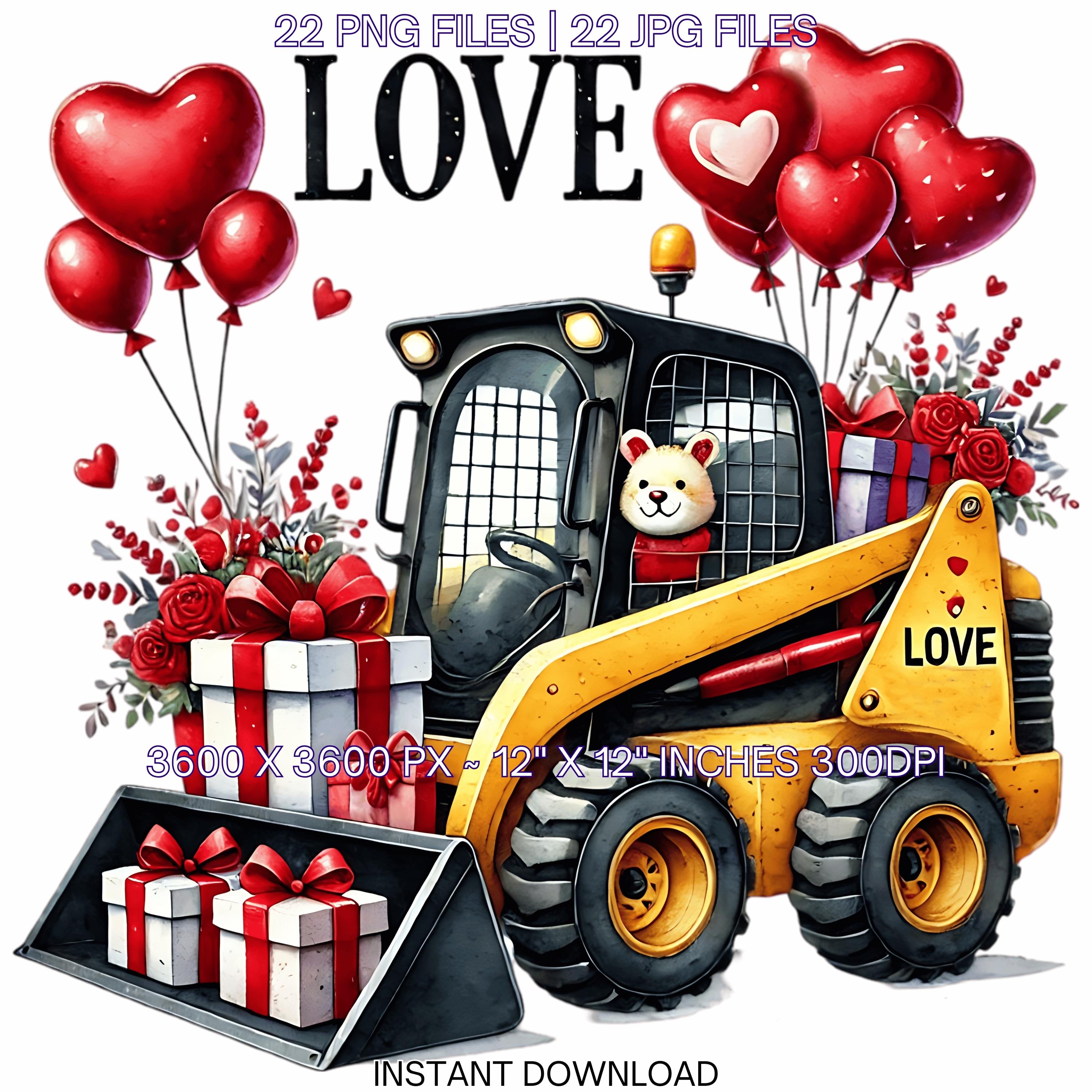 22 Valentine Skid Steer PNG Clipart | Watercolor Construction Skid Steer for Boys | Love Skid Steer Vehicle Cars PNG Commercial Use
