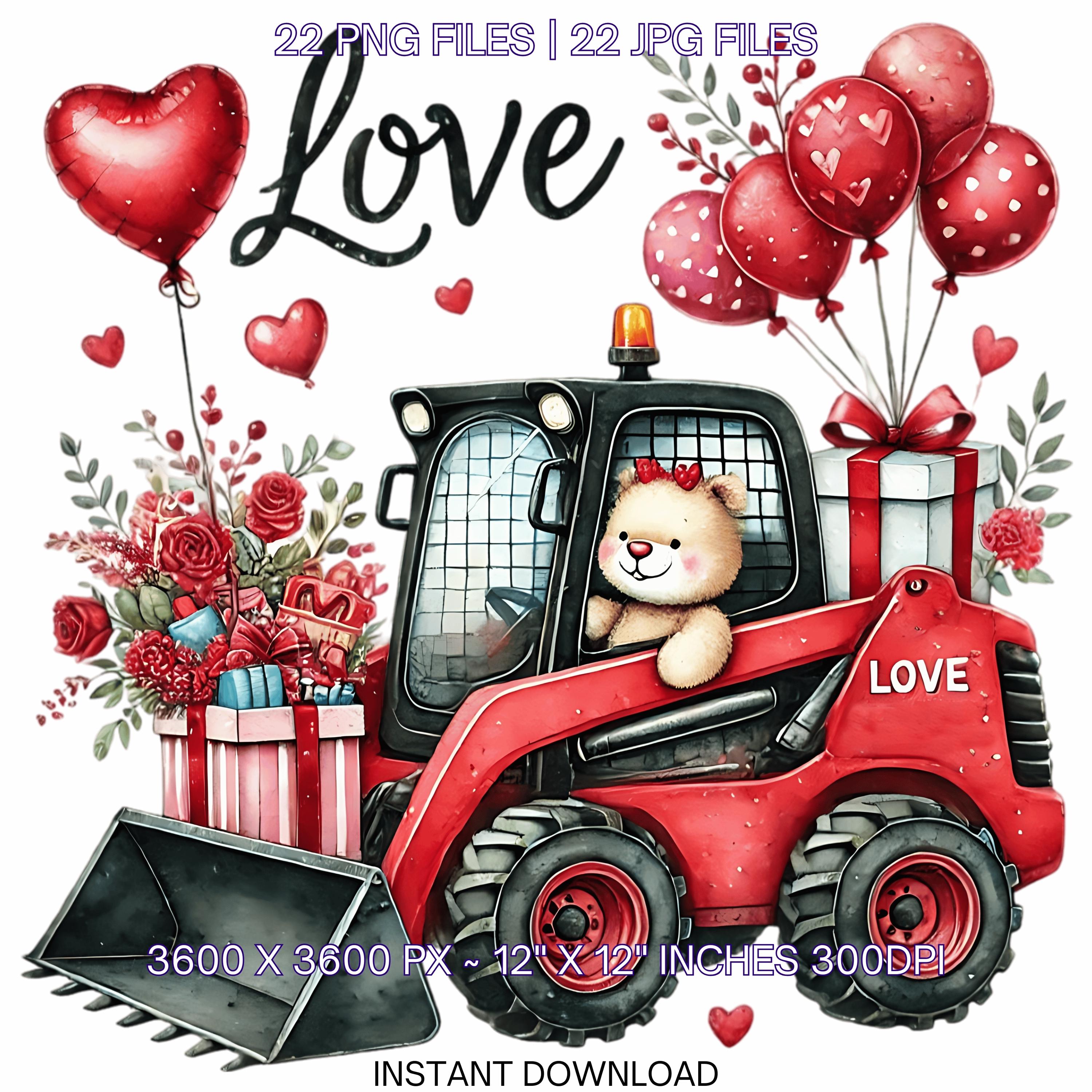 Skid Steer Clipart | Watercolor Construction Skid Steer for Boys PNG | 22 Valentine Love Skid Steer Vehicle Cars PNG Commercial Use is an eye-catching, high-resolution digital asset designed for creators, crafters, teachers, and small business owners looking to elevate their visuals.