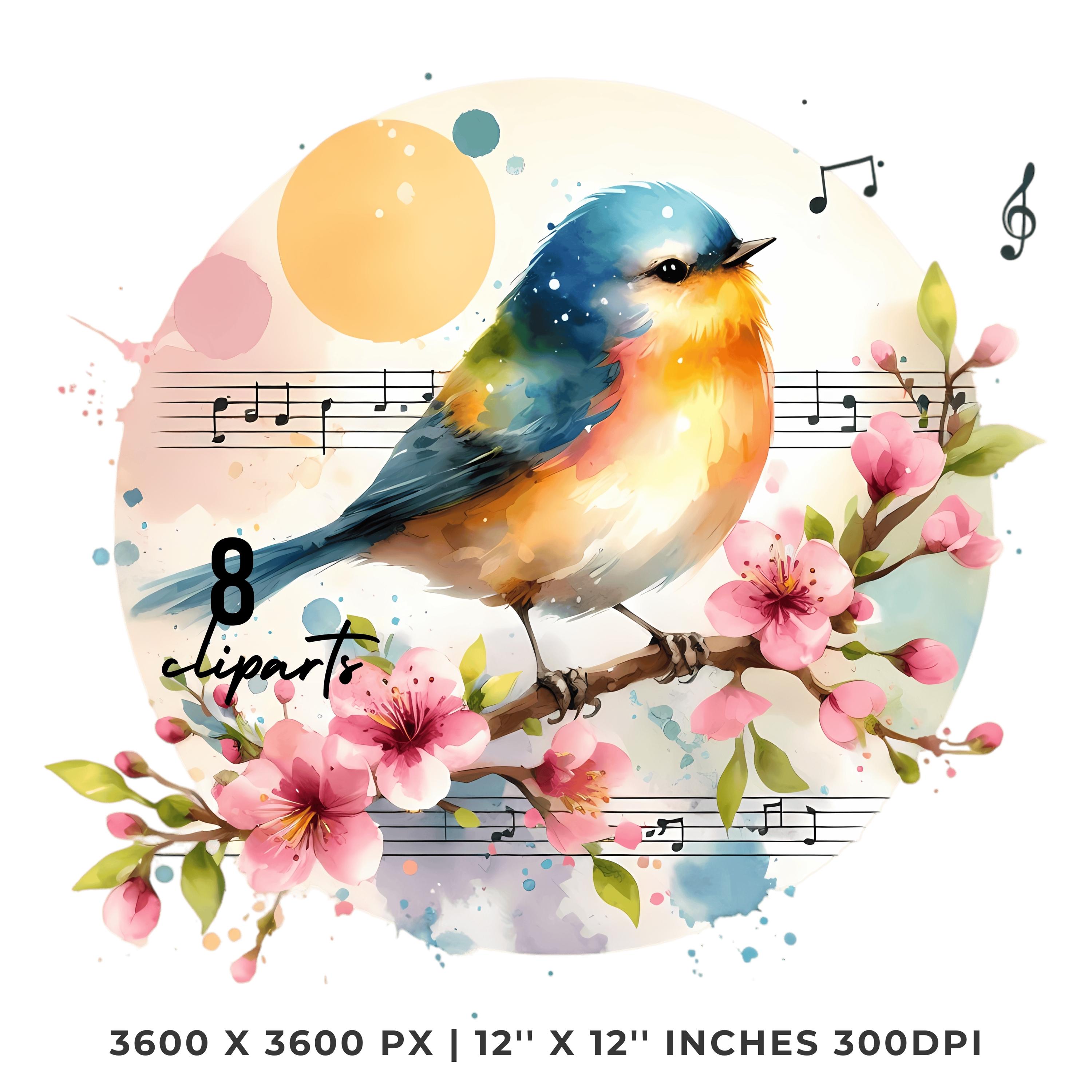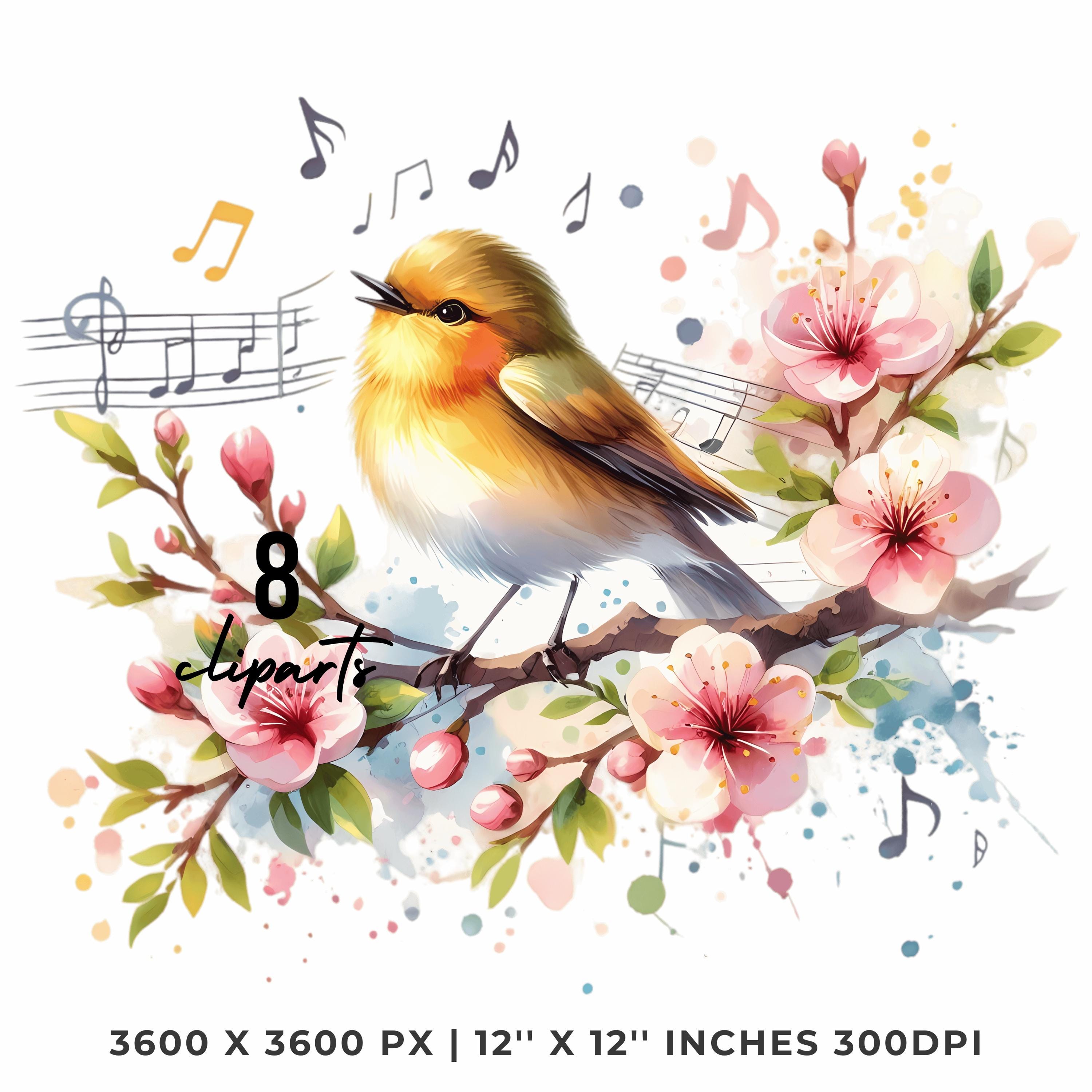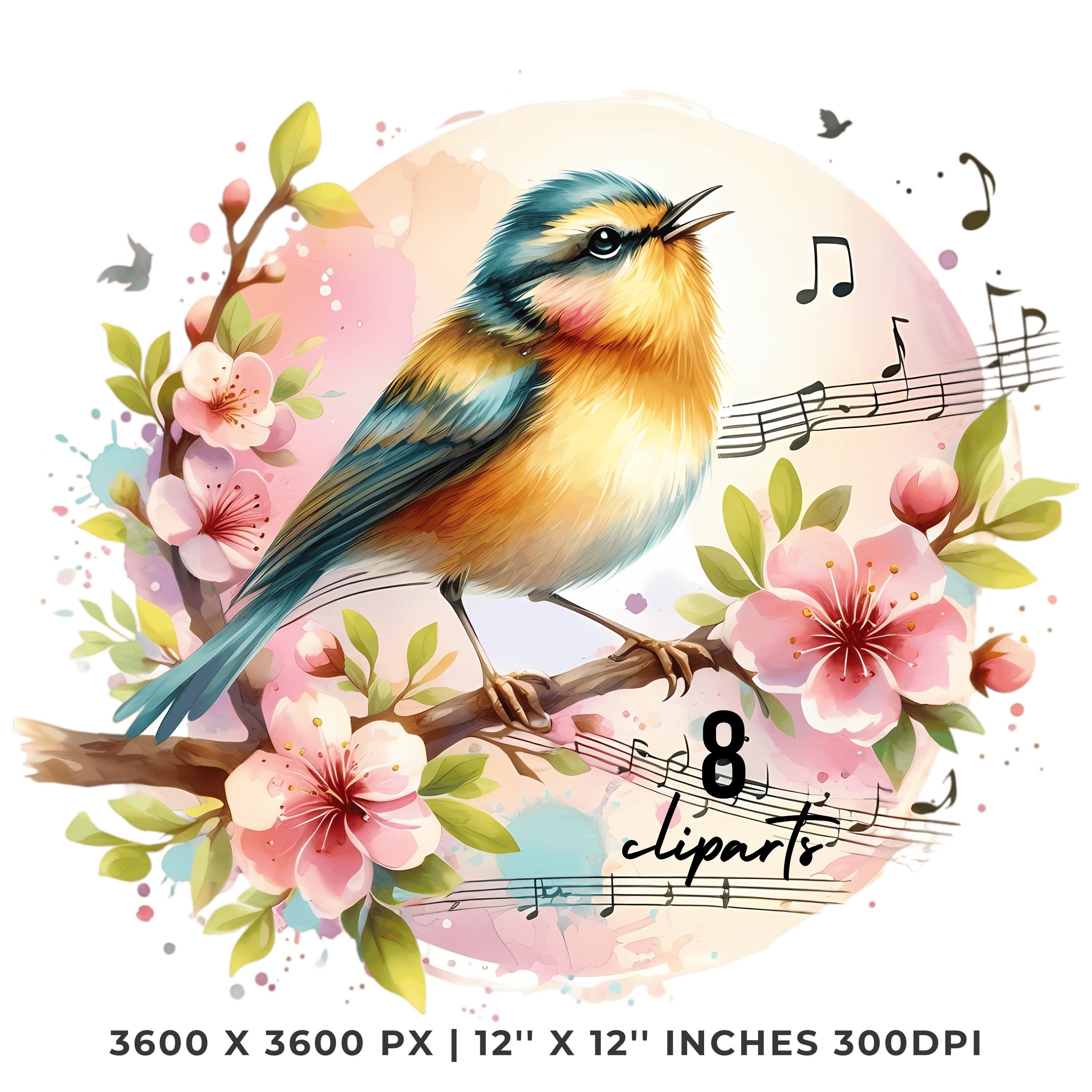 Songbird Clipart PNG | 8 Watercolor Bright and cheerful songbird perched on a blooming branch & music notes | Sublimation Commercial Use is an eye-catching, high-resolution digital asset designed for creators, crafters, teachers, and small business owners looking to elevate their visuals.