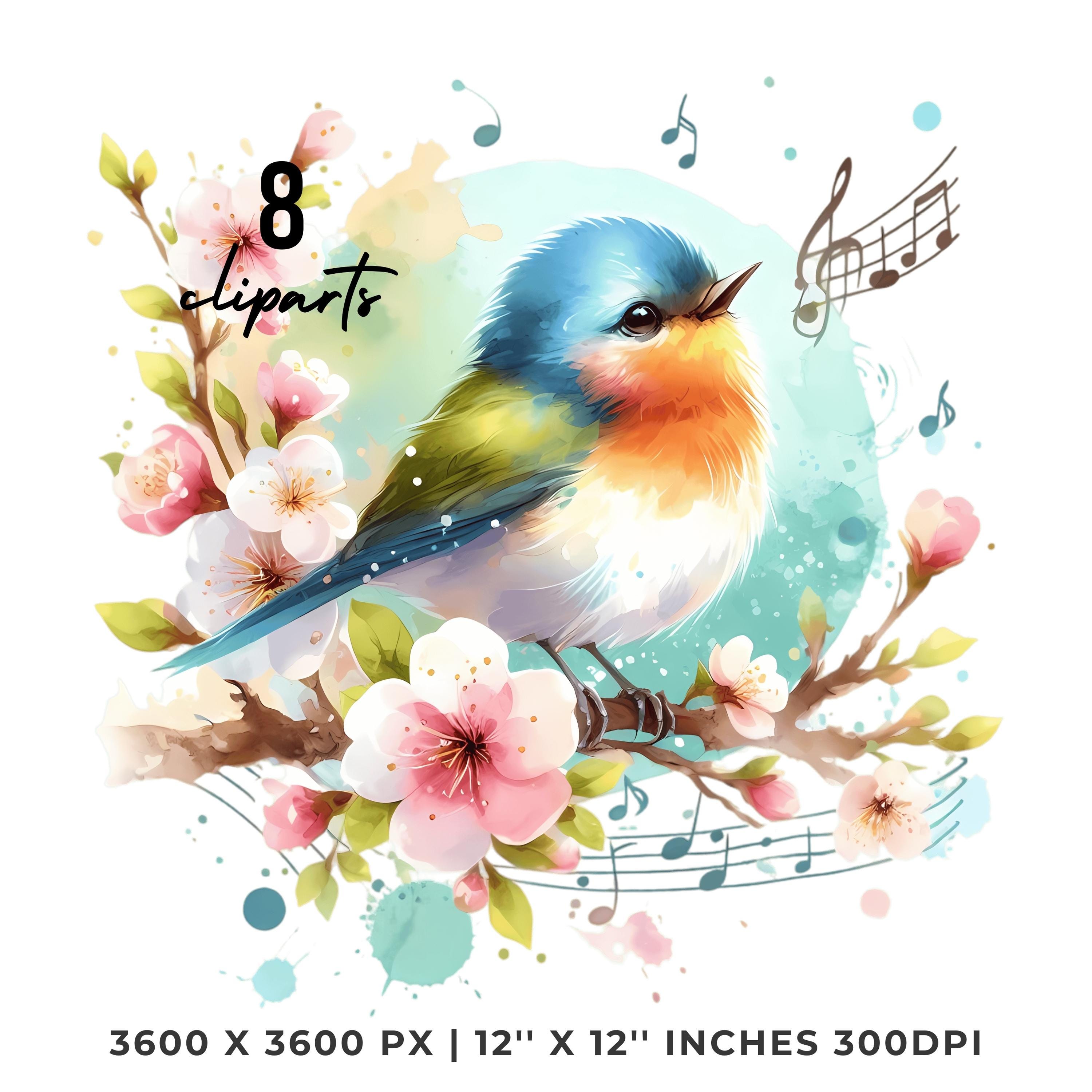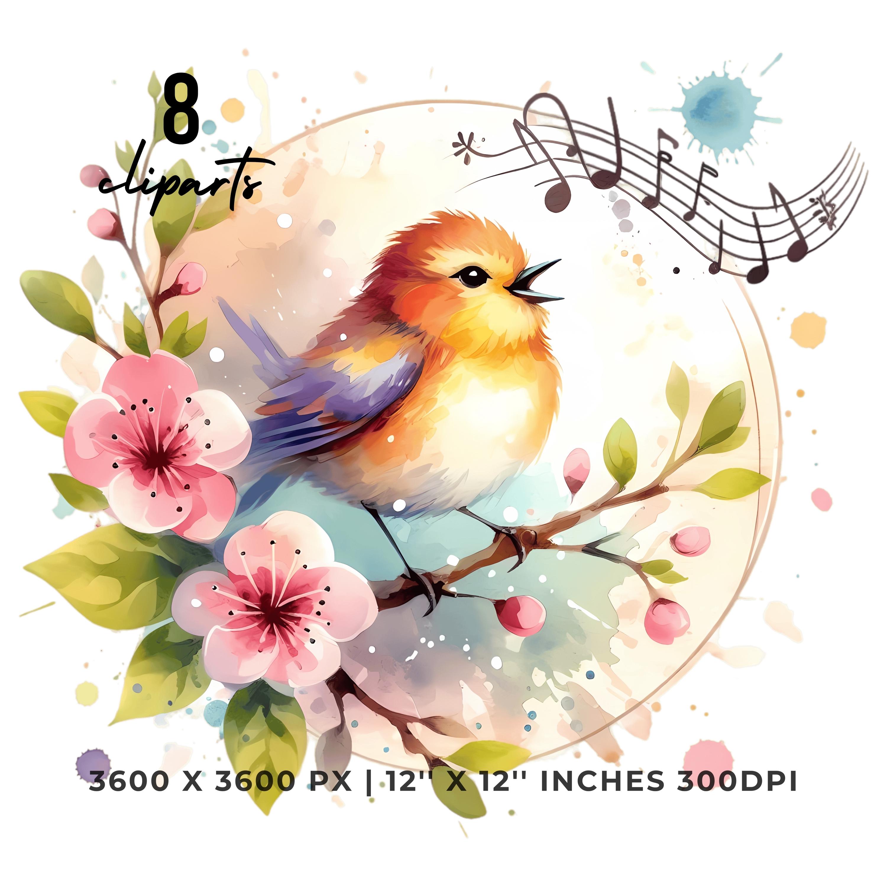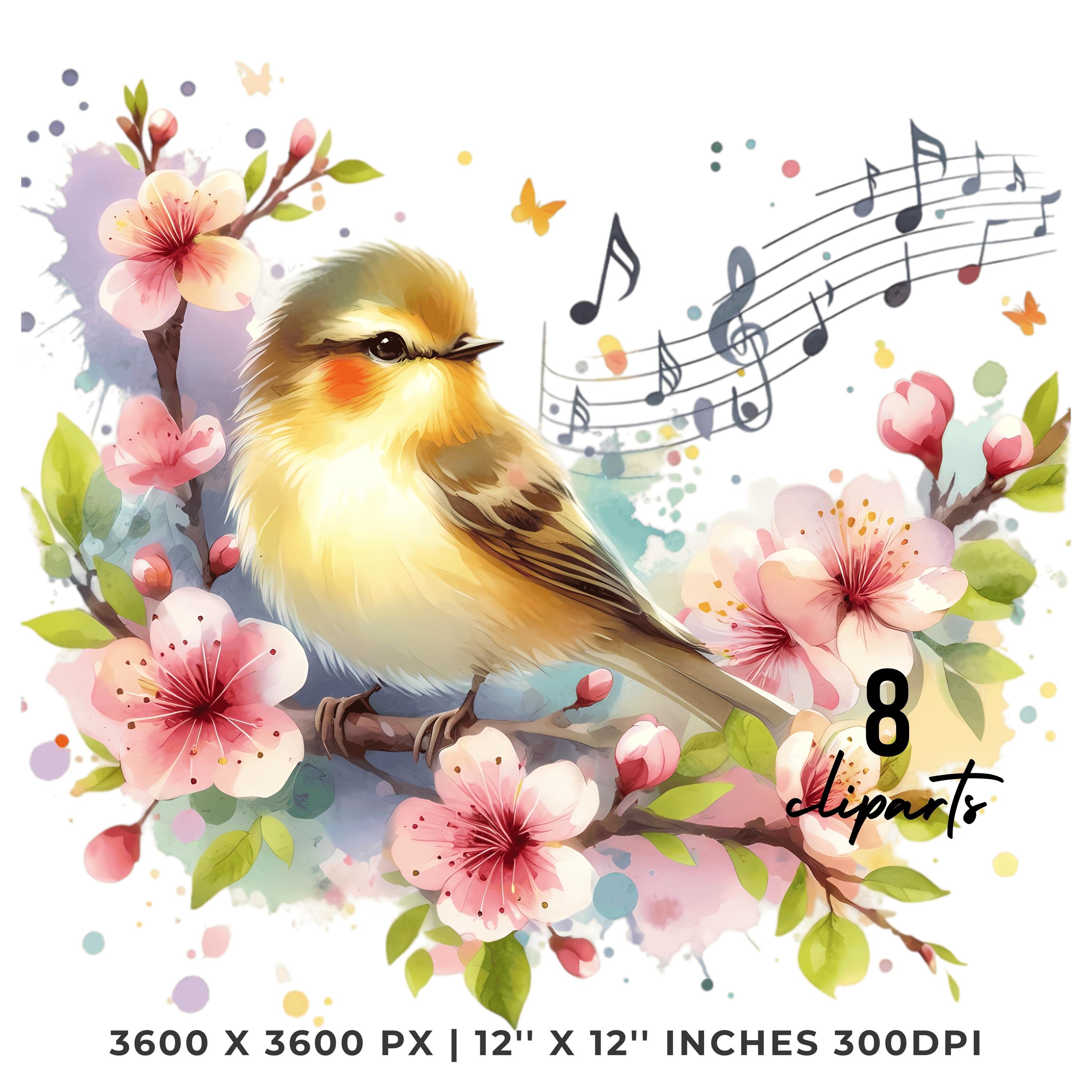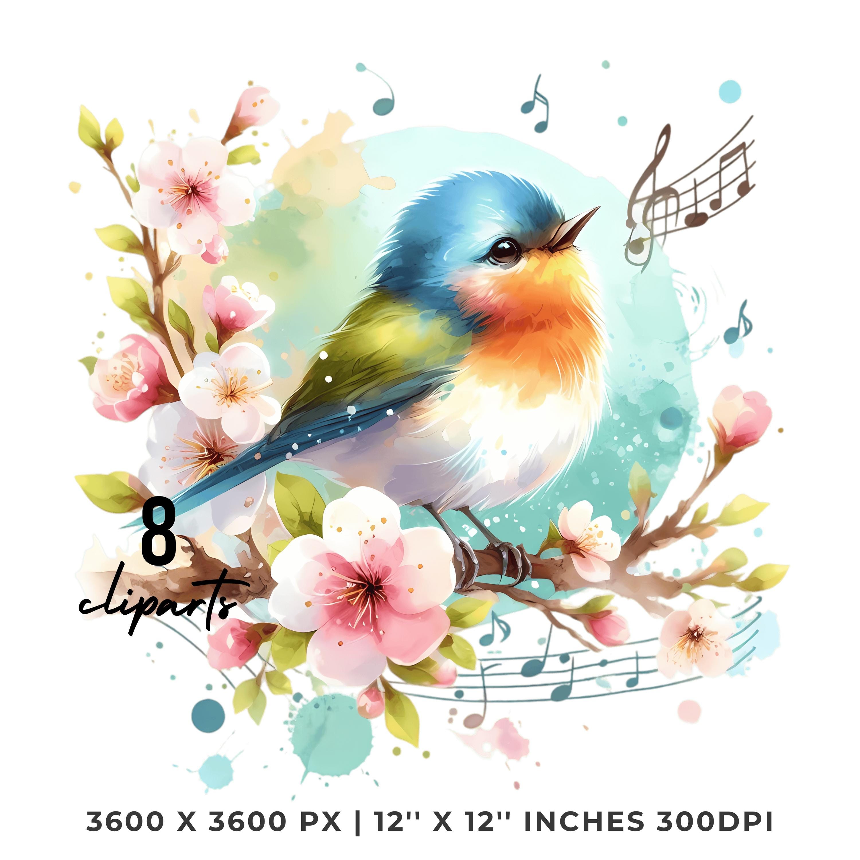Songbird Clipart PNG | 8 Watercolor Bright and cheerful songbird perched on a blooming branch & music notes | Sublimation Commercial Use is an eye-catching, high-resolution digital asset designed for creators, crafters, teachers, and small business owners looking to elevate their visuals.