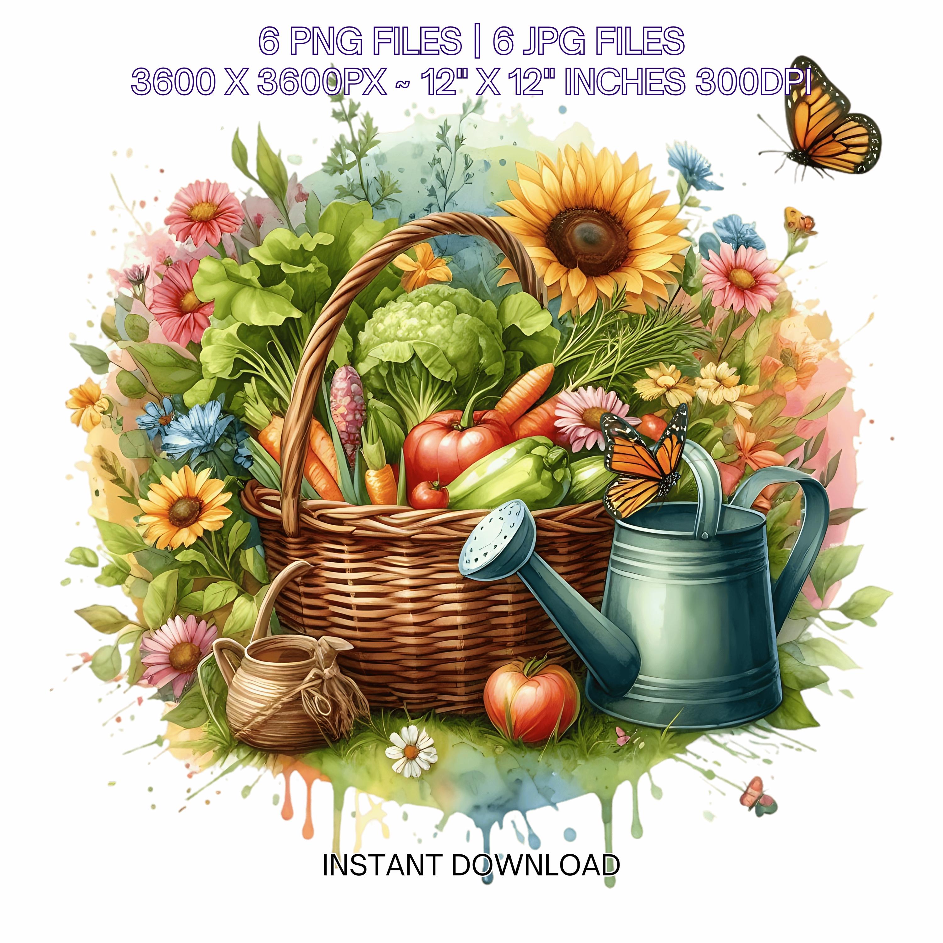 Spring Farm Clipart with Fresh Vegetables Woven Basket Near Watering Can, Bees Buzzing & Wildflowers | Farmyard | 6 PNG-JPG Commercial Use is an eye-catching, high-resolution digital asset designed for creators, crafters, teachers, and small business owners looking to elevate their visuals.
